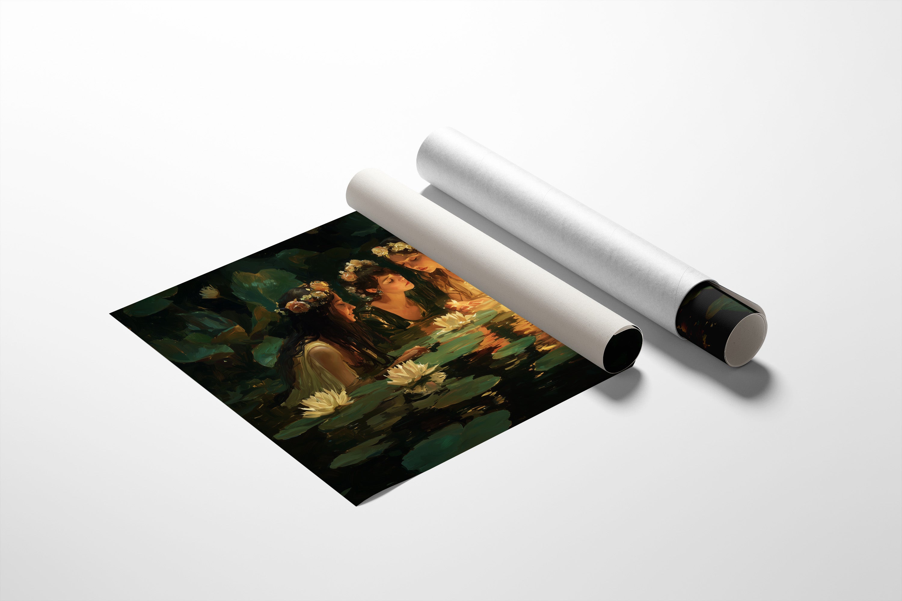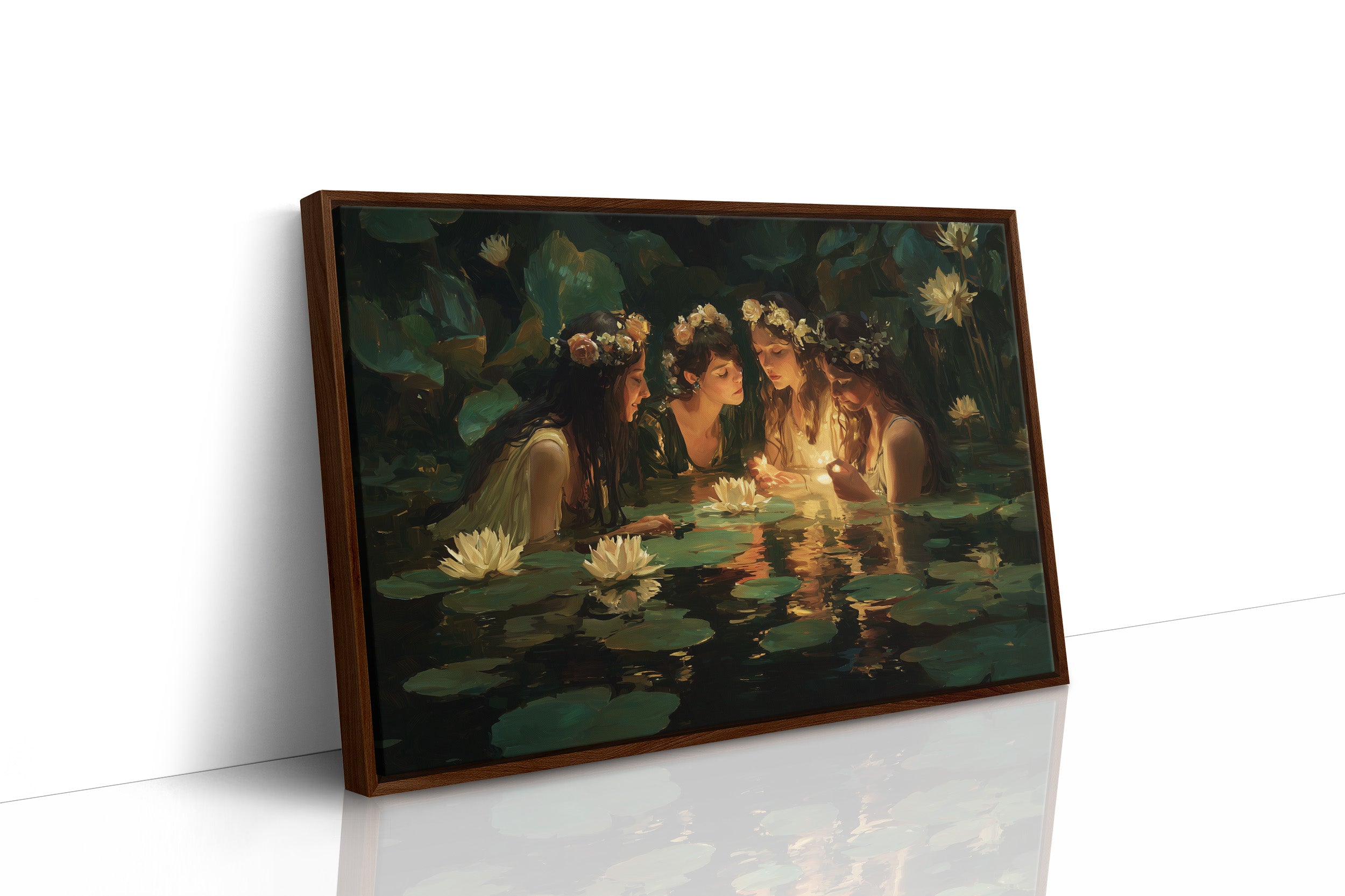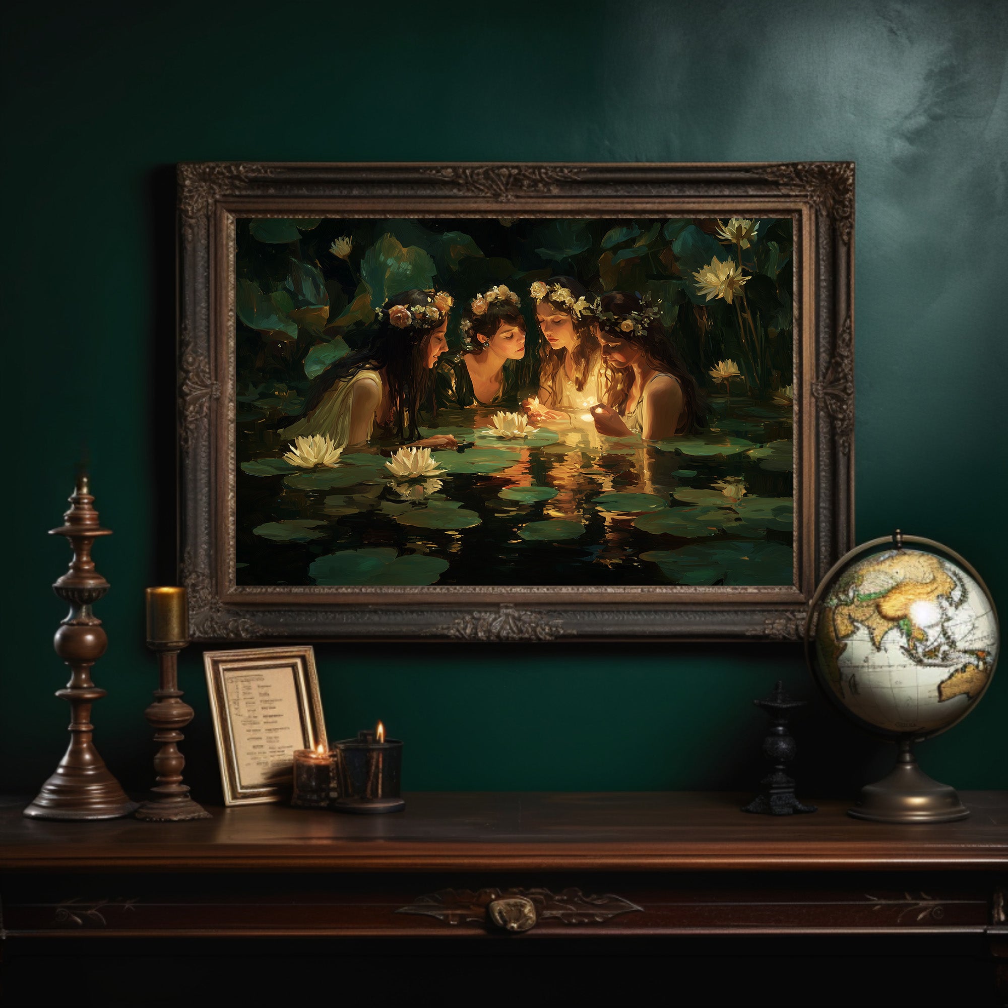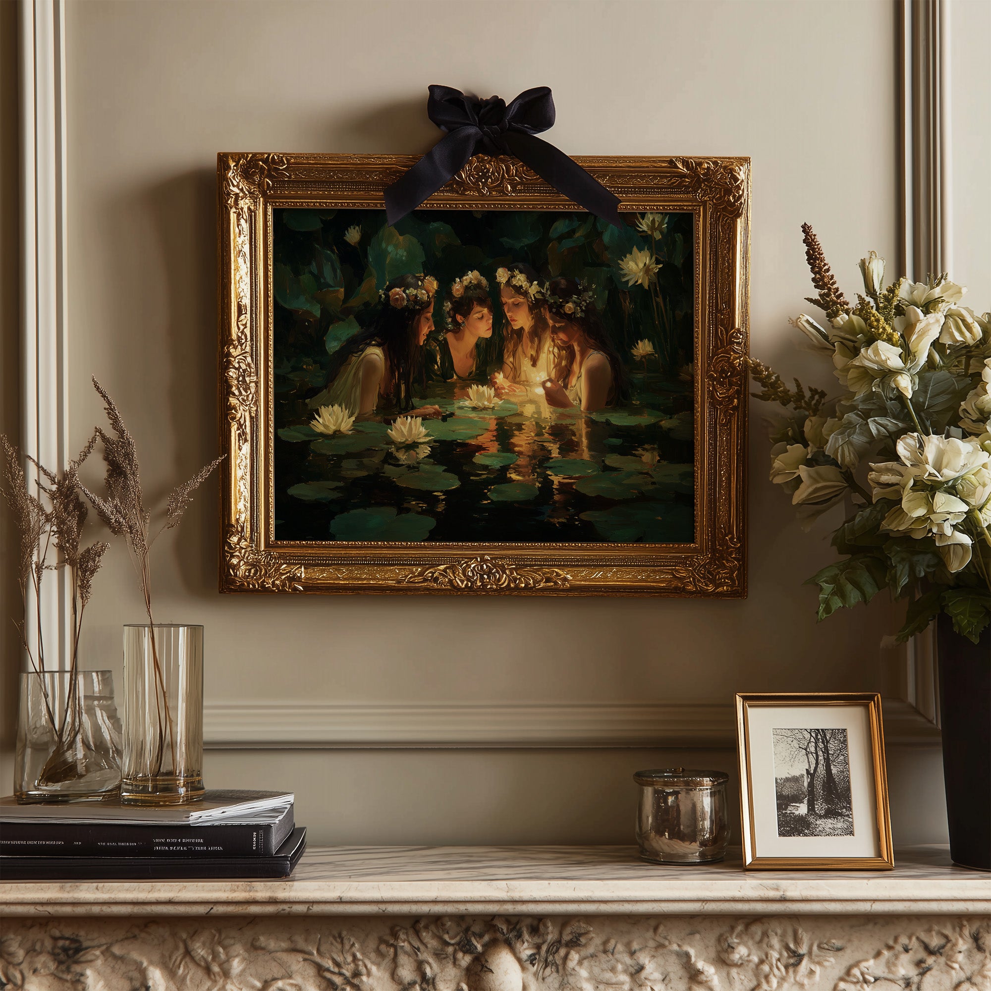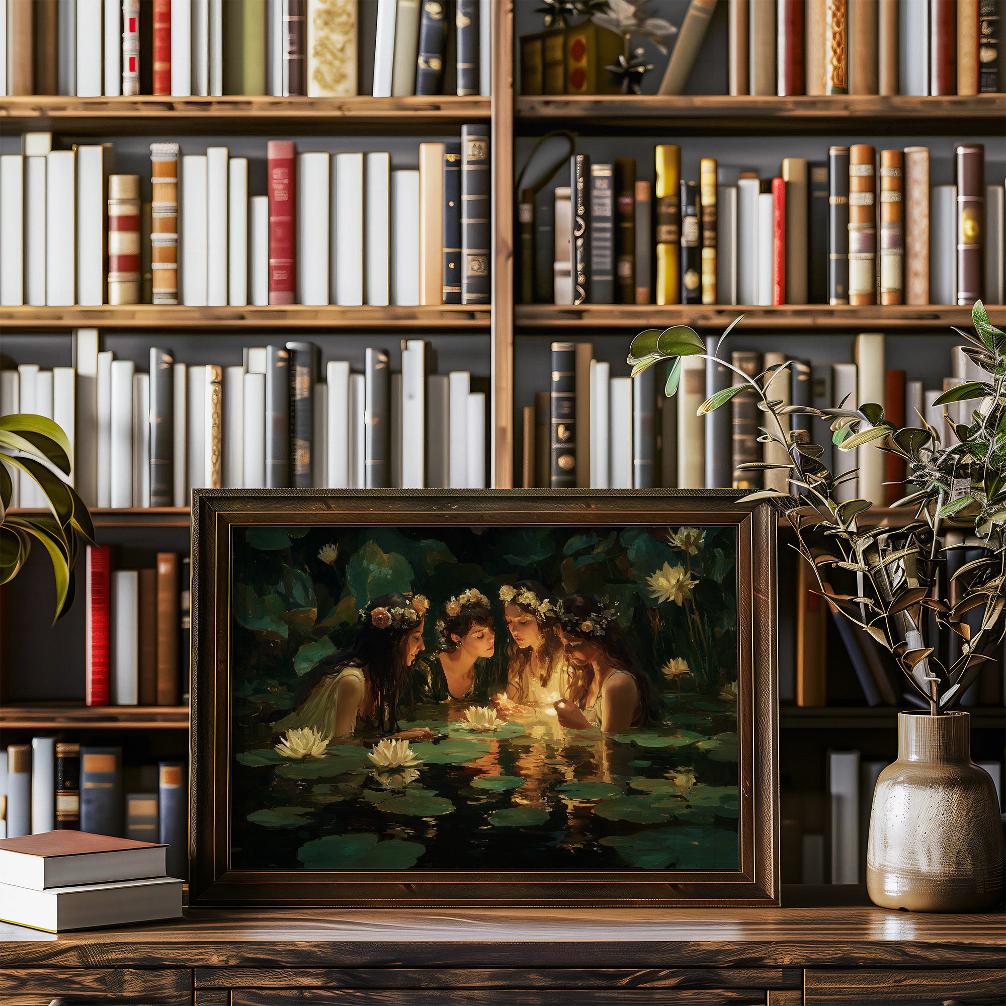 A mysterious glow emanates from beneath lily pads, illuminating faces gathered in secret communion. The painting captures that ethereal moment when dusk meets magic, where floral crowns and hushed conversations blend with the reflective surface of dark waters. Rich emerald tones contrast with luminous water blooms, creating a mythical narrative that feels both timeless and intimate. This striking piece brings literary depth to a study, reading nook, or contemplative space where stories unfold.