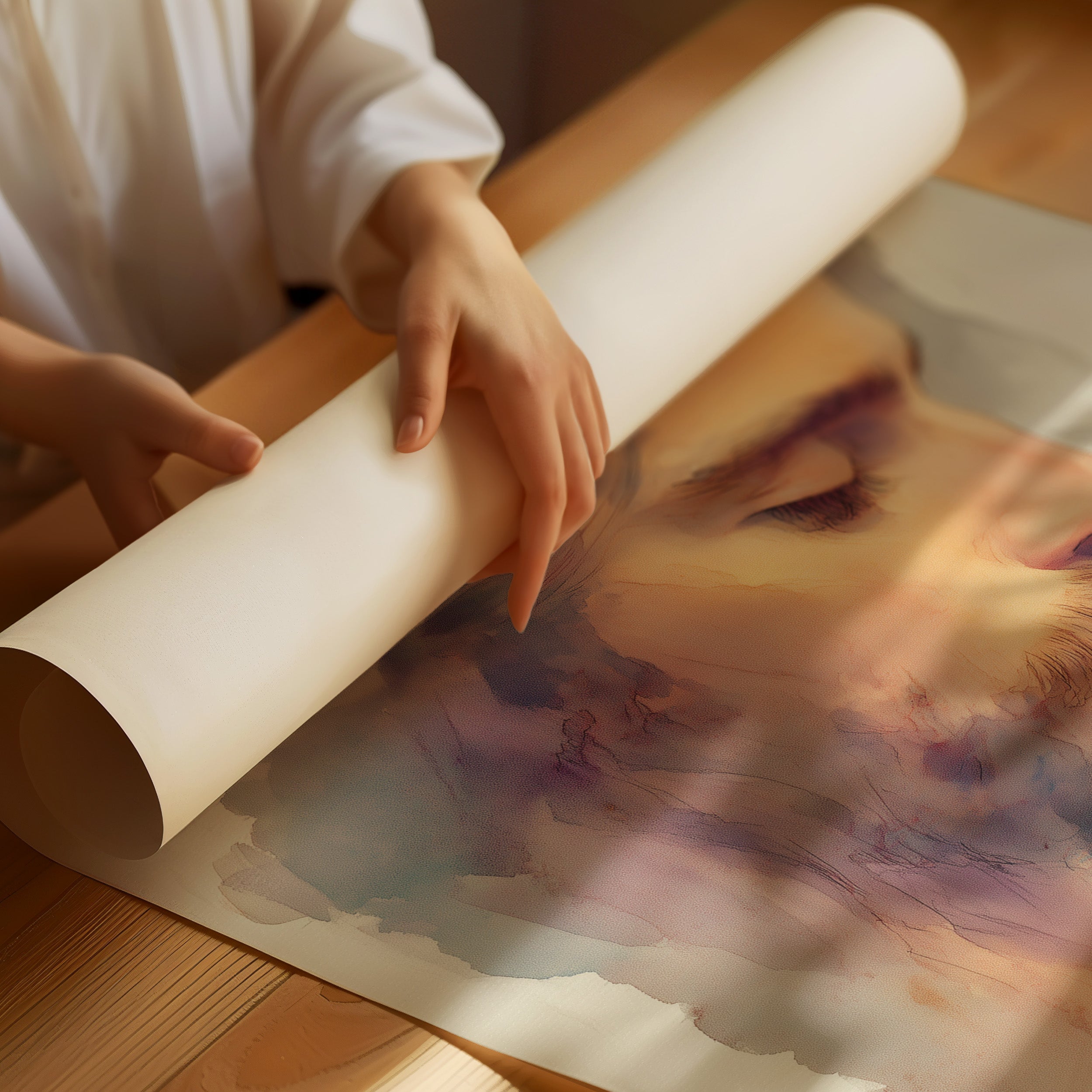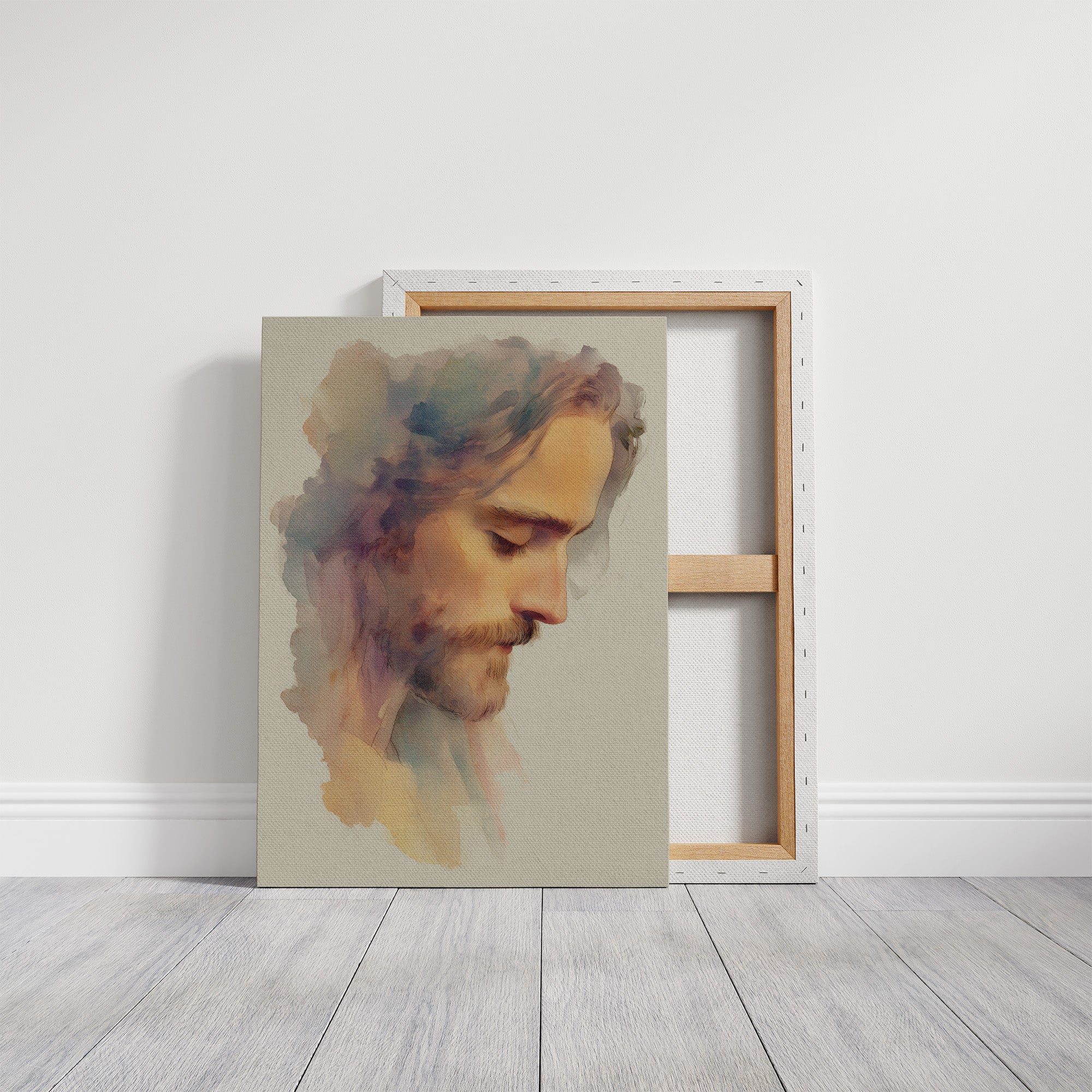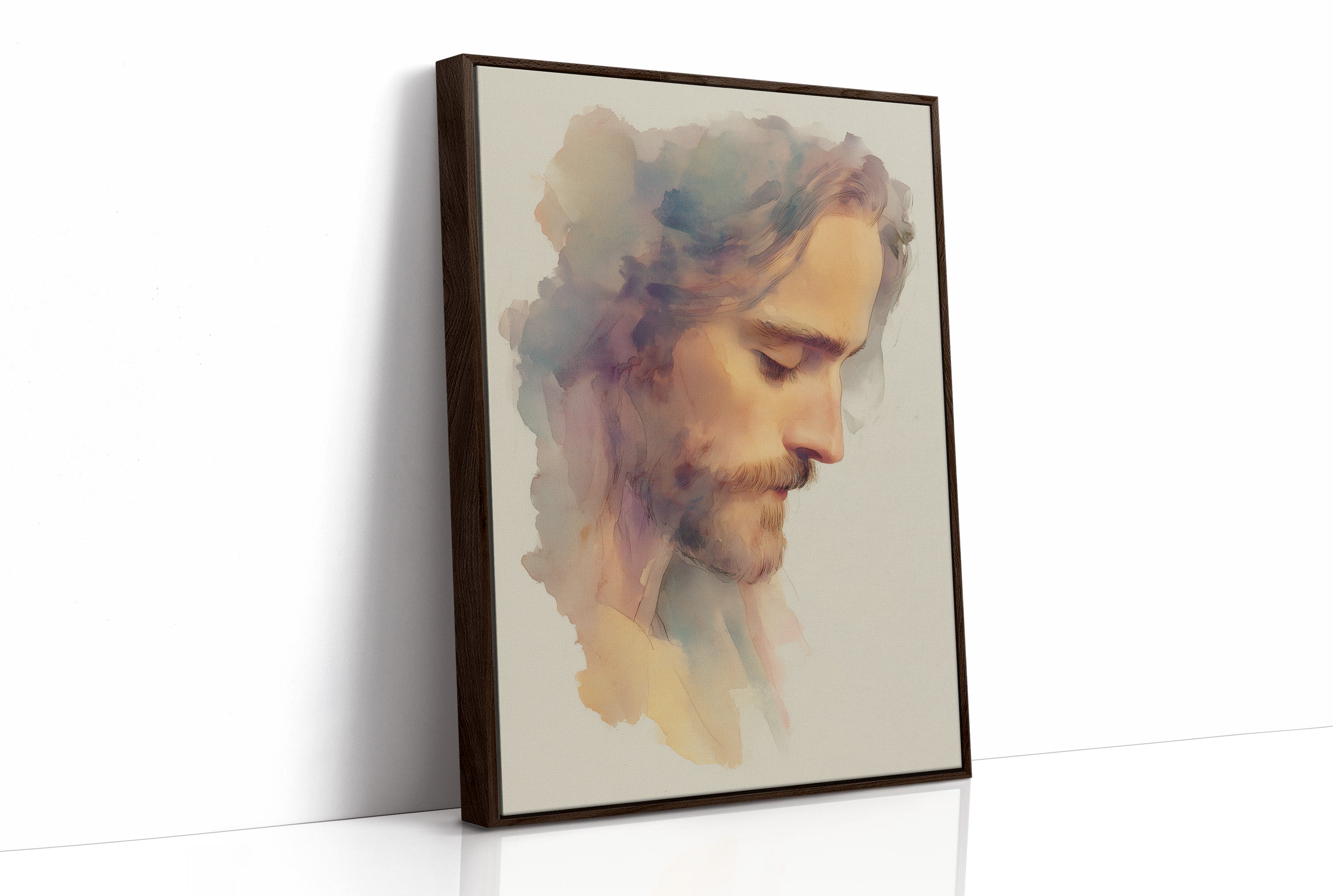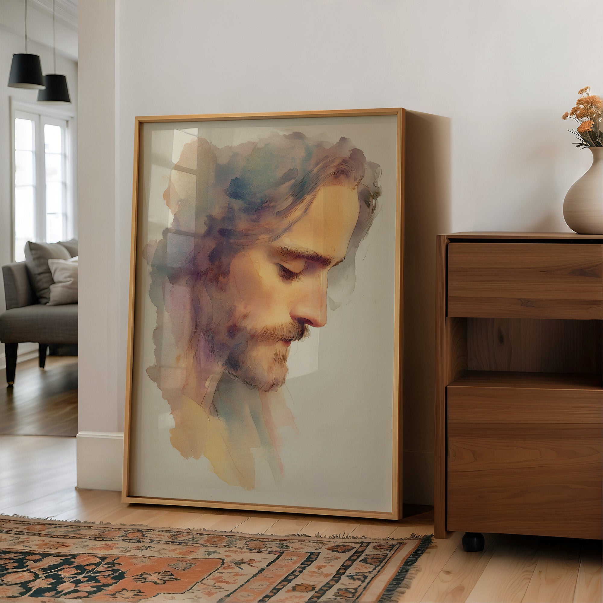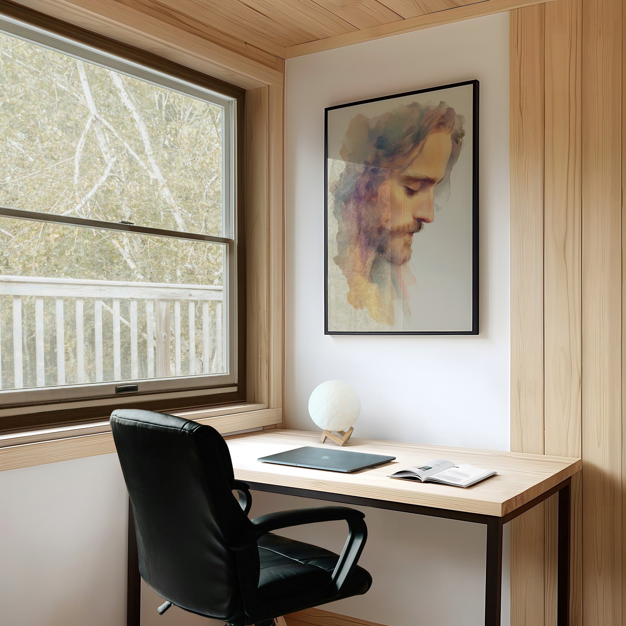 Gentle brushstrokes capture a moment of quiet contemplation, bathed in the soft glow of daylight. The delicate watercolor portrait rests on weathered wooden slats, its muted palette of blues and ambers blending seamlessly into translucent edges that seem to dissolve into memory. Around it, a simple scene unfolds fresh greenery, a small cup of coffee, the honest texture of natural wood creating a sanctuary for reflection and artistic appreciation. This piece brings serene spirituality to reading nooks, meditation spaces, or anywhere that invites peaceful introspection.