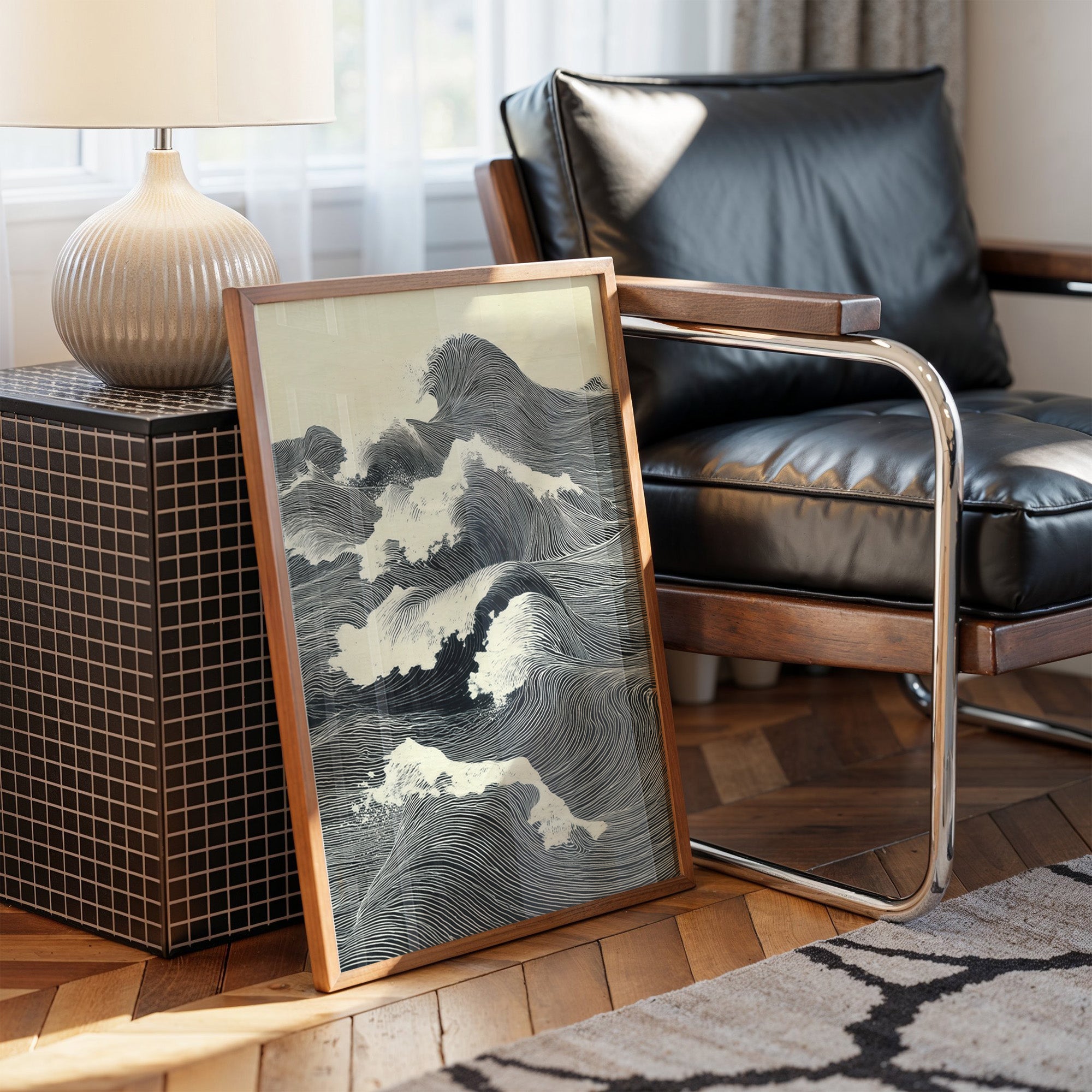 Intricate lines dance across the canvas, weaving a tempestuous seascape in stark monochromatic contrast. Each carefully etched stroke builds upon the last, creating a rhythmic pattern that captures the raw power and graceful movement of ocean waves in full surge. The wooden frame complements the organic nature of the piece, while its placement among carefully curated books speaks to its contemplative essence. This piece would transform a reading nook or office space into a meditative sanctuary, bringing dramatic maritime energy to any contemporary interior.