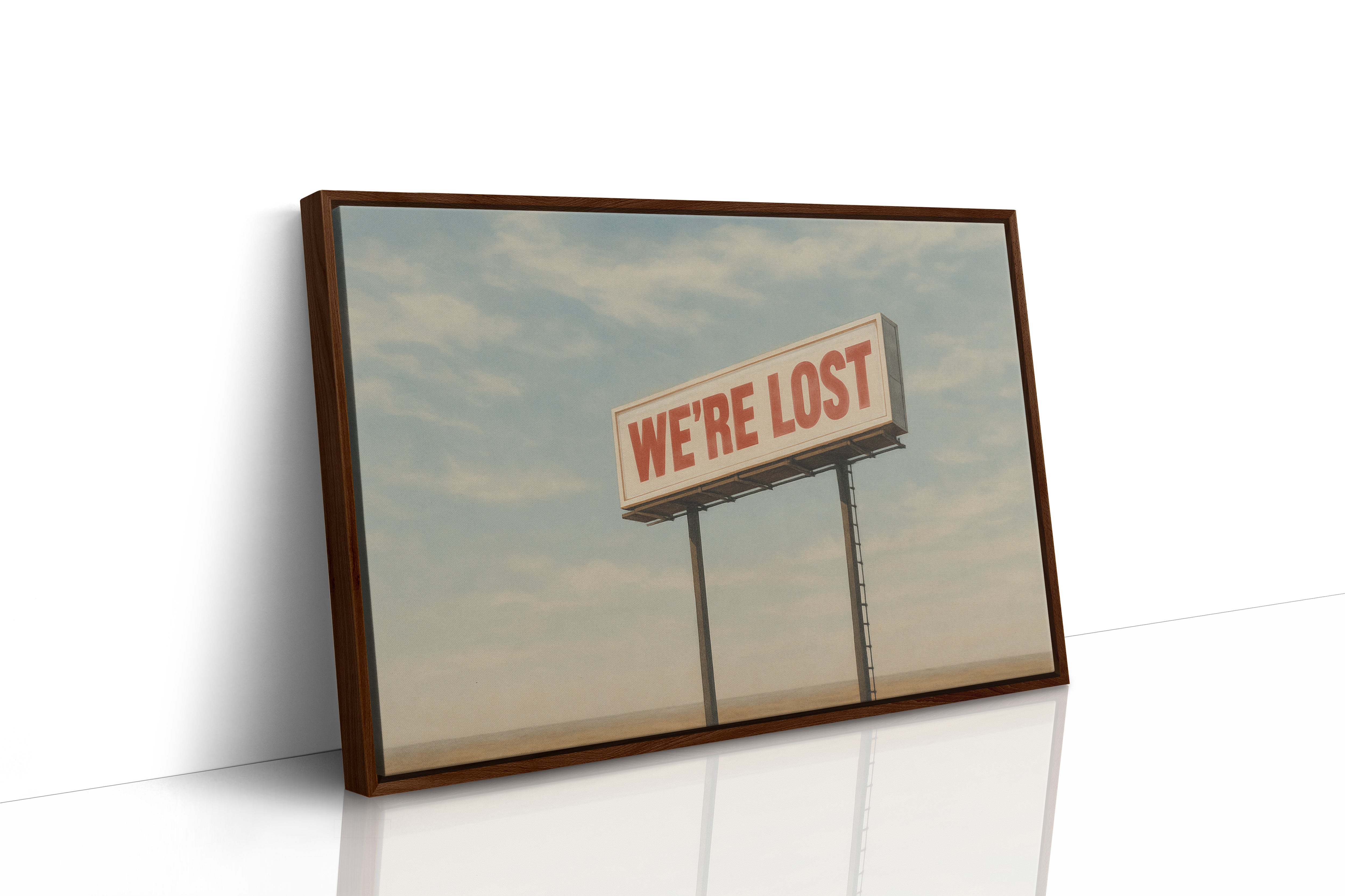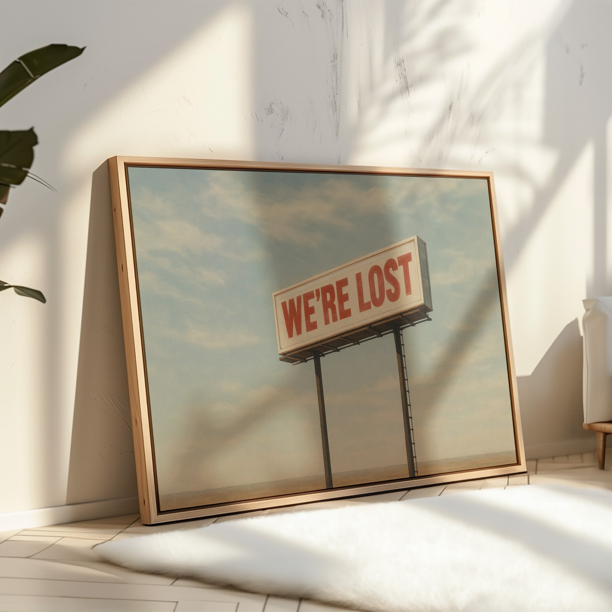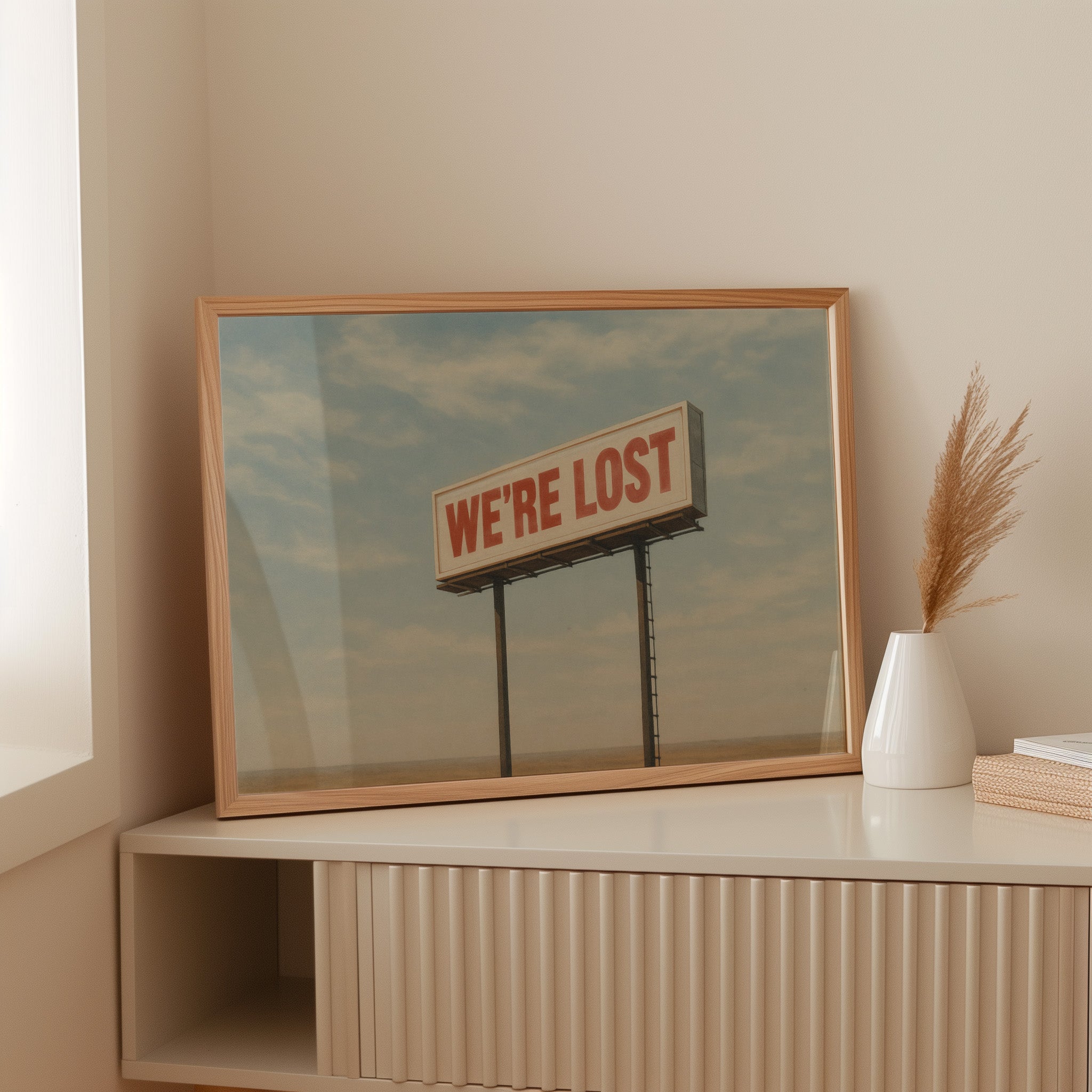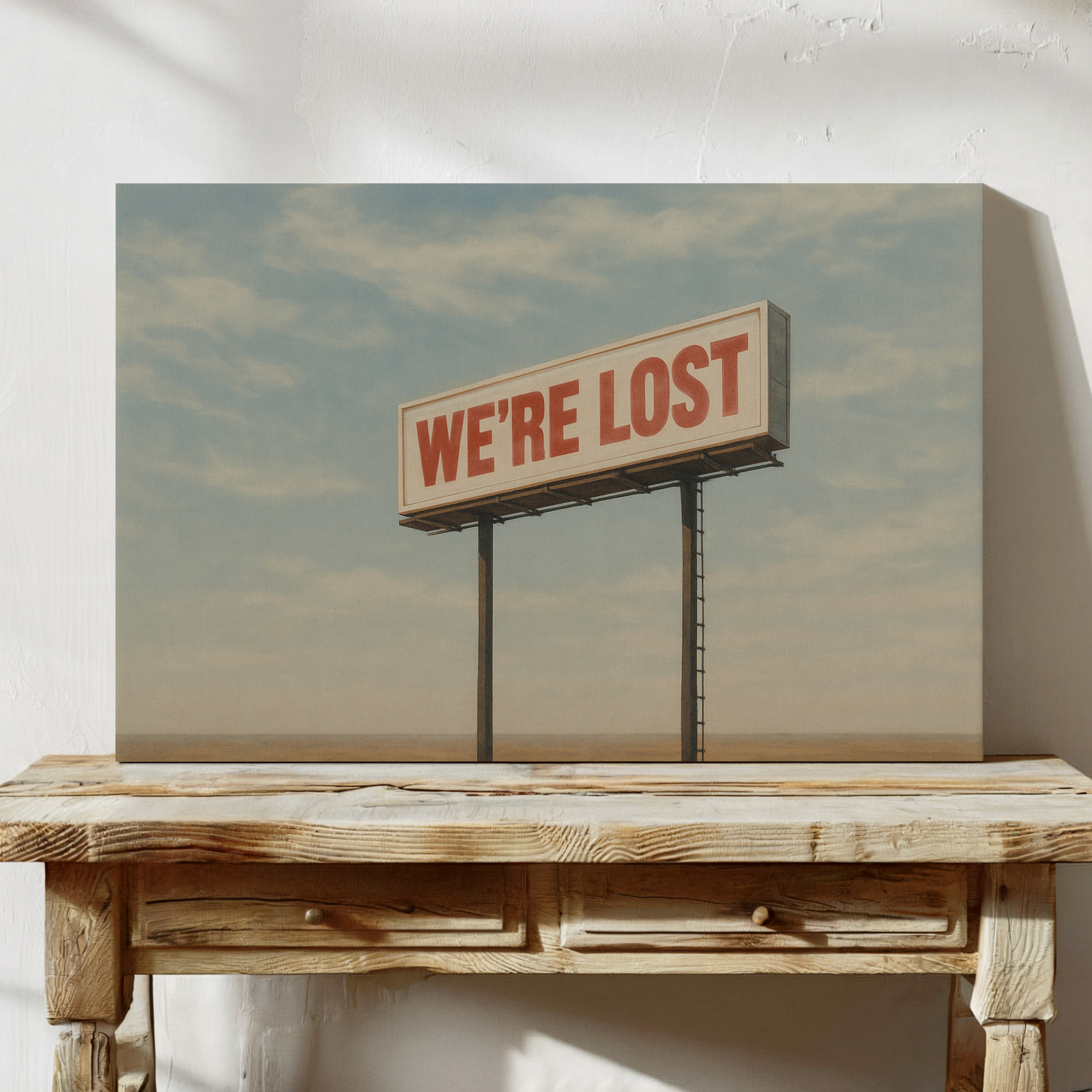 A stark billboard towers over empty desert, boldly declaring what we’re all thinking. This whimsical roadside print blends dry humor with cinematic stillness.