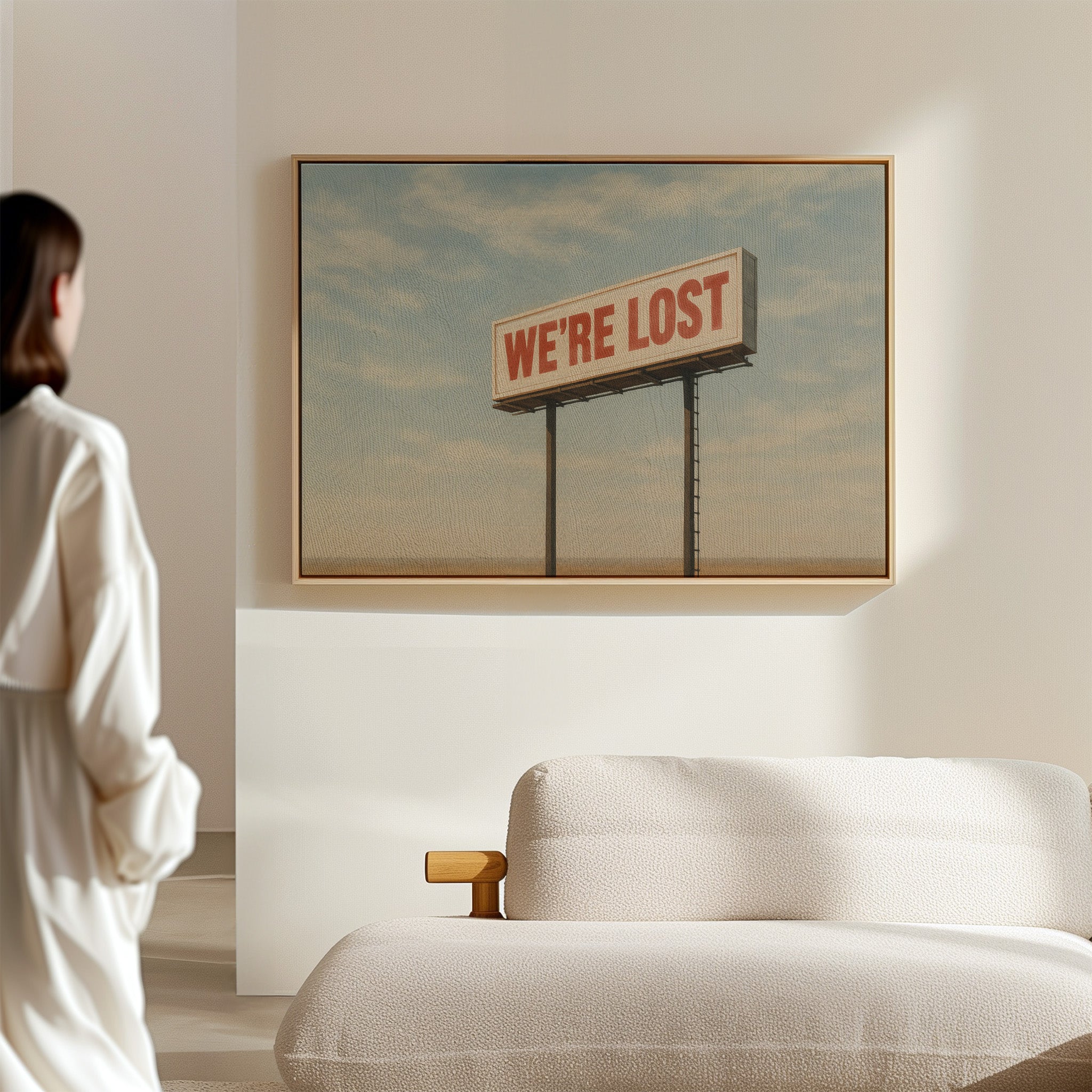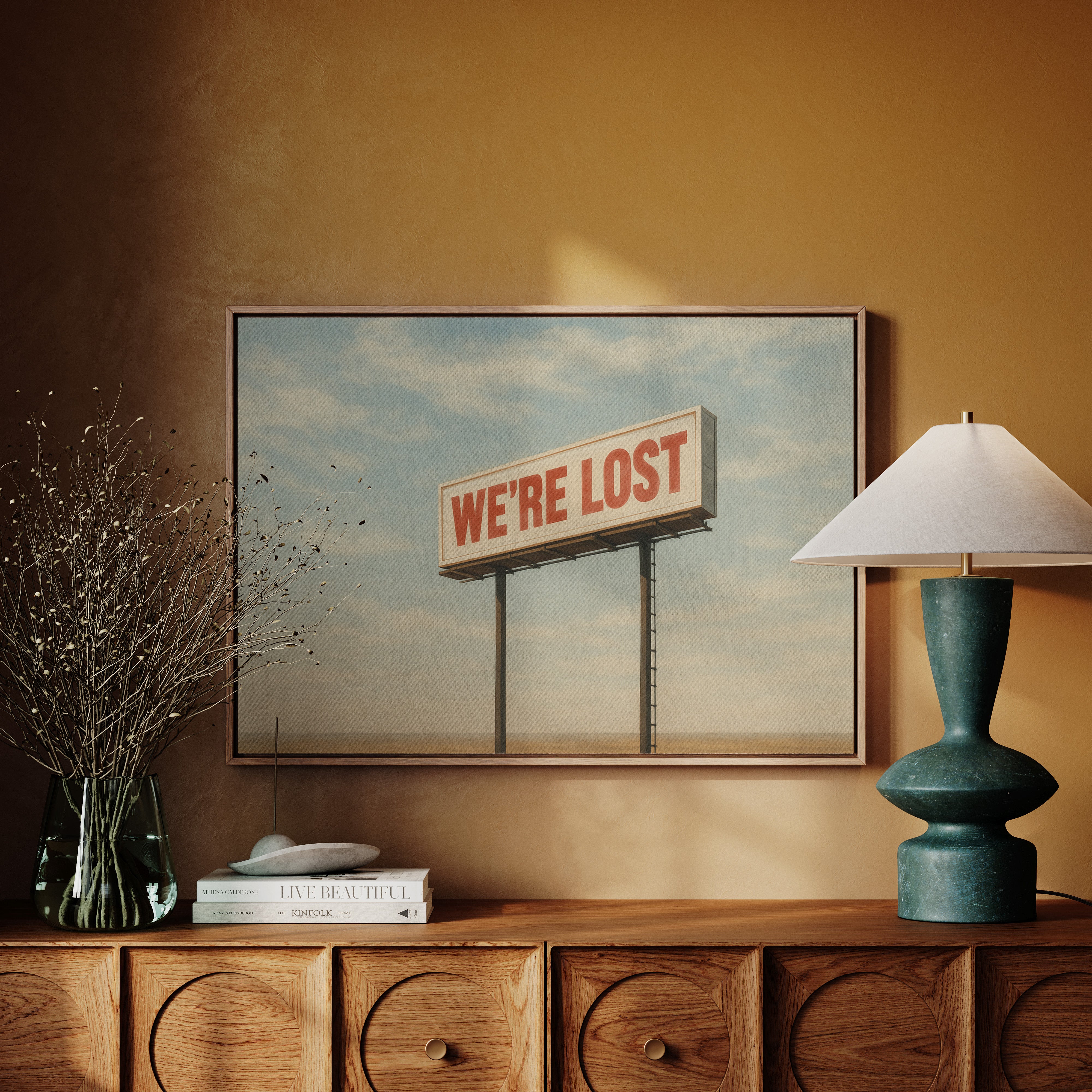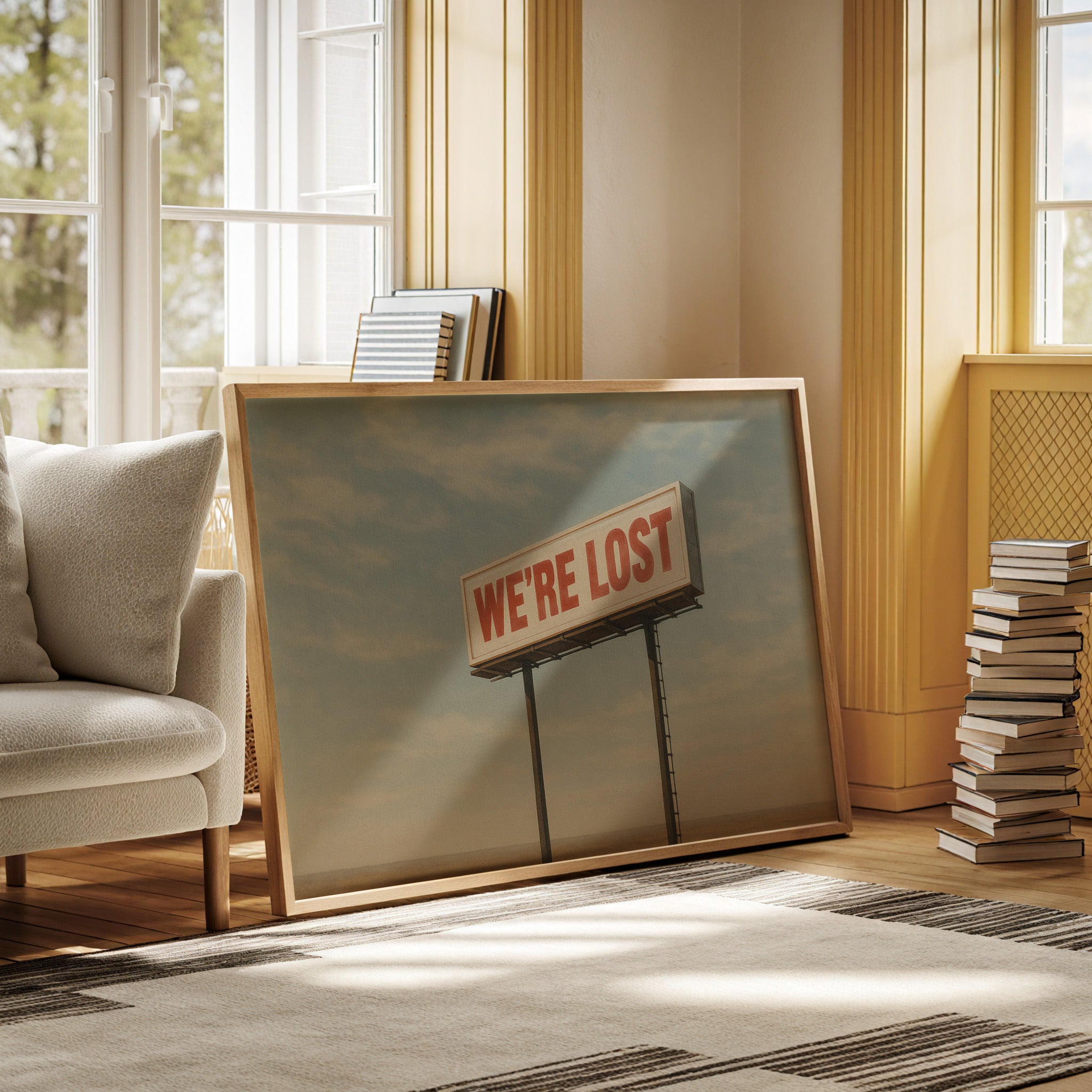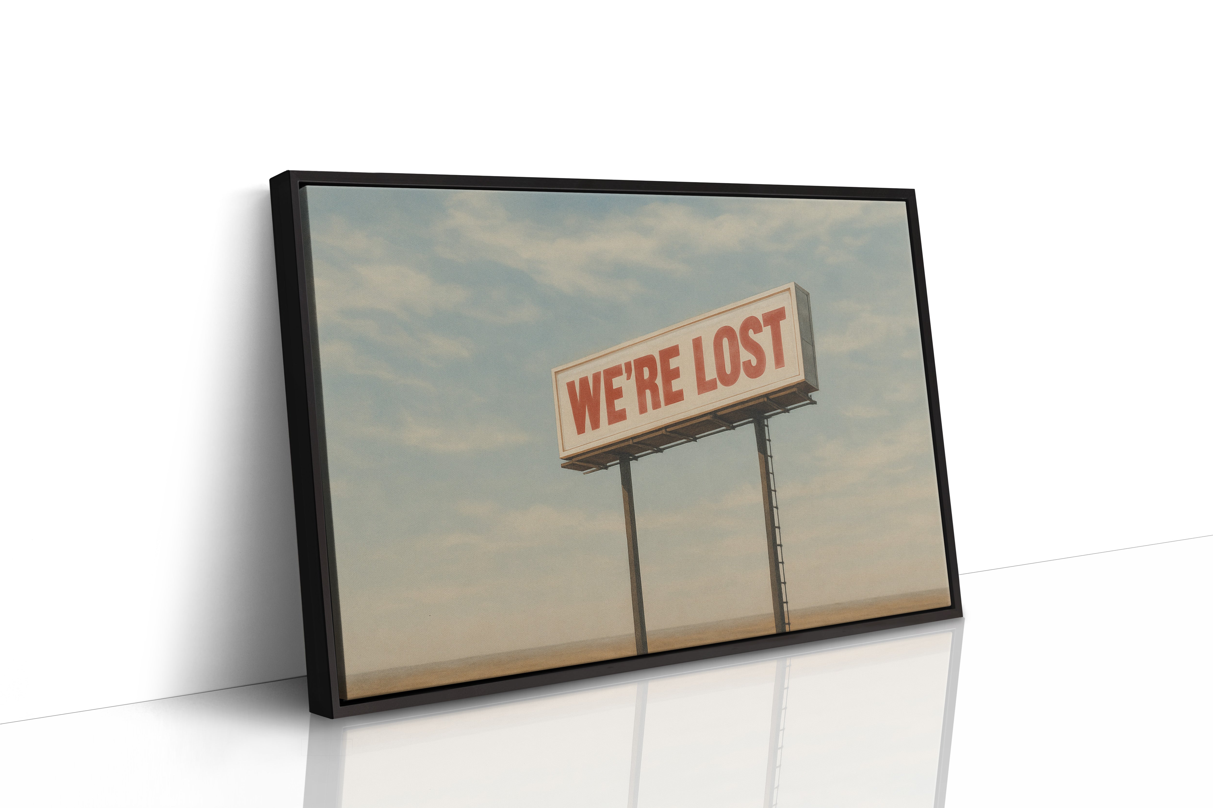 A stark billboard towers over empty desert, boldly declaring what we’re all thinking. This whimsical roadside print blends dry humor with cinematic stillness.