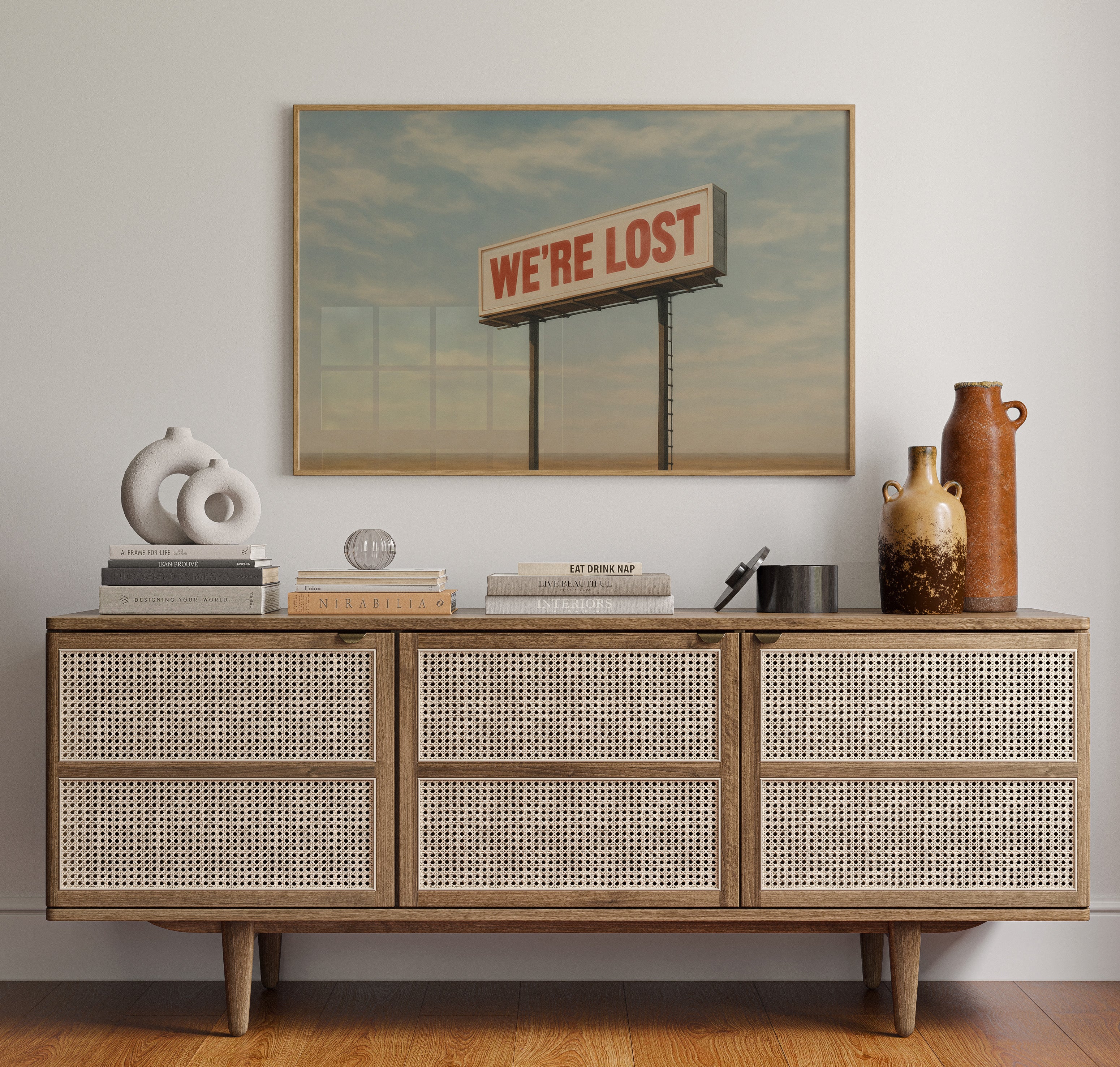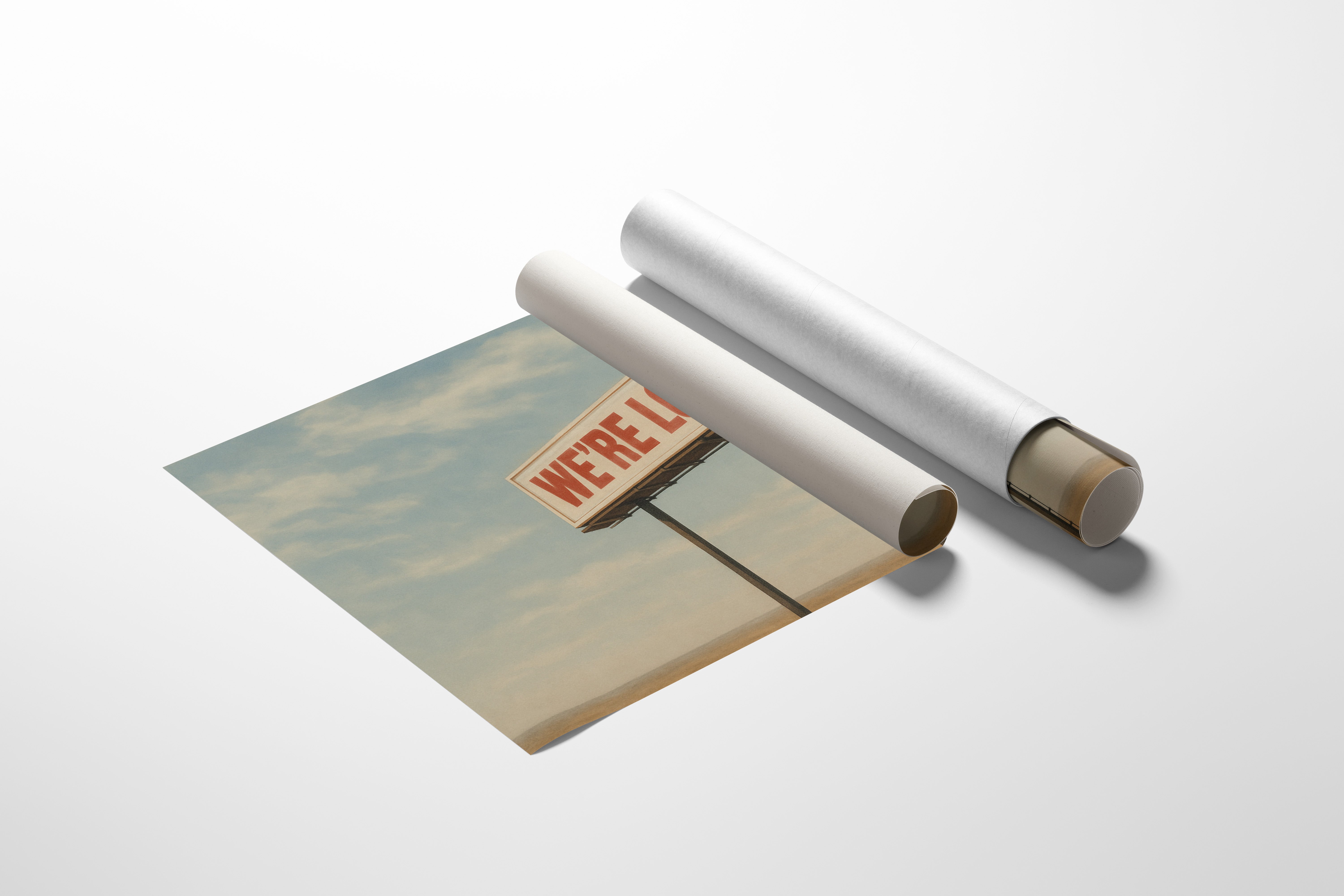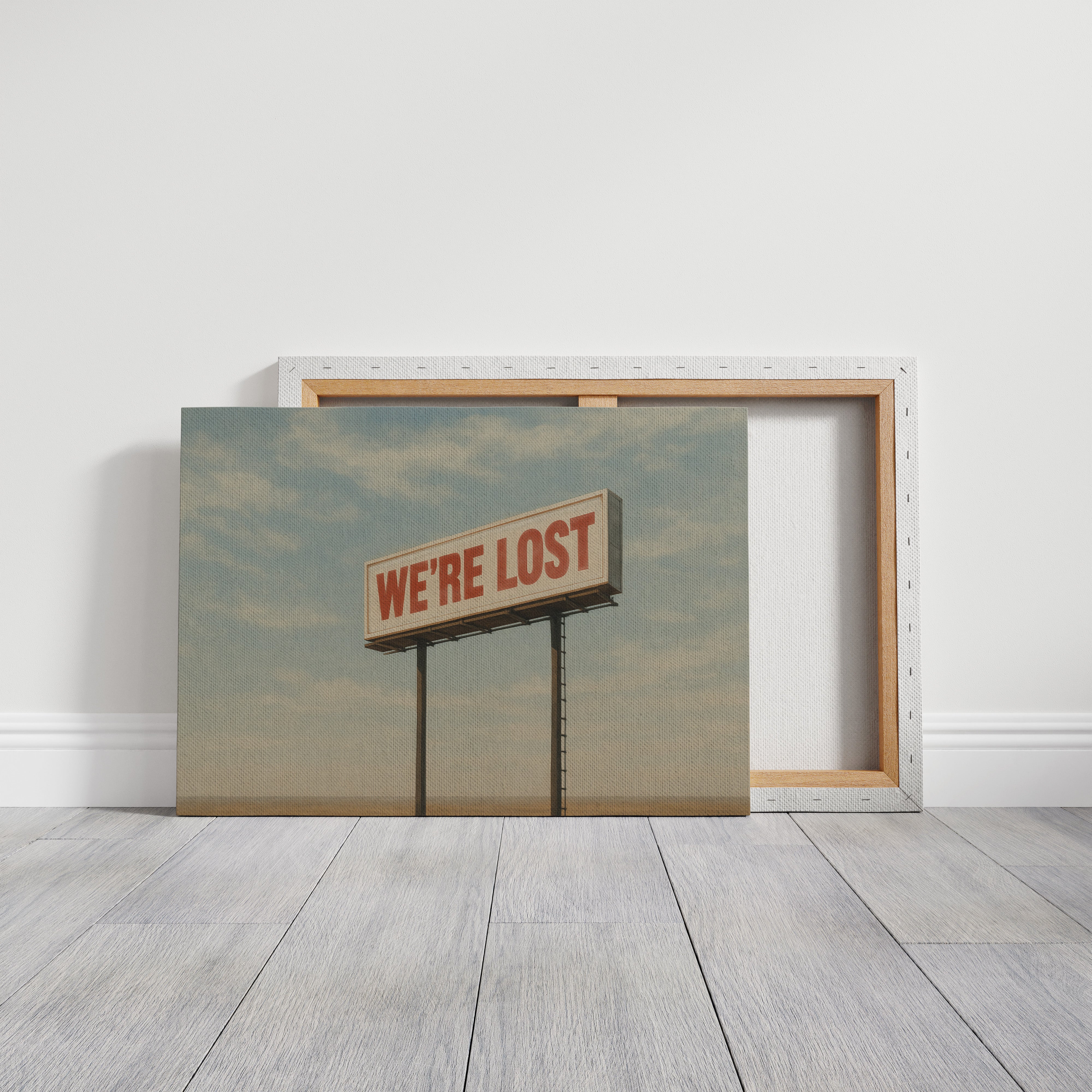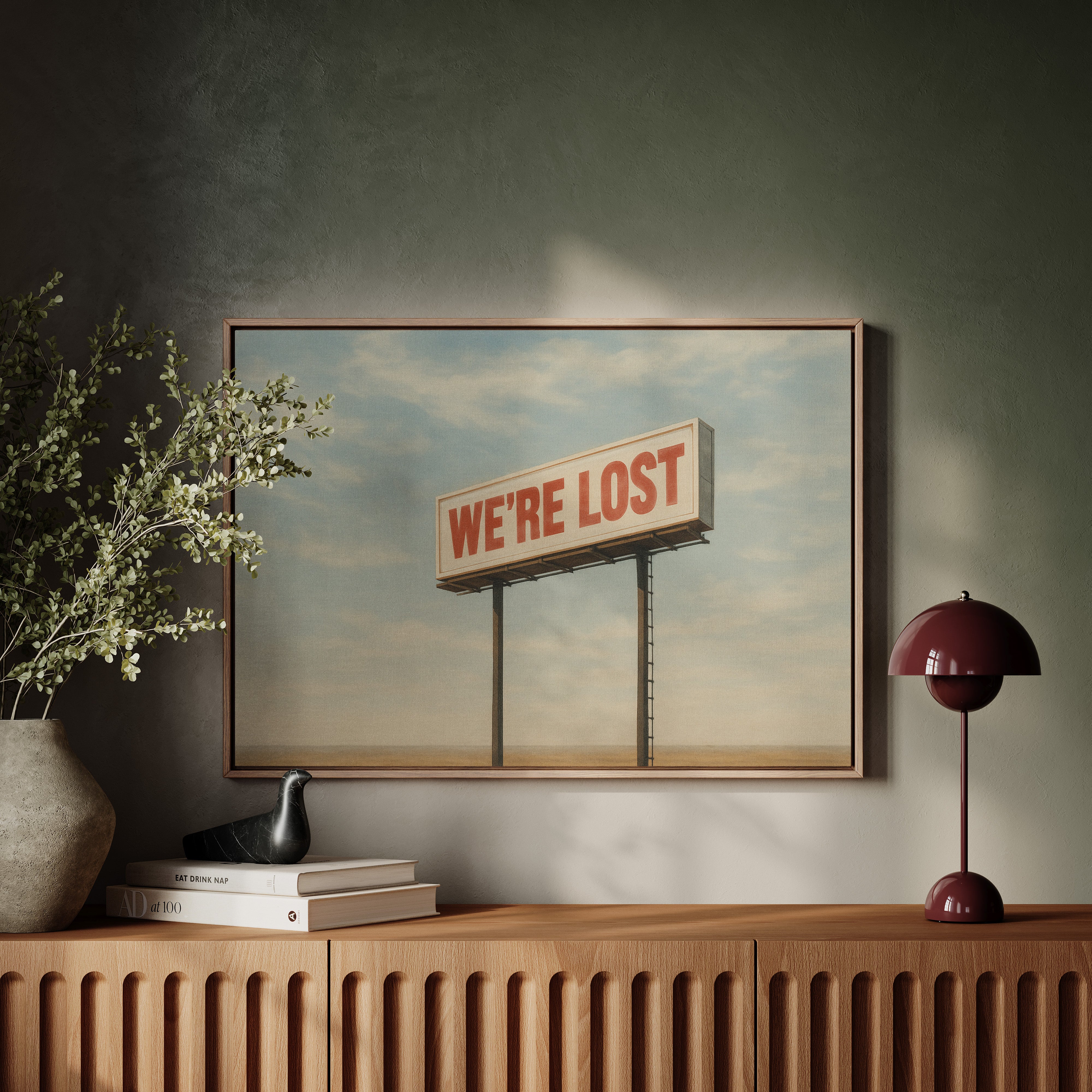 A stark billboard towers over empty desert, boldly declaring what we’re all thinking. This whimsical roadside print blends dry humor with cinematic stillness.