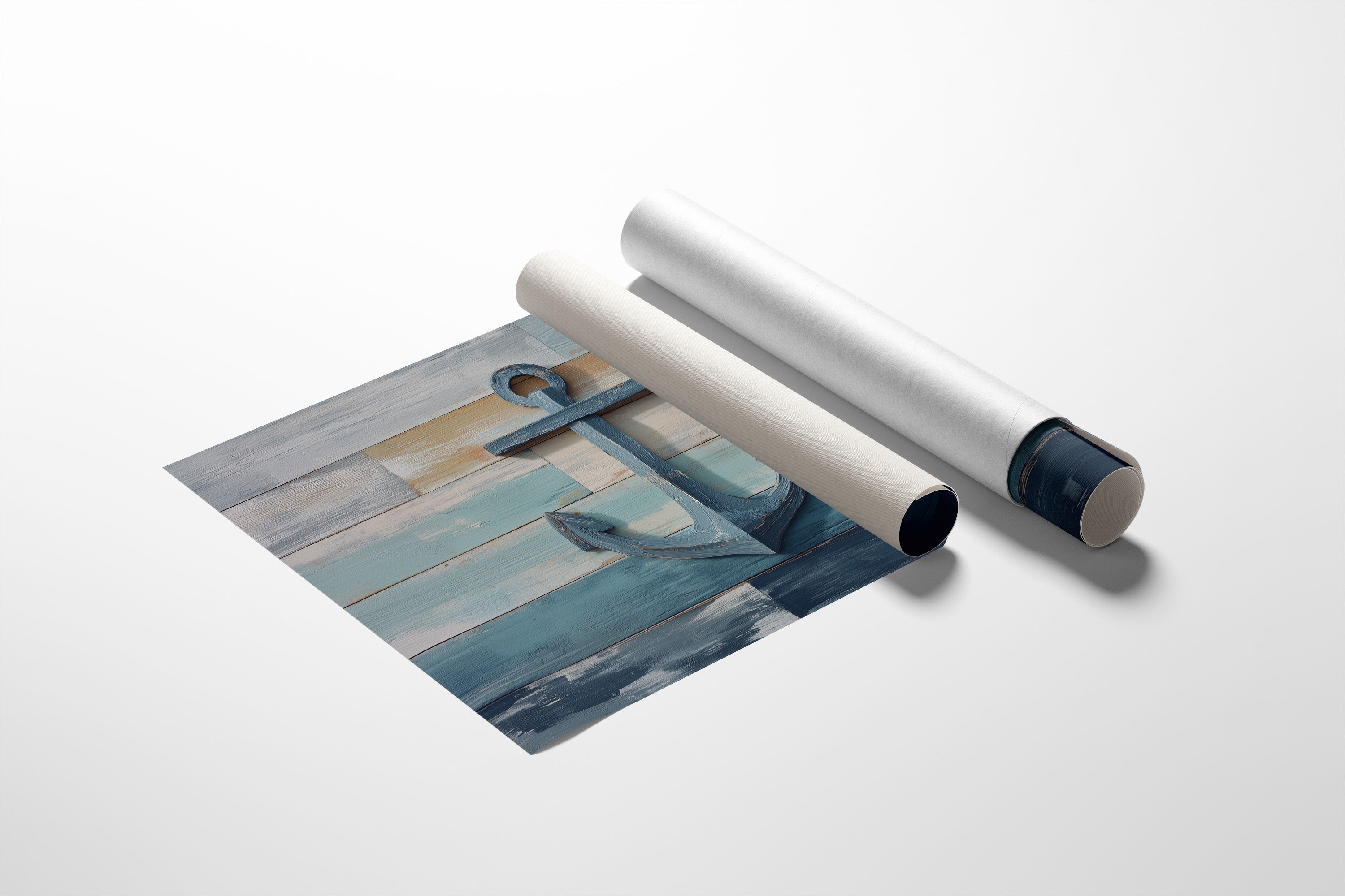 The rustic blue anchor stands steadfast against a backdrop of weathered wooden planks, evoking memories of coastal journeys and maritime tales. Varying shades of azure, teal, and weathered grays create a patchwork of oceanic hues, while subtle hints of warm amber suggest sunsets over calm waters. This piece brings the tranquil essence of seaside living into any space, creating a perfect focal point for a coastal-inspired living room or serene bedroom retreat.