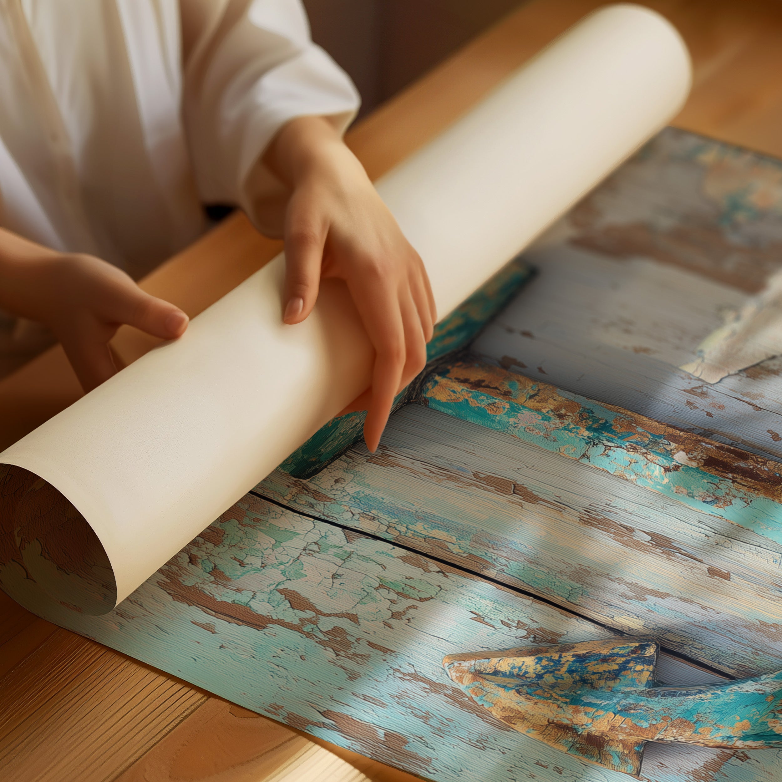 Sunlight dances across the distressed turquoise anchor, its peeling paint revealing stories of salt and time. The rustic wooden backdrop captures the essence of coastal memories, where aqua blues fade into weathered grays like forgotten seaside afternoons. This piece brings a touch of nautical nostalgia into a contemporary setting, perfectly balanced against the modern leather and clean lines of the surrounding space.