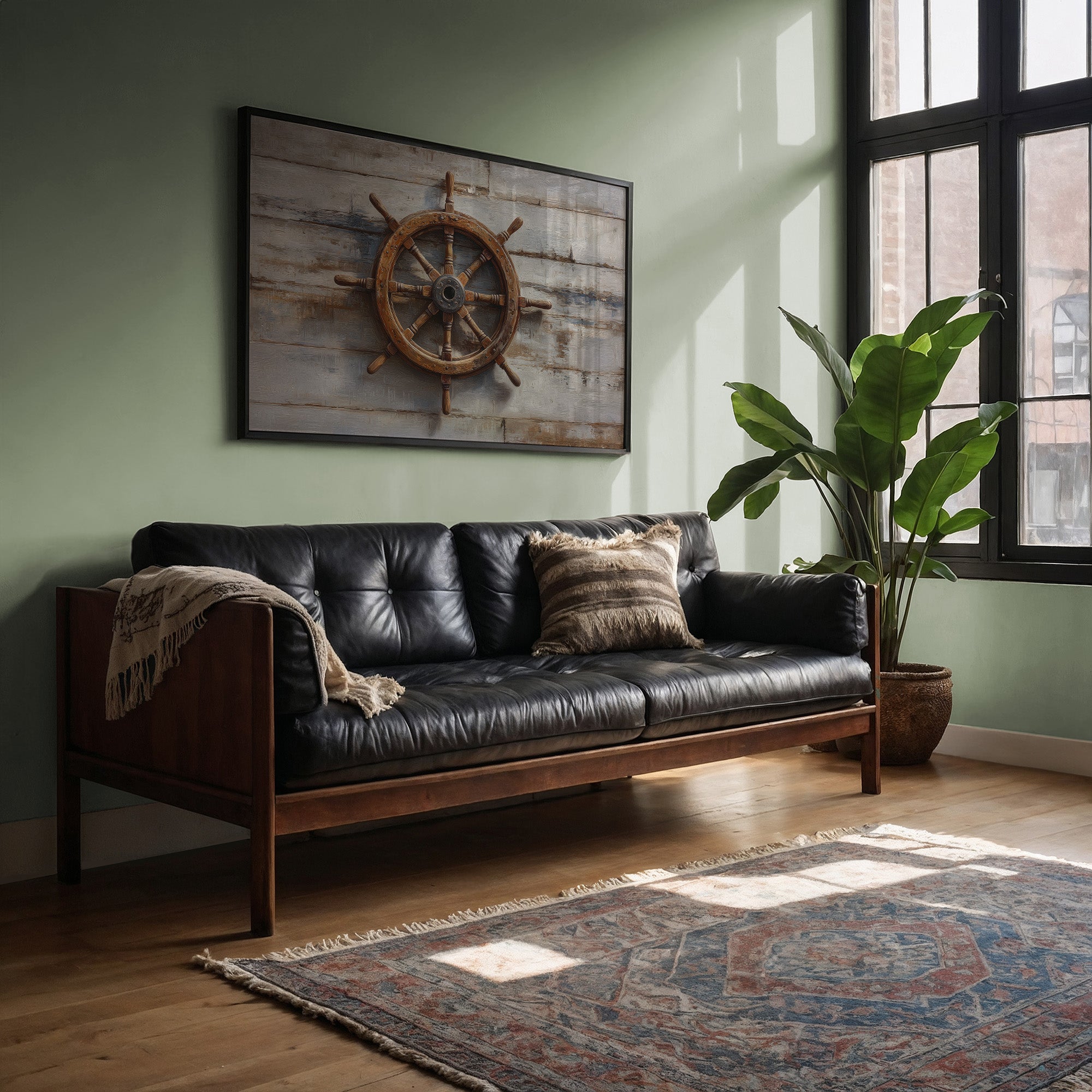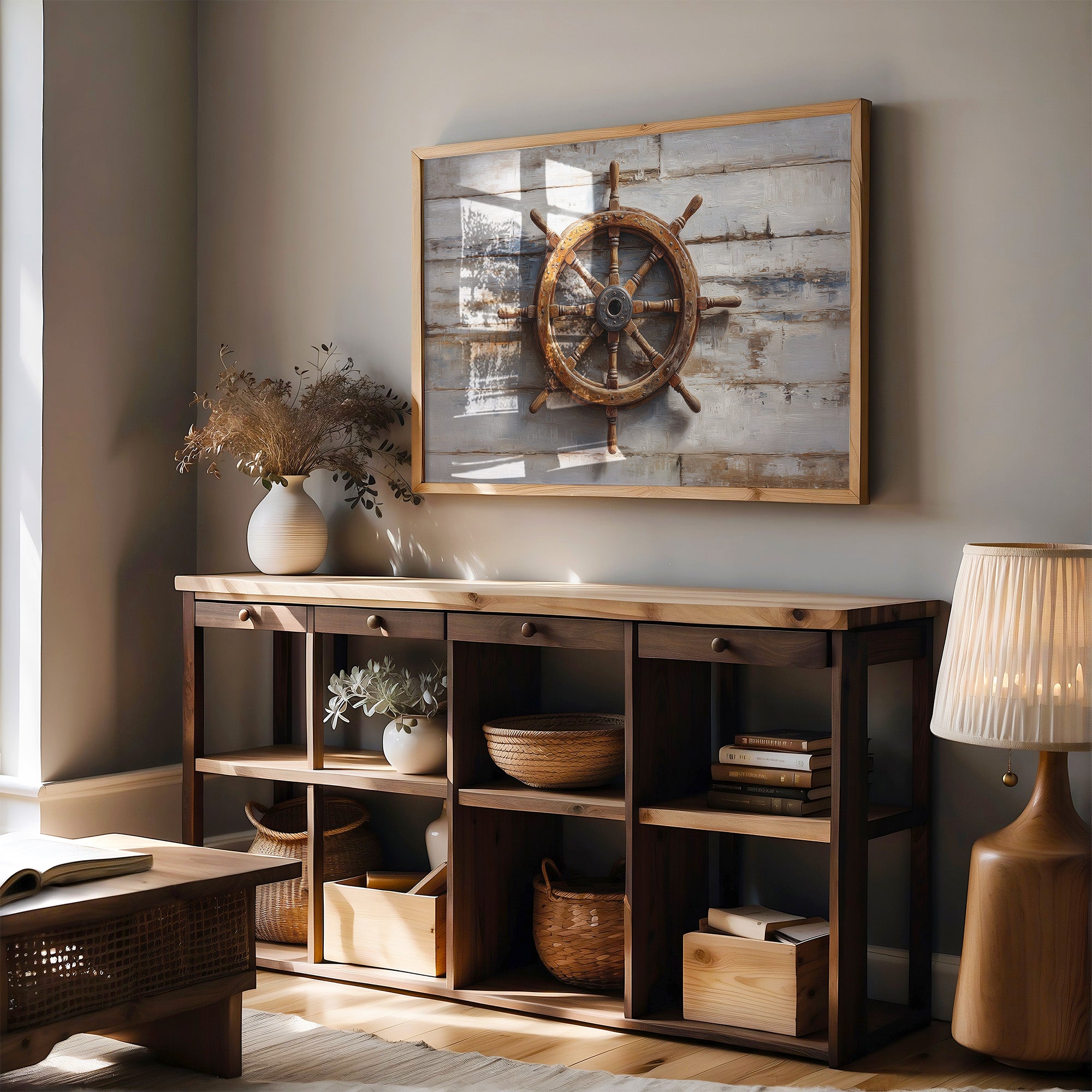 The rich patina of an aged ship's wheel rests against weathered planks, telling tales of distant voyages and salty air. Warm honey-toned wood contrasts beautifully with the silvery-blue backdrop, creating a visual narrative of maritime heritage and adventure. This striking coastal piece brings a sense of wanderlust and quiet strength to dining rooms, home offices, or any space where you seek to infuse a sense of purpose and direction.