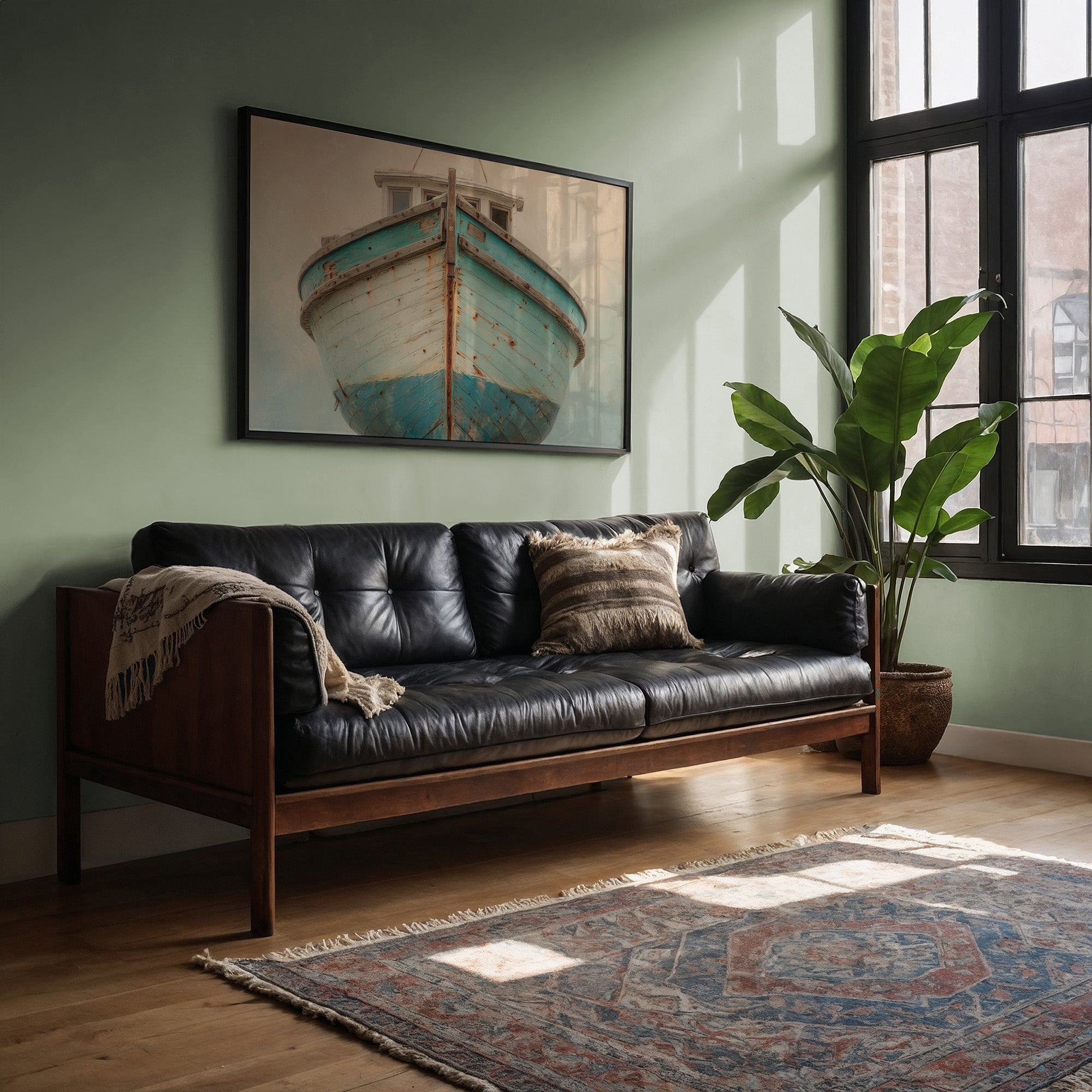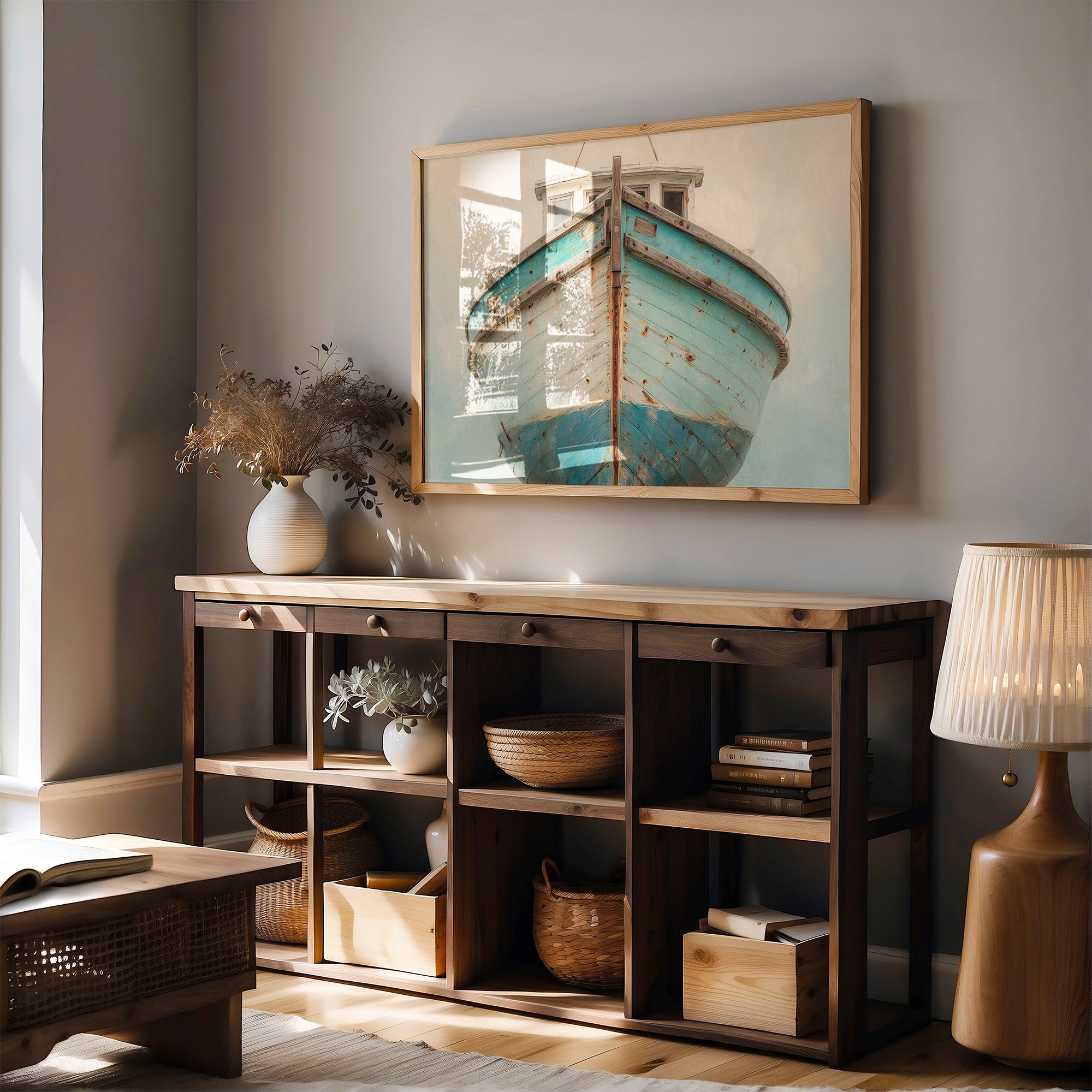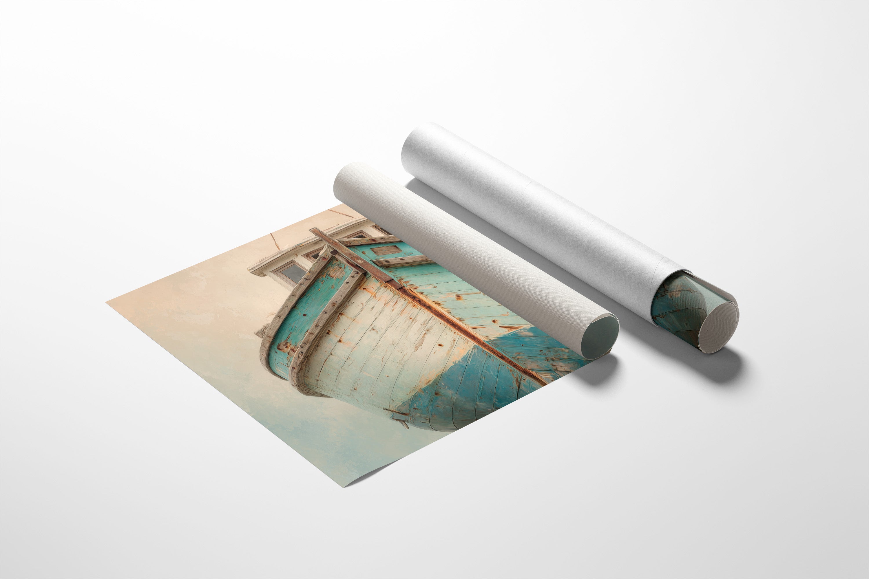 A forgotten fishing boat rests in silent dignity, its weathered turquoise hull telling stories of countless journeys across restless waters. The patina of rust and faded paint creates a beautiful testament to time, where each scratch and dent represents a memory etched into its wooden frame. The soft, neutral background enhances the boat's character, allowing its sea-worn charm to become a focal point of quiet nostalgia.