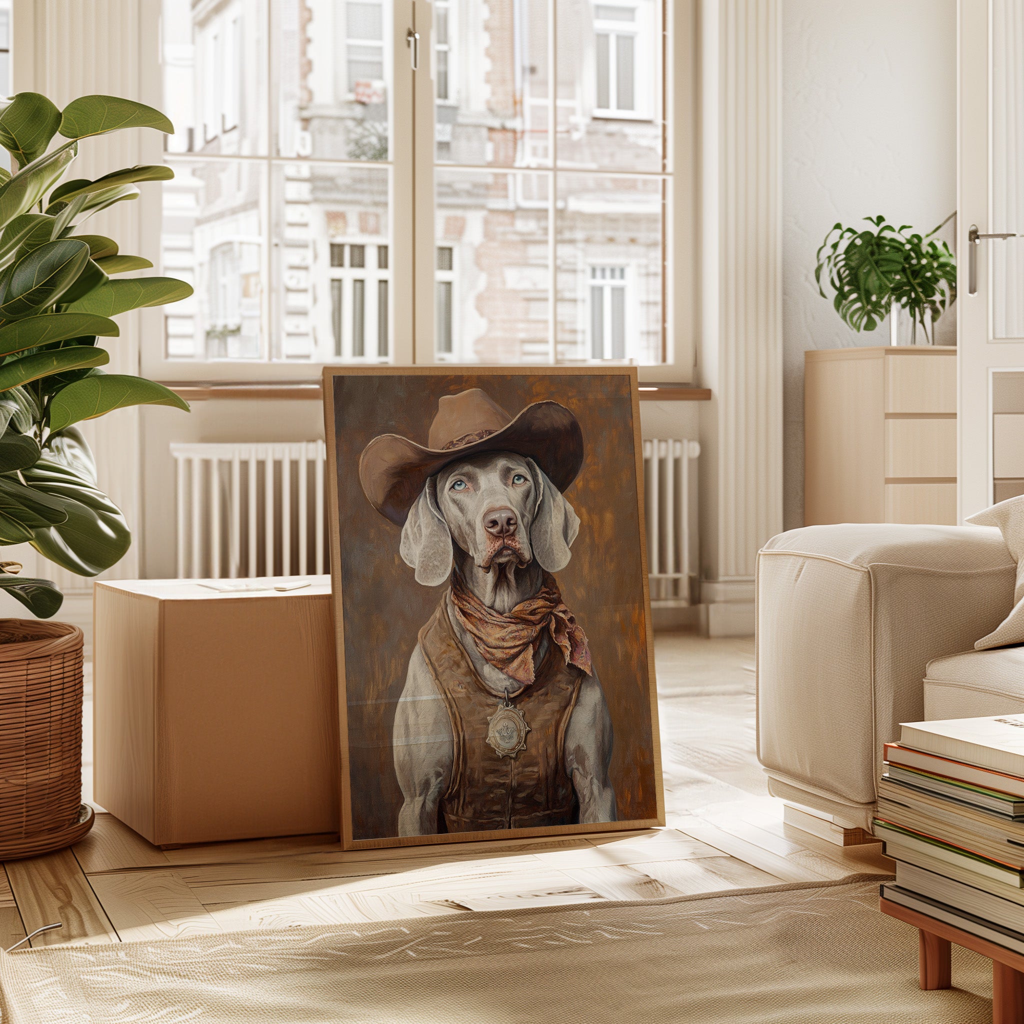 Cool-toned and commanding, this Weimaraner exudes quiet strength—an old soul with desert dust on his badge and loyalty in his bones.