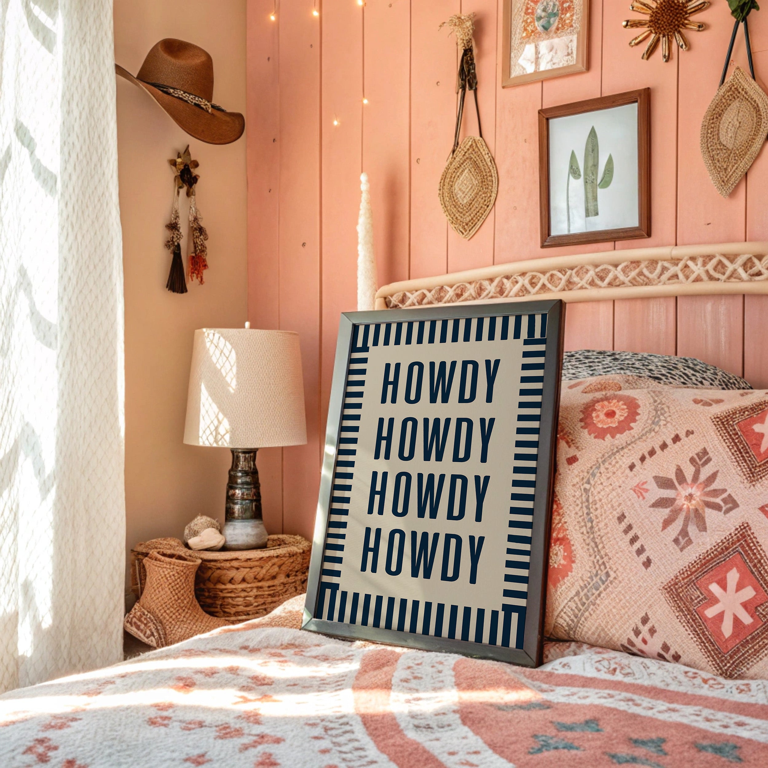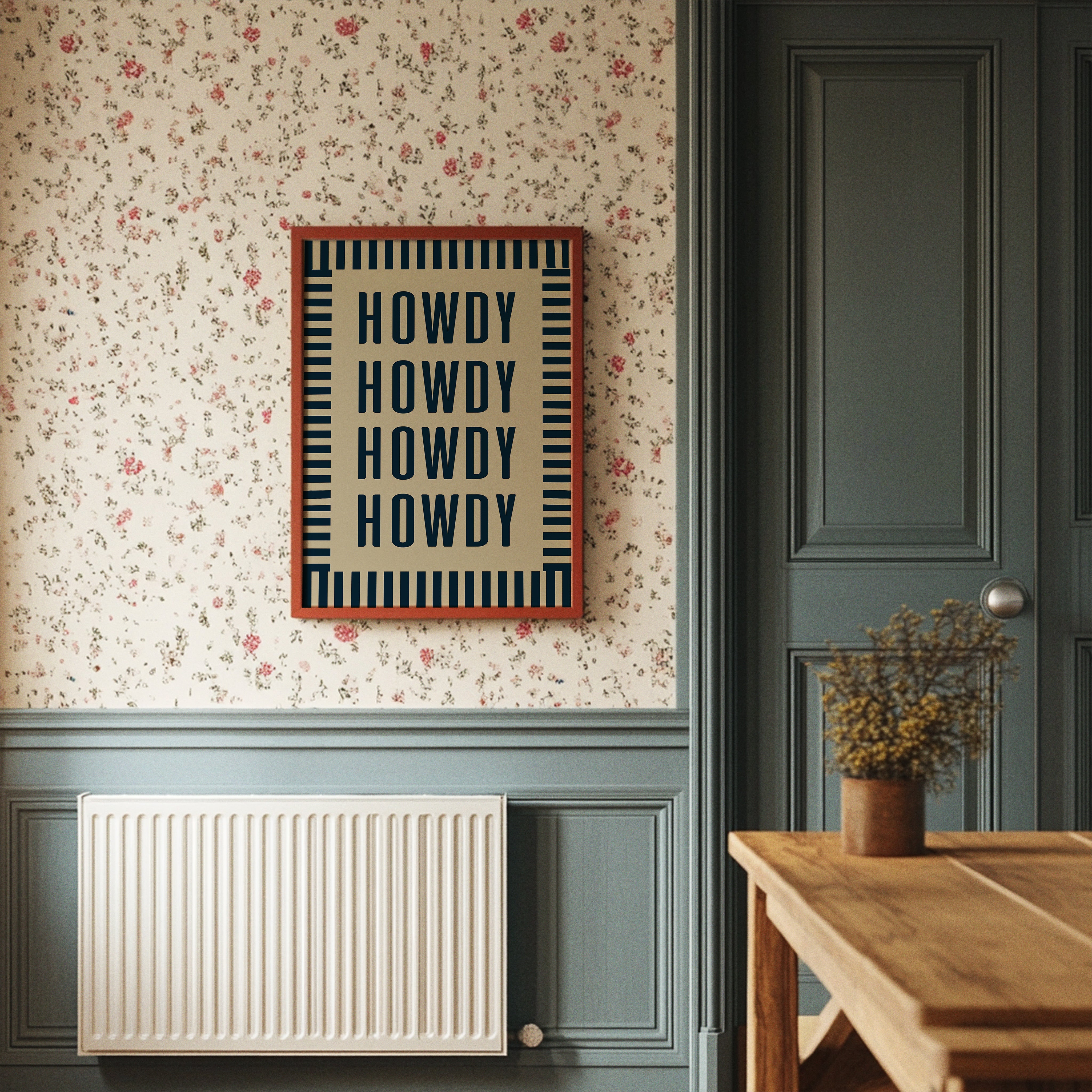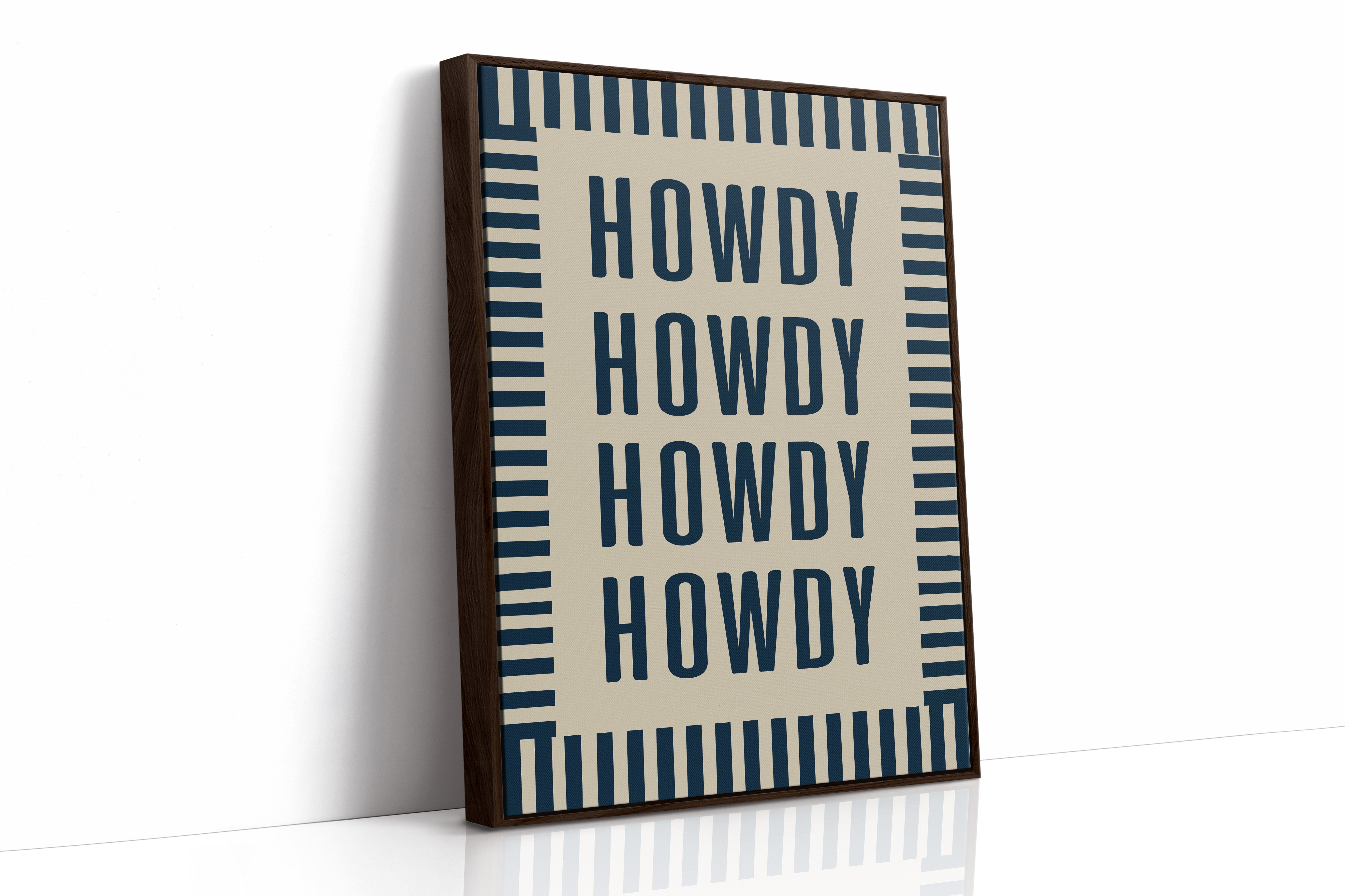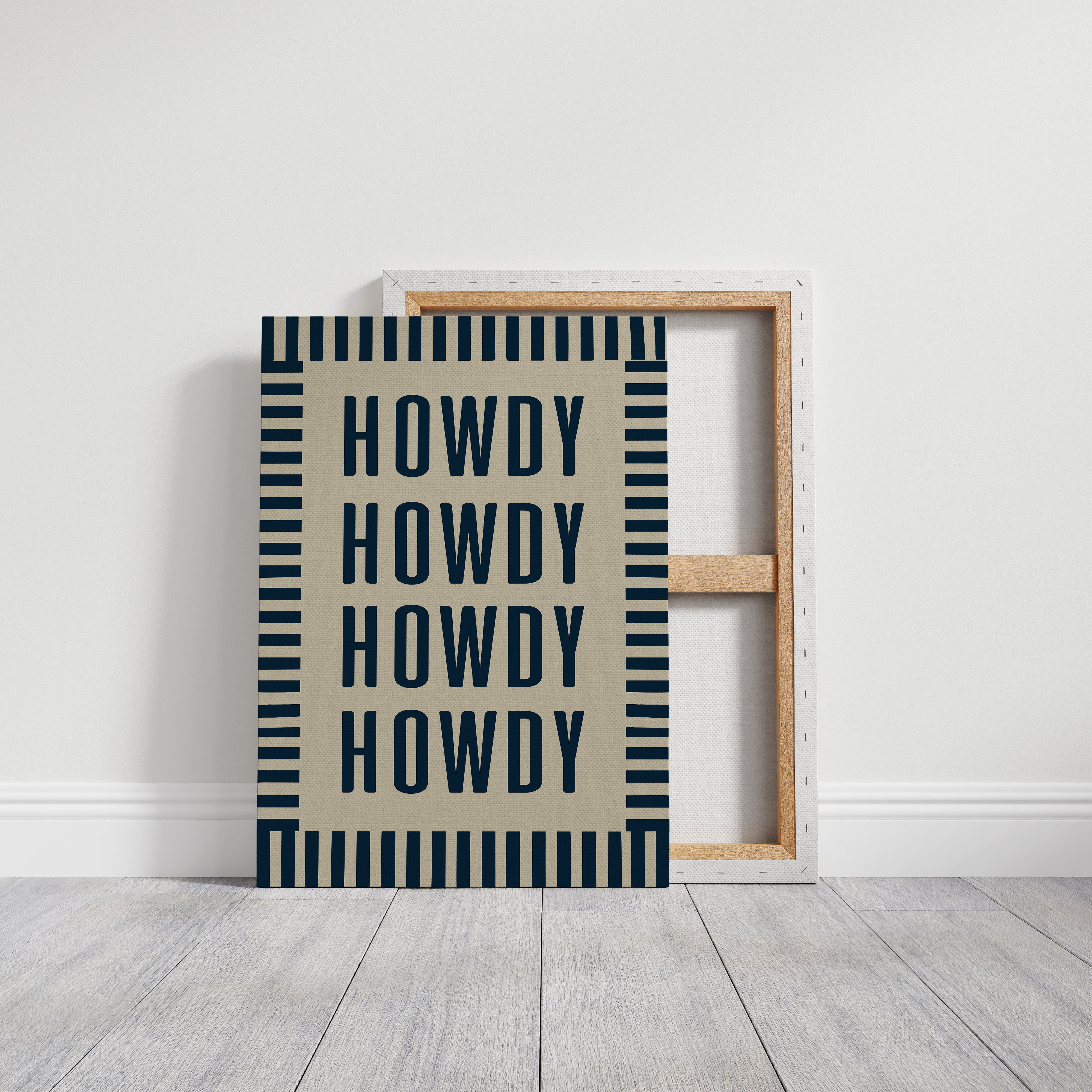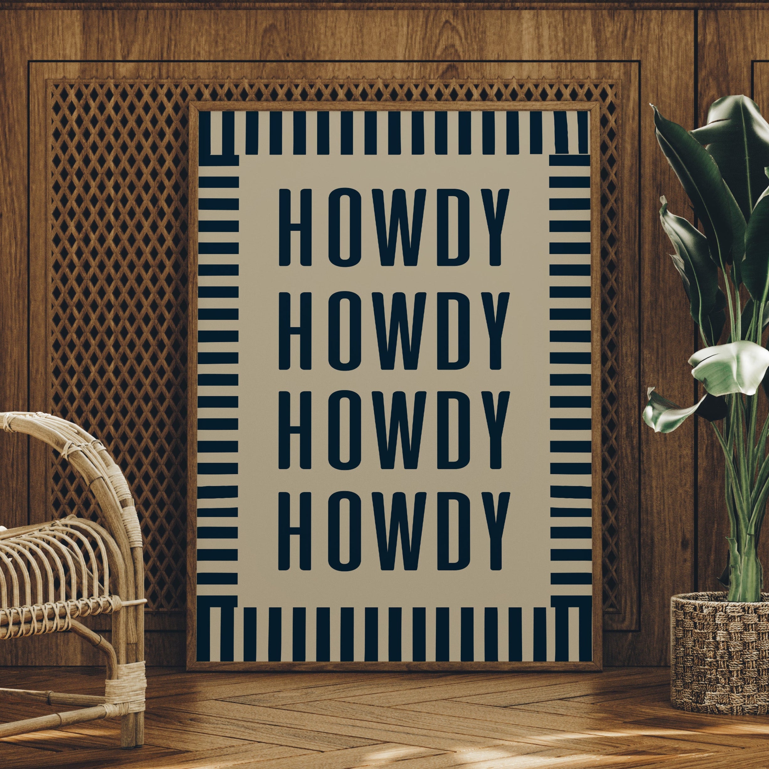 A warm welcome repeats like a friendly chorus, each 'howdy' stacked with casual grace against a sun-weathered backdrop. Bold navy stripes frame this charming greeting with geometric precision, creating a modern take on classic Western hospitality. The repeating text plays with scale and spacing, turning a simple salutation into a striking visual rhythm that captures the straightforward warmth of ranch life. Perfect for bringing a touch of Southern charm to a modern farmhouse kitchen, entryway, or any space that could use a dose of down-home welcome.
