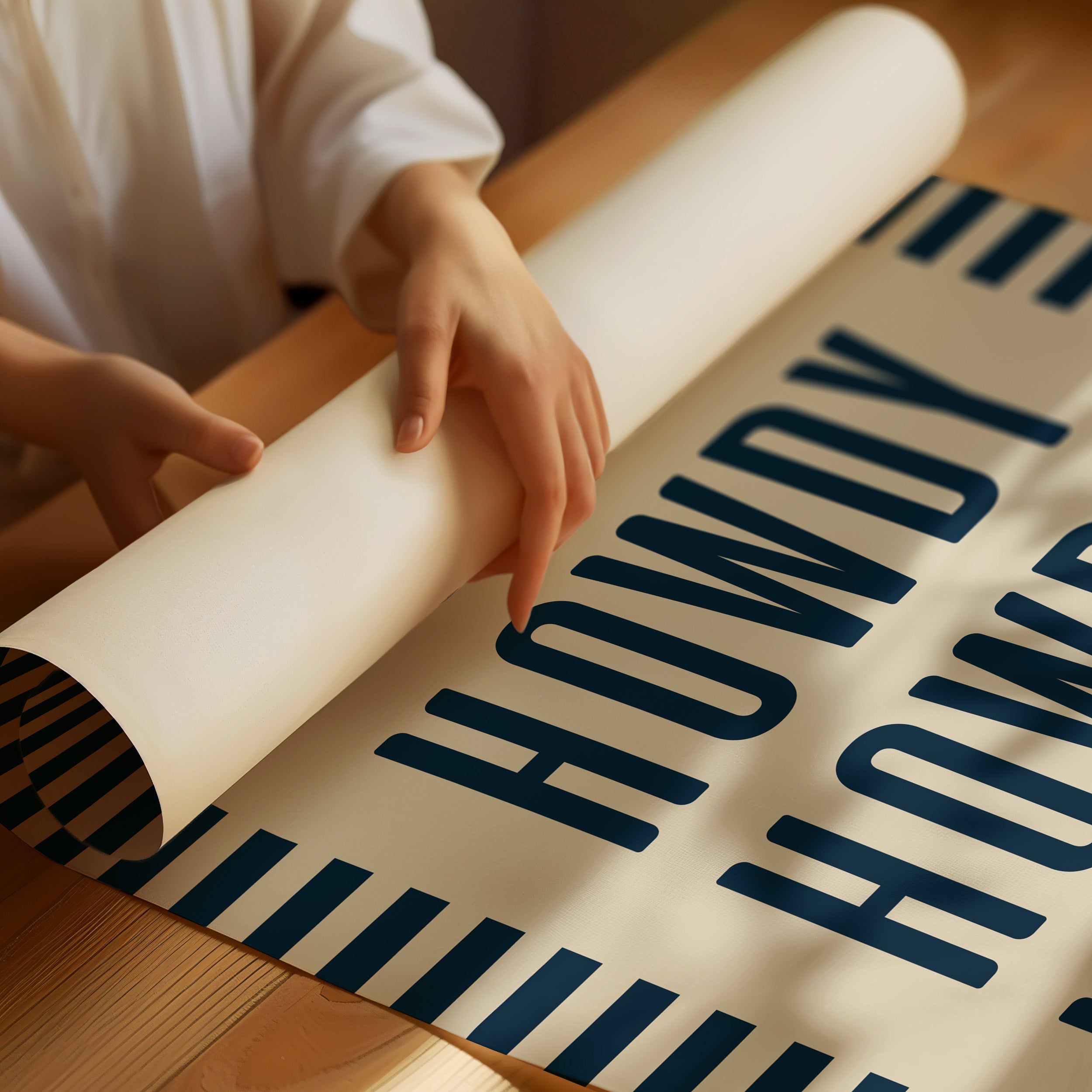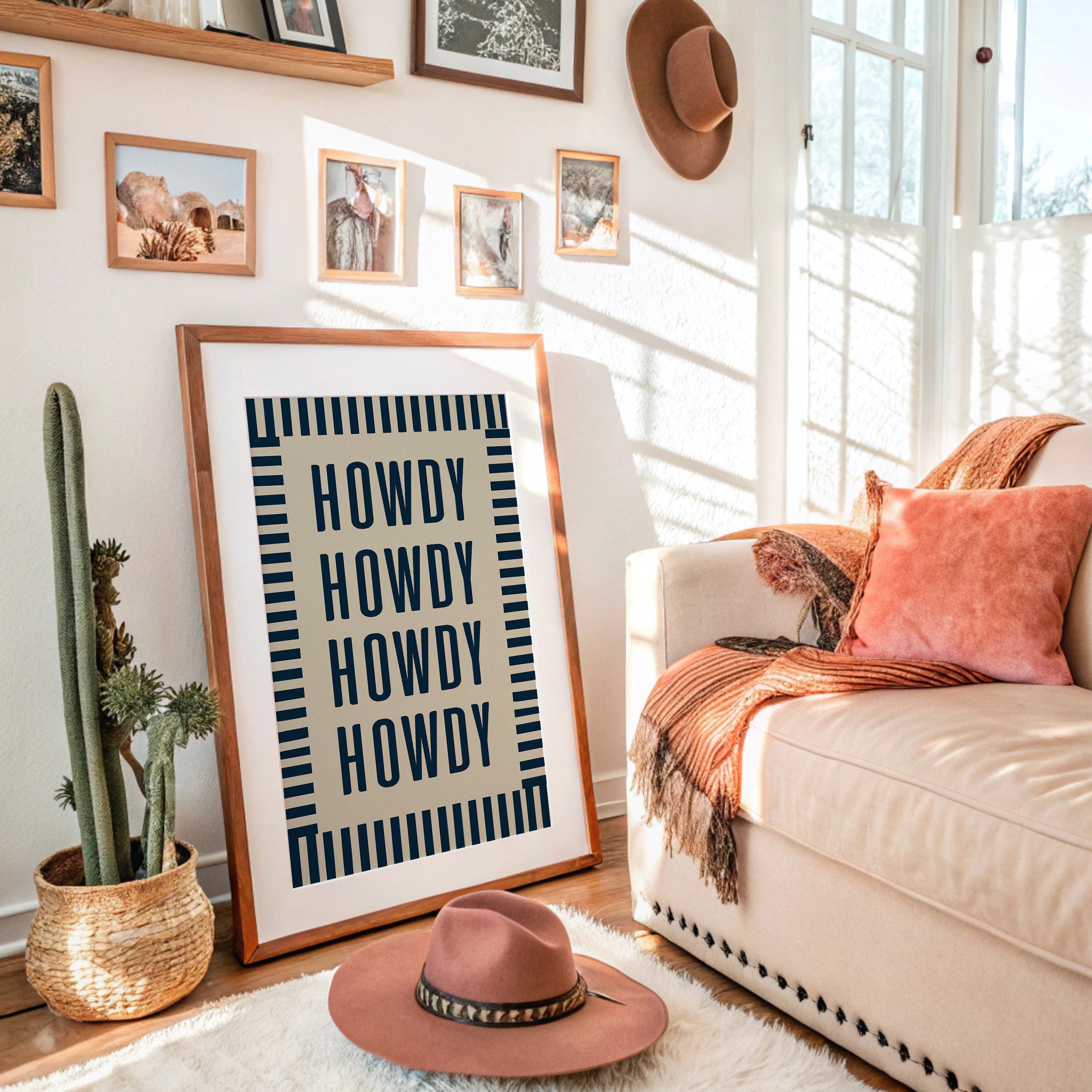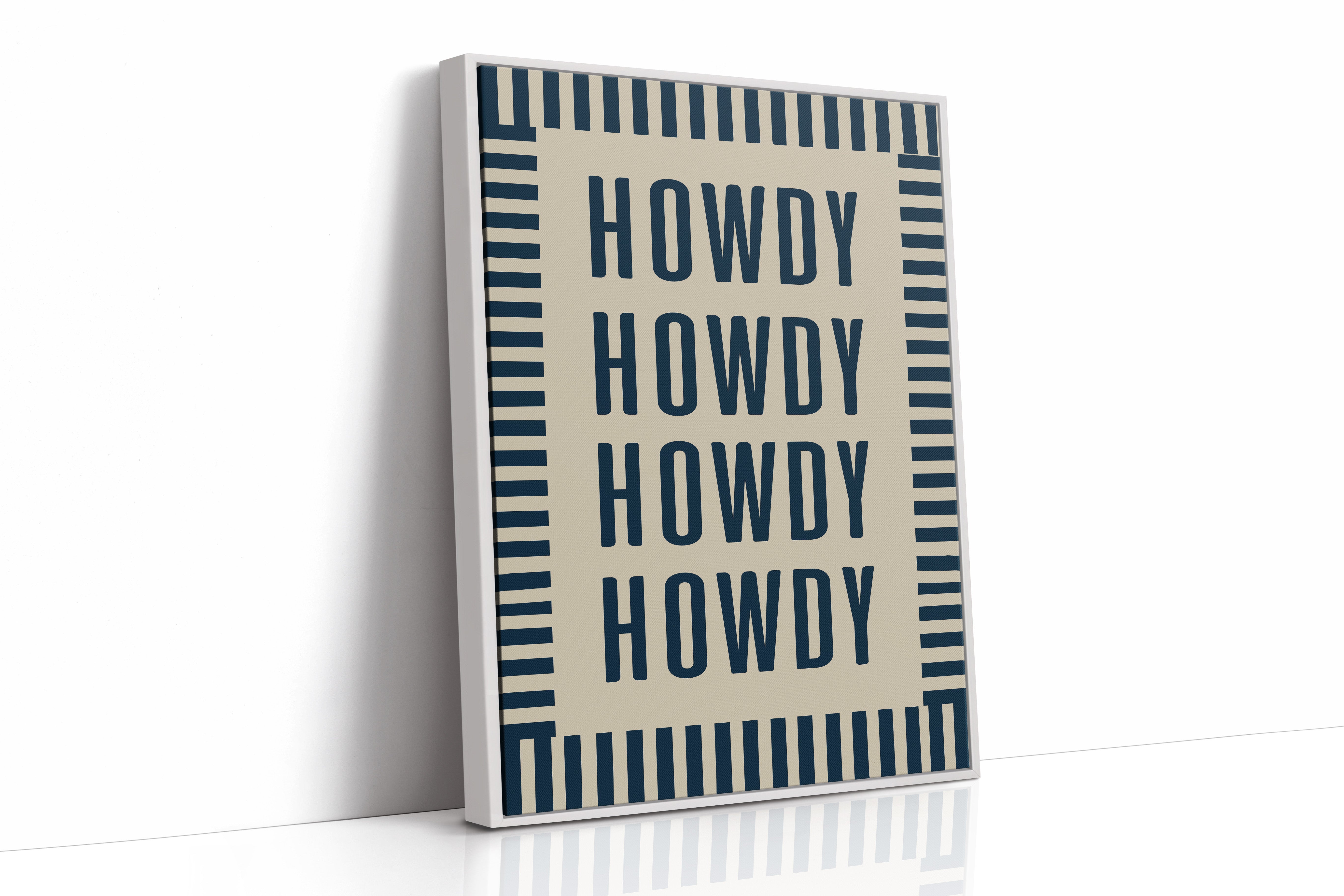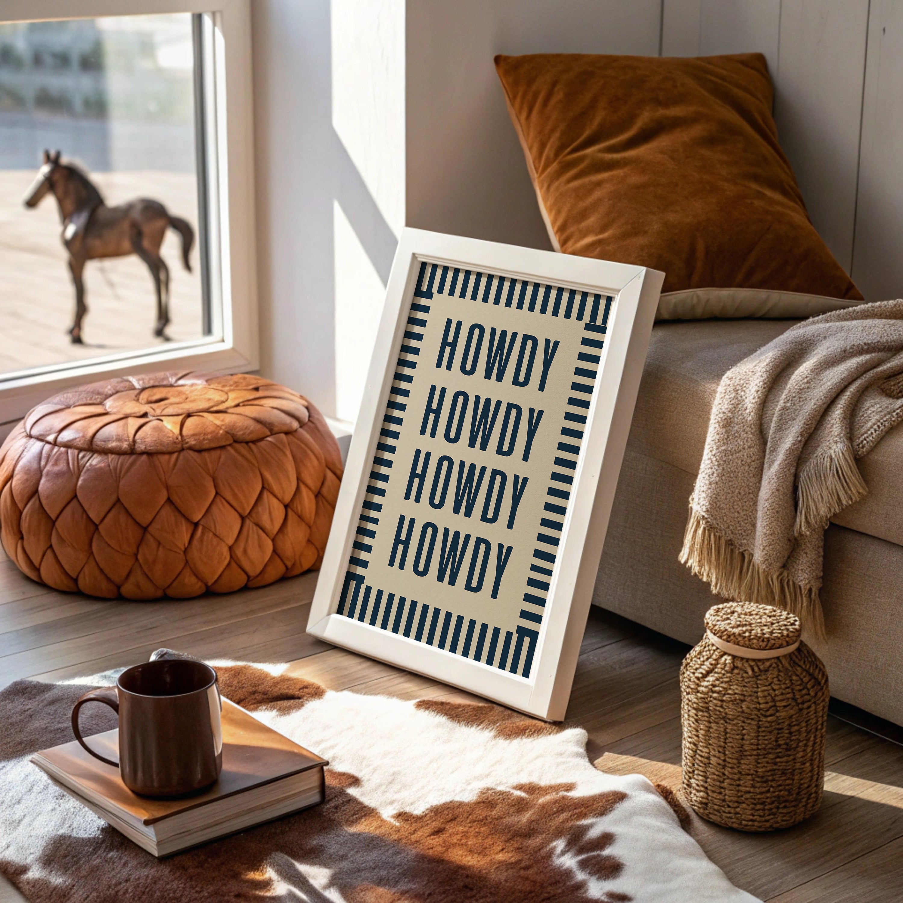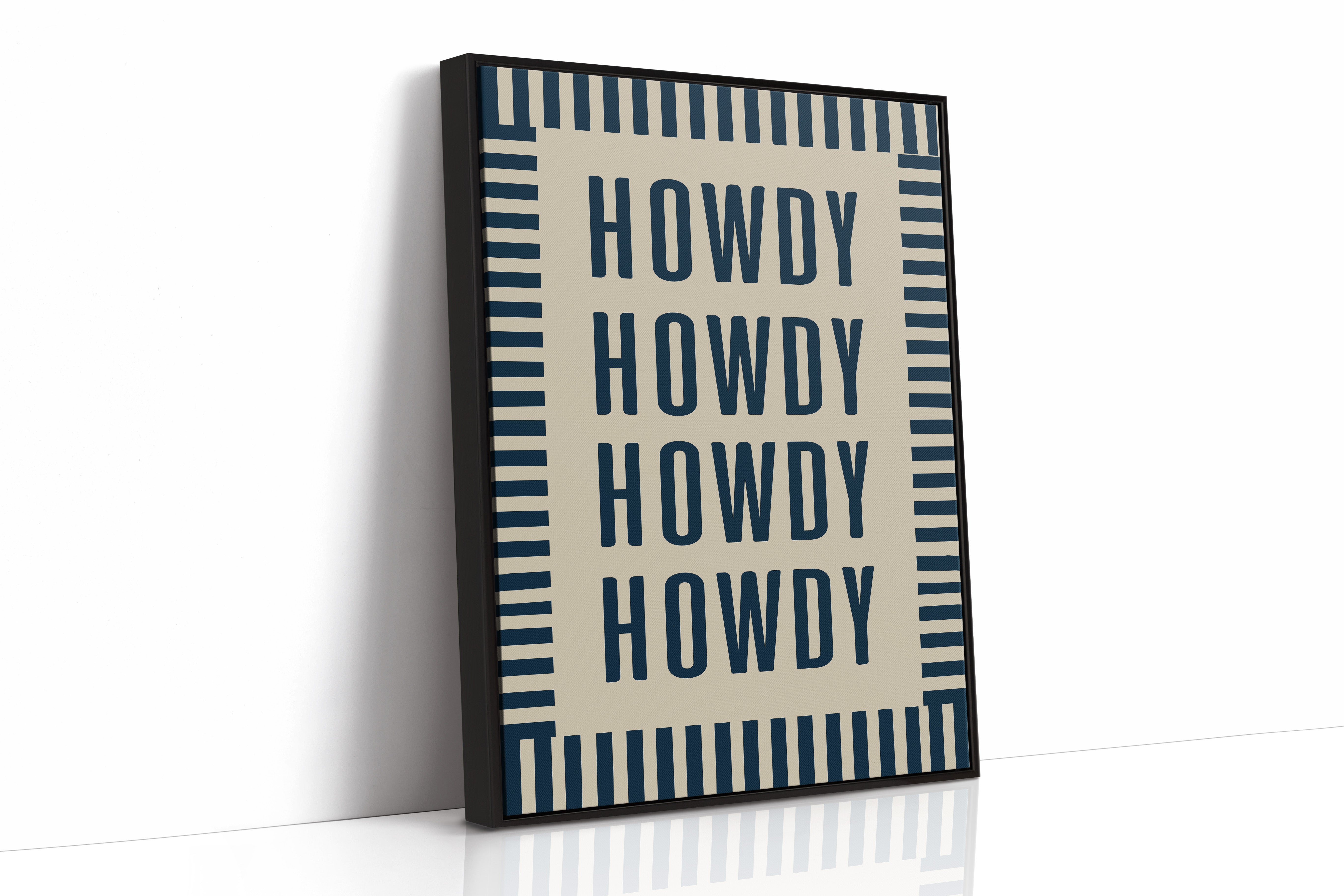 A warm welcome repeats like a friendly chorus, each 'howdy' stacked with casual grace against a sun-weathered backdrop. Bold navy stripes frame this charming greeting with geometric precision, creating a modern take on classic Western hospitality. The repeating text plays with scale and spacing, turning a simple salutation into a striking visual rhythm that captures the straightforward warmth of ranch life. Perfect for bringing a touch of Southern charm to a modern farmhouse kitchen, entryway, or any space that could use a dose of down-home welcome.