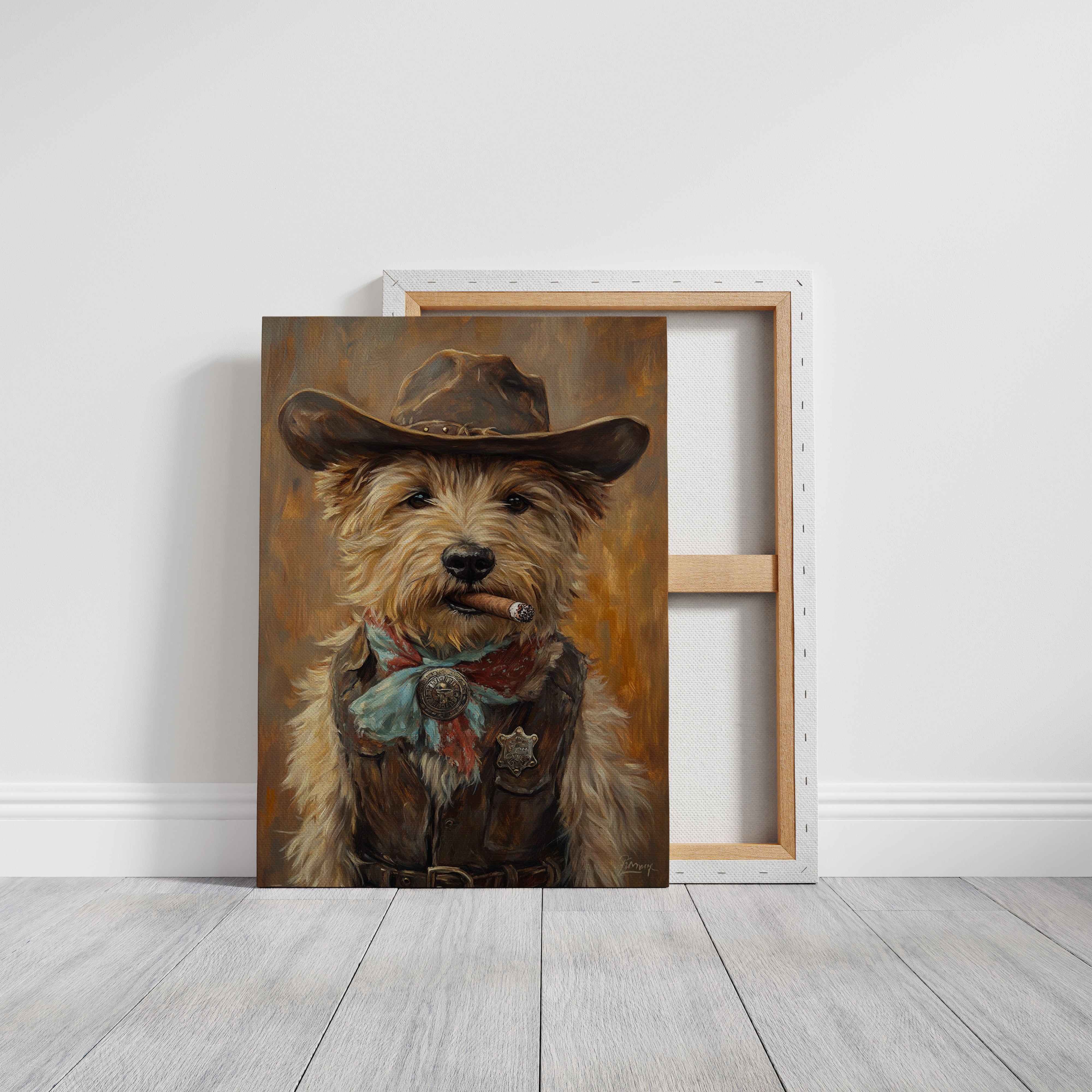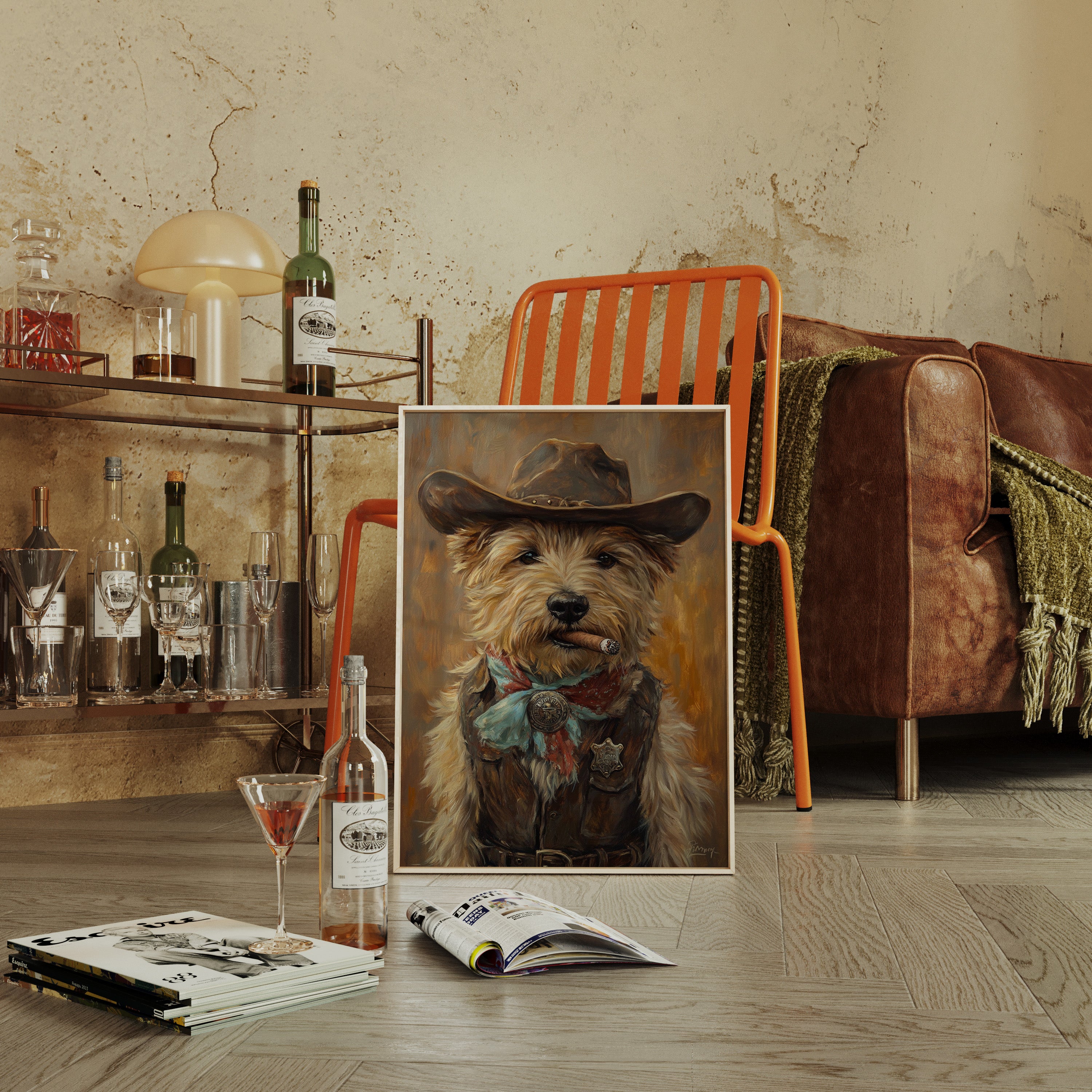This Wheaten Terrier exudes cool confidence with a cigar and a dusty badge, embodying the charm and grit of an old west lawman.