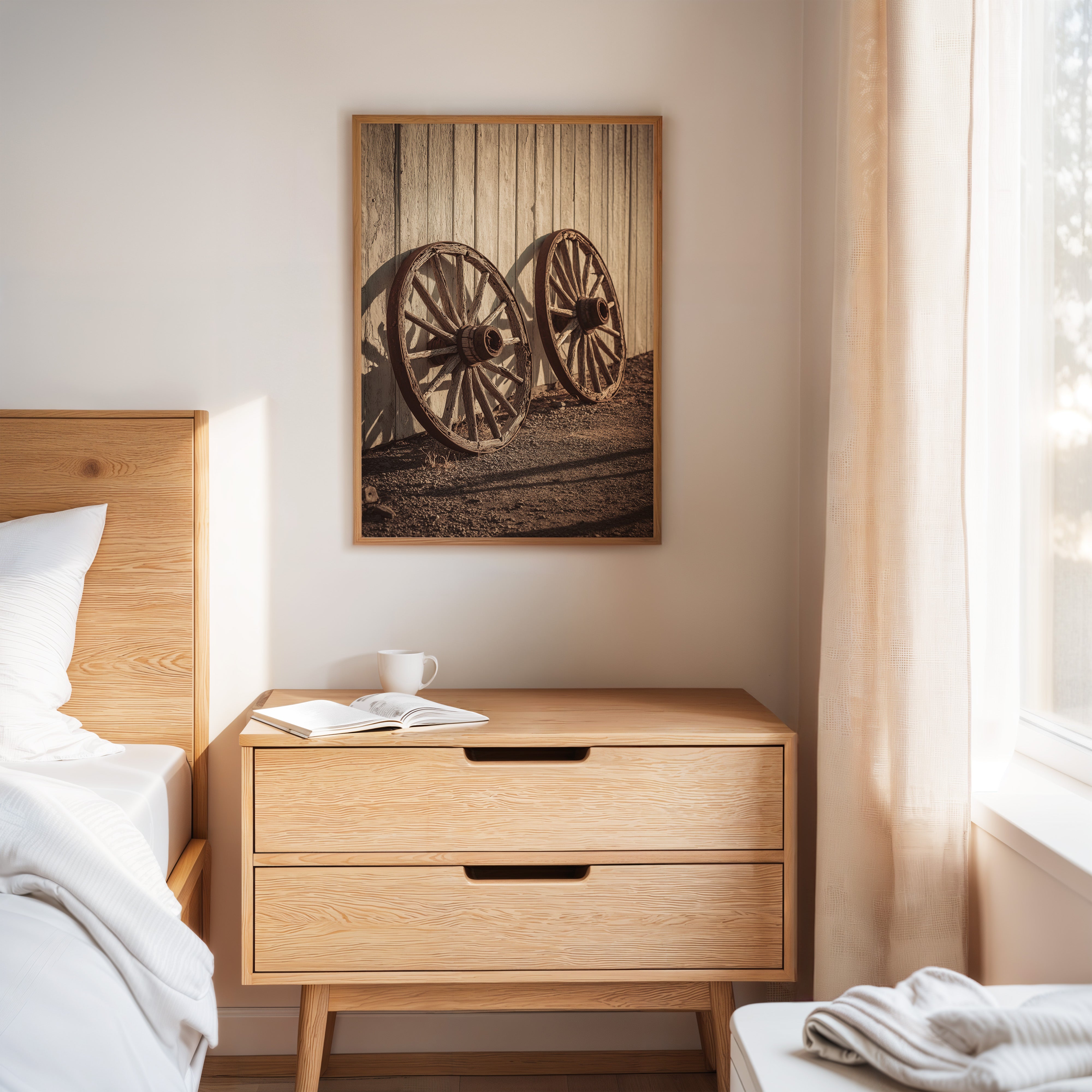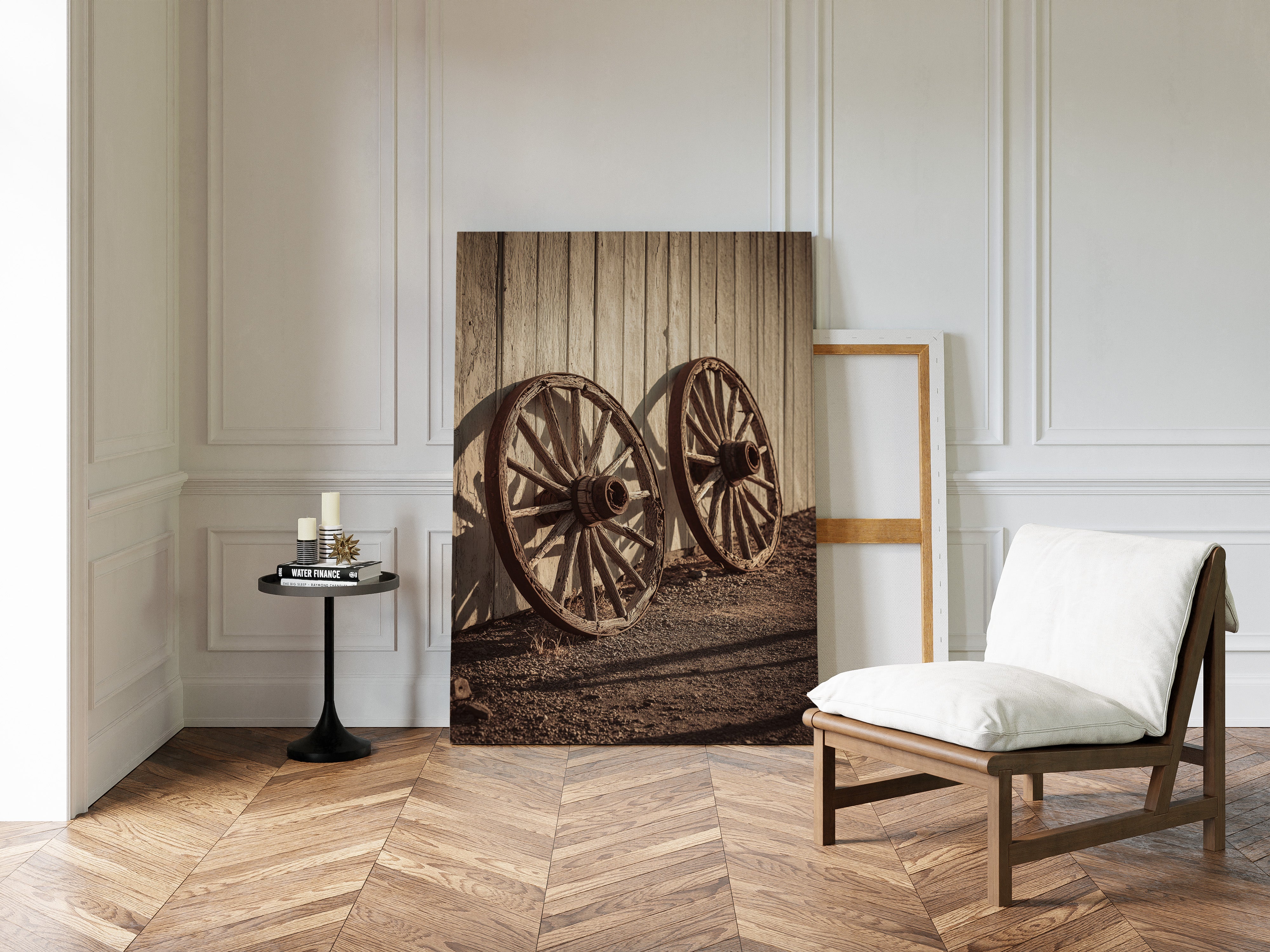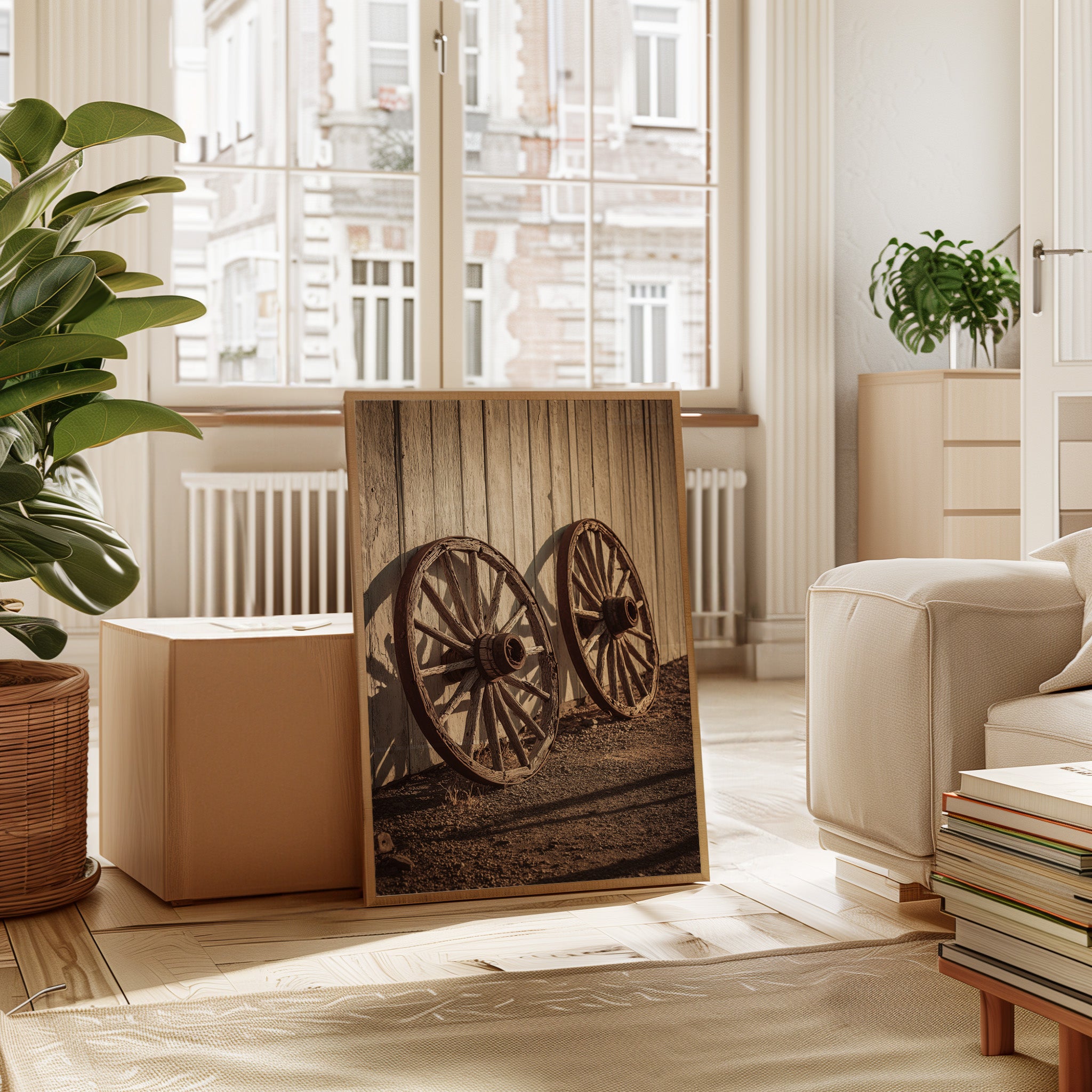 This captivating piece captures the essence of rustic charm, highlighting the intricate details of worn wagon wheels against a rugged wooden backdrop. The sepia tones evoke nostalgia, bringing to life the simplicity and strength of rural history.