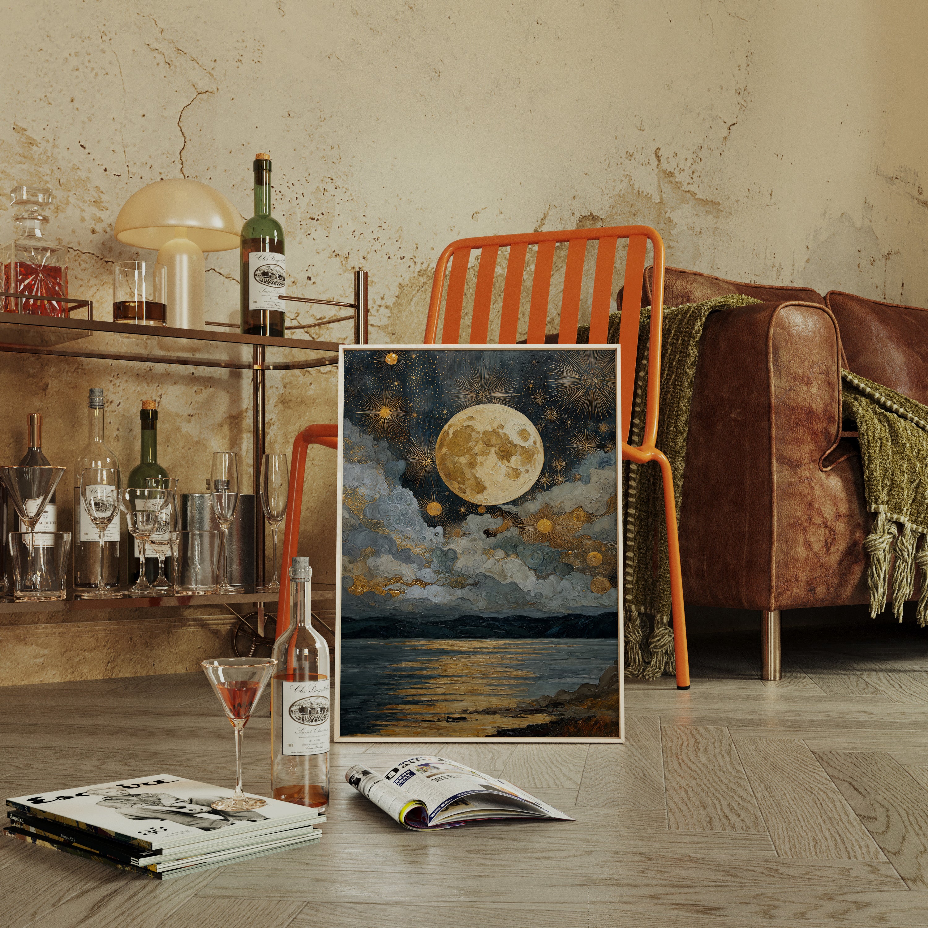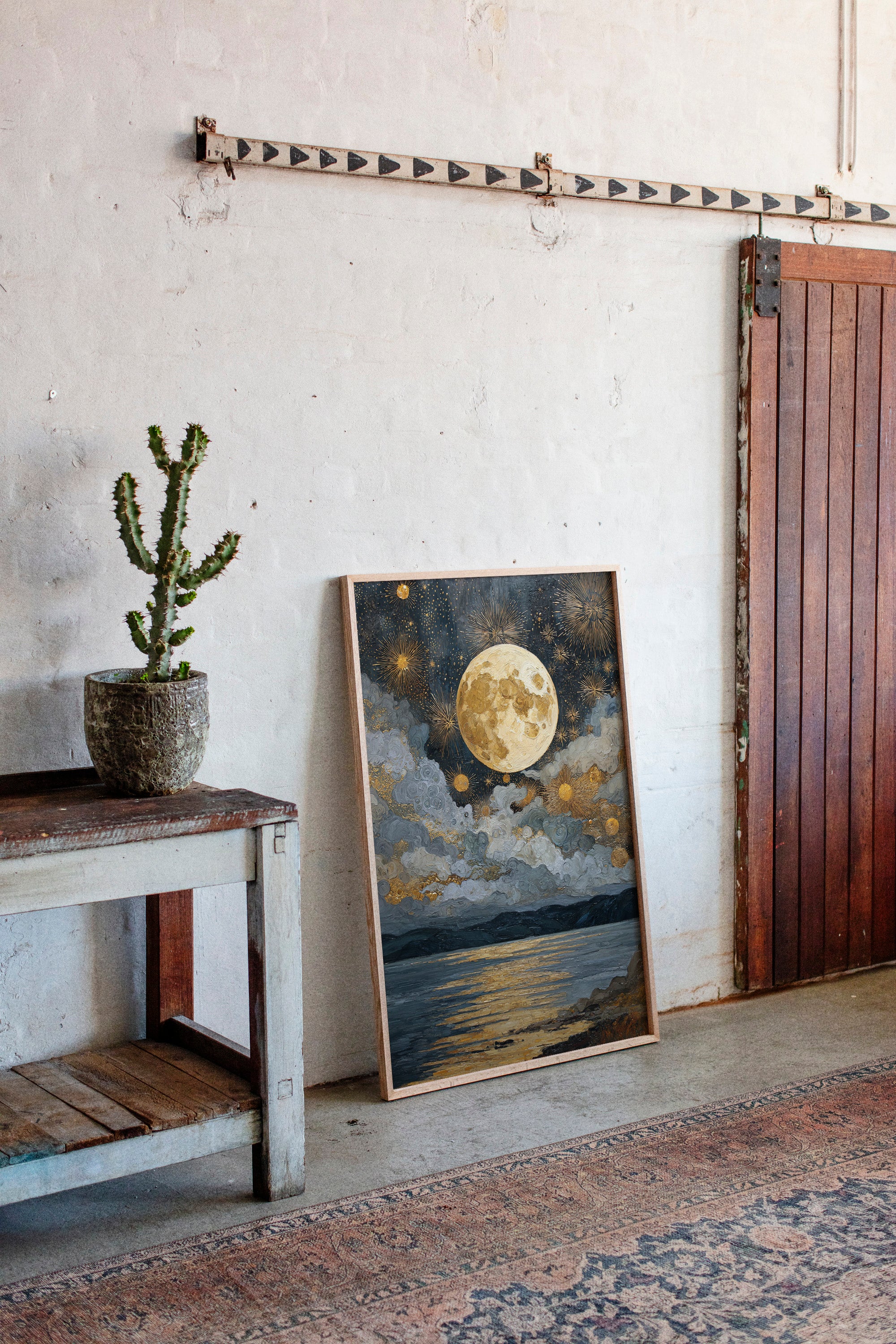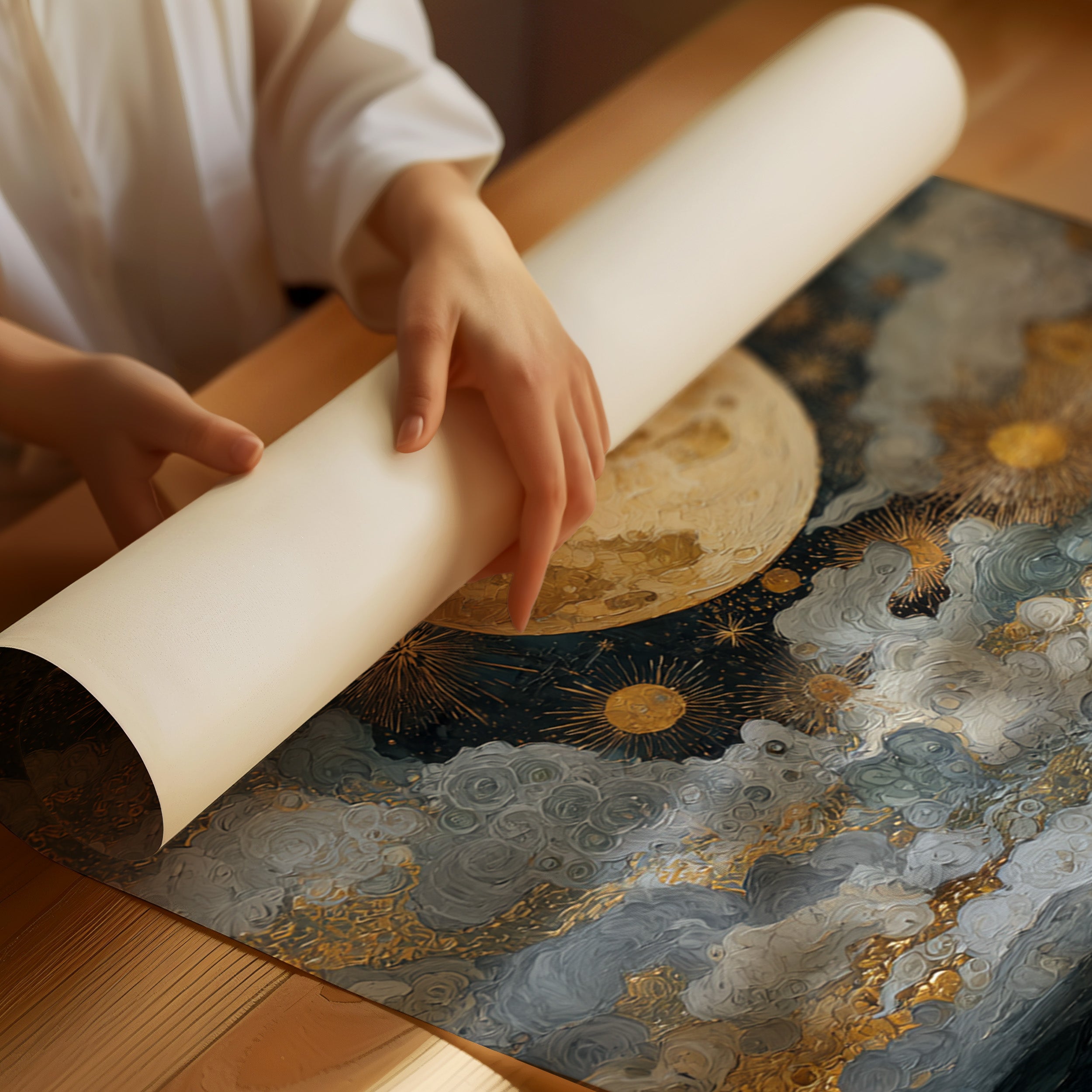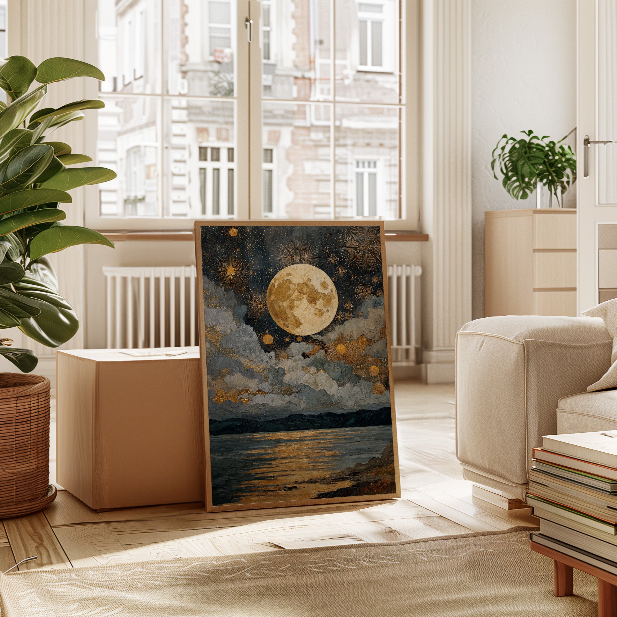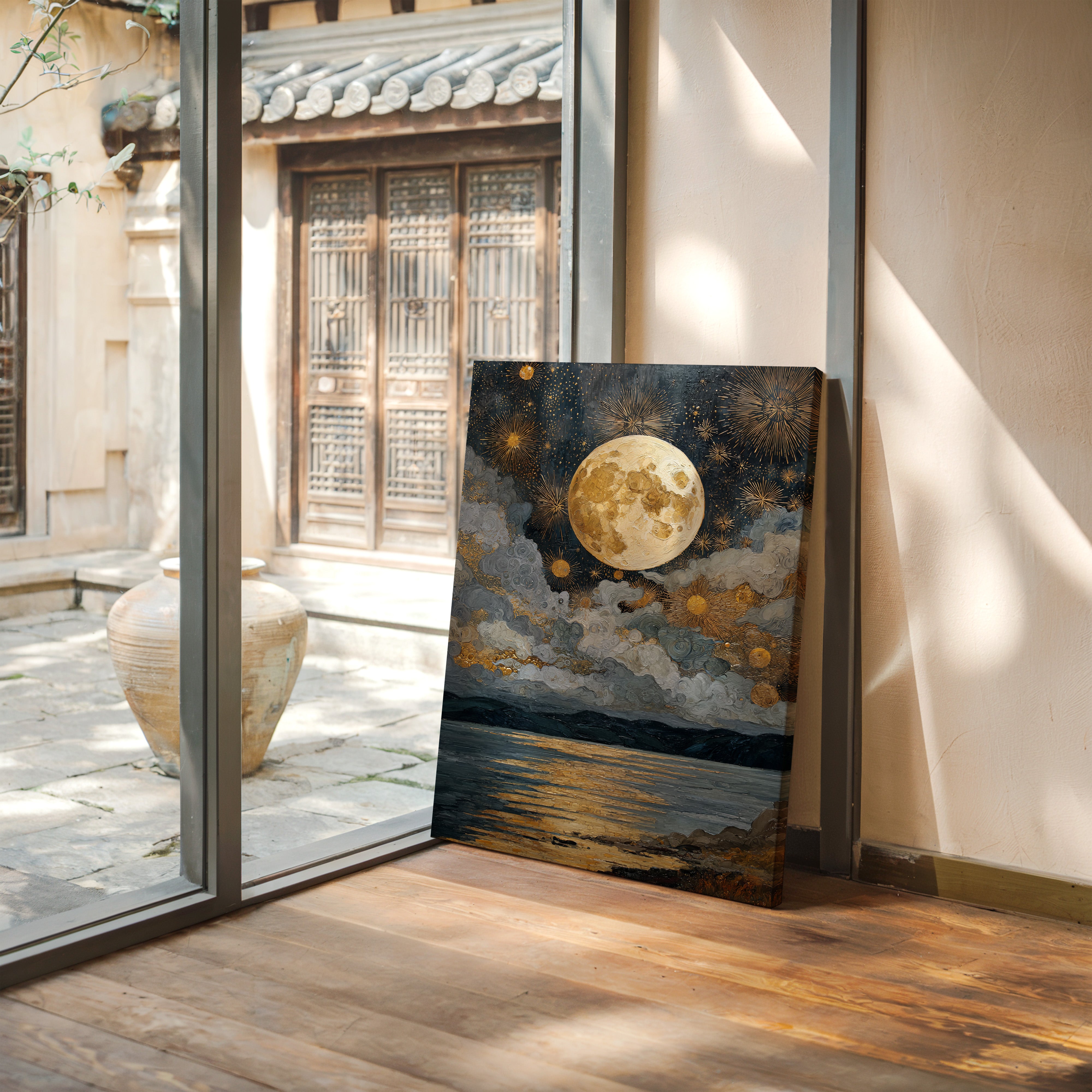 Beneath a vast expanse, the moon reigns, casting its golden glow upon the restless waters. This piece captures the enchanting interplay of light and shadow, celebrating the artistry of nature. The swirling clouds dance with shimmering stars, painting a celestial tapestry that invites contemplation and wonder. Ideal for a serene bedroom or a tranquil reading nook, this scene evokes the calm of twilight and the promise of night.