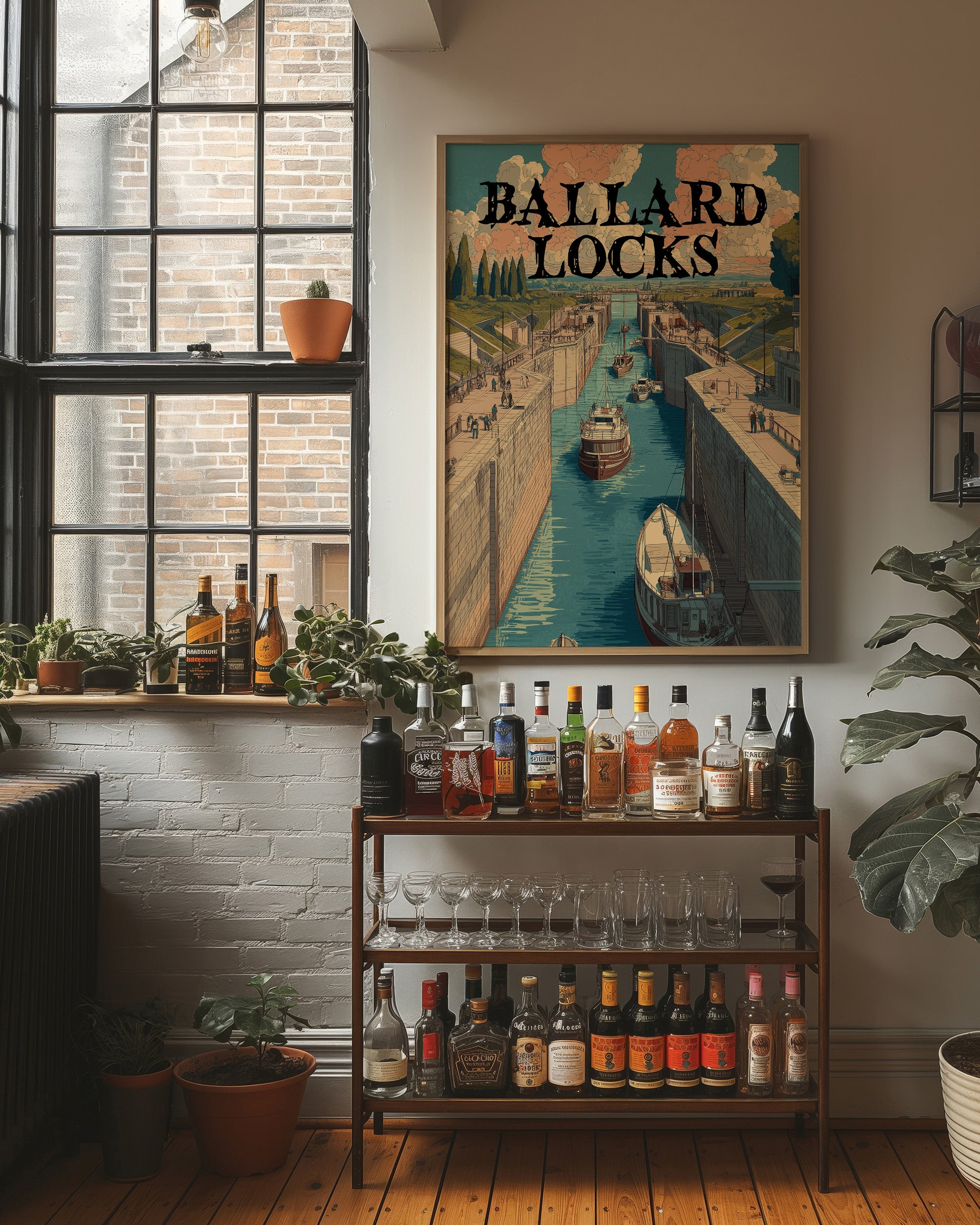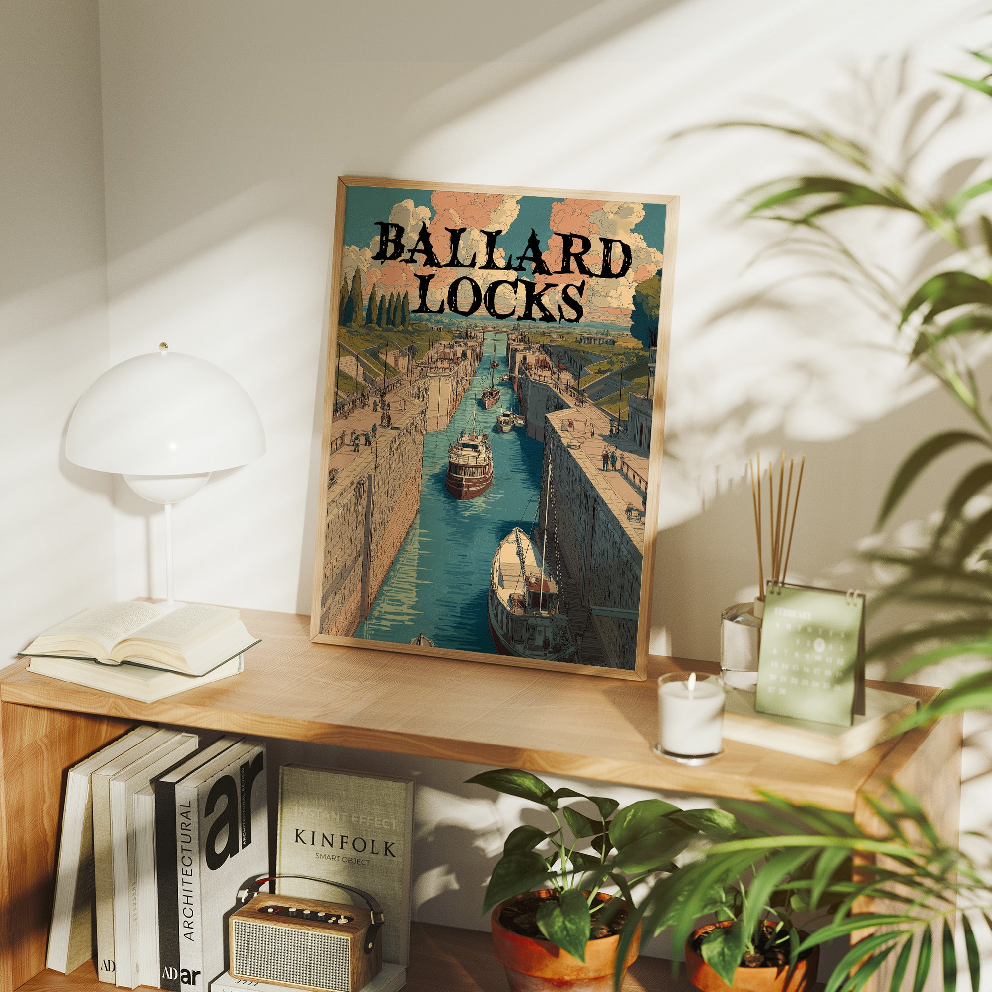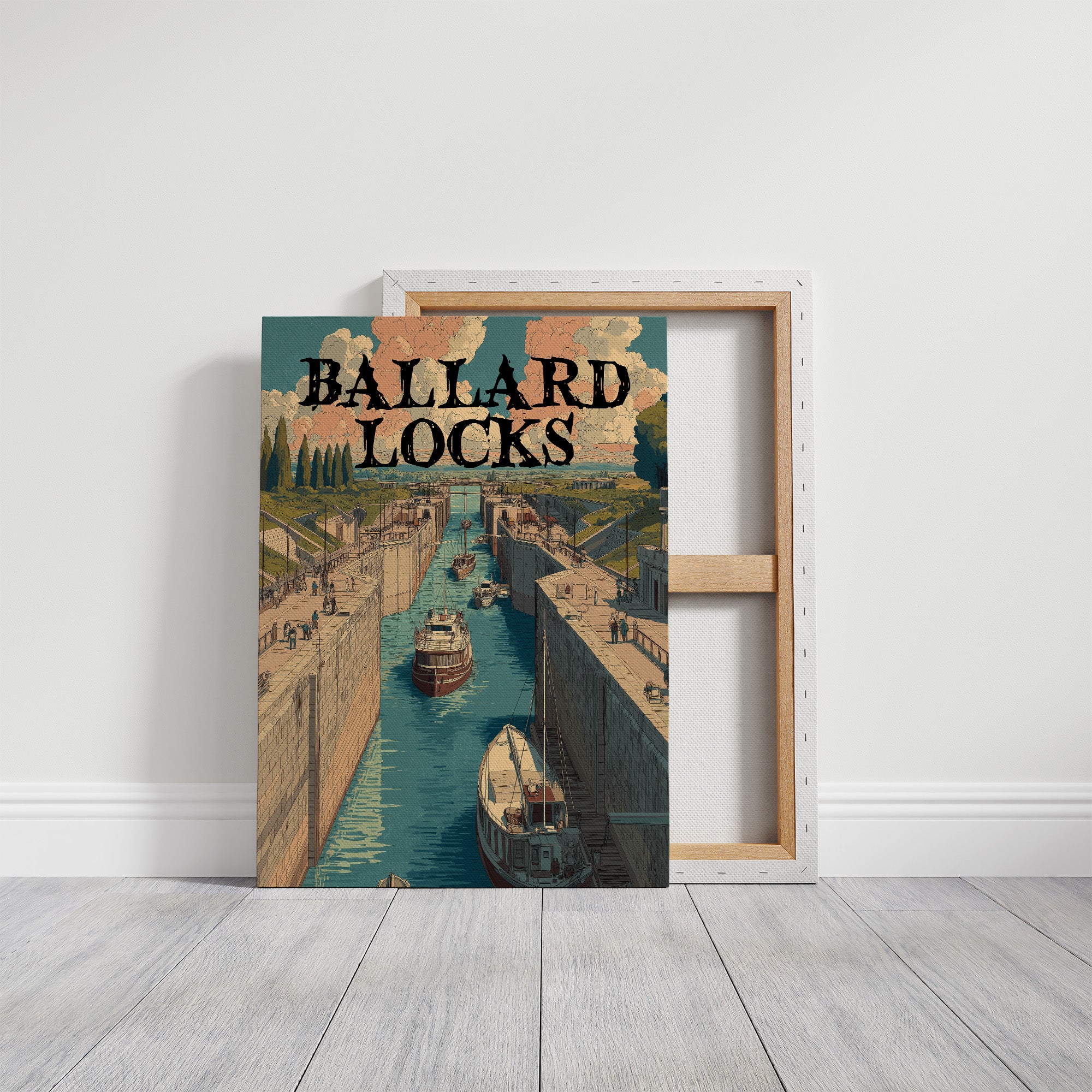 A procession of boats glides through towering canal locks beneath billowing clouds of peach and cream, their hulls casting reflections on turquoise water as cypress trees stand sentinel along pastoral banks. The scene captures an industrial marvel nestled within countryside tranquility, where stone chambers and mechanical precision meet the organic rhythms of river travel. This vintage-inspired illustration evokes the golden age of waterway engineering with its detailed linework and muted earth-tone palette. An ideal accent for a study or library where stories of adventure and human ingenuity come alive.