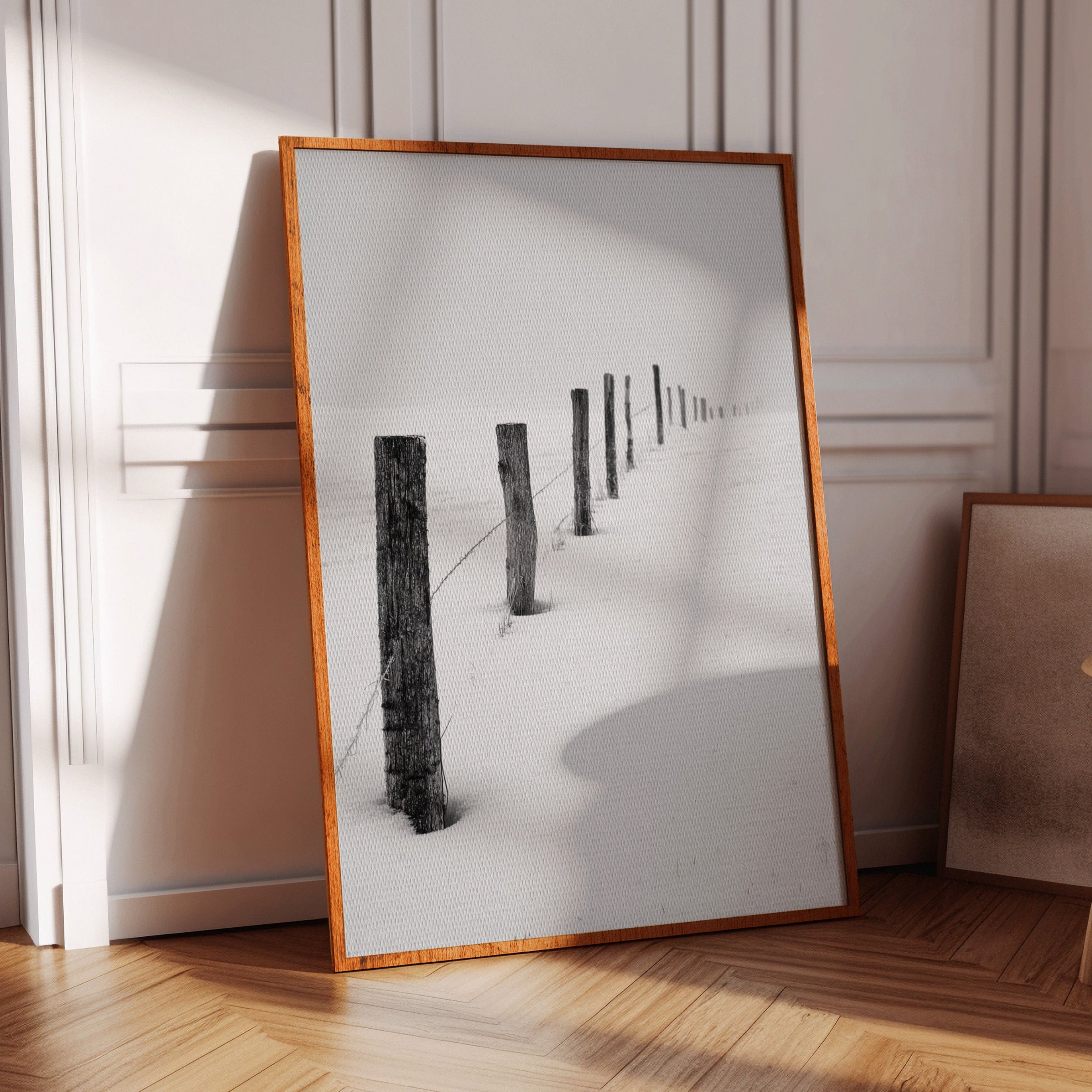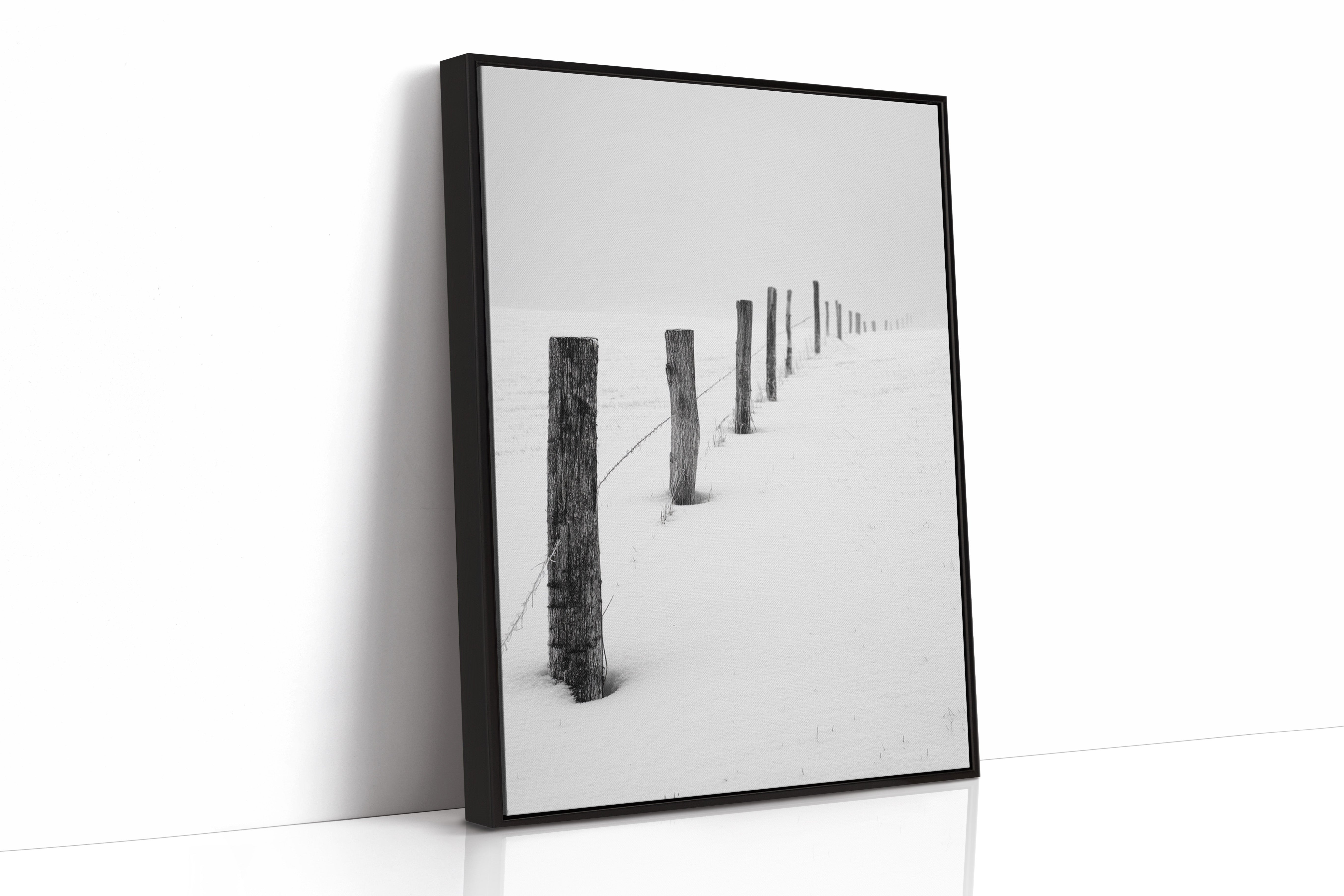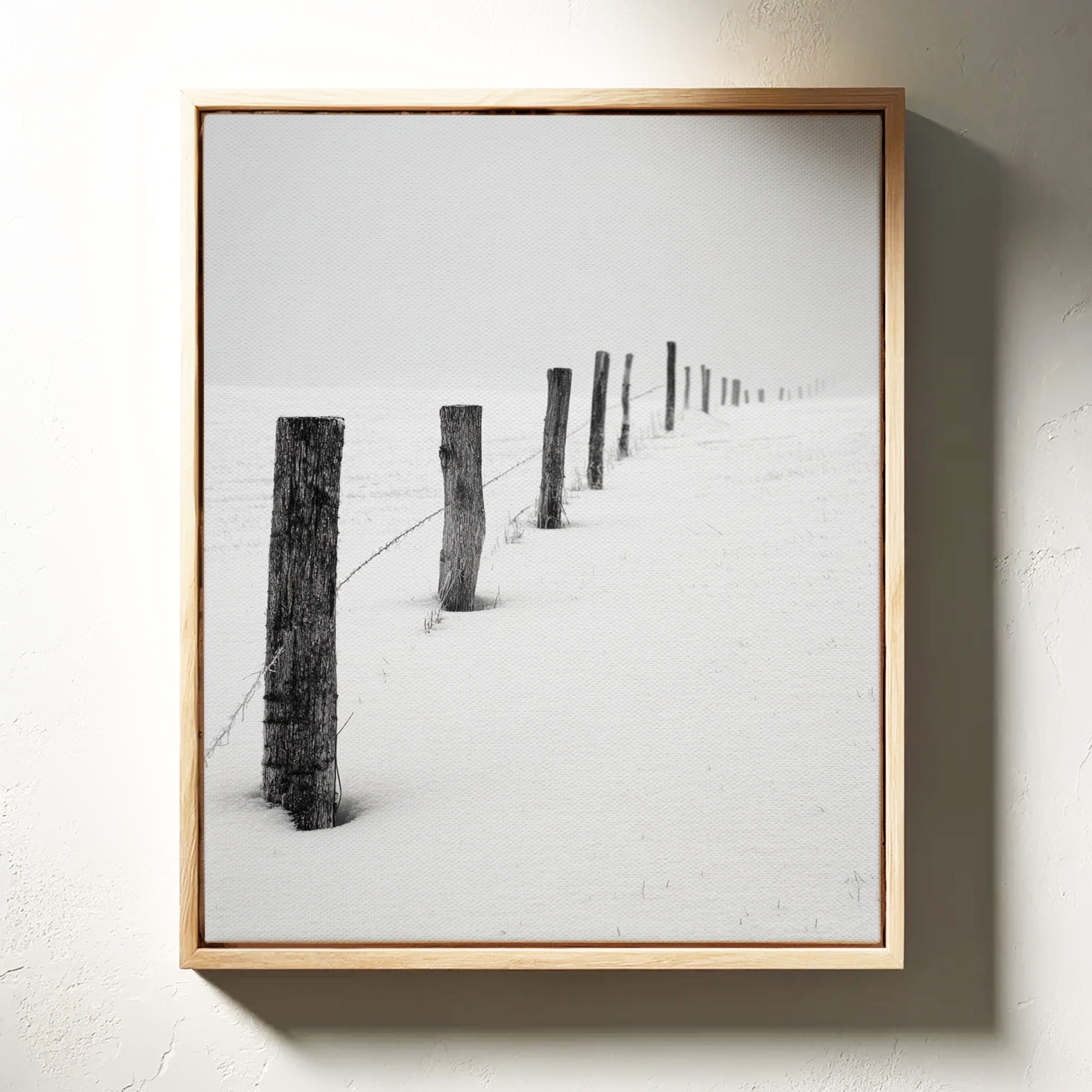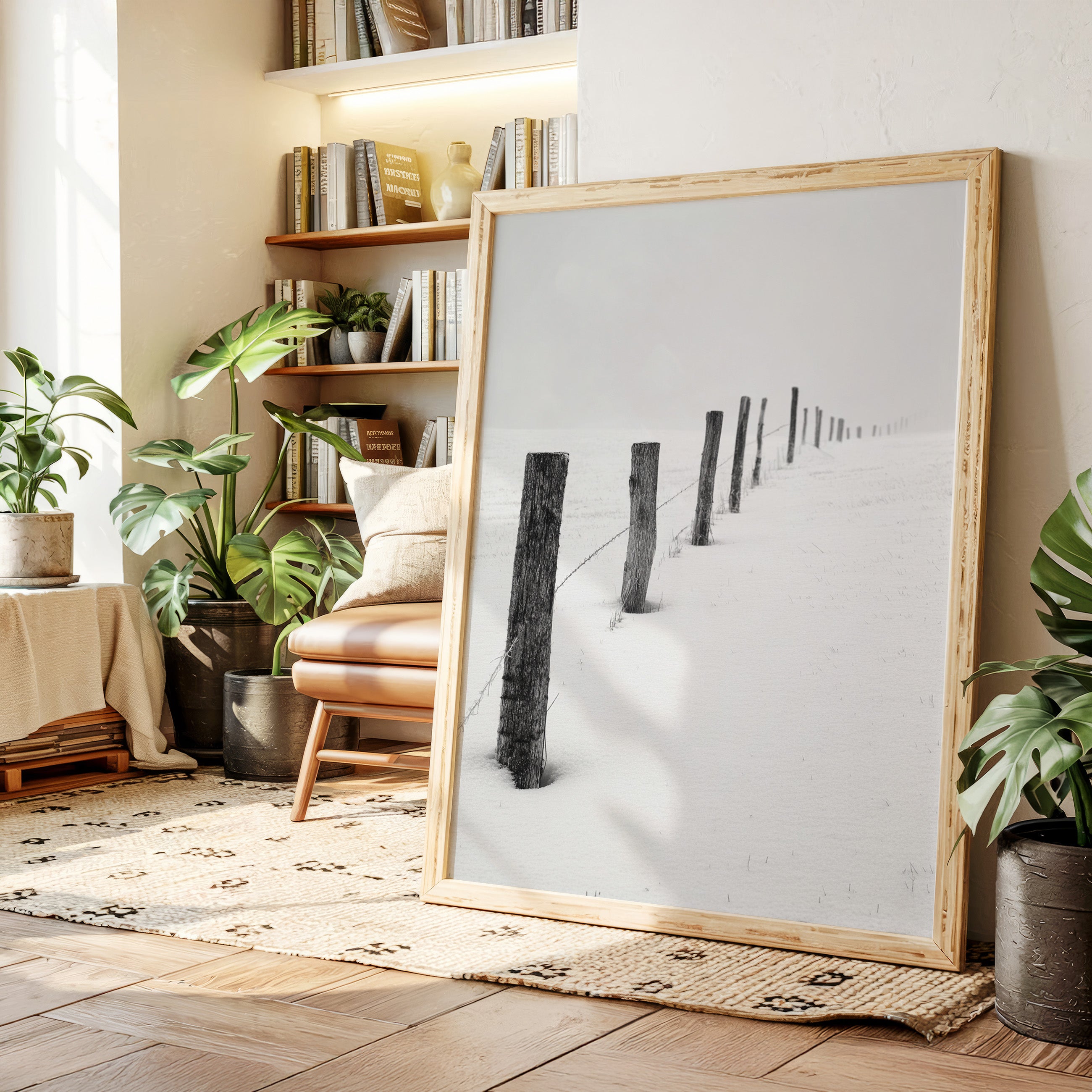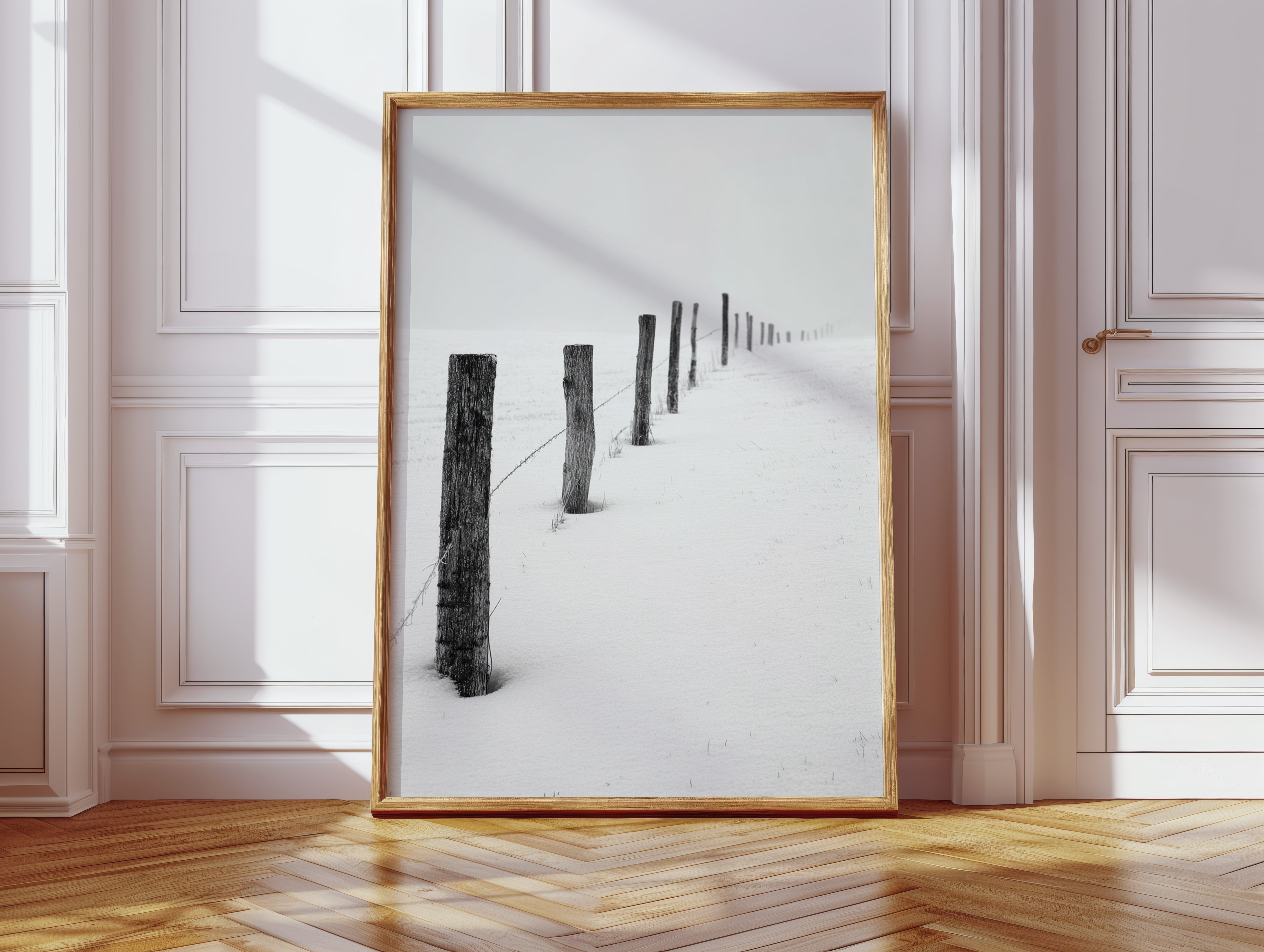 Part of our Rural Reflections collection, this minimalist black and white photograph captures the contemplative beauty of winter countryside with atmospheric grace. The receding fence line and misty distance create a sense of infinite perspective, transforming a simple farm boundary into a meditation on place, purpose, and the quiet dignity of rural life.