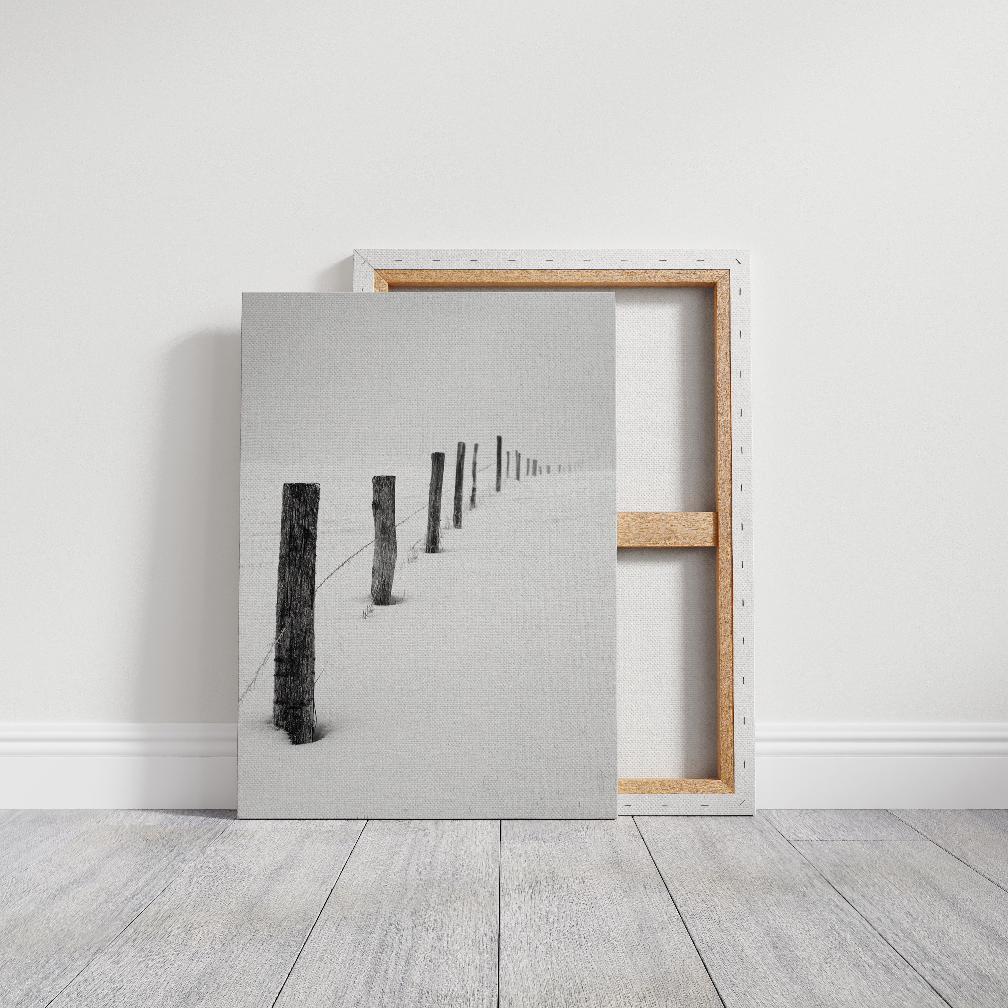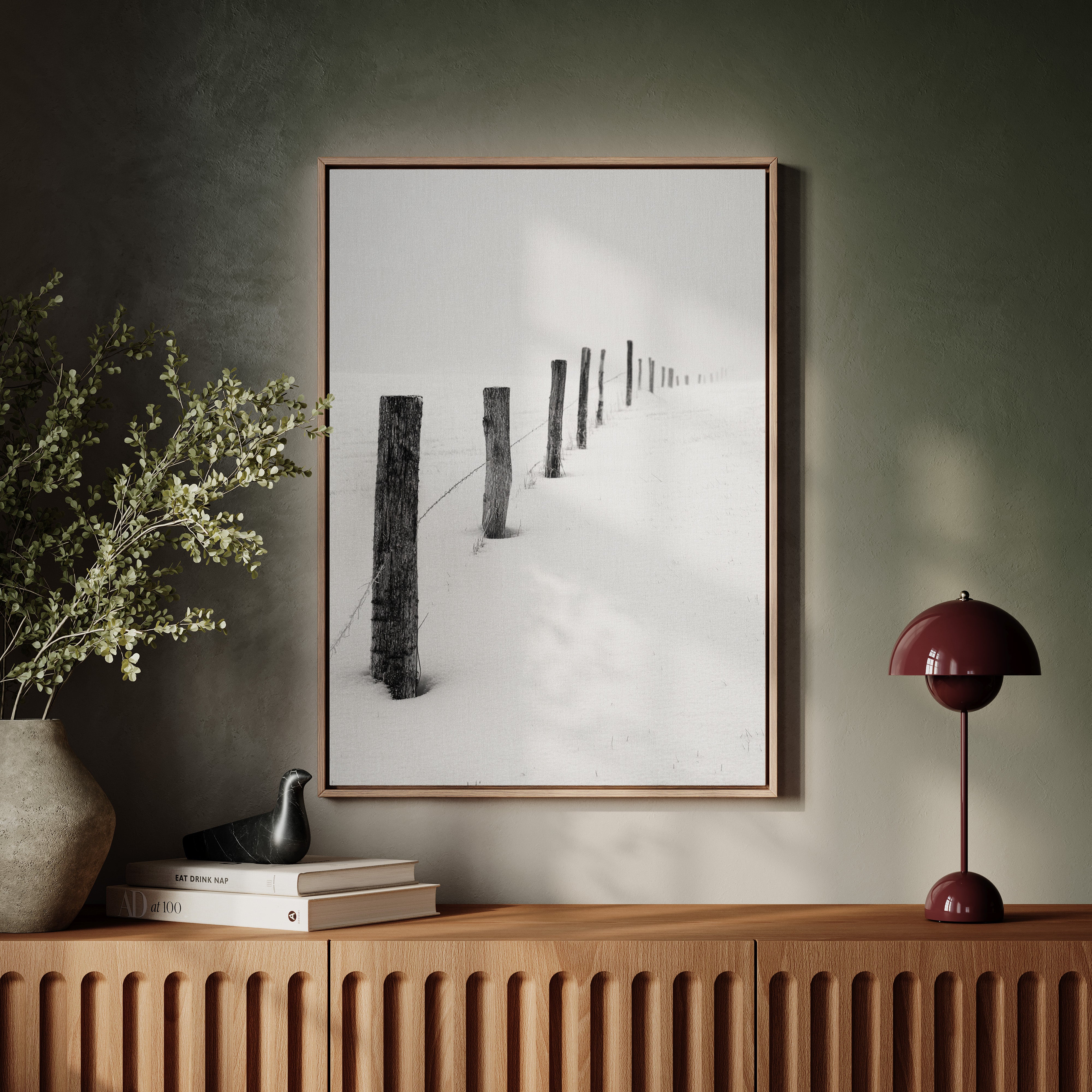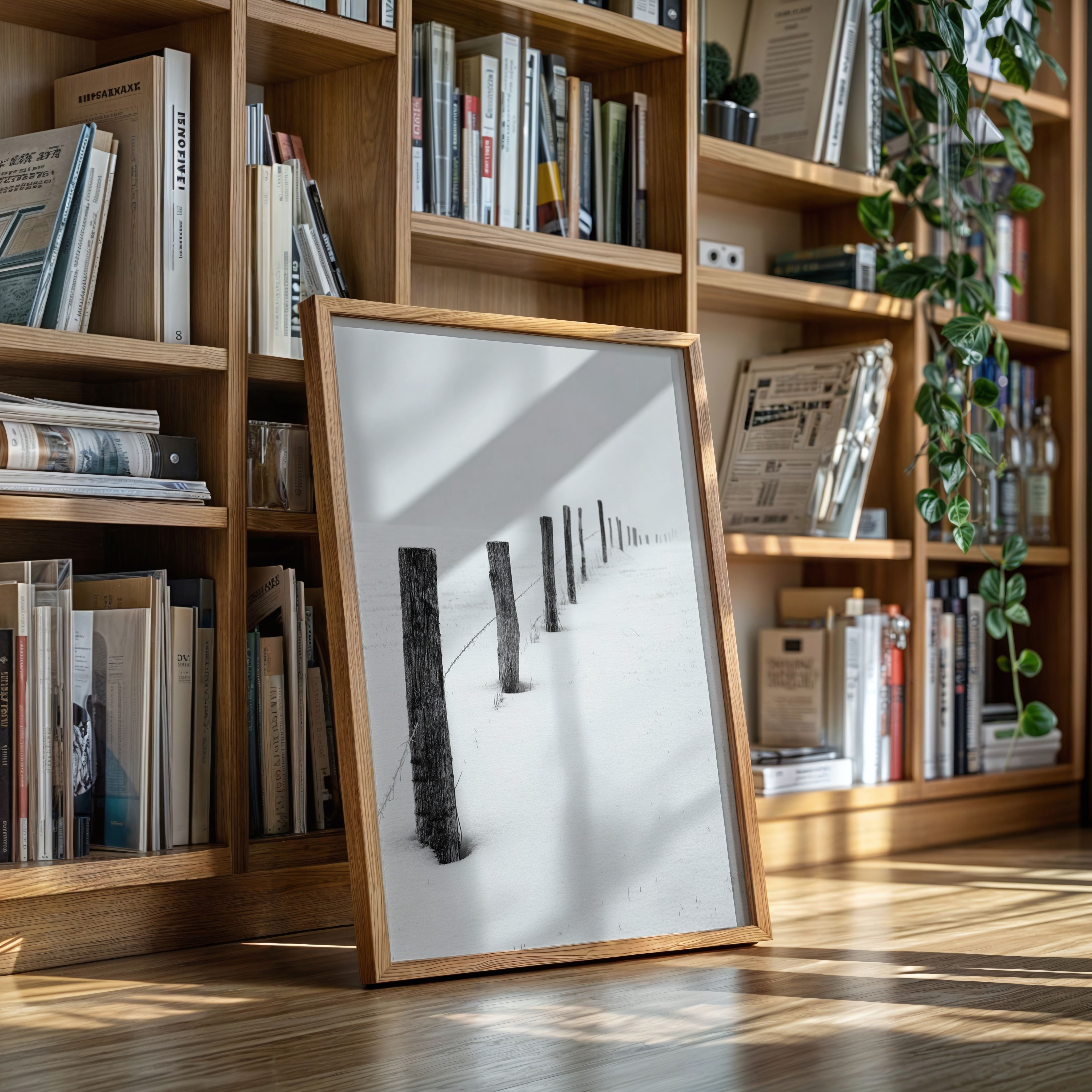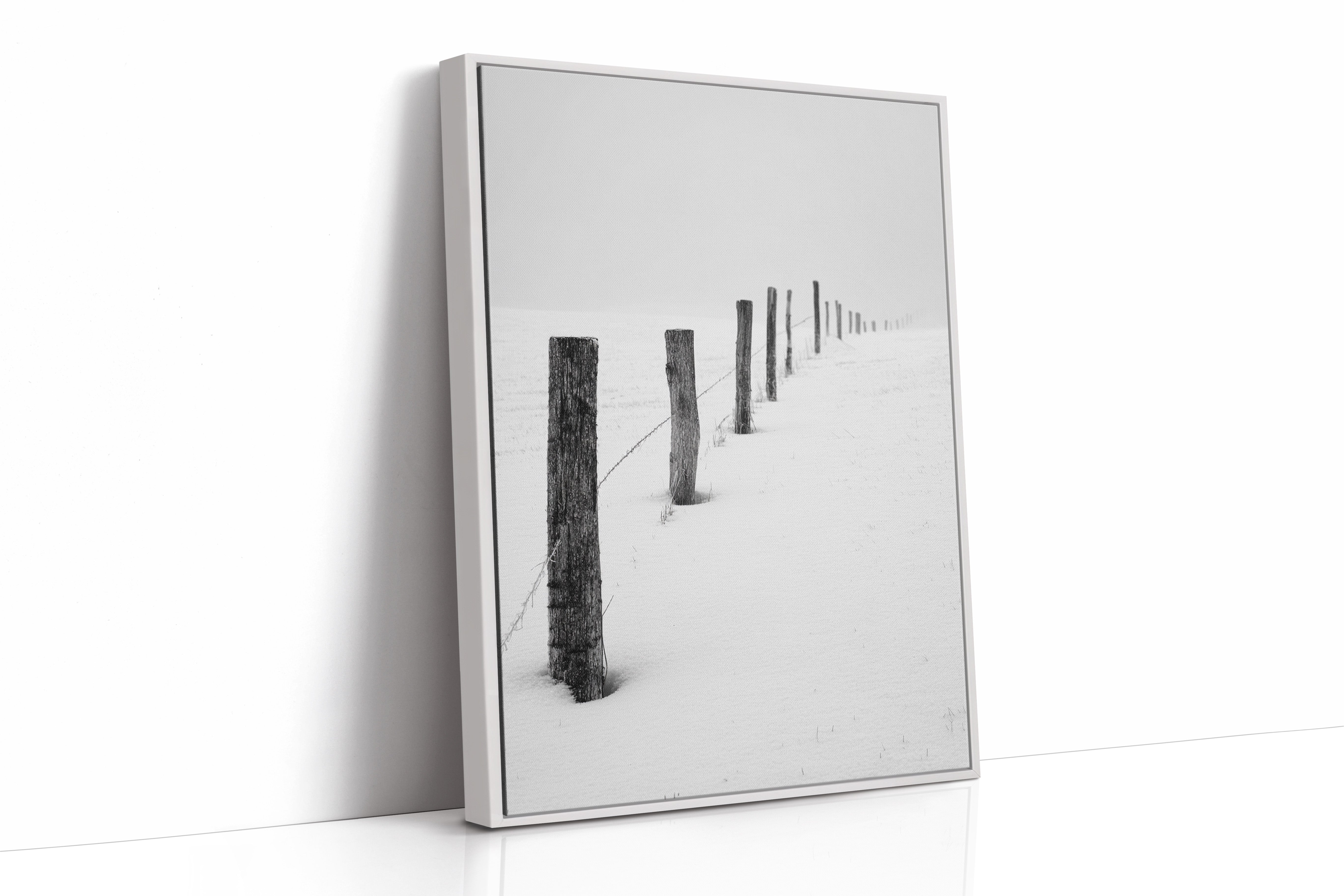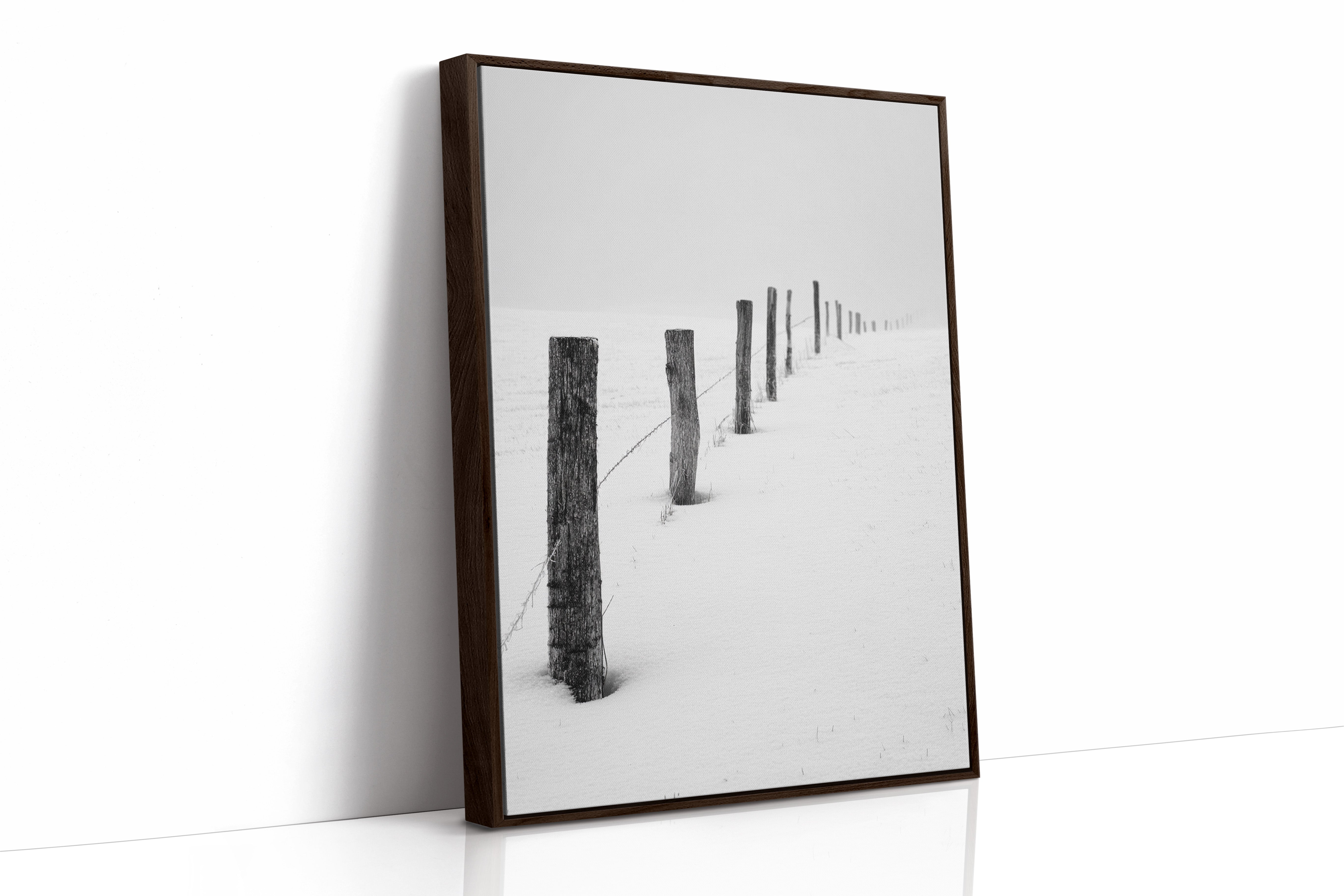 Part of our Rural Reflections collection, this minimalist black and white photograph captures the contemplative beauty of winter countryside with atmospheric grace. The receding fence line and misty distance create a sense of infinite perspective, transforming a simple farm boundary into a meditation on place, purpose, and the quiet dignity of rural life.