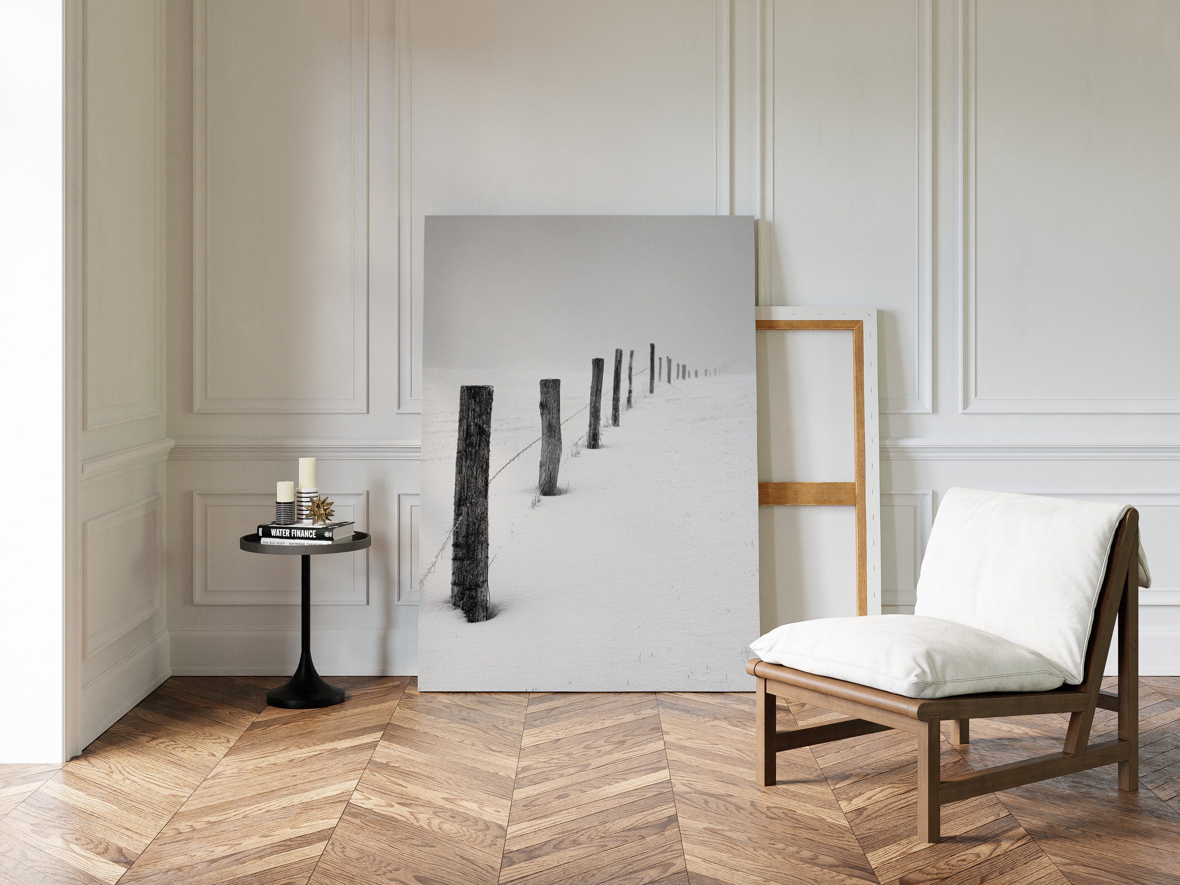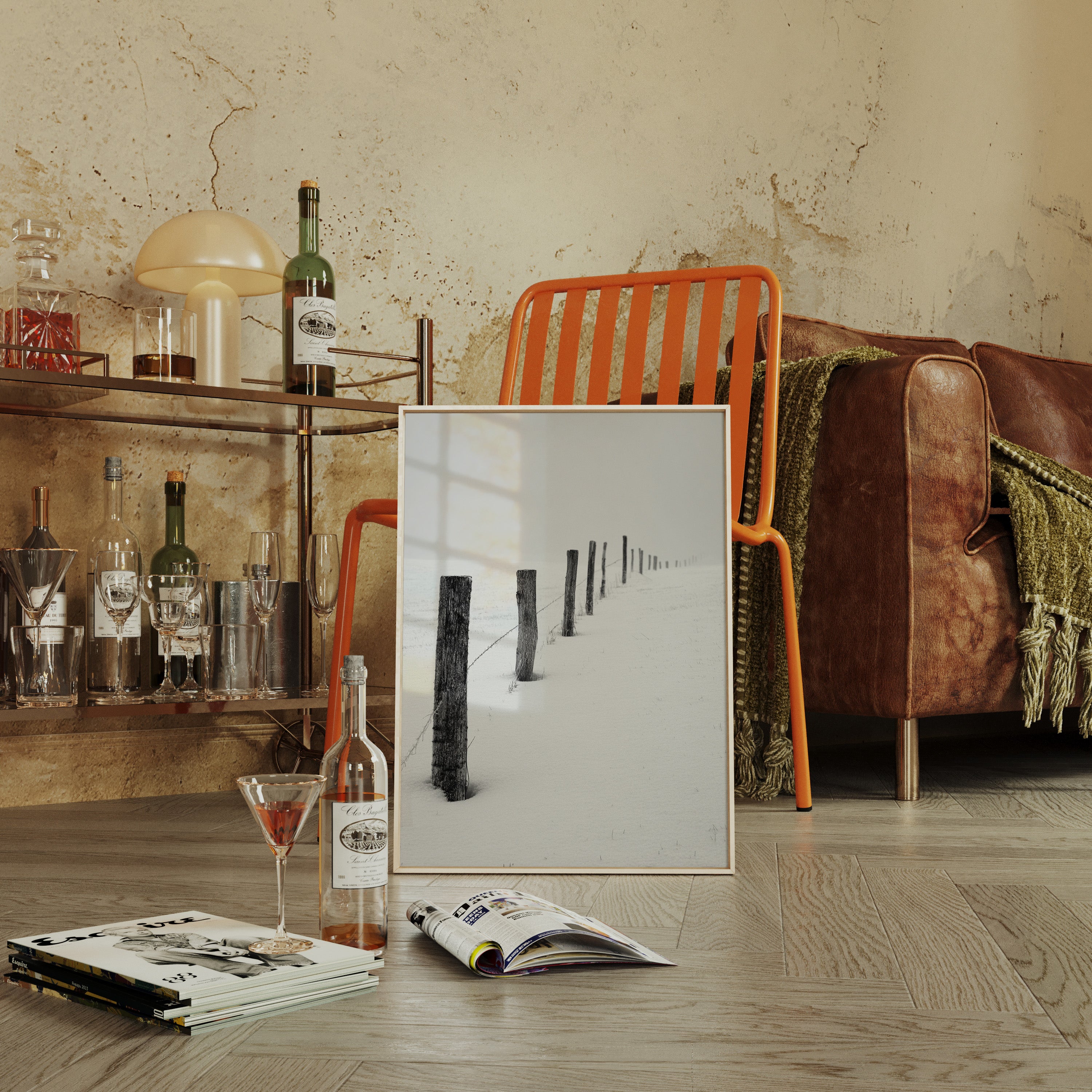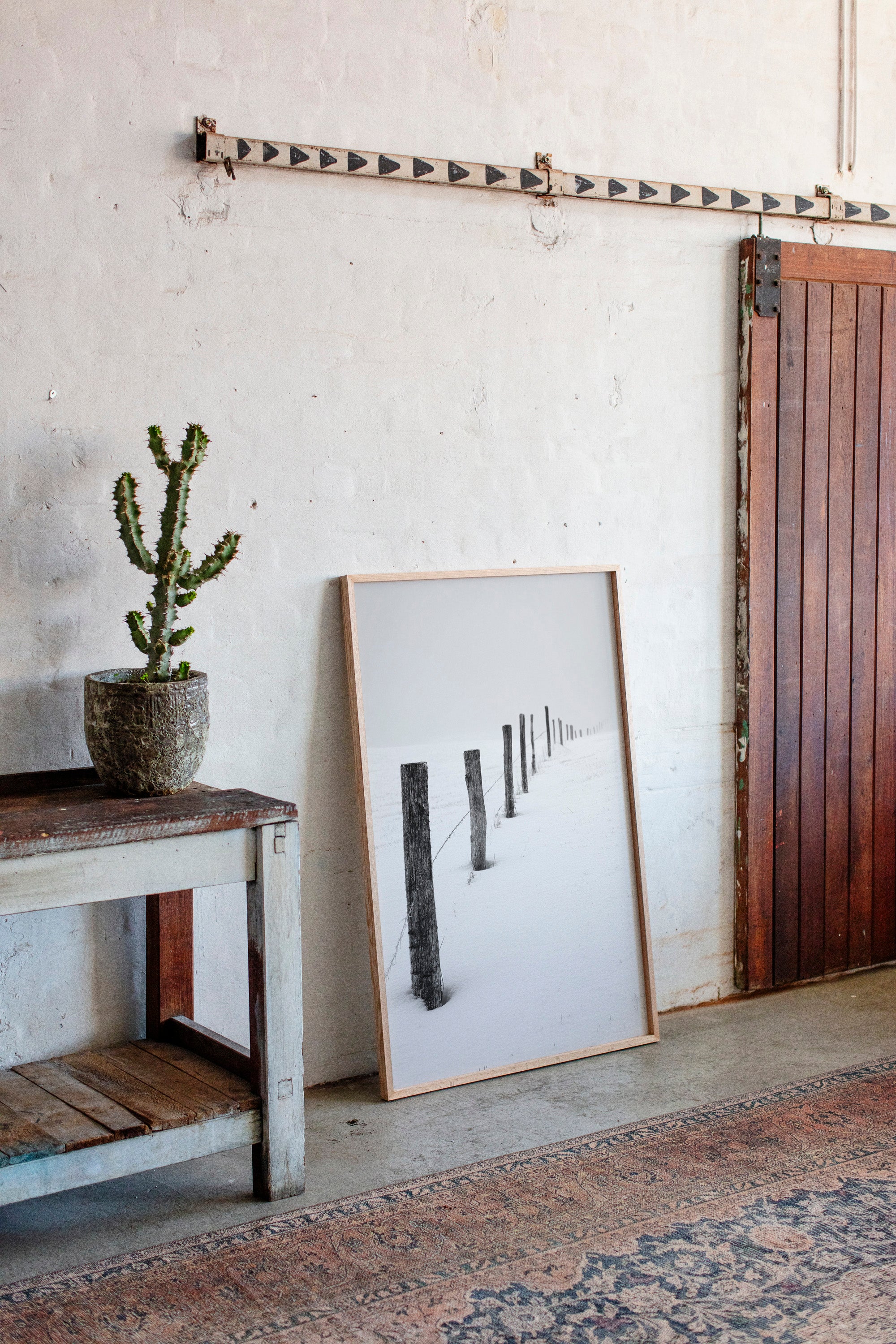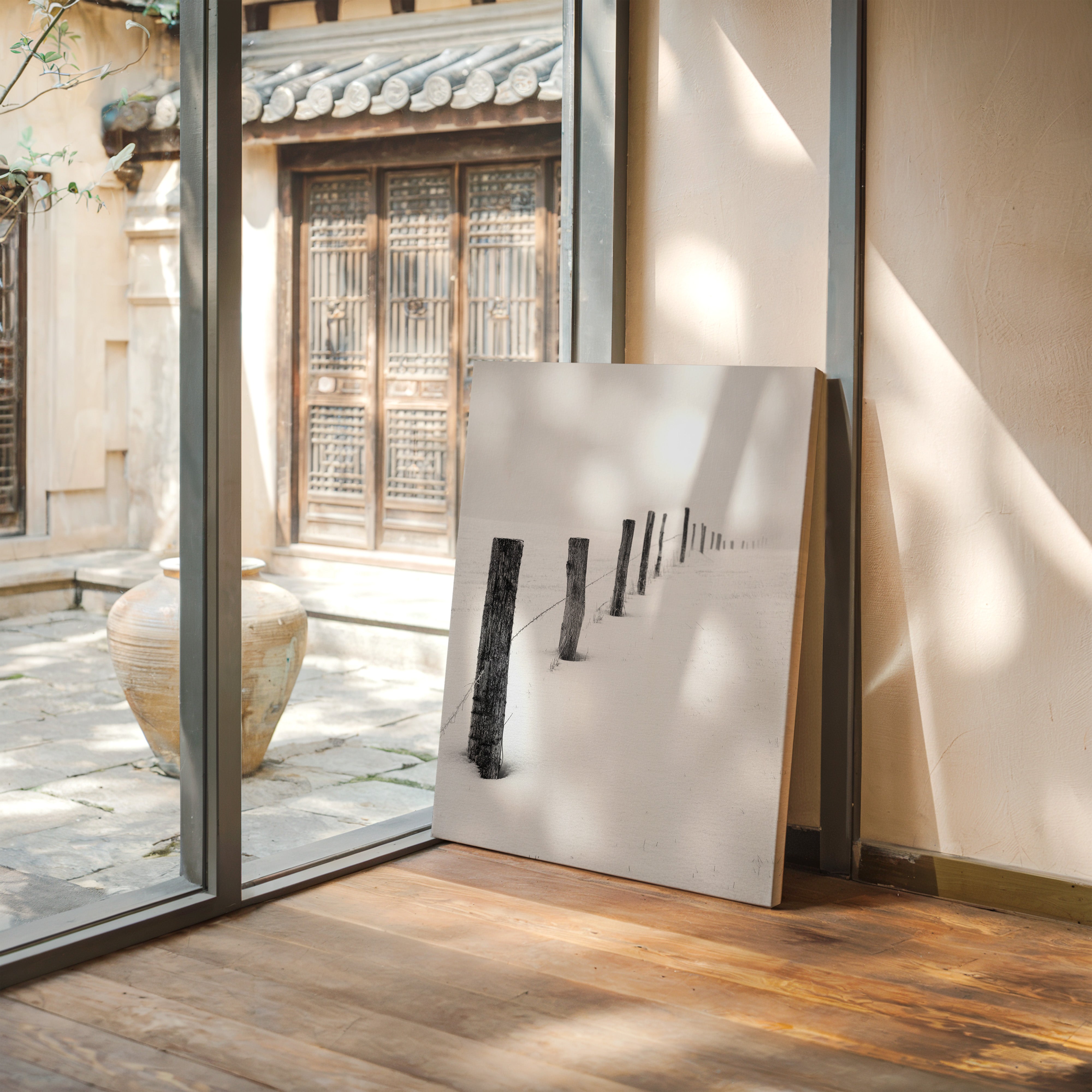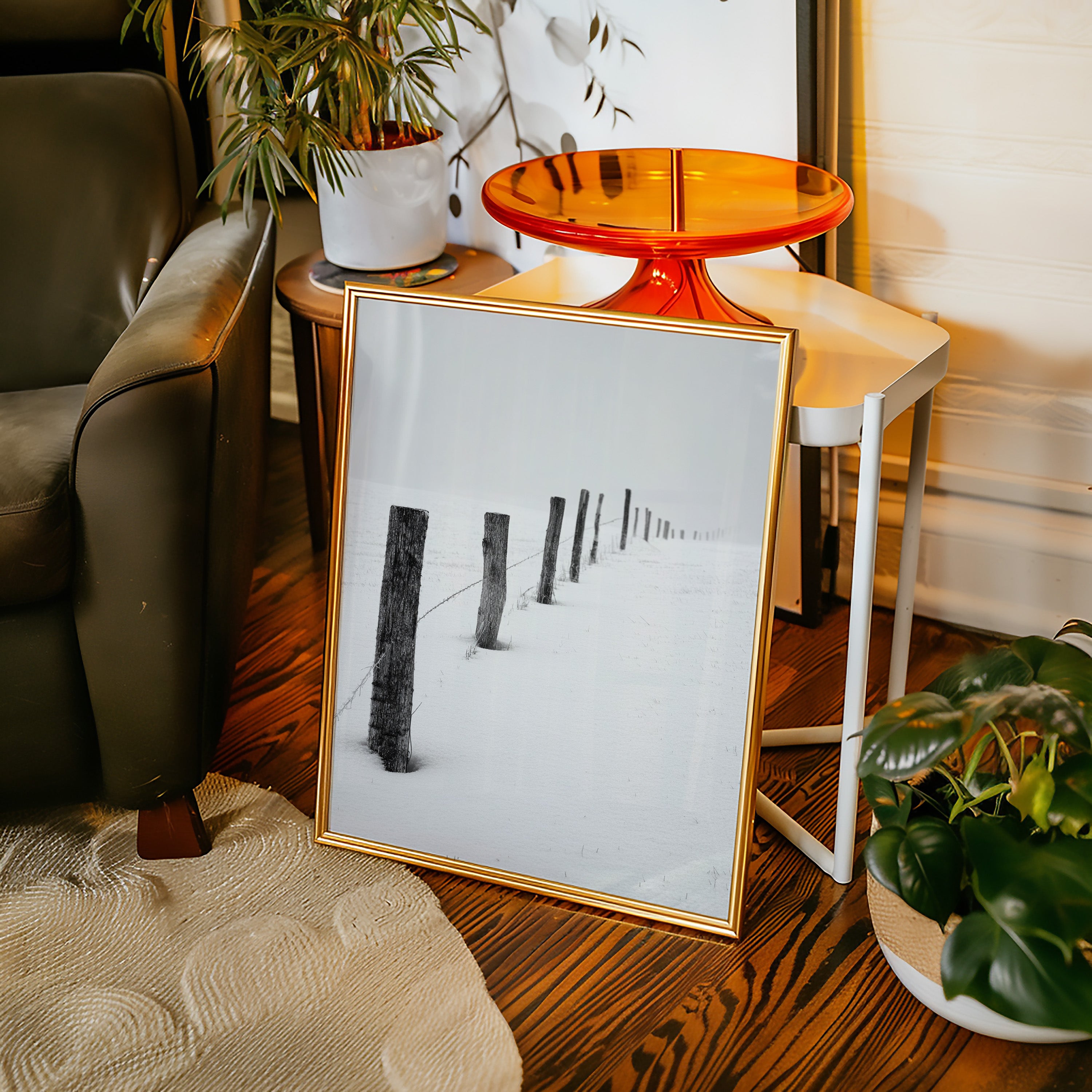 Part of our Rural Reflections collection, this minimalist black and white photograph captures the contemplative beauty of winter countryside with atmospheric grace. The receding fence line and misty distance create a sense of infinite perspective, transforming a simple farm boundary into a meditation on place, purpose, and the quiet dignity of rural life.