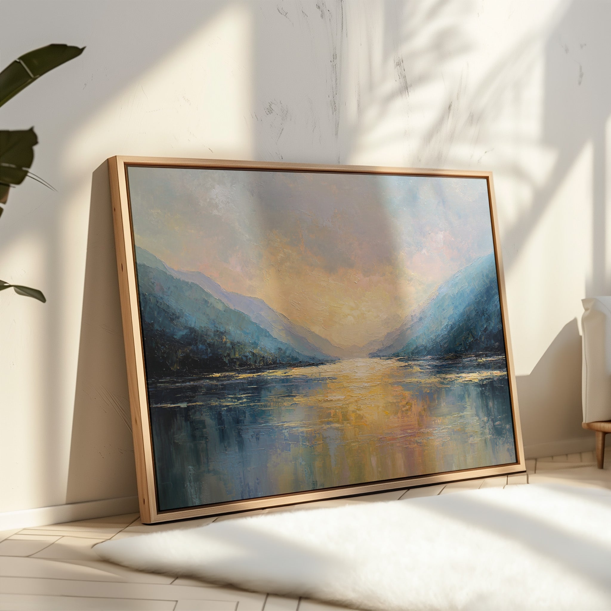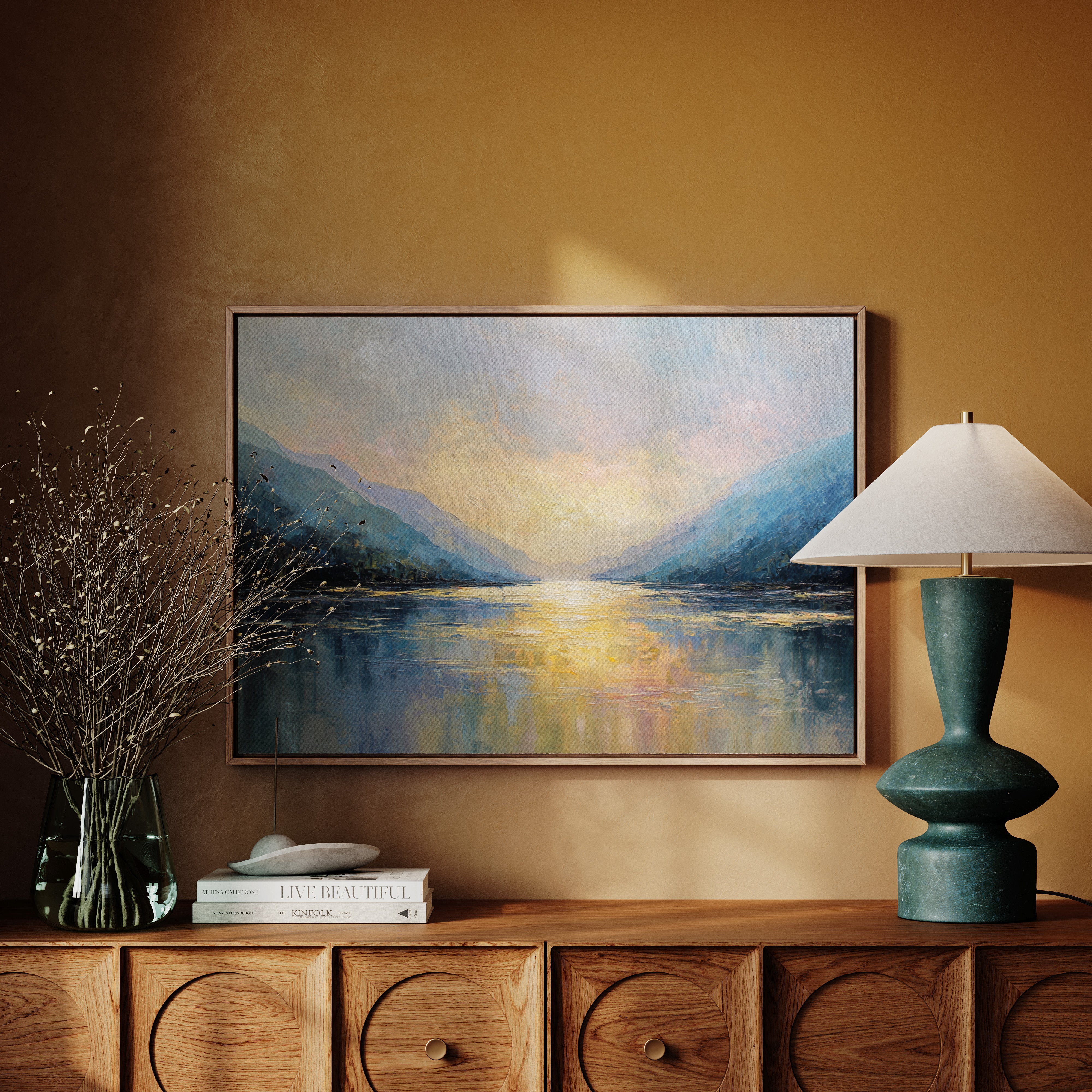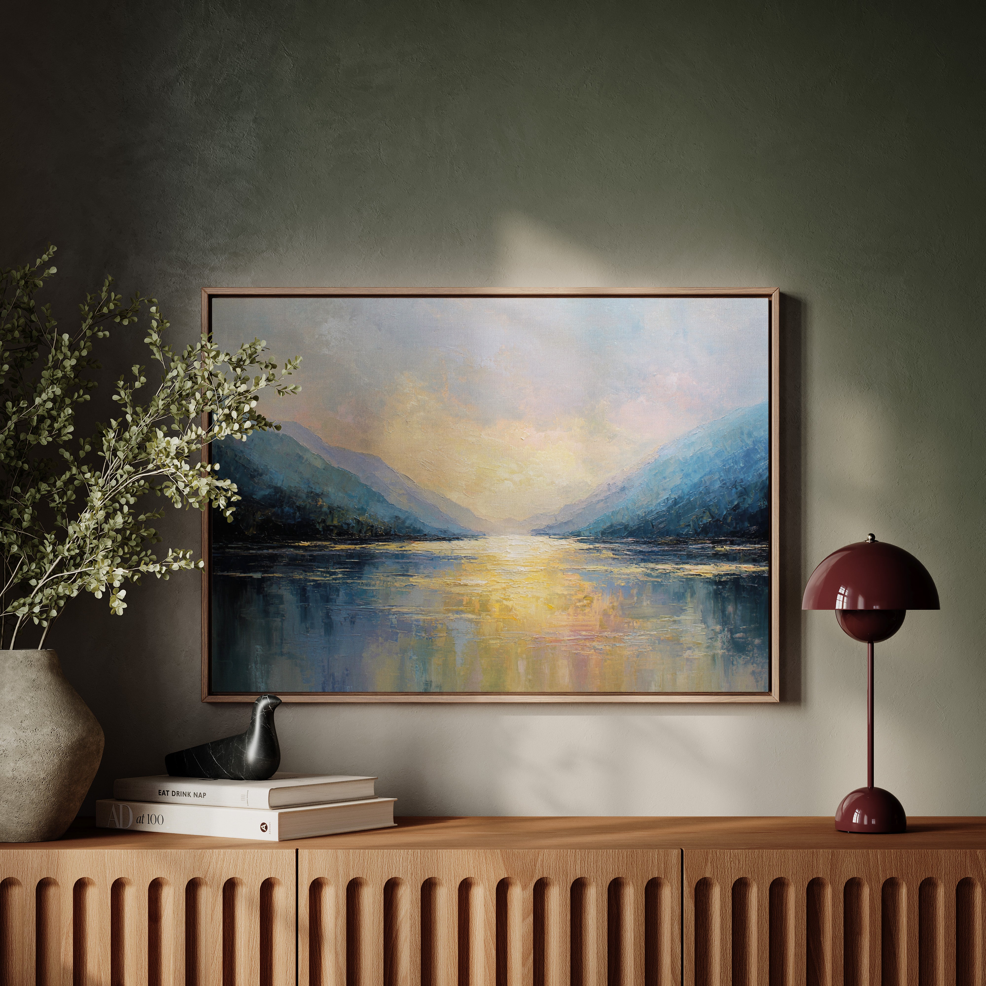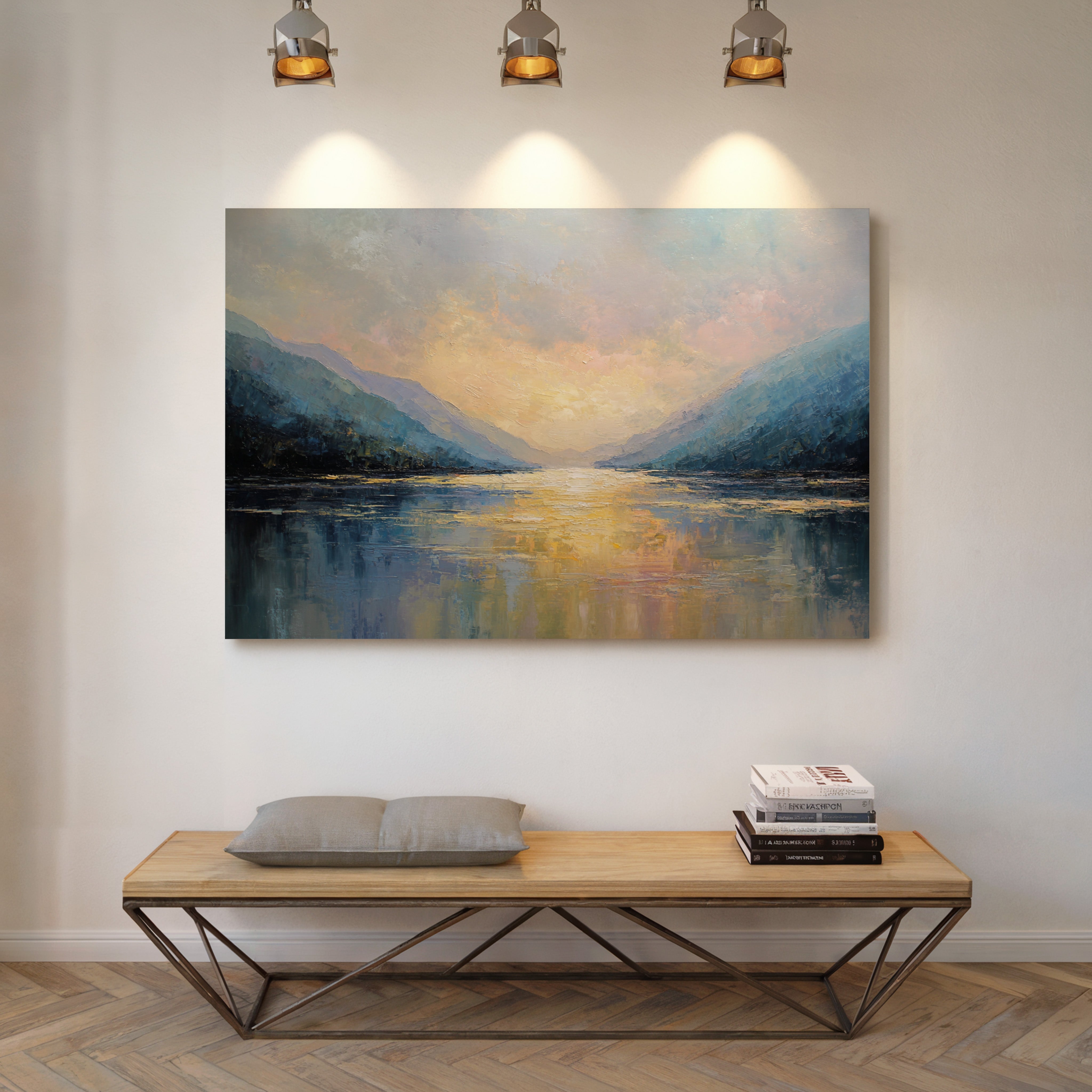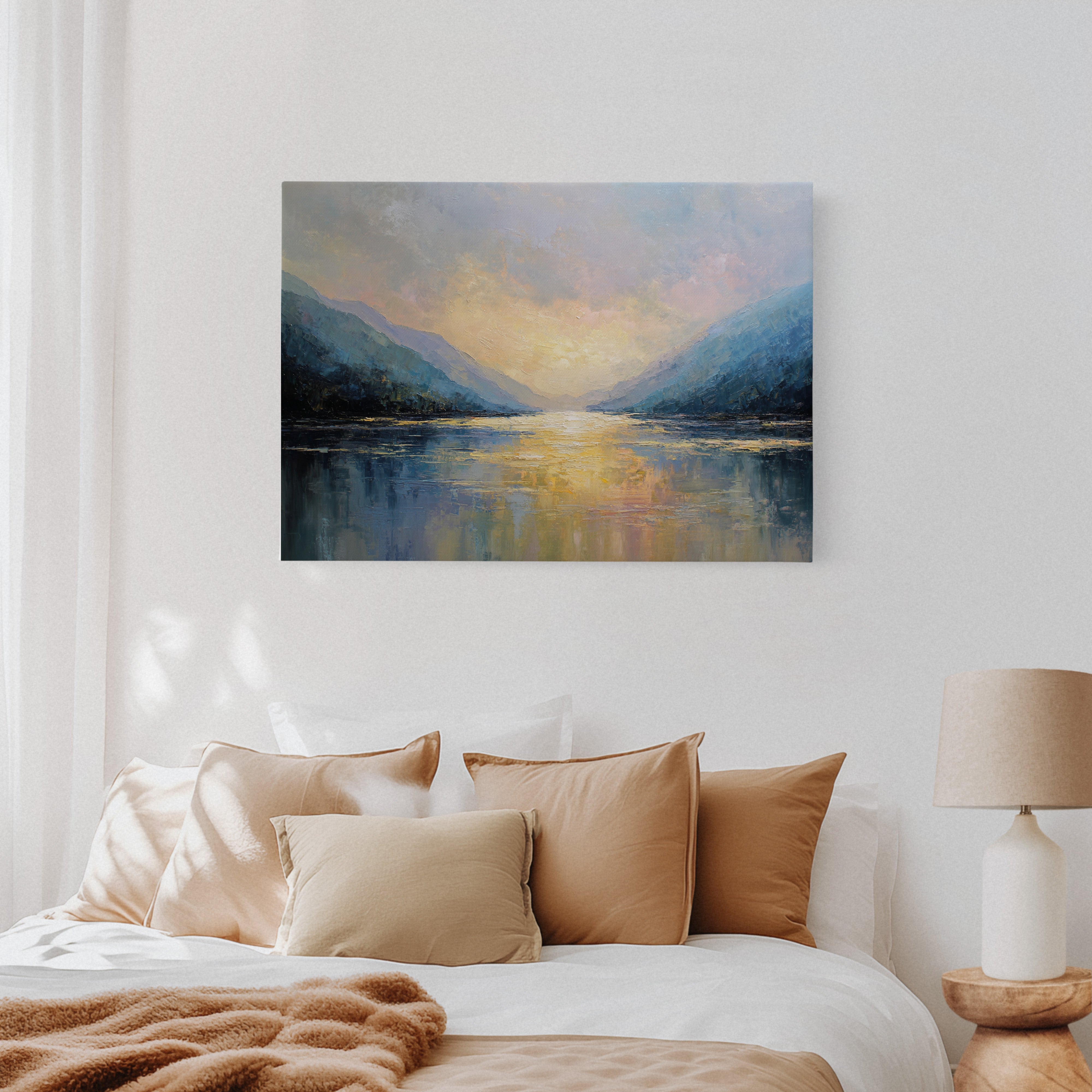 In the quiet embrace of dawn, the sun spills gold across the tranquil lake, illuminating the peaks in a soft, ethereal glow. This piece captures the serene beauty of nature, inviting a moment of reflection and peace. Gentle strokes of blues and warm hues blend seamlessly, creating a harmonious dance of light and color that beckons the viewer into its serene depths. Perfect for a calming space, such as a reading nook or a serene bedroom, this piece transforms any room into a sanctuary of tranquility.