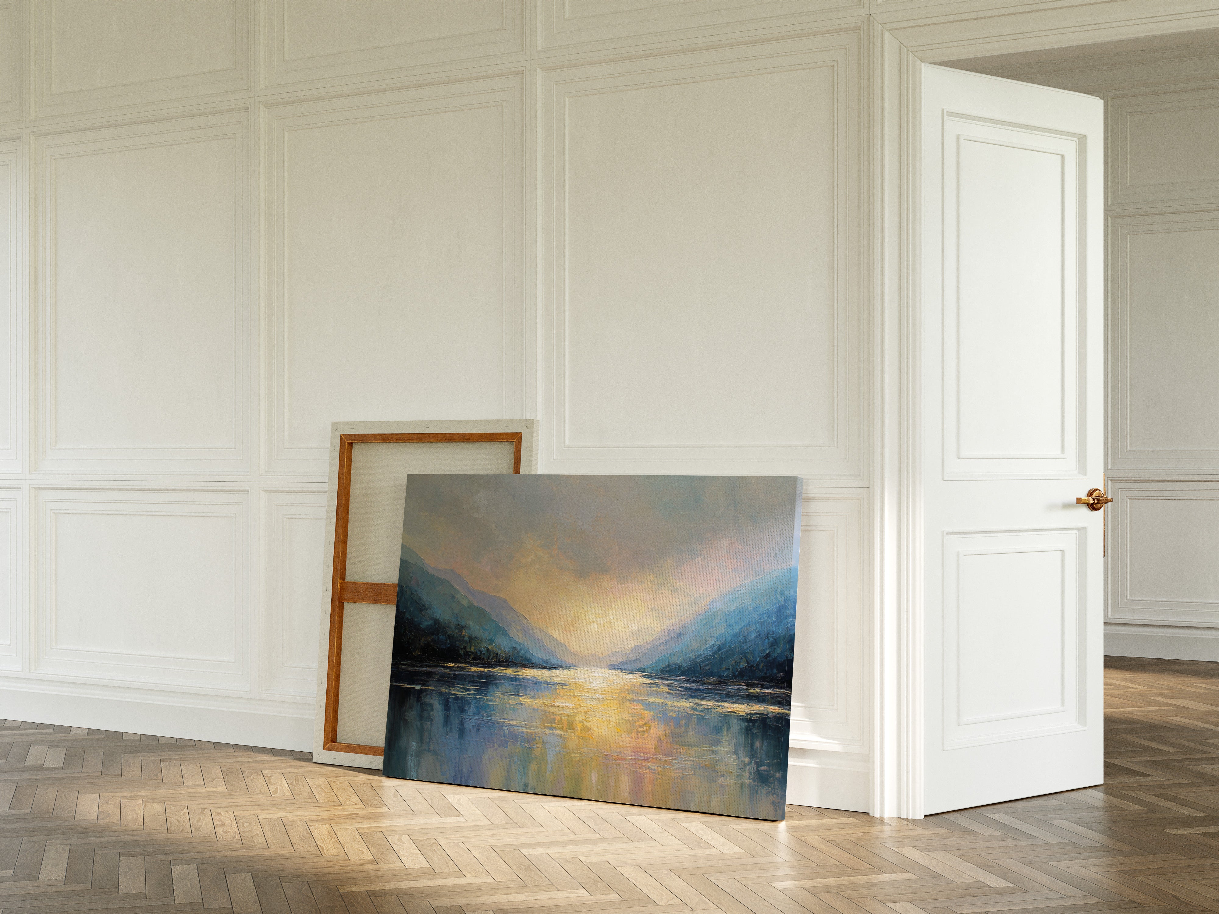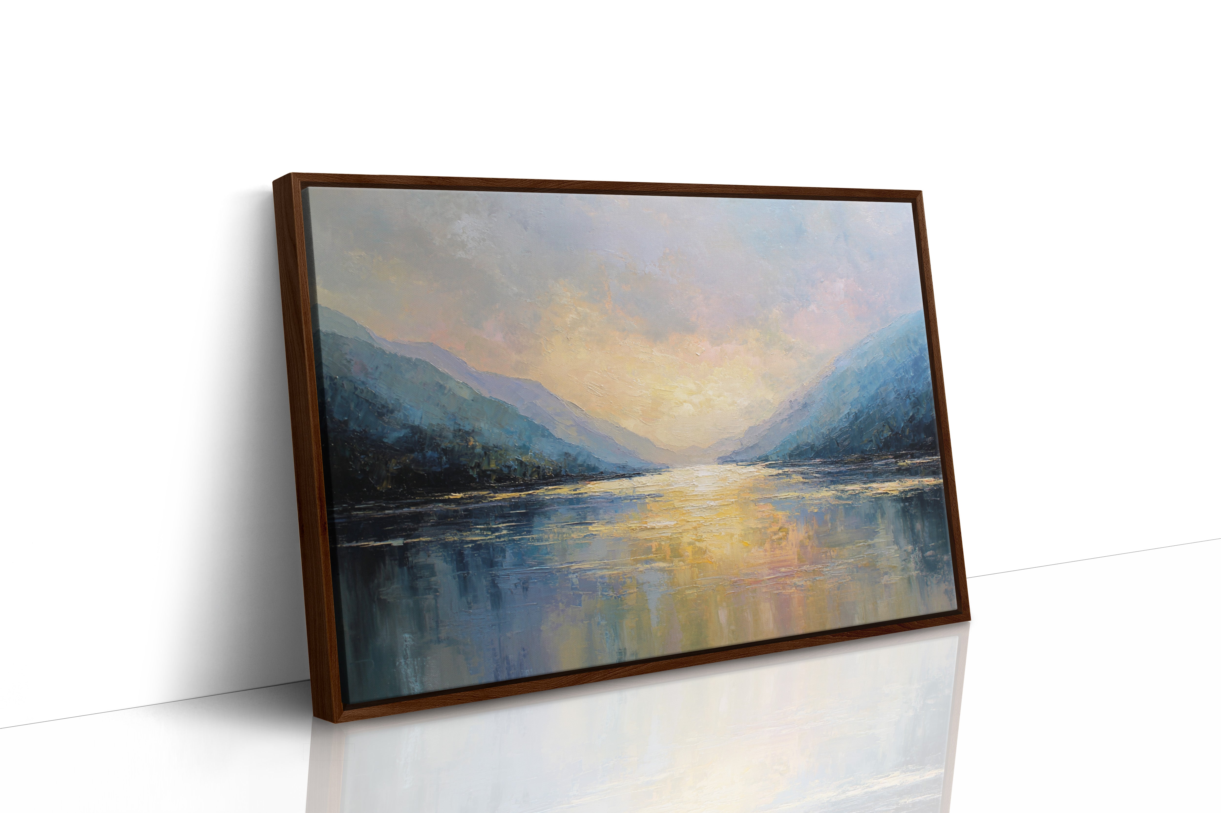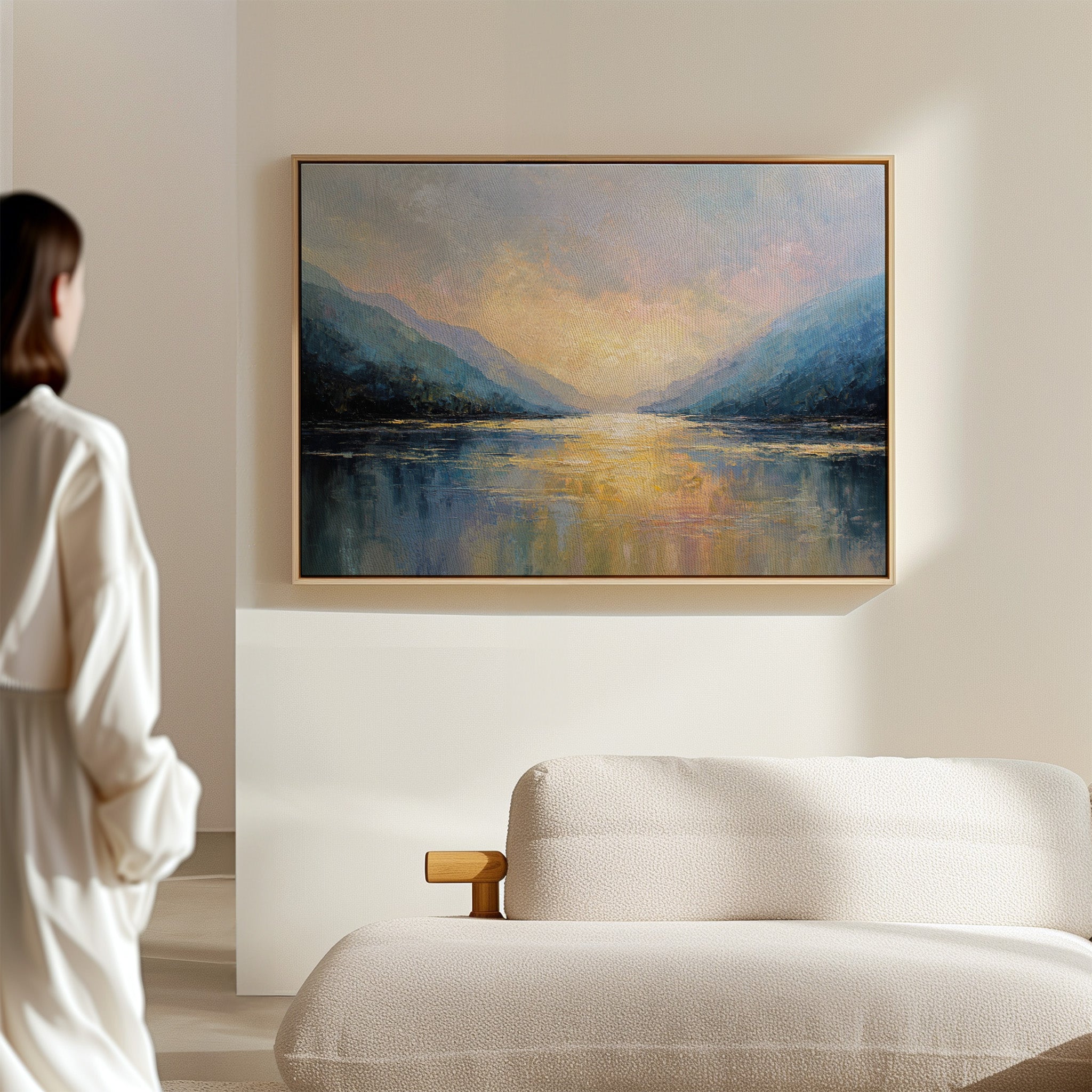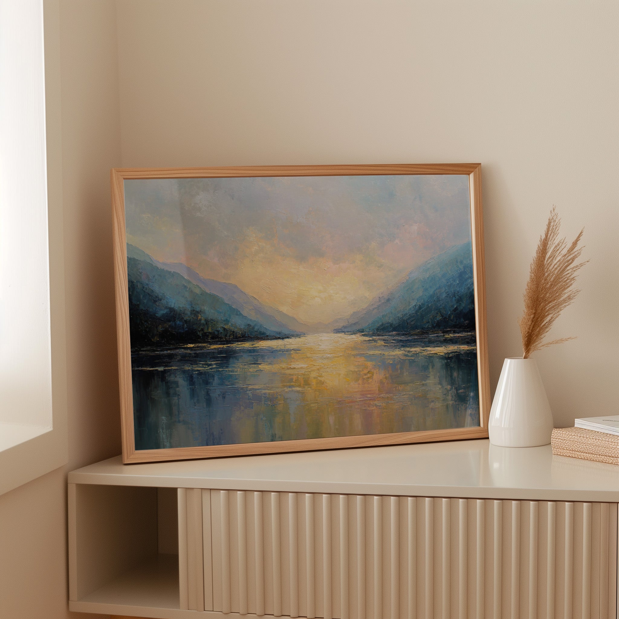 In the quiet embrace of dawn, the sun spills gold across the tranquil lake, illuminating the peaks in a soft, ethereal glow. This piece captures the serene beauty of nature, inviting a moment of reflection and peace. Gentle strokes of blues and warm hues blend seamlessly, creating a harmonious dance of light and color that beckons the viewer into its serene depths. Perfect for a calming space, such as a reading nook or a serene bedroom, this piece transforms any room into a sanctuary of tranquility.