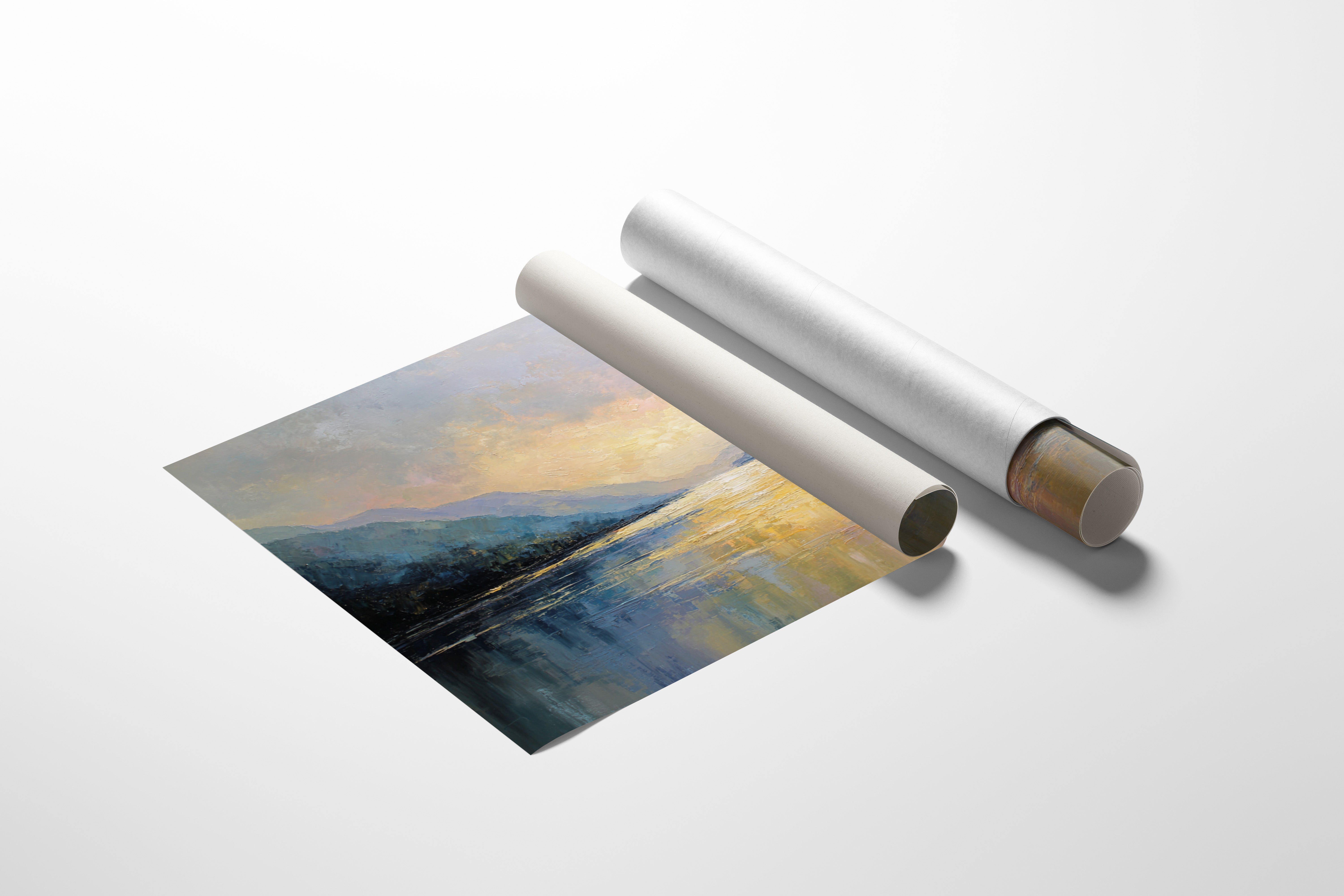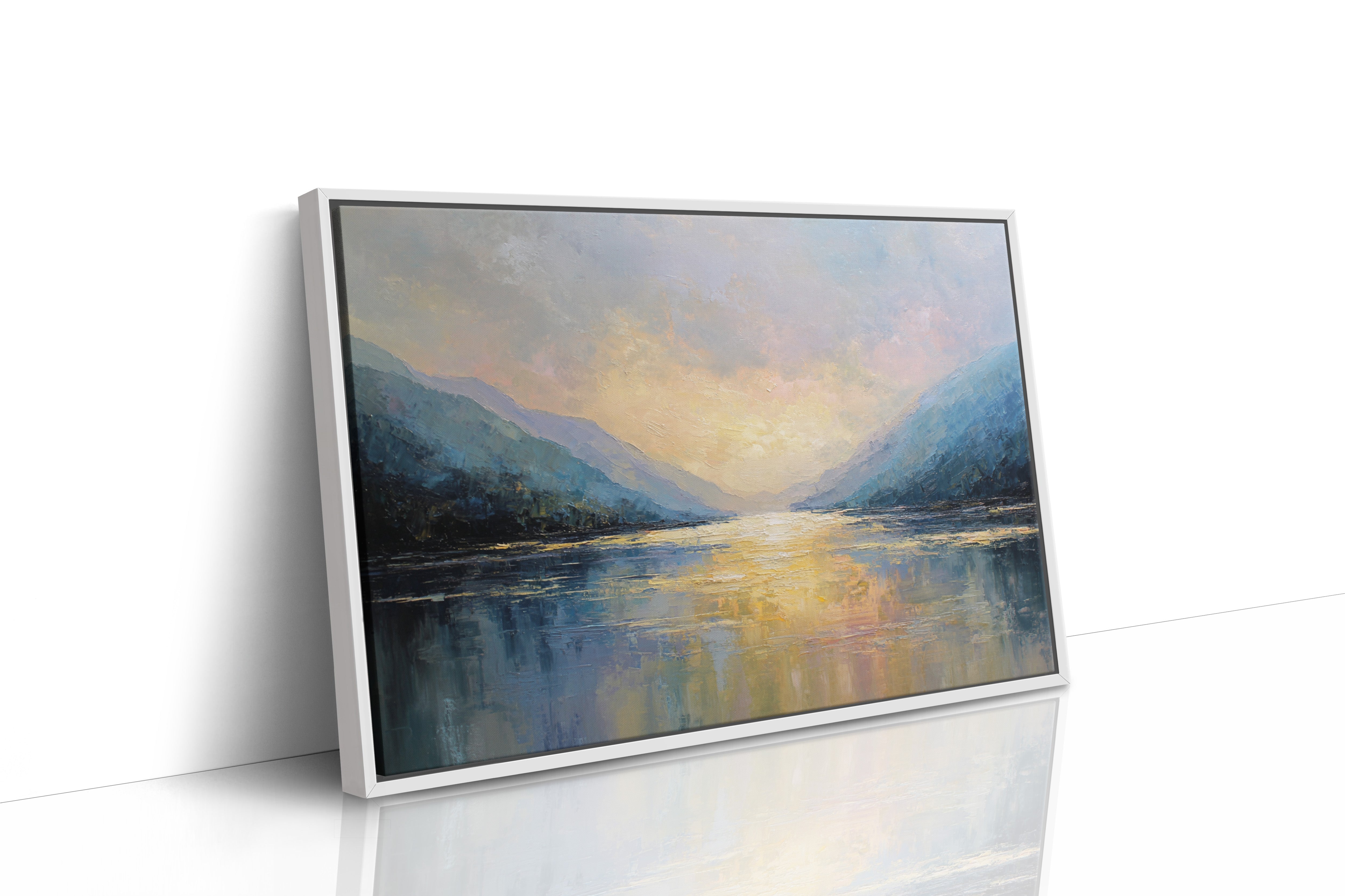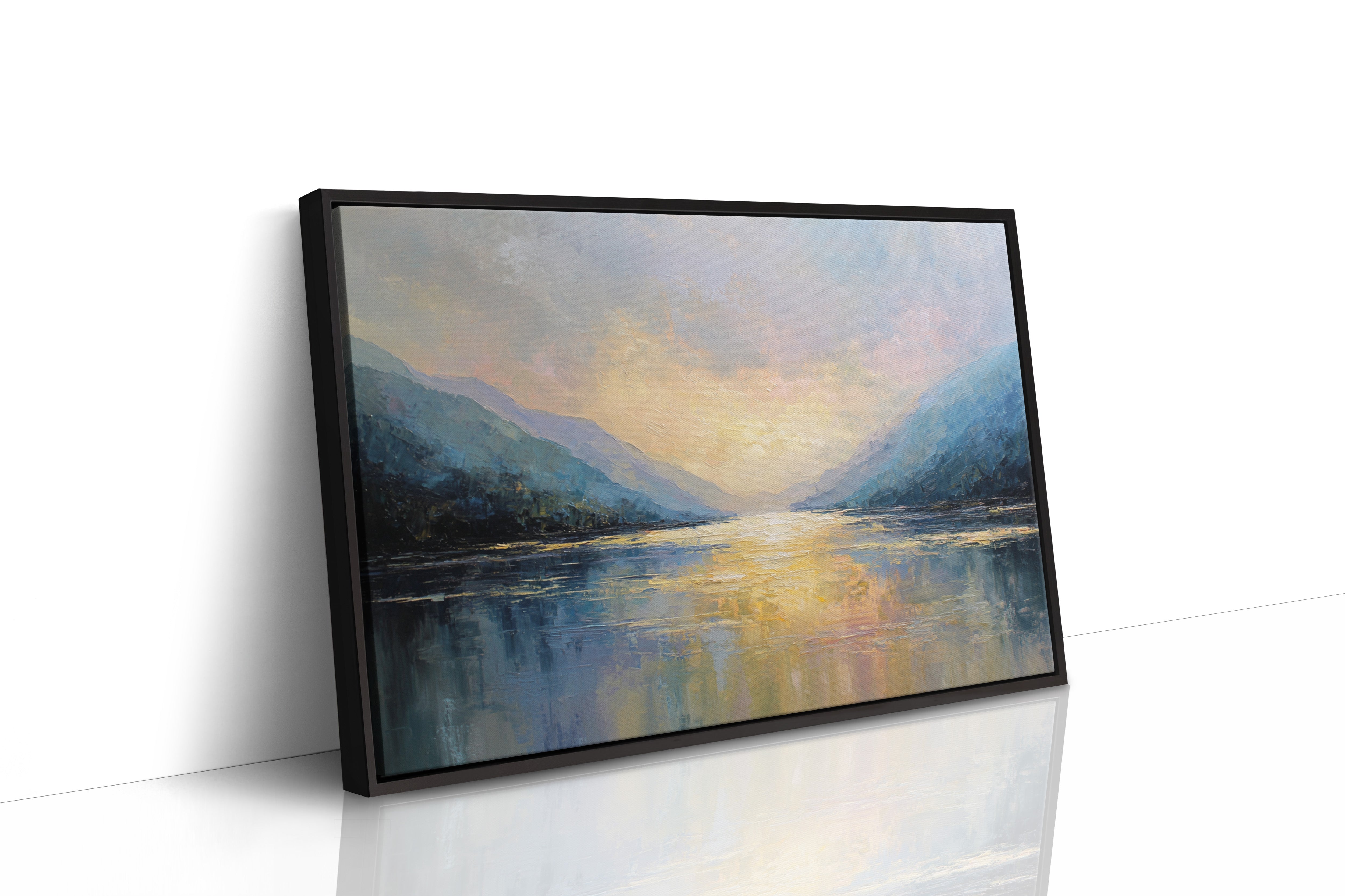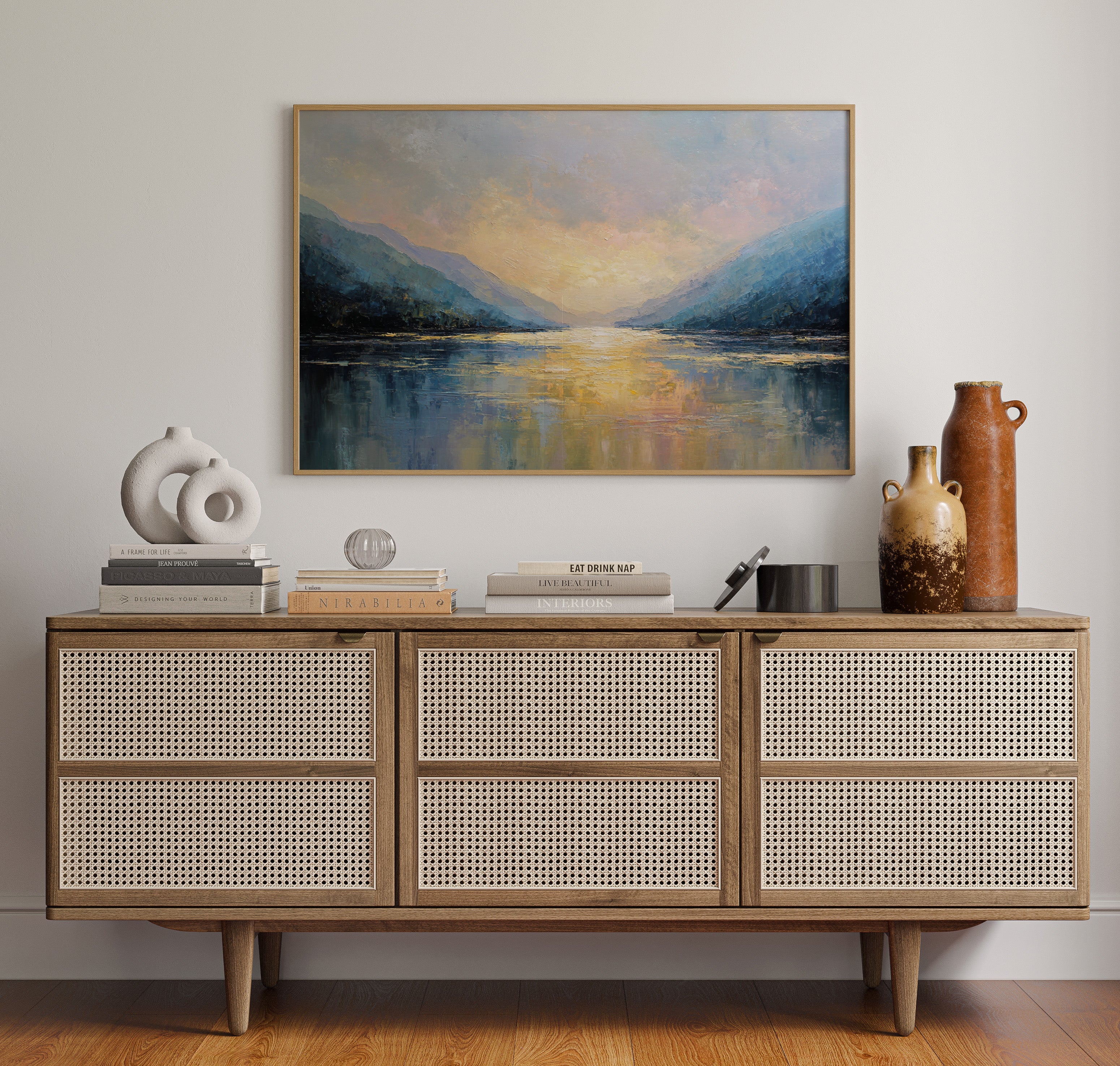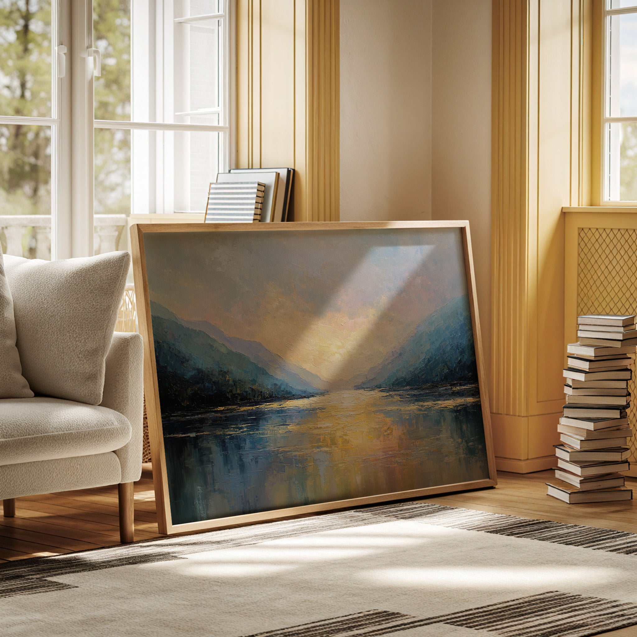 In the quiet embrace of dawn, the sun spills gold across the tranquil lake, illuminating the peaks in a soft, ethereal glow. This piece captures the serene beauty of nature, inviting a moment of reflection and peace. Gentle strokes of blues and warm hues blend seamlessly, creating a harmonious dance of light and color that beckons the viewer into its serene depths. Perfect for a calming space, such as a reading nook or a serene bedroom, this piece transforms any room into a sanctuary of tranquility.