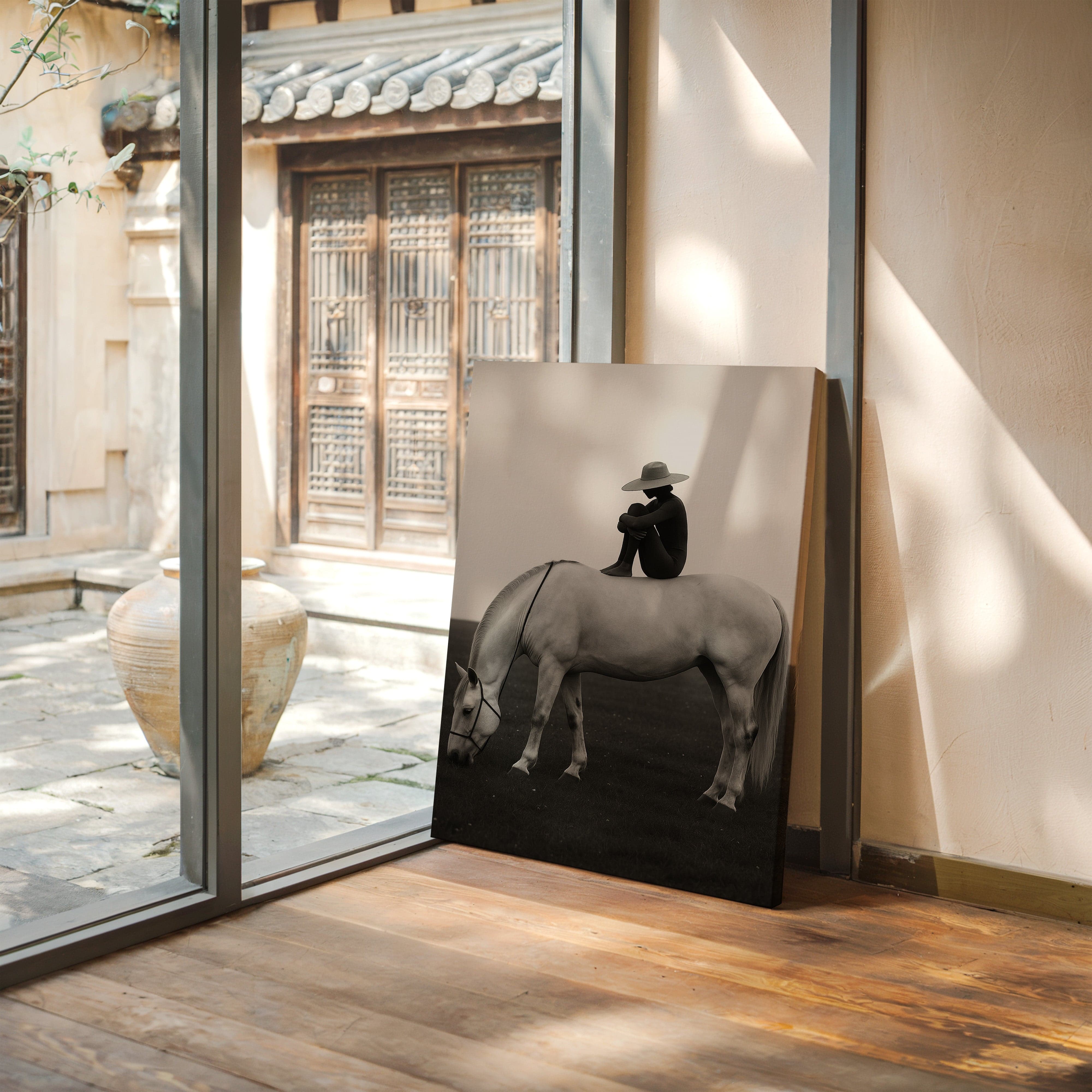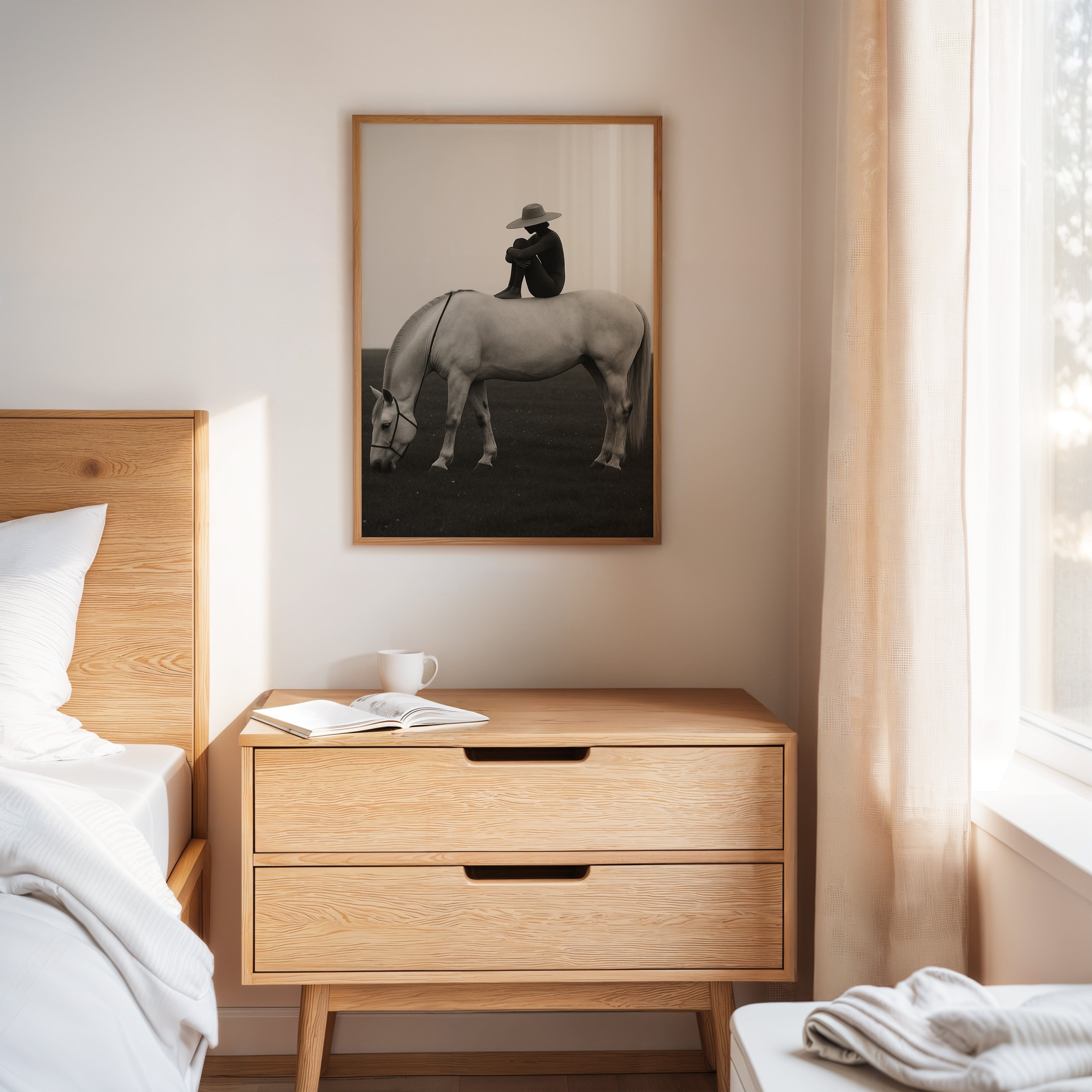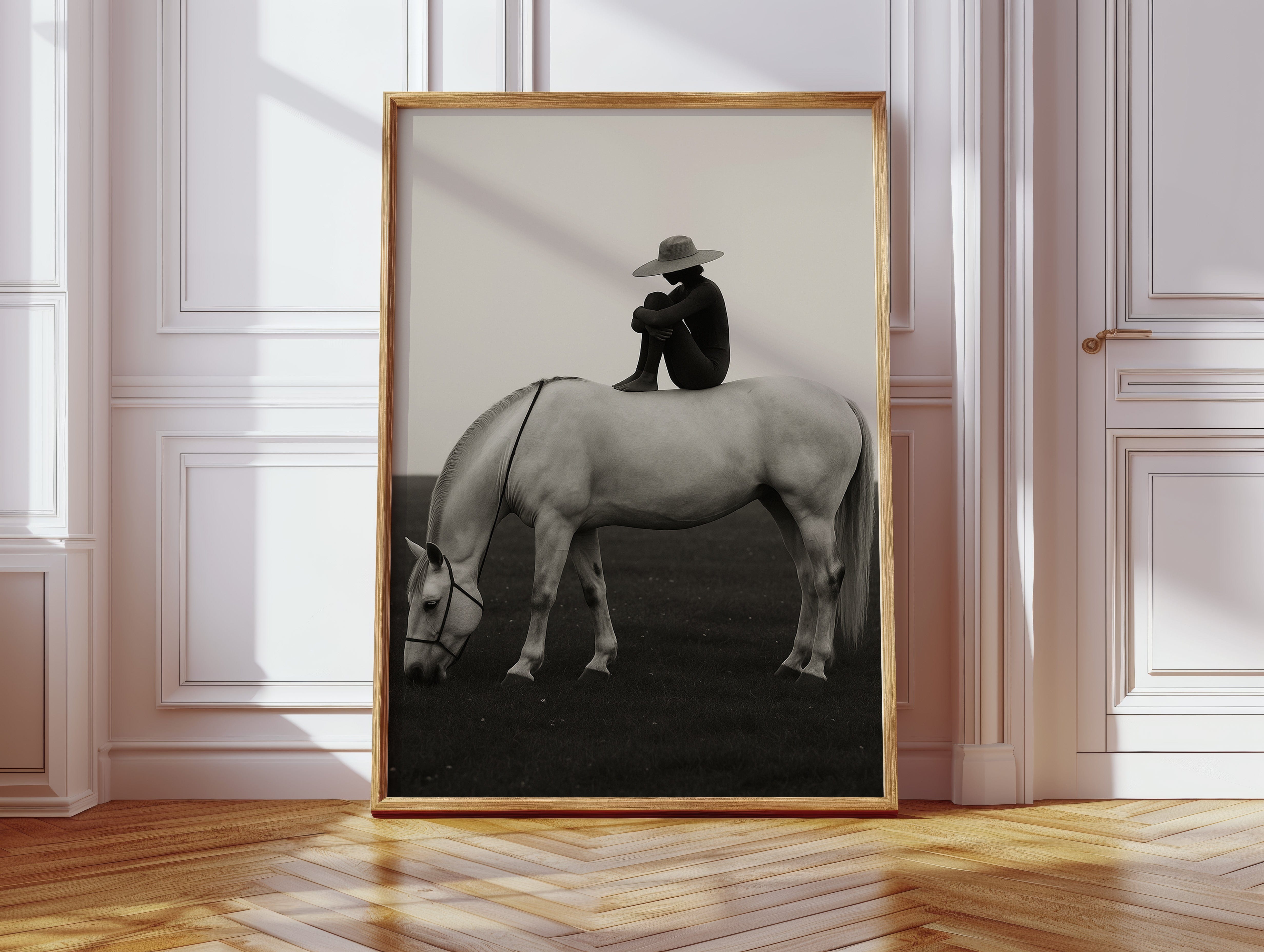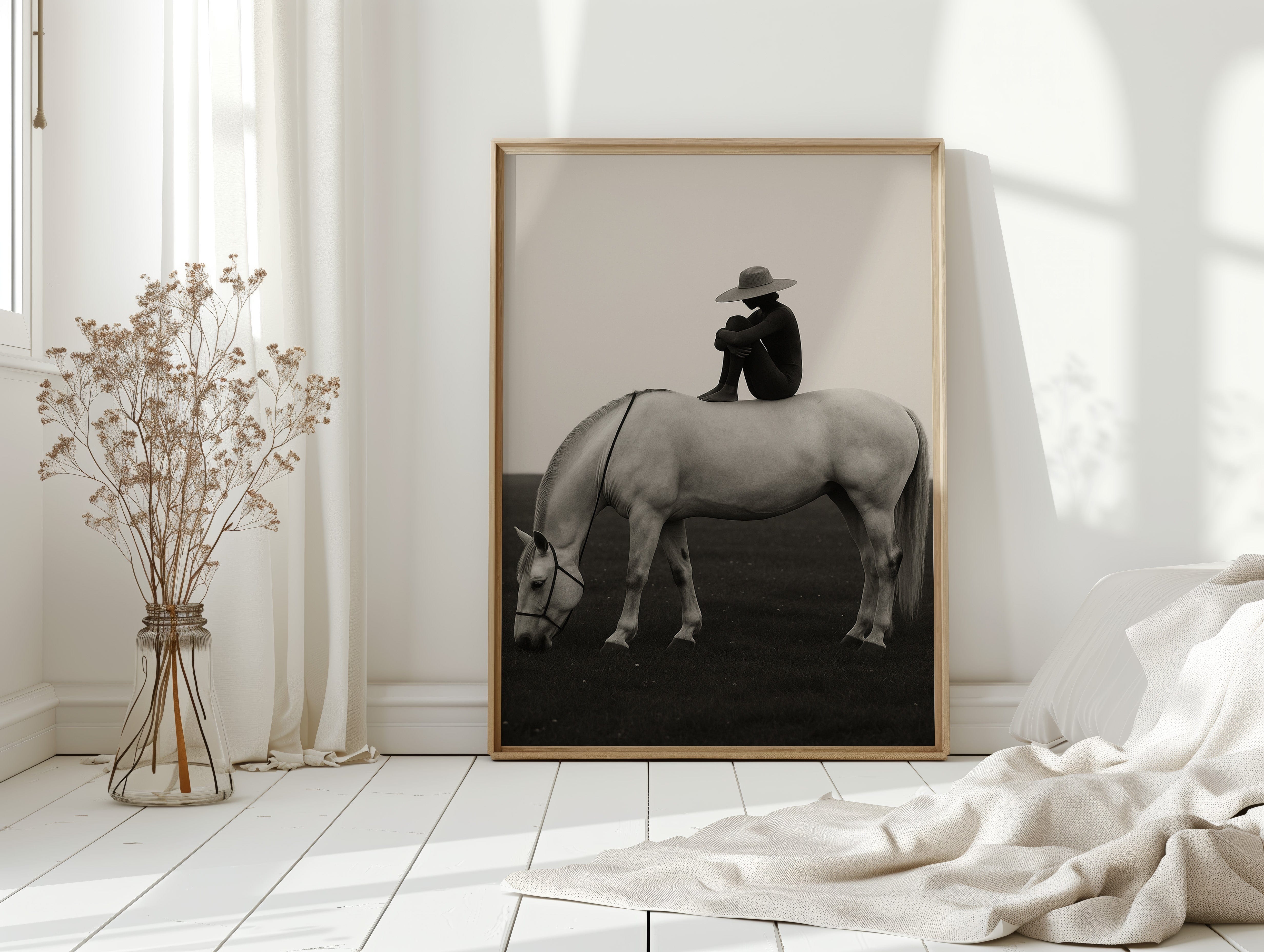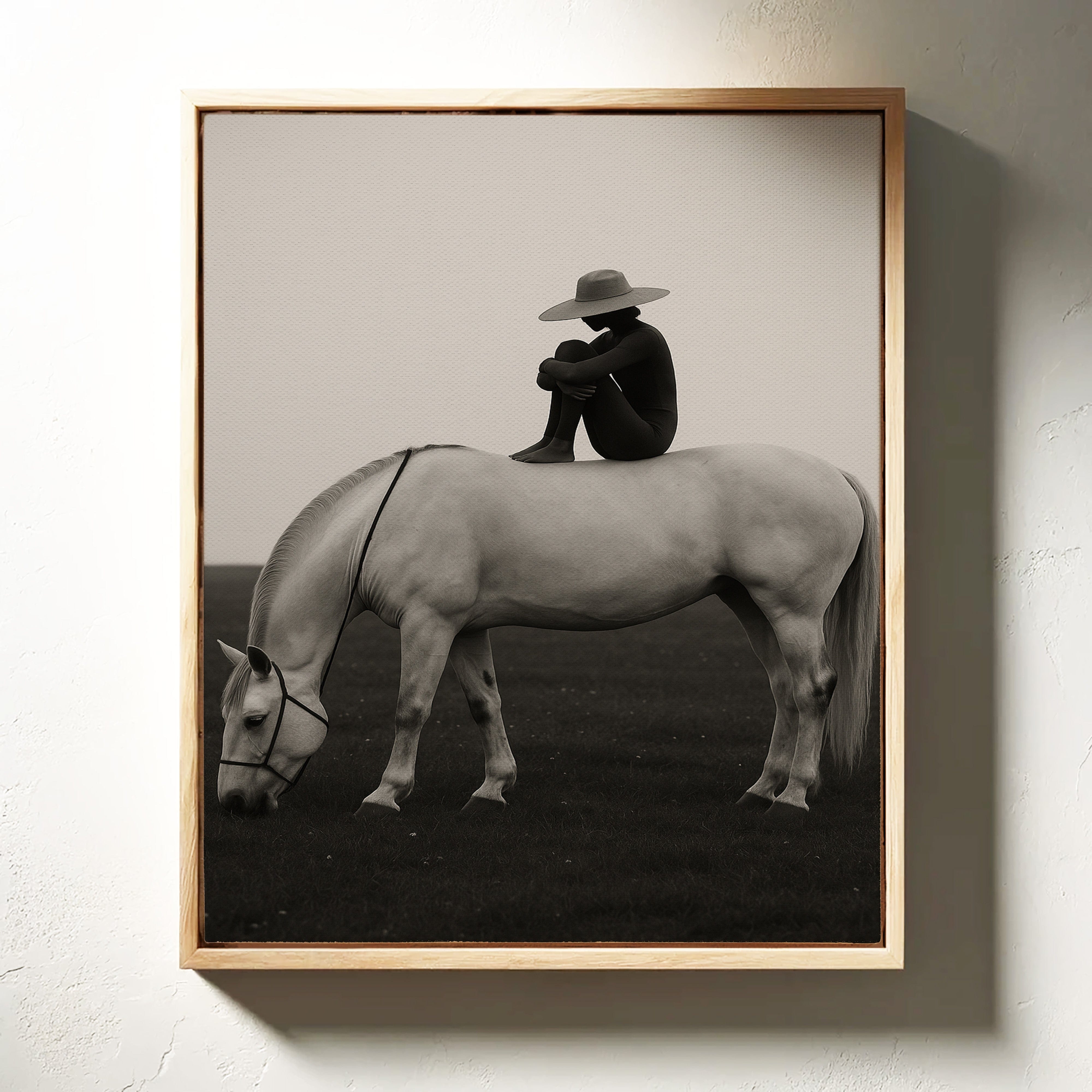A quiet moment captured in black and white—an ode to the unspoken bond between rider and horse. With solitude in the saddle and serenity in the air, this minimalist portrait invites stillness, trust, and a slower rhythm of life.
