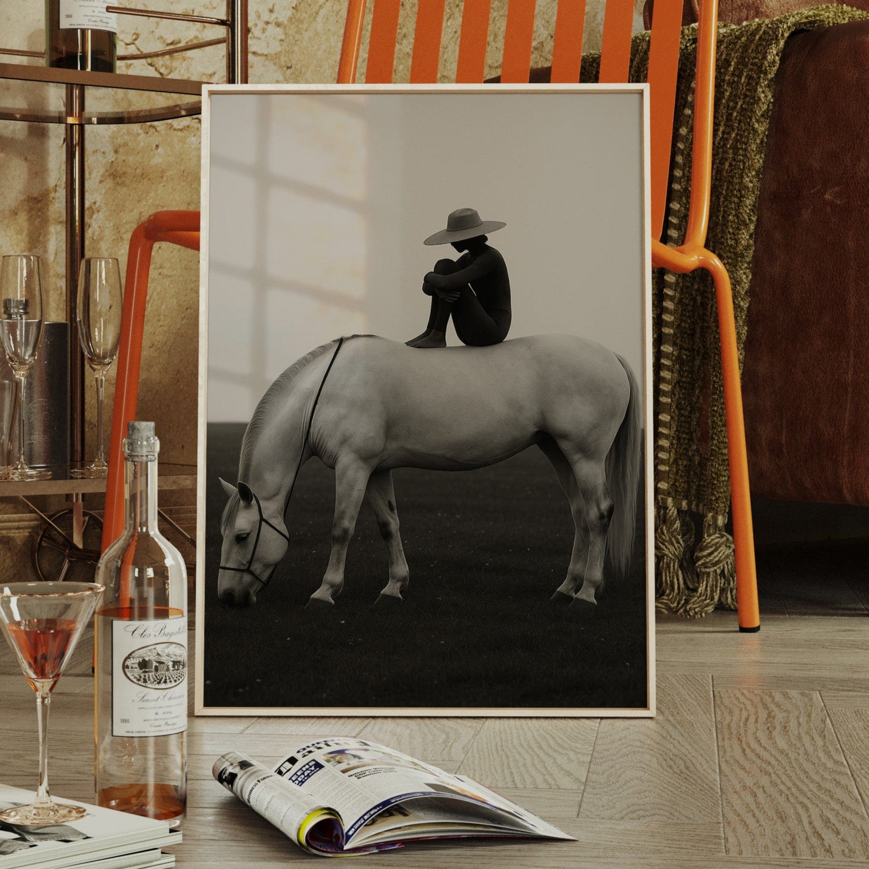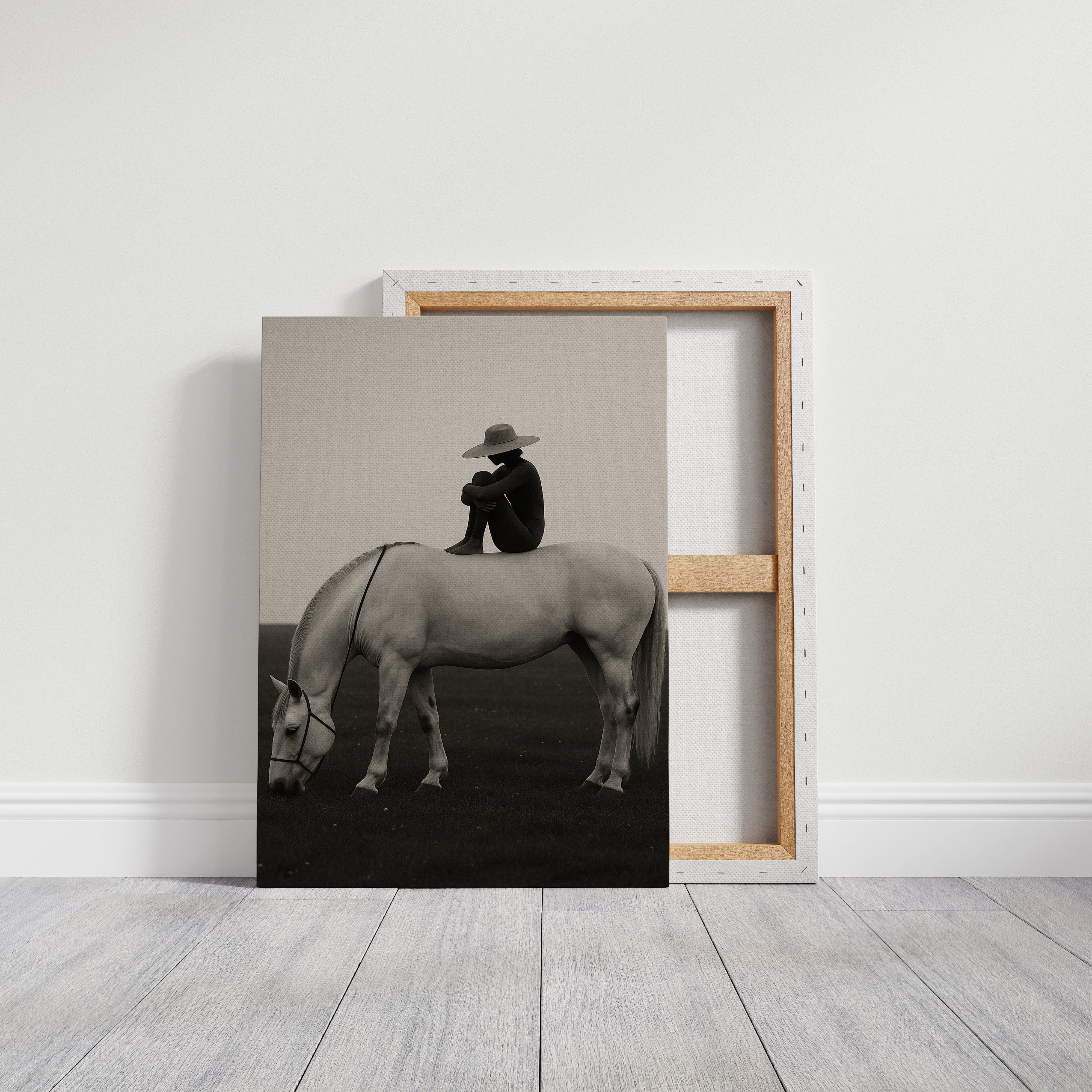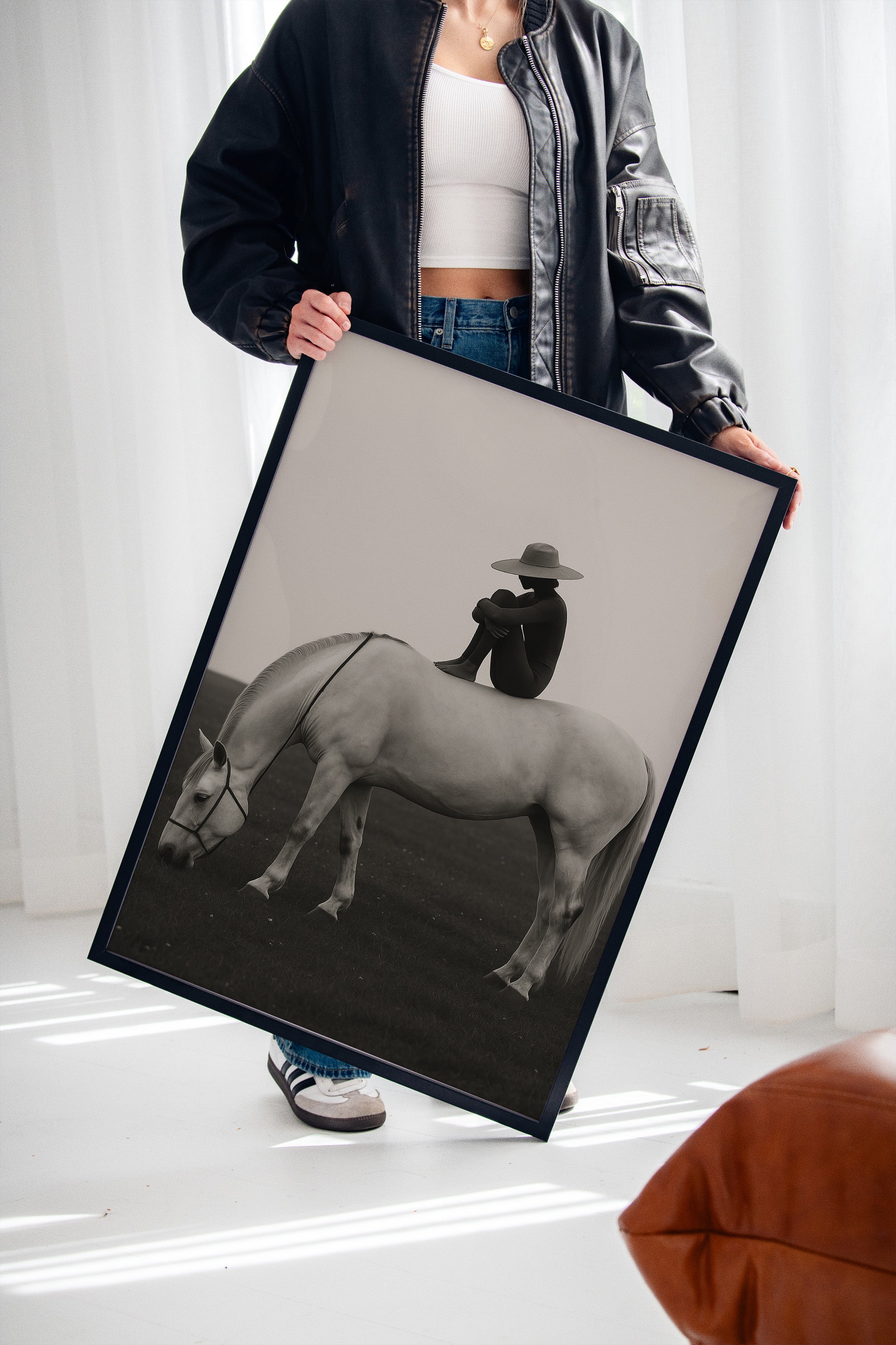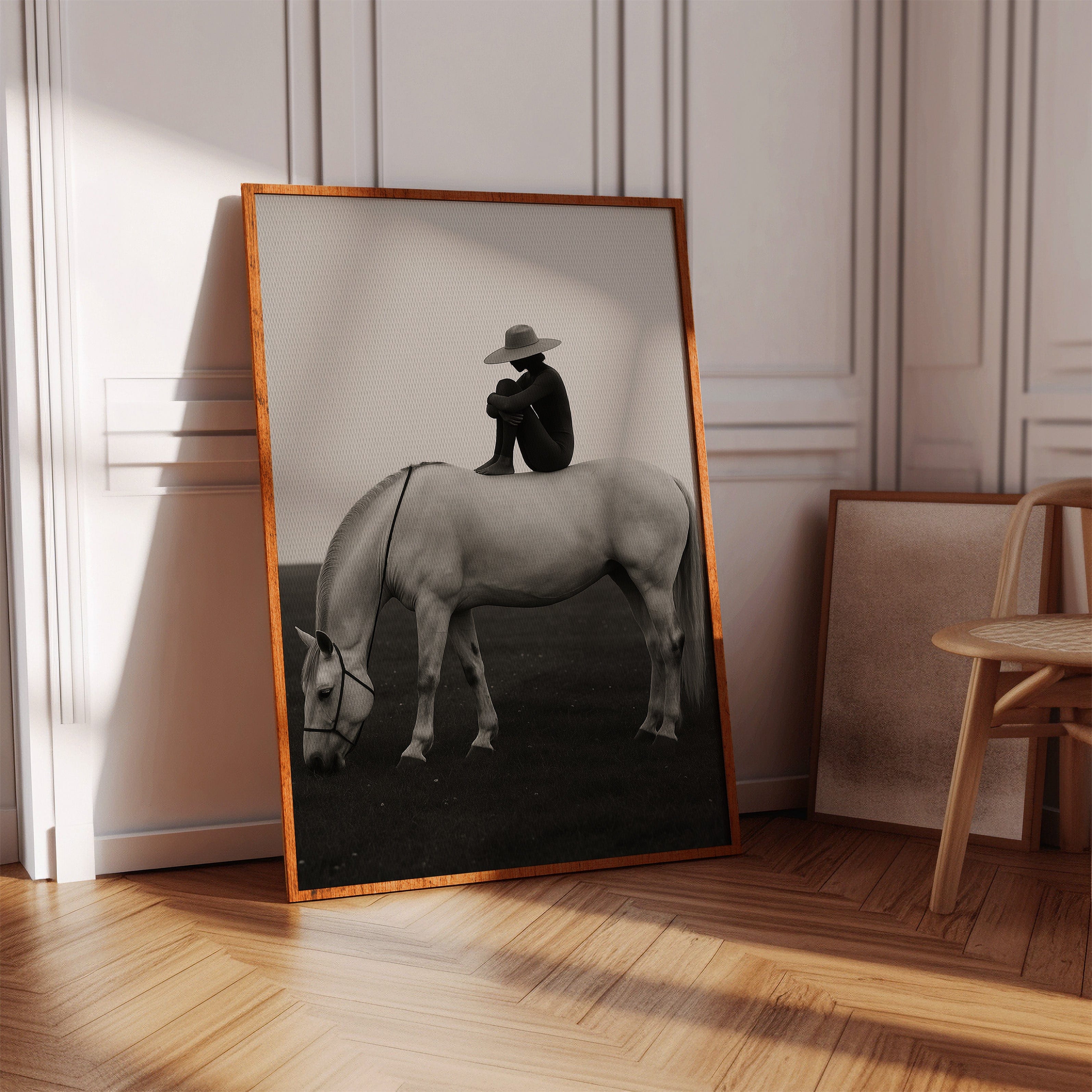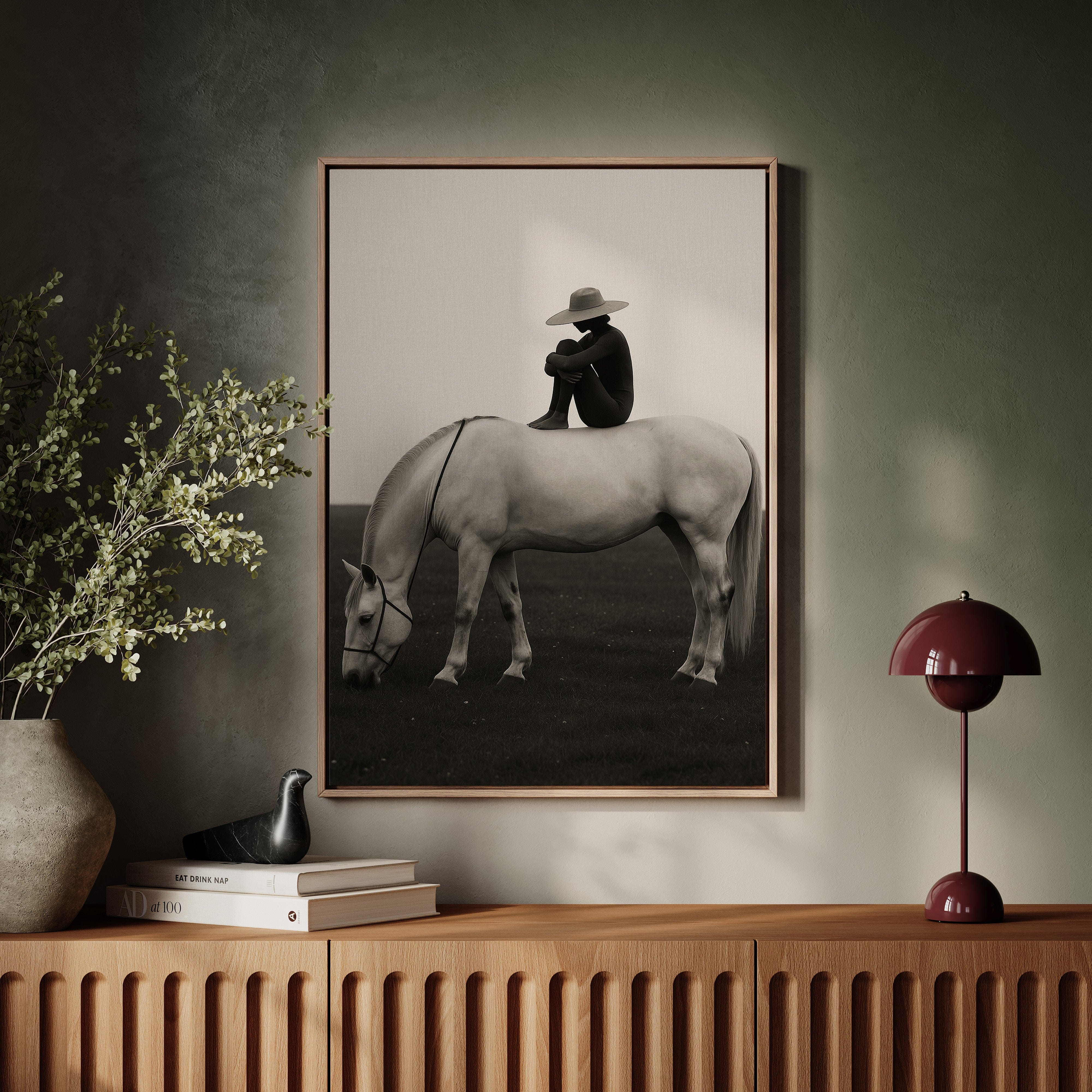 A quiet moment captured in black and white—an ode to the unspoken bond between rider and horse. With solitude in the saddle and serenity in the air, this minimalist portrait invites stillness, trust, and a slower rhythm of life.