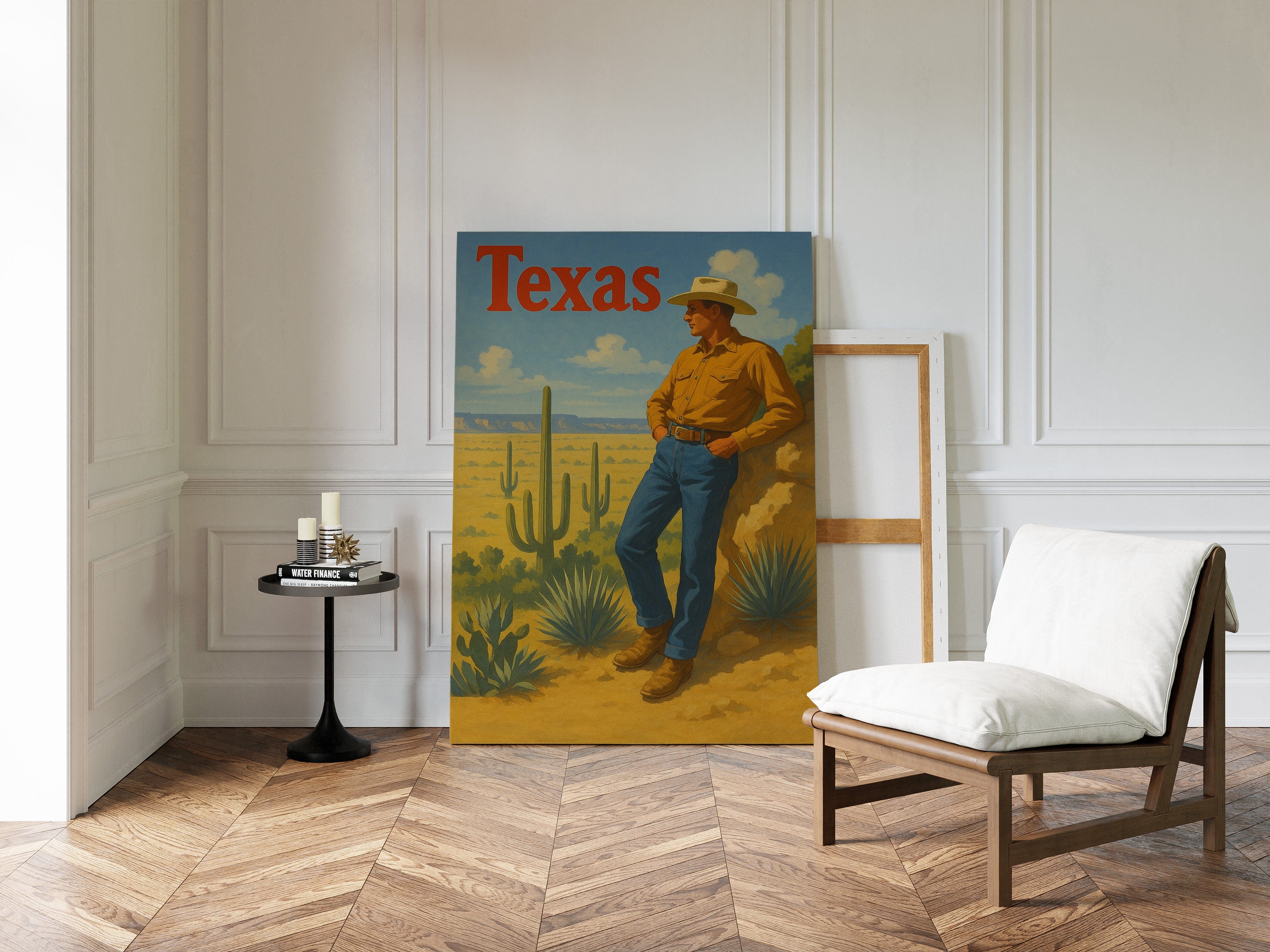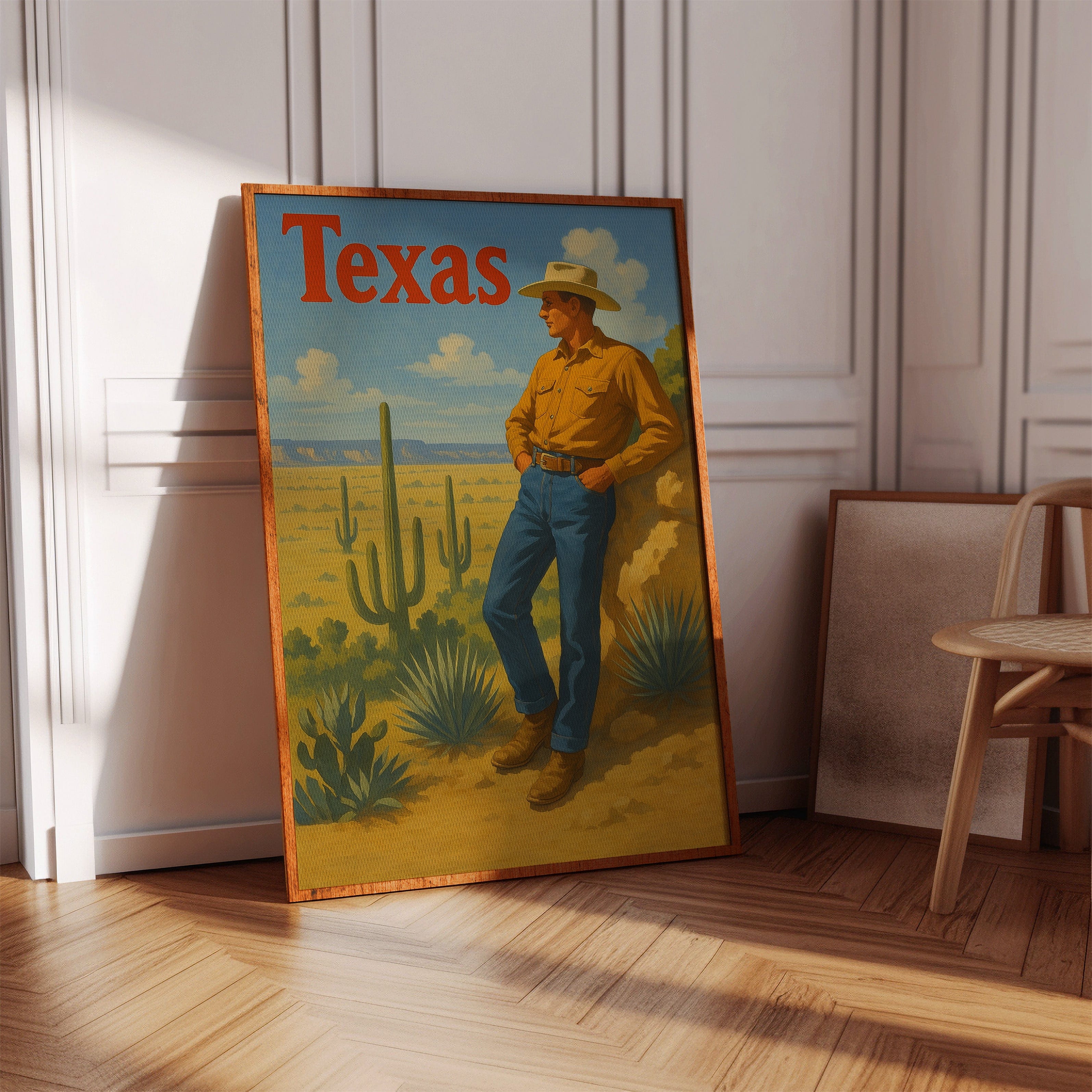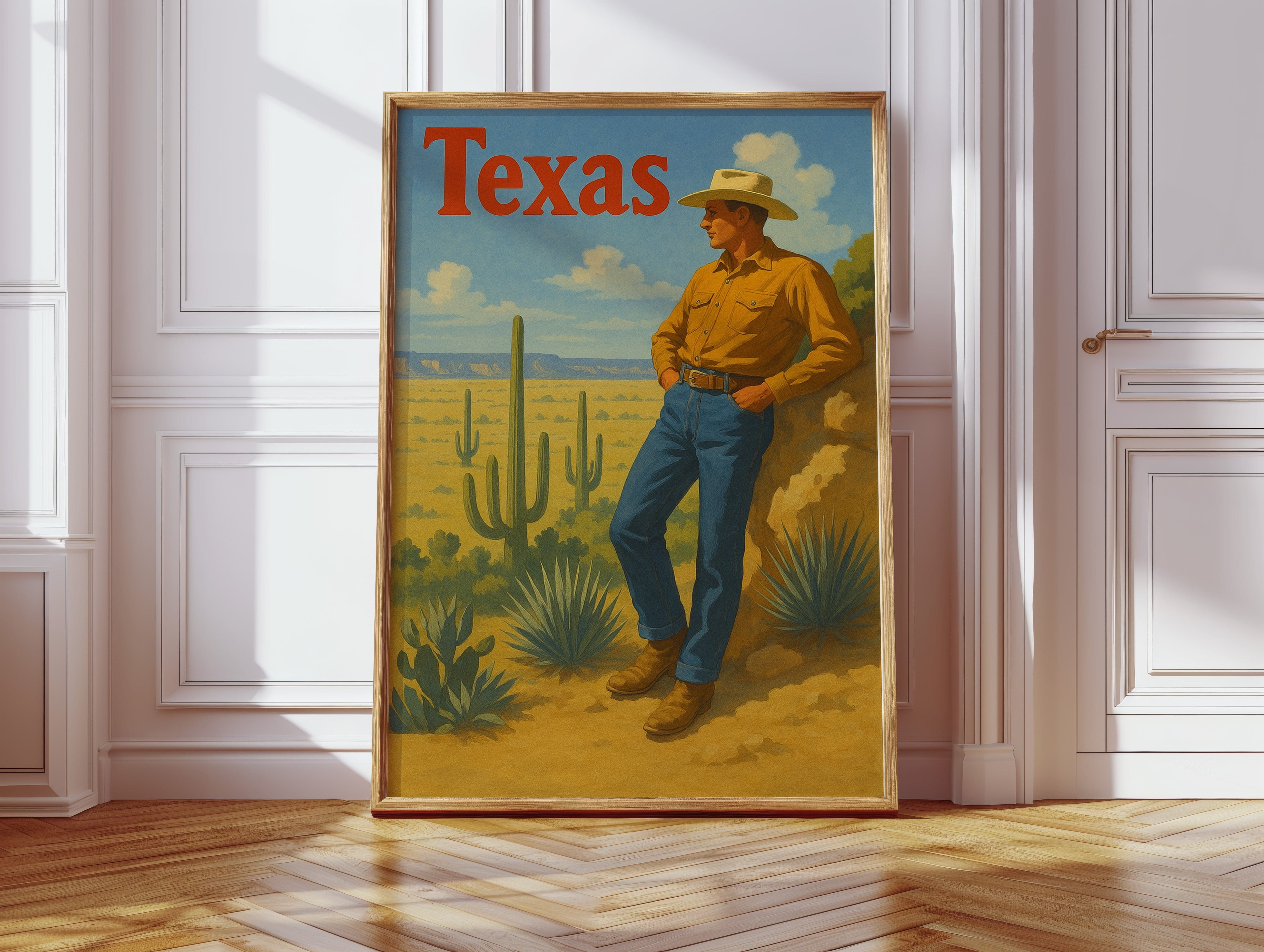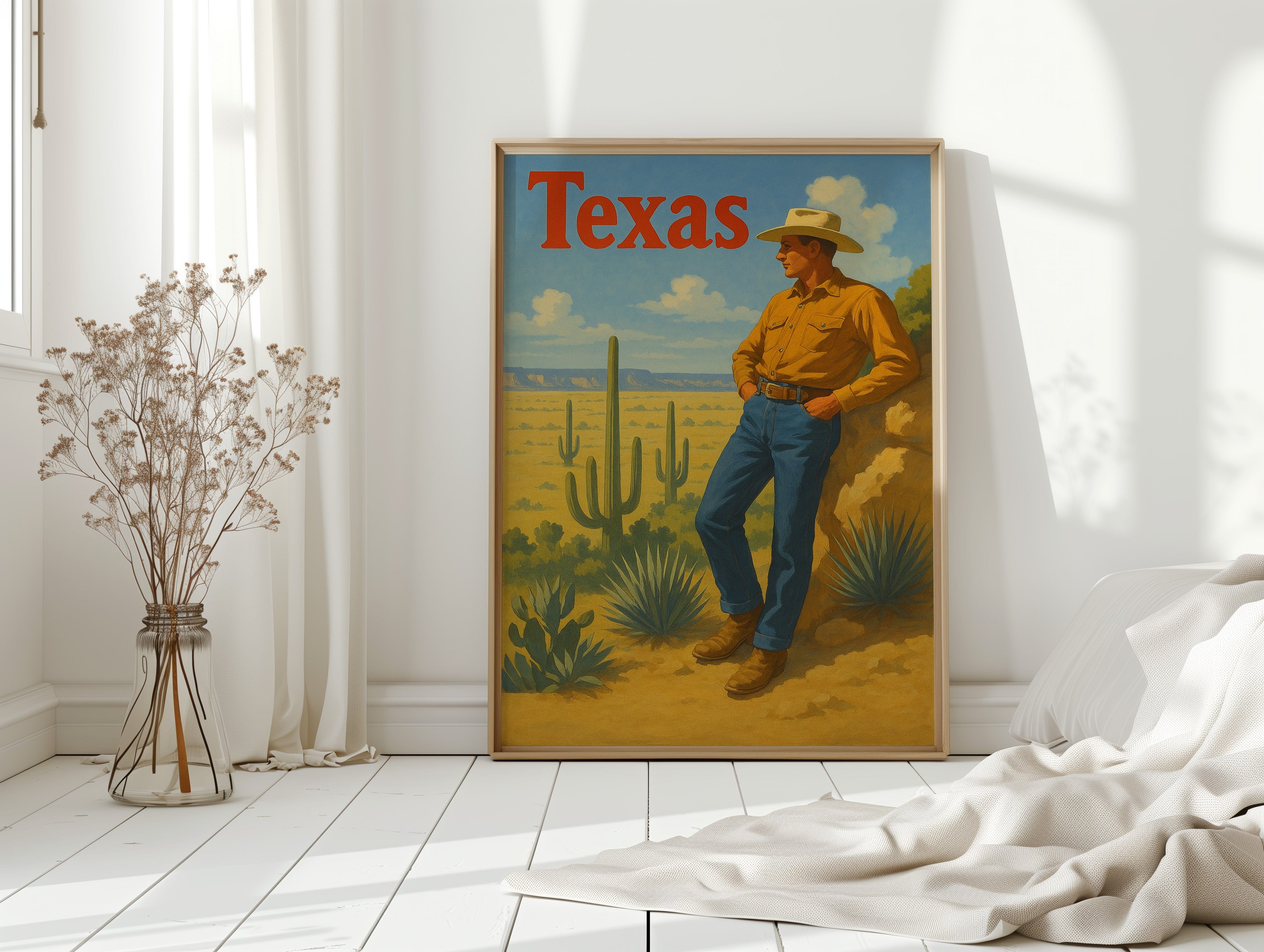 A nod to vintage travel posters, this artwork captures the quiet strength of a cowboy in the wild Texas desert. With golden earth, towering cacti, and endless sky, it tells a story of solitude, strength, and sun-scorched dreams. A timeless piece for lovers of the open road.