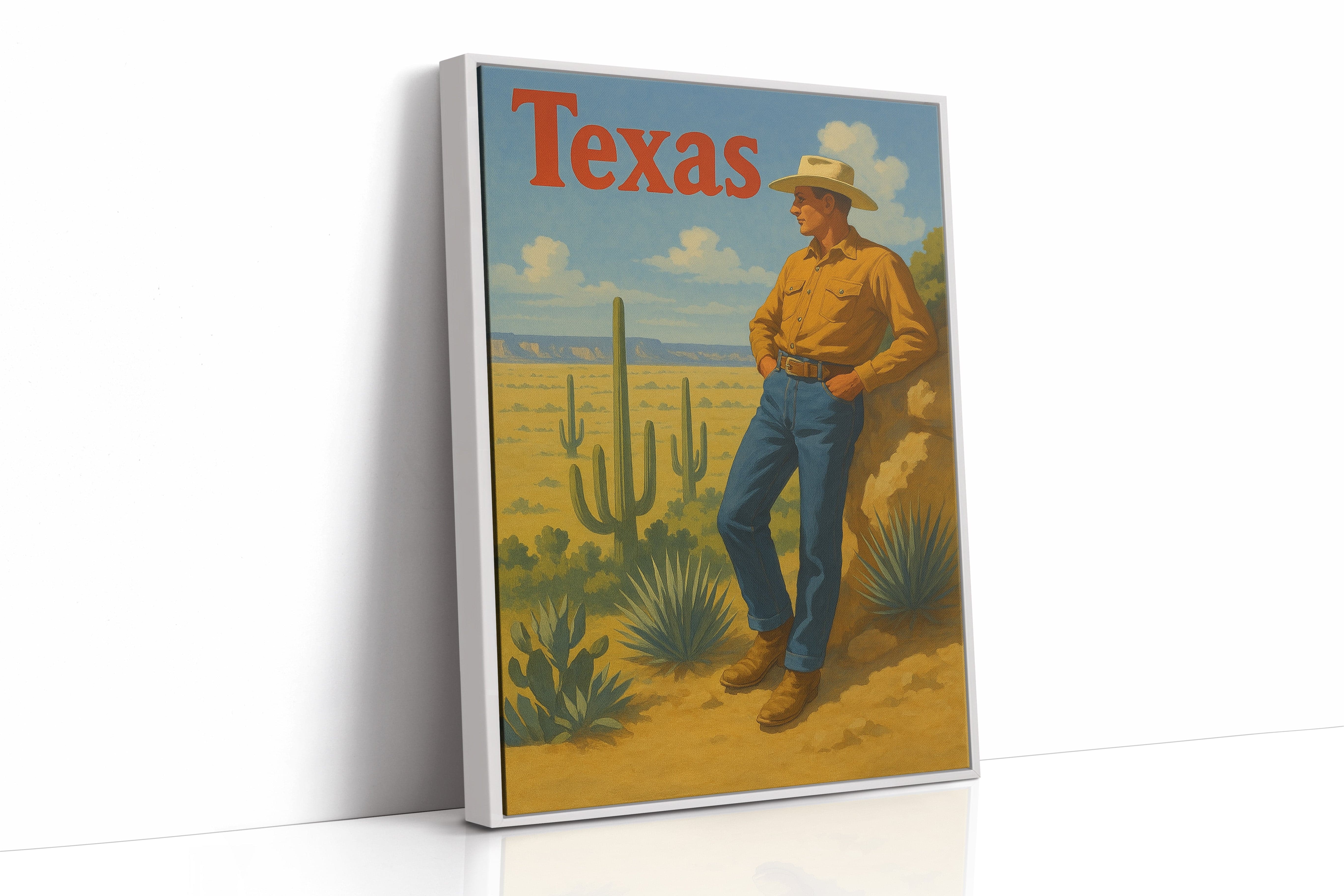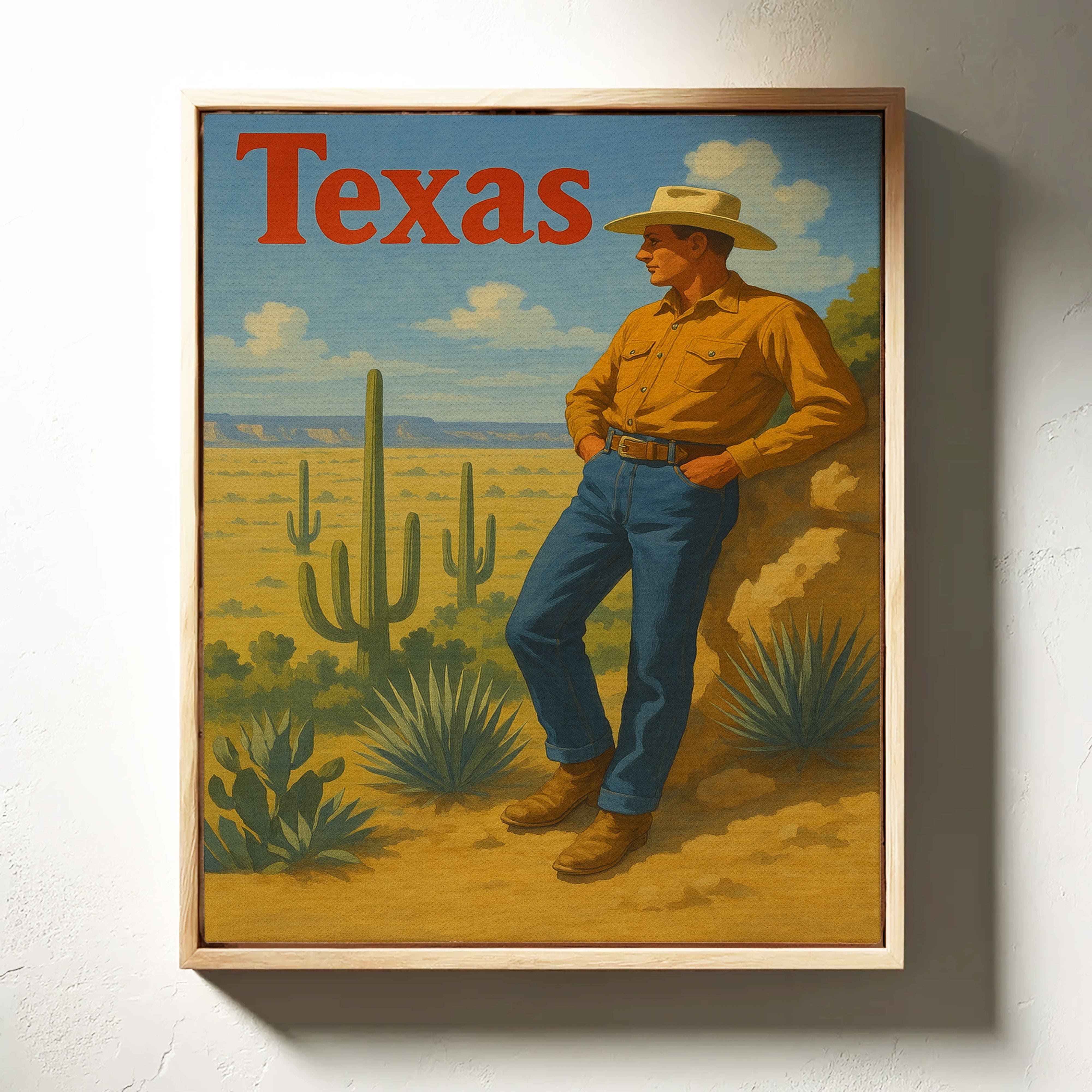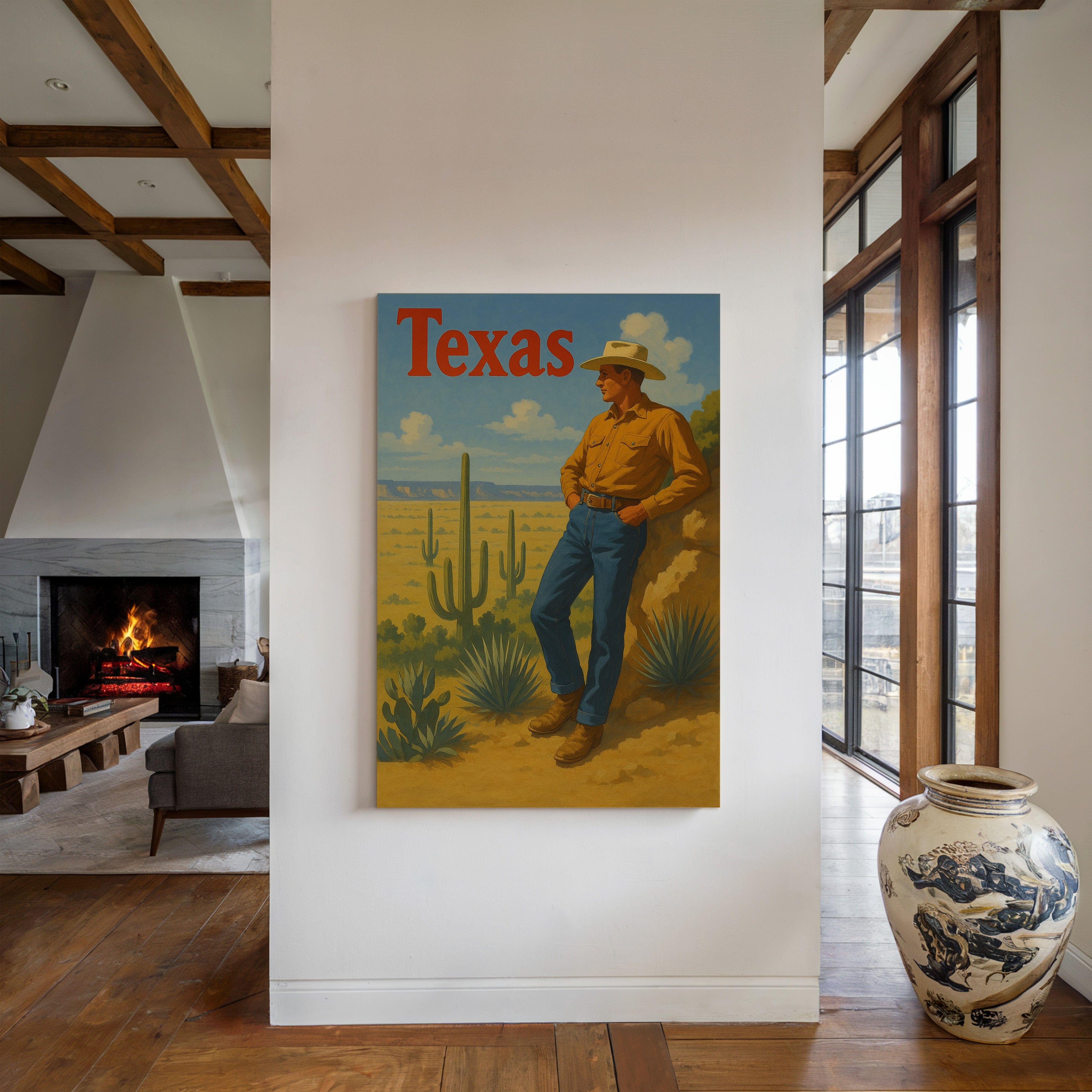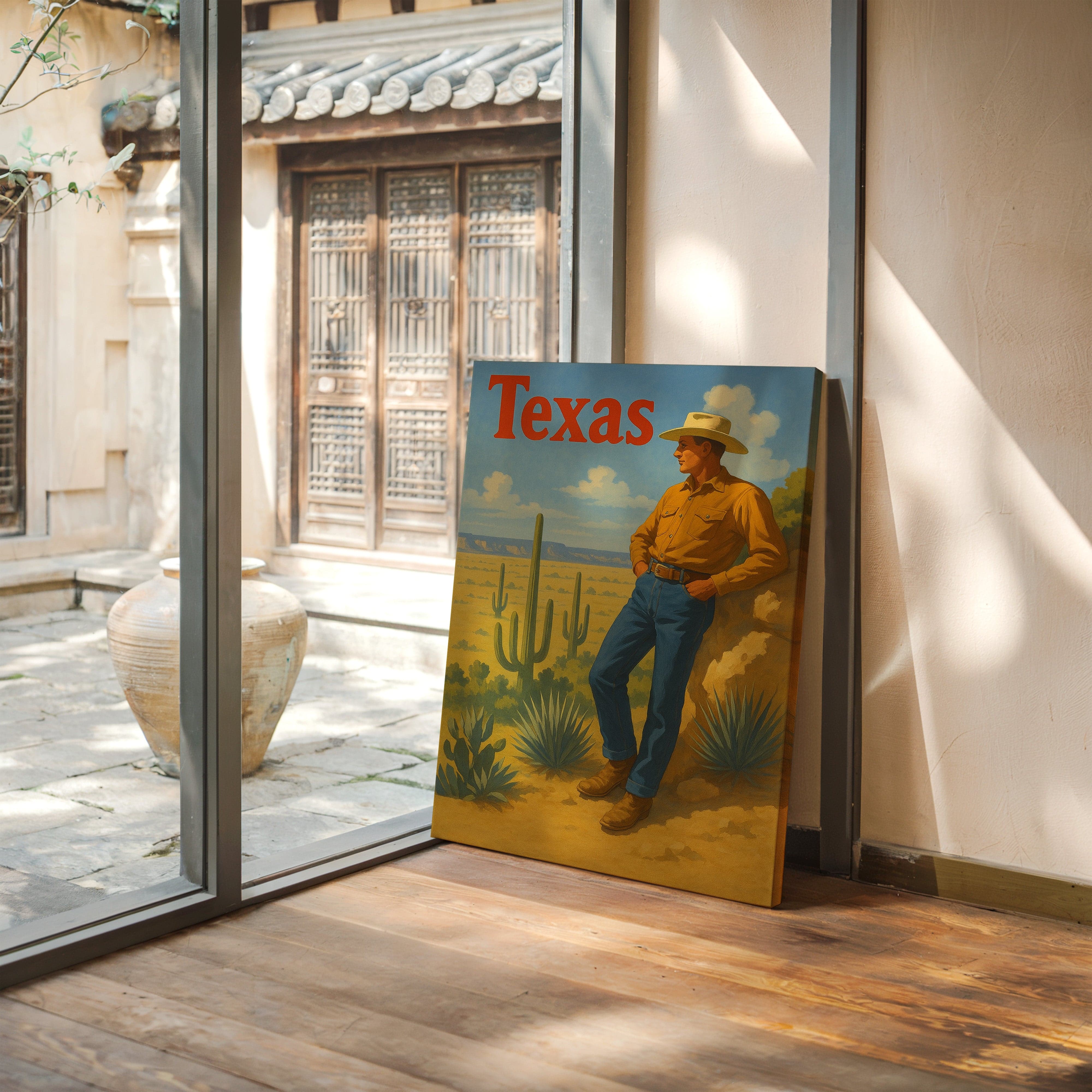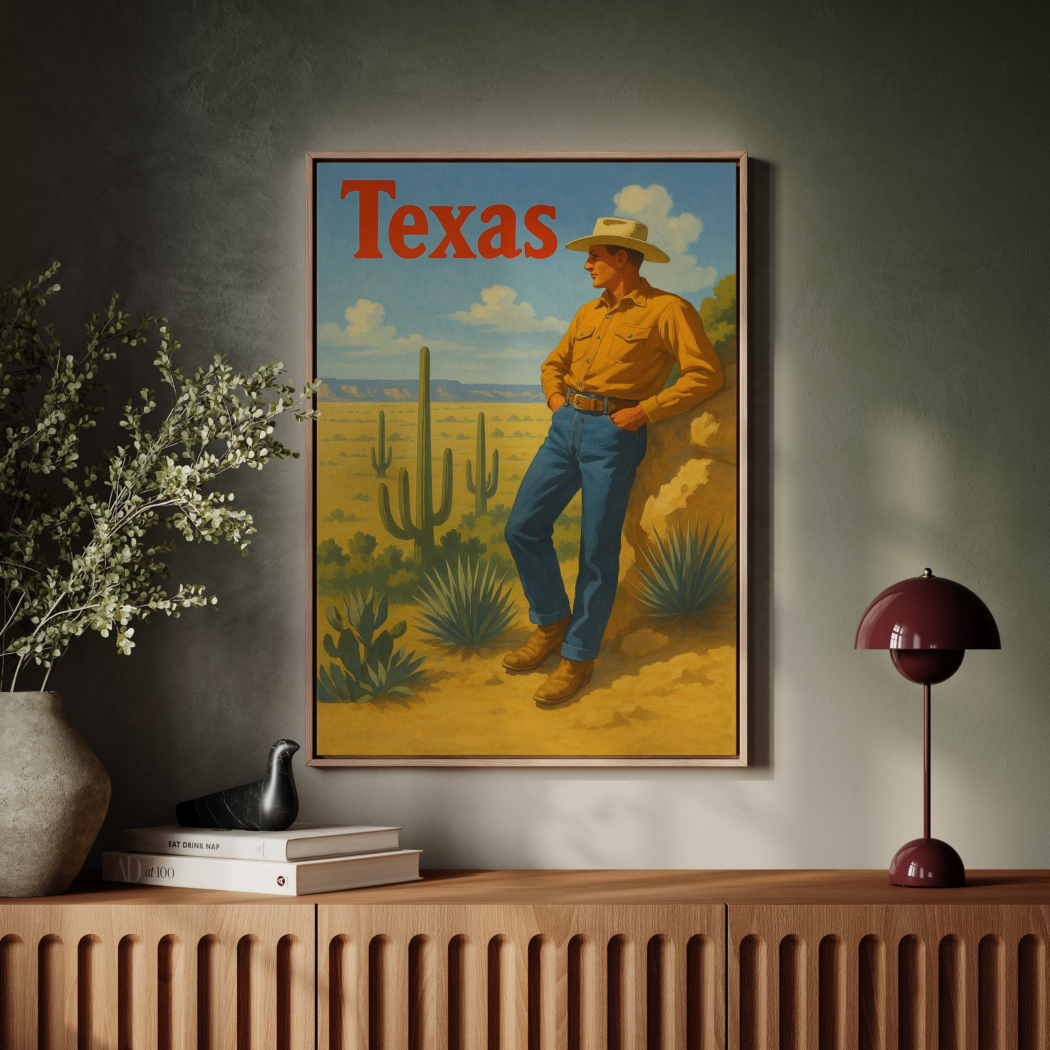 A nod to vintage travel posters, this artwork captures the quiet strength of a cowboy in the wild Texas desert. With golden earth, towering cacti, and endless sky, it tells a story of solitude, strength, and sun-scorched dreams. A timeless piece for lovers of the open road.