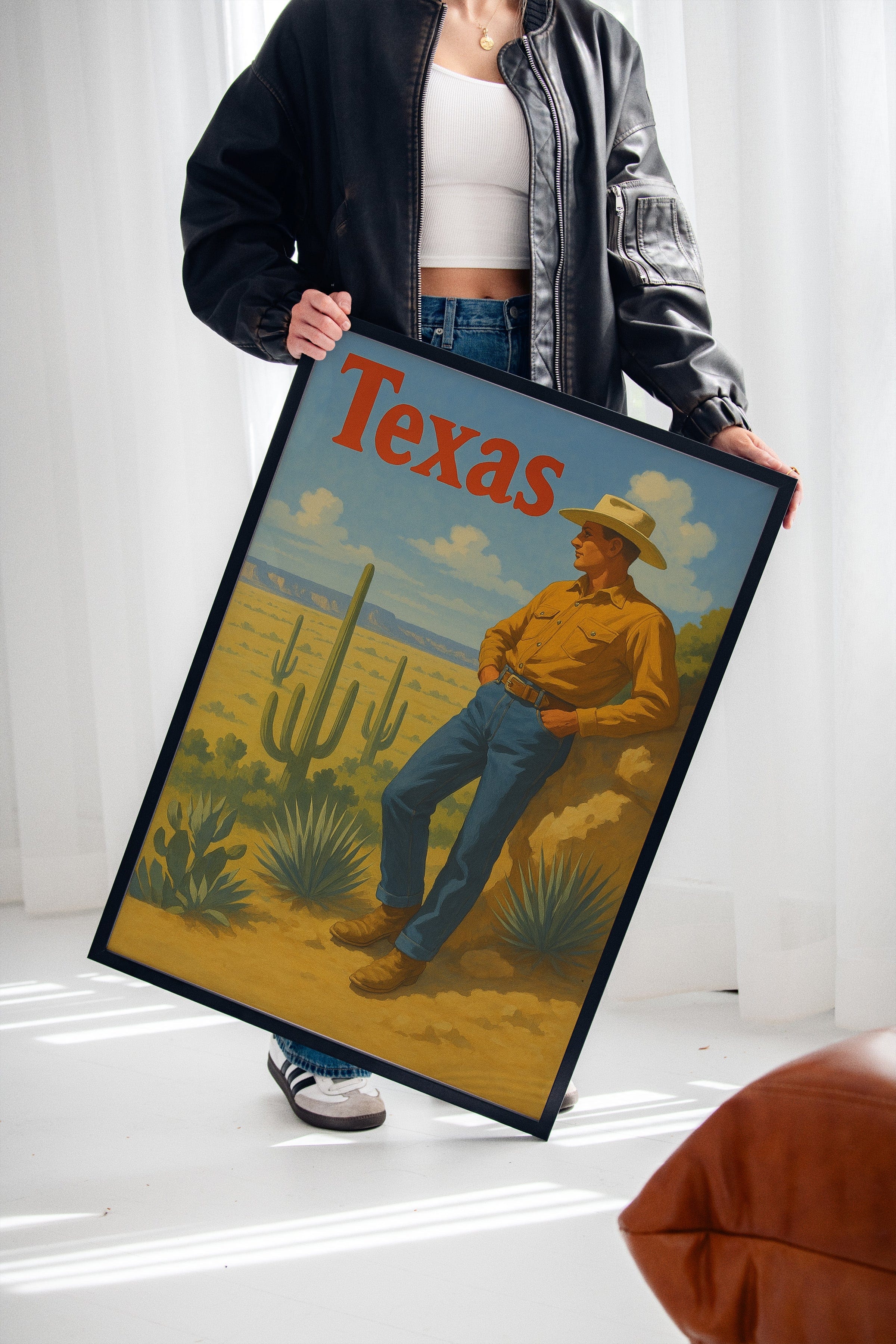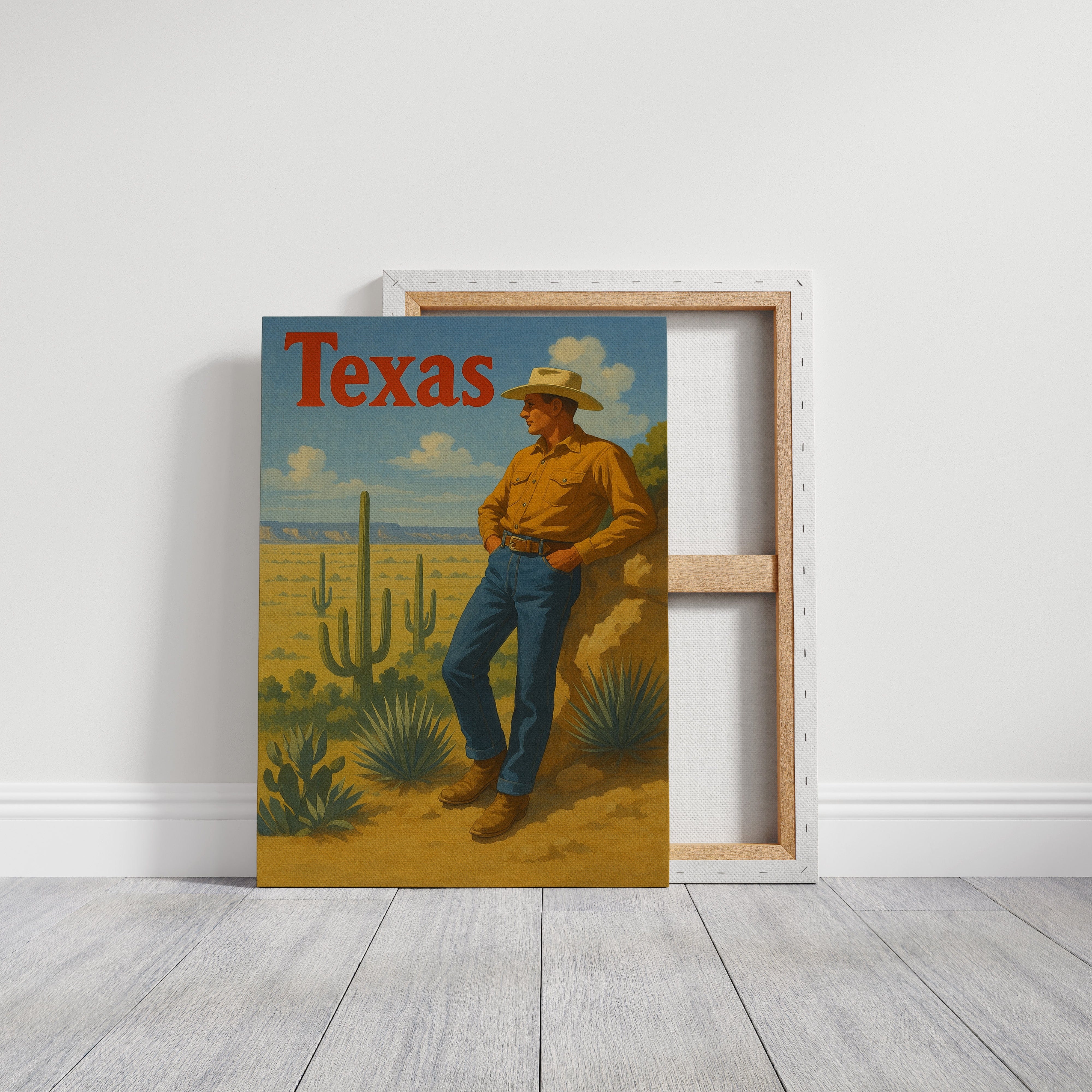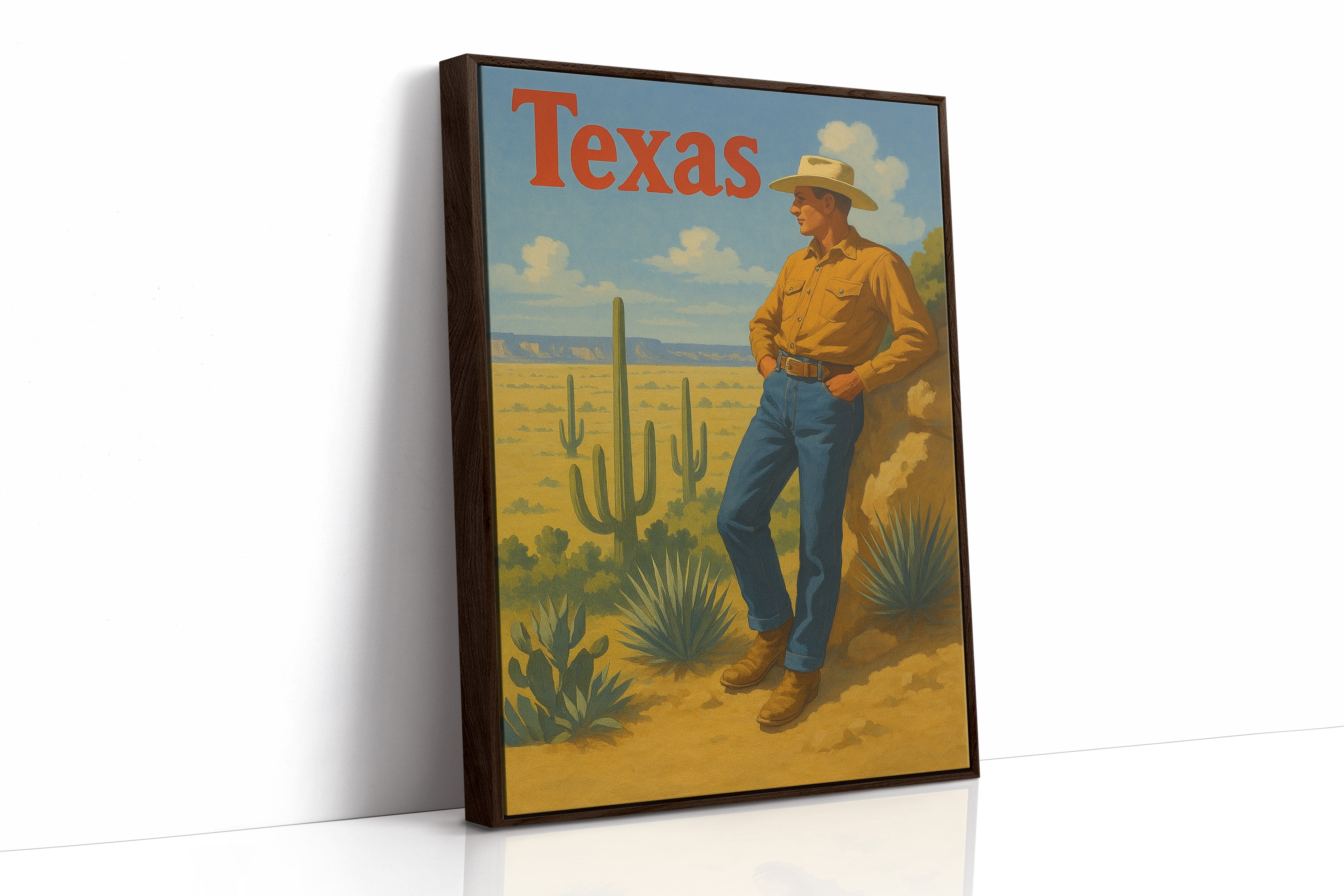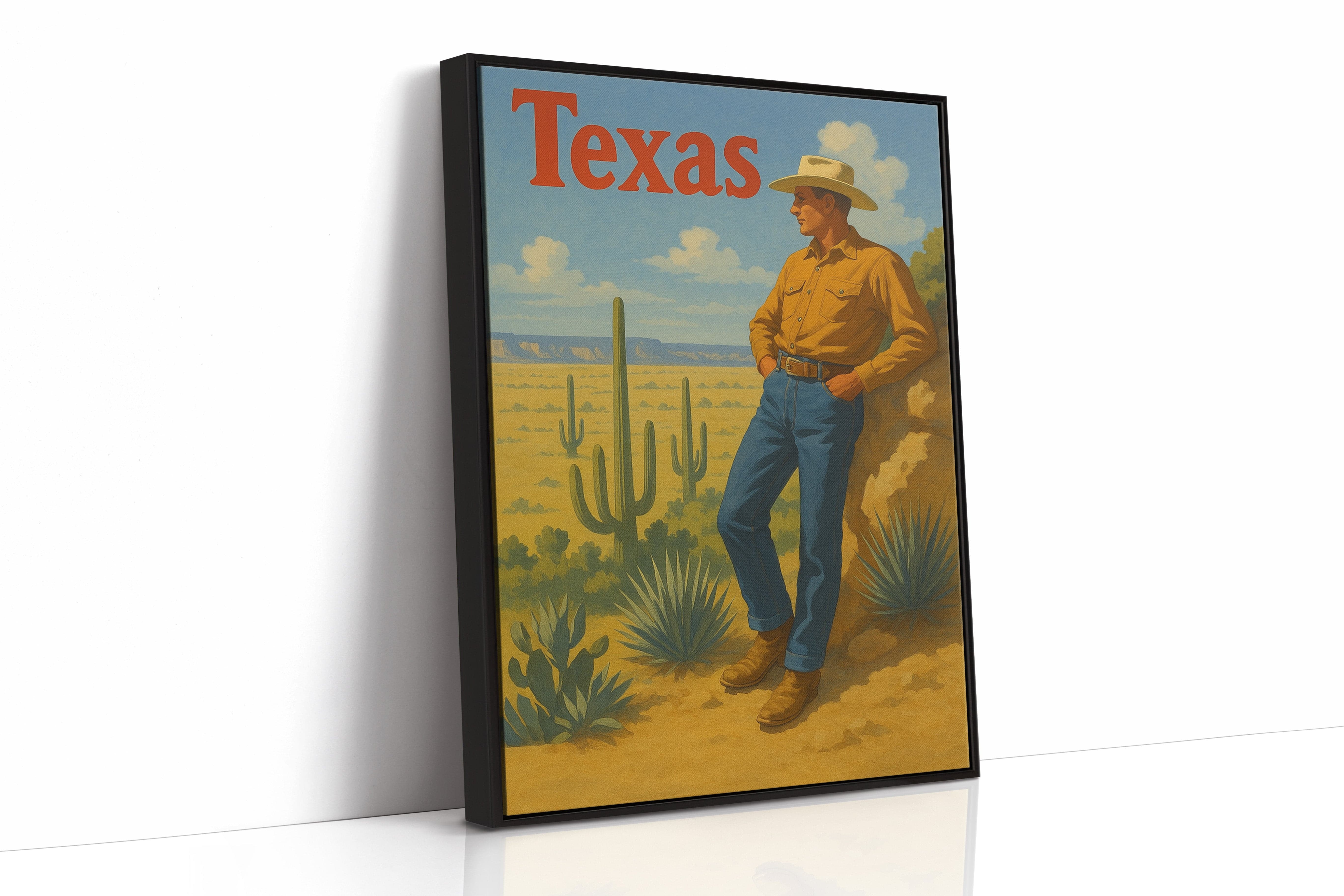 A nod to vintage travel posters, this artwork captures the quiet strength of a cowboy in the wild Texas desert. With golden earth, towering cacti, and endless sky, it tells a story of solitude, strength, and sun-scorched dreams. A timeless piece for lovers of the open road.