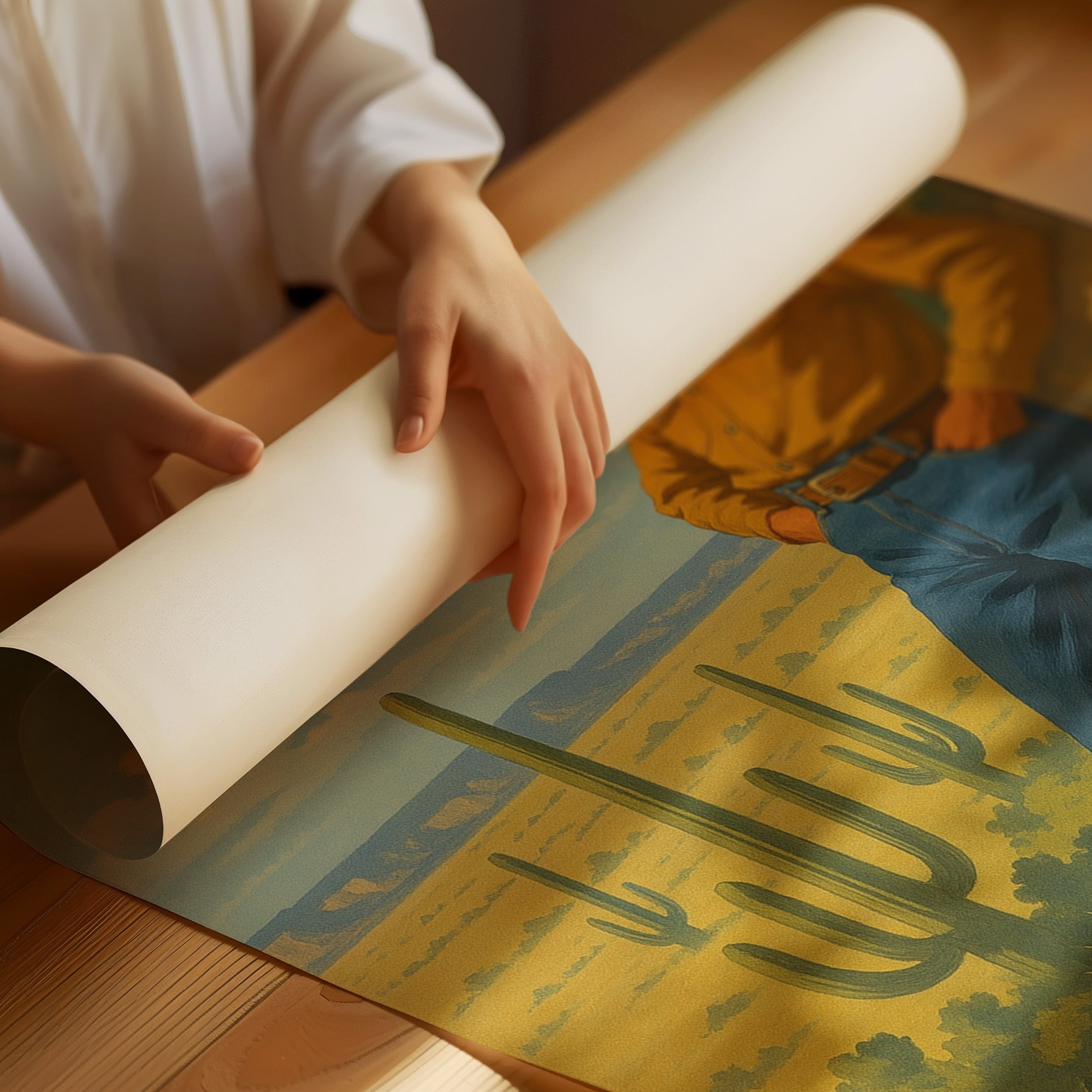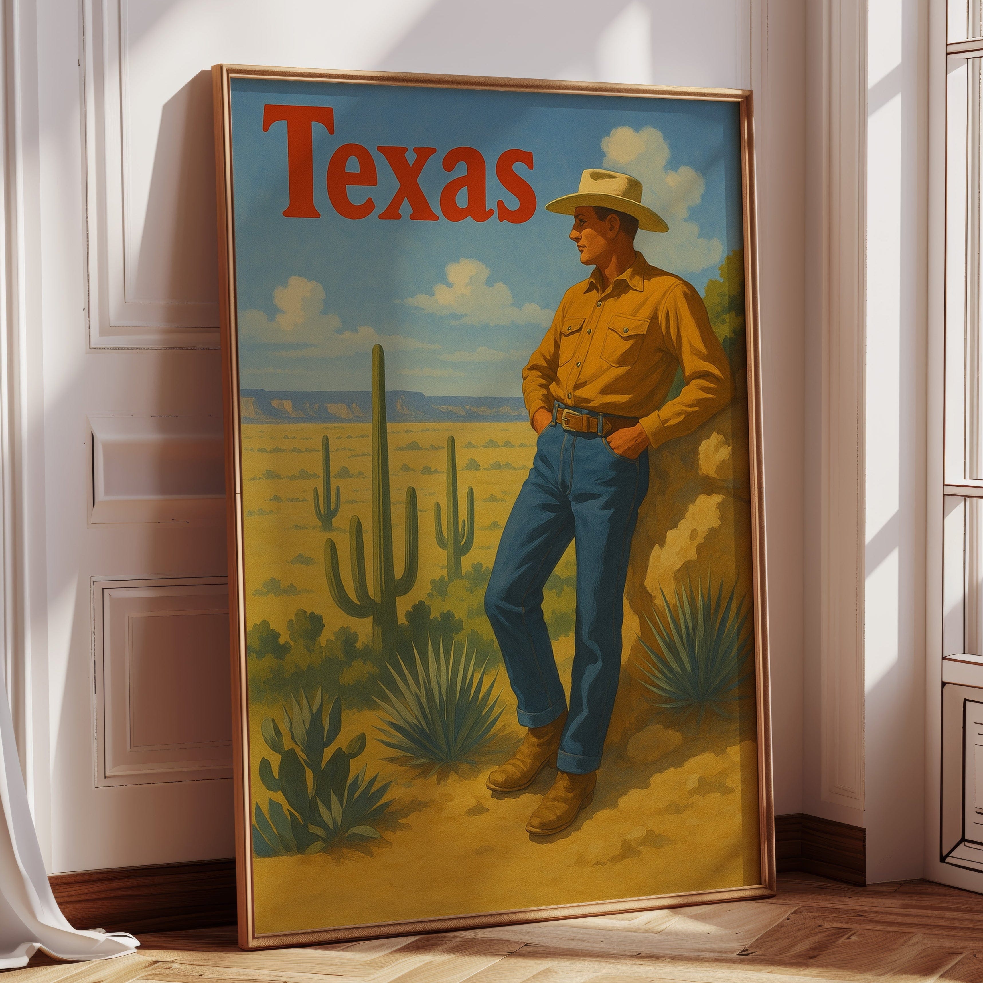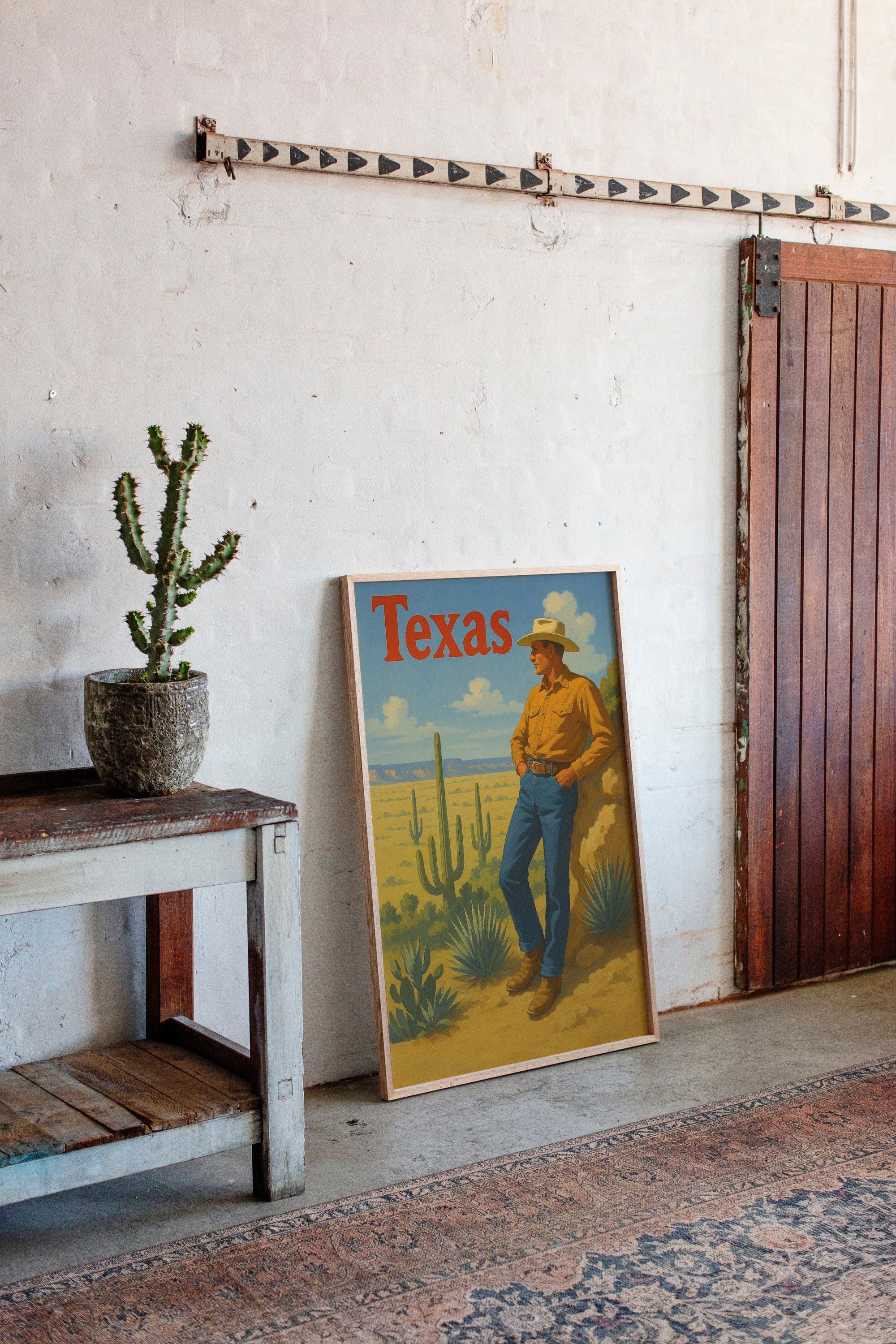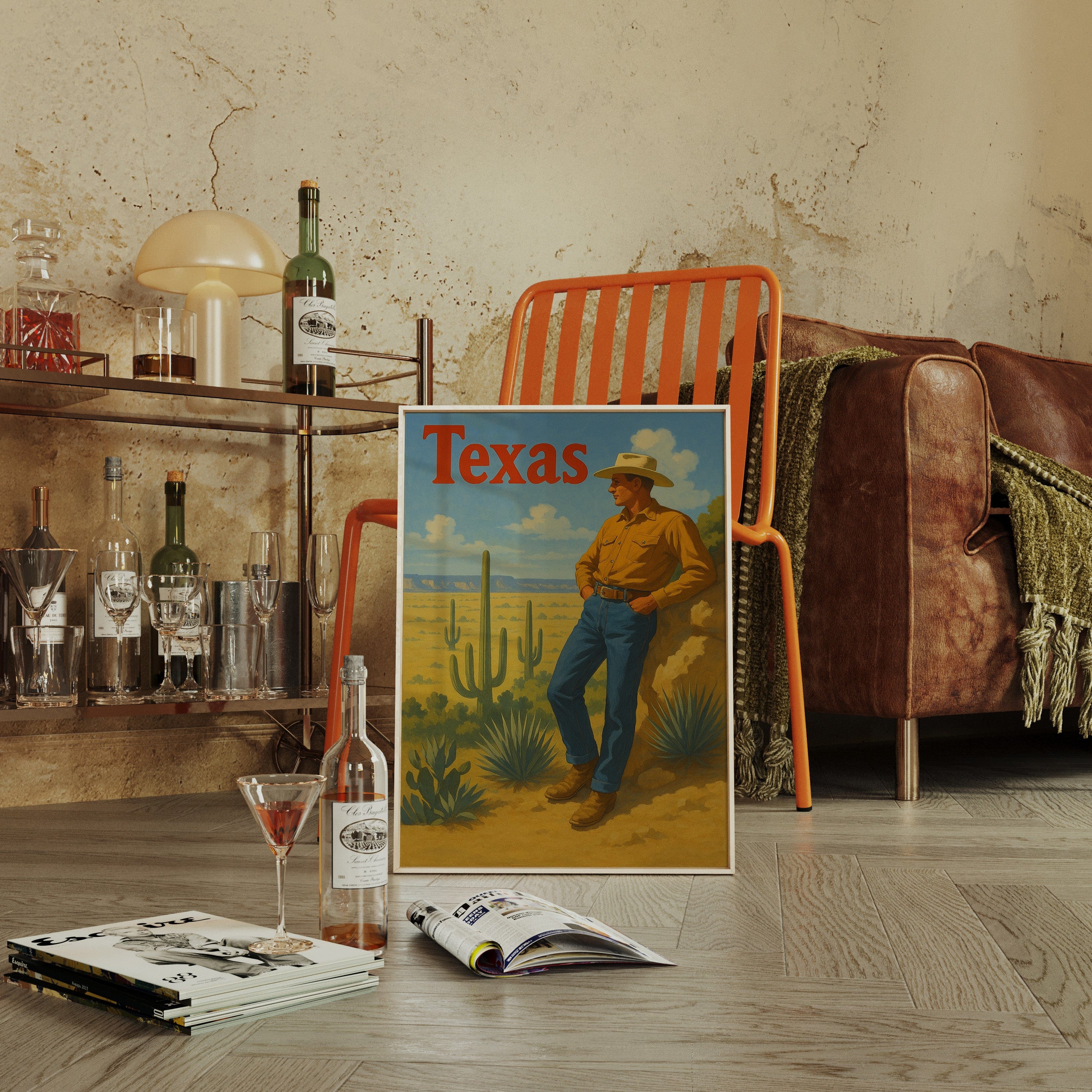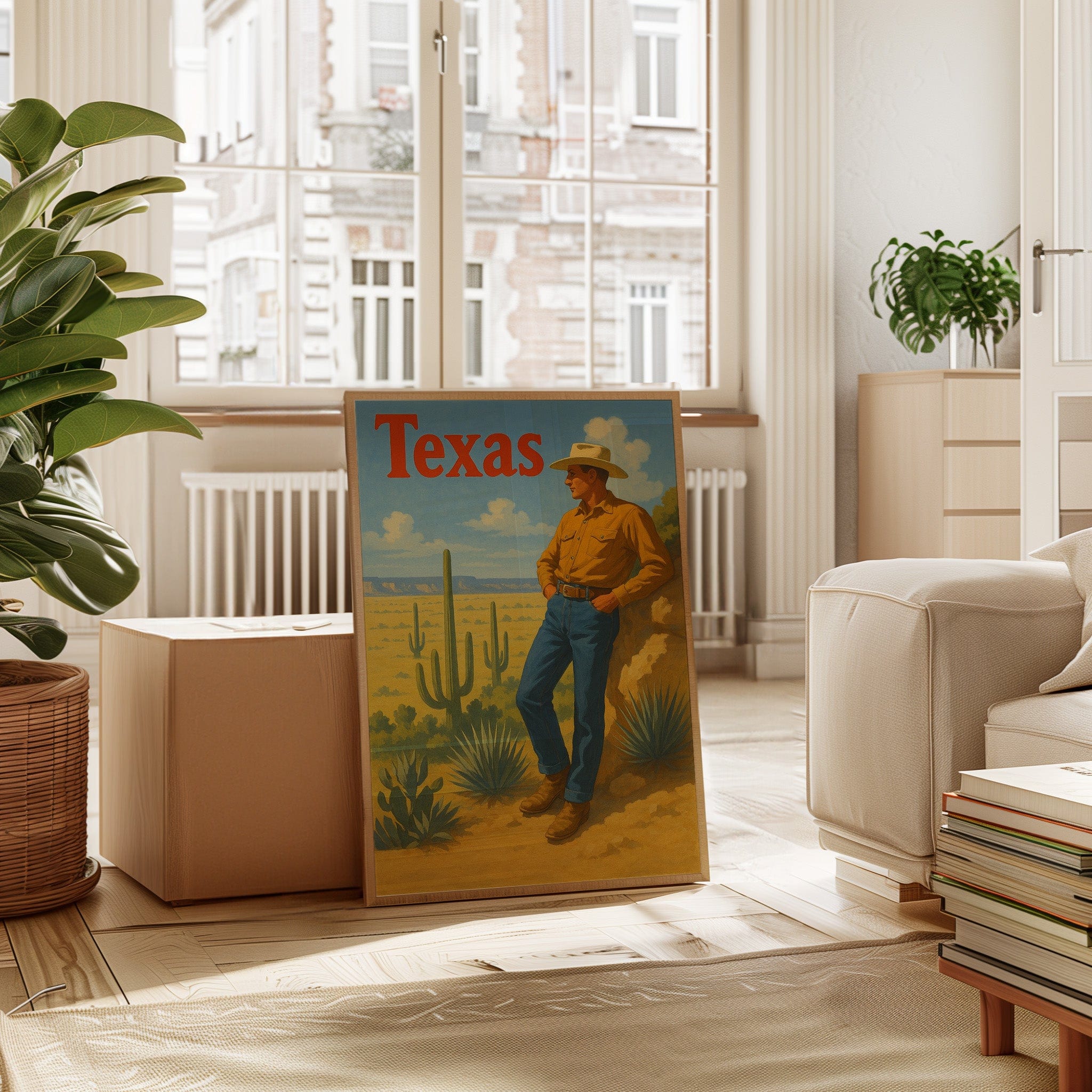 A nod to vintage travel posters, this artwork captures the quiet strength of a cowboy in the wild Texas desert. With golden earth, towering cacti, and endless sky, it tells a story of solitude, strength, and sun-scorched dreams. A timeless piece for lovers of the open road.
