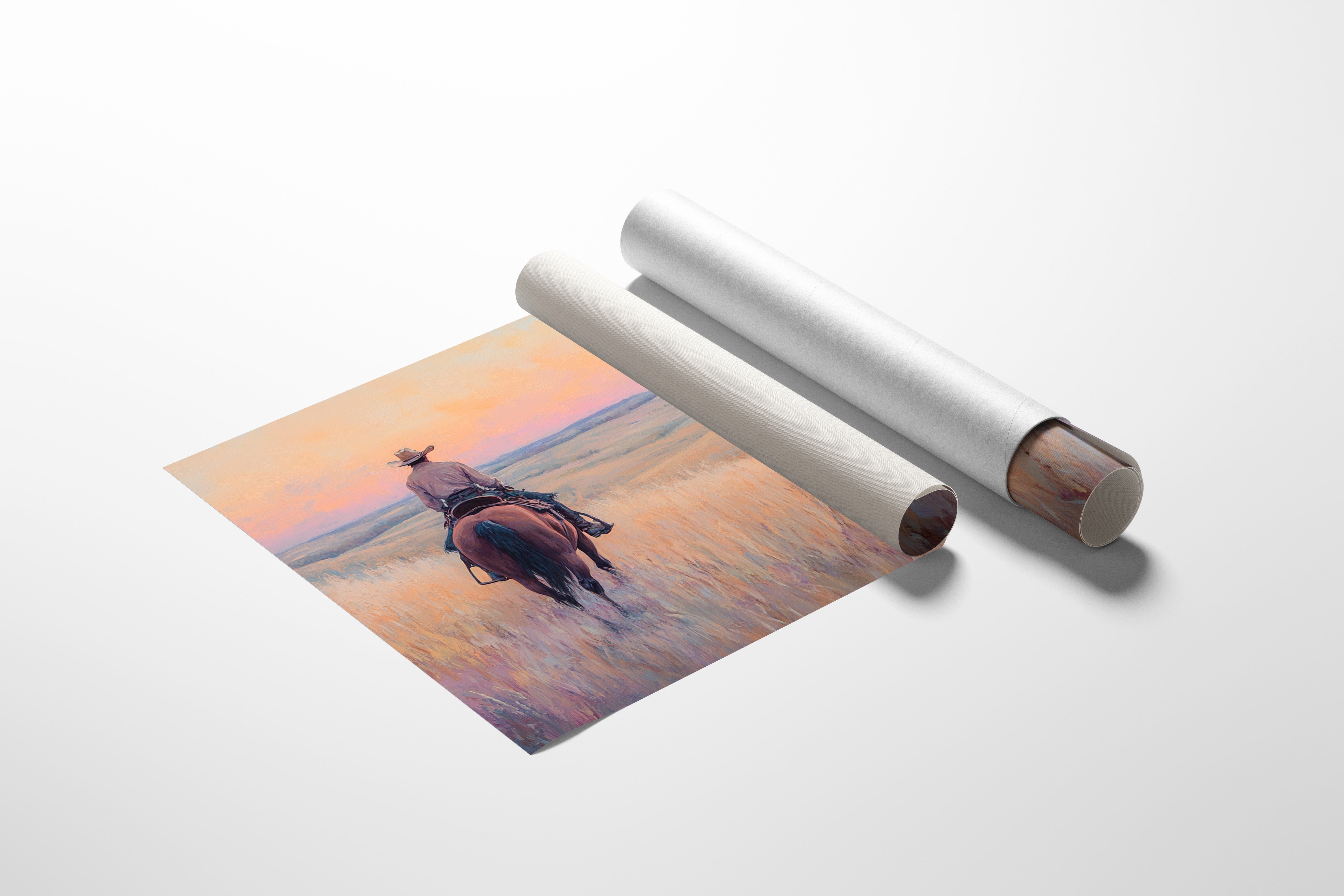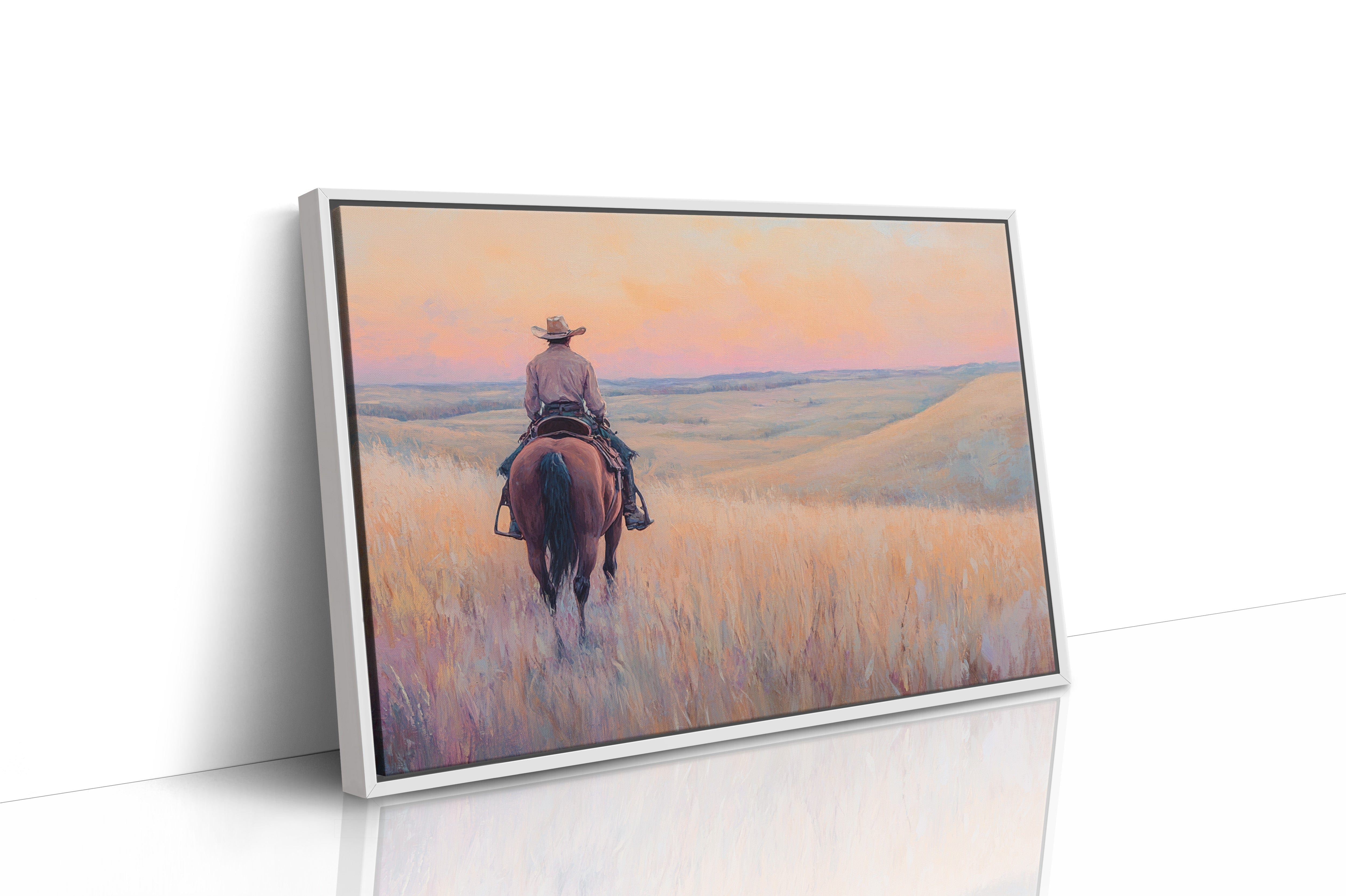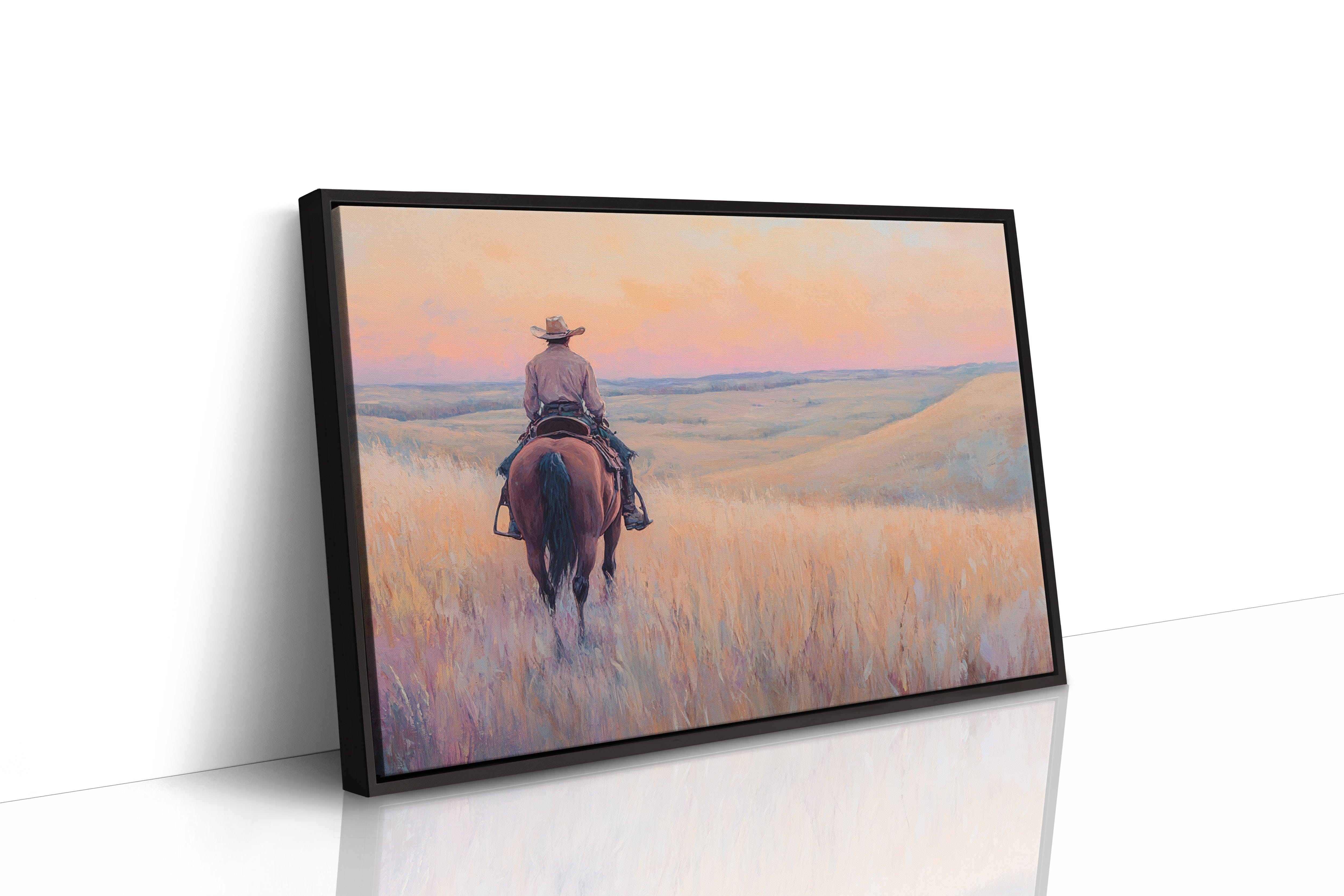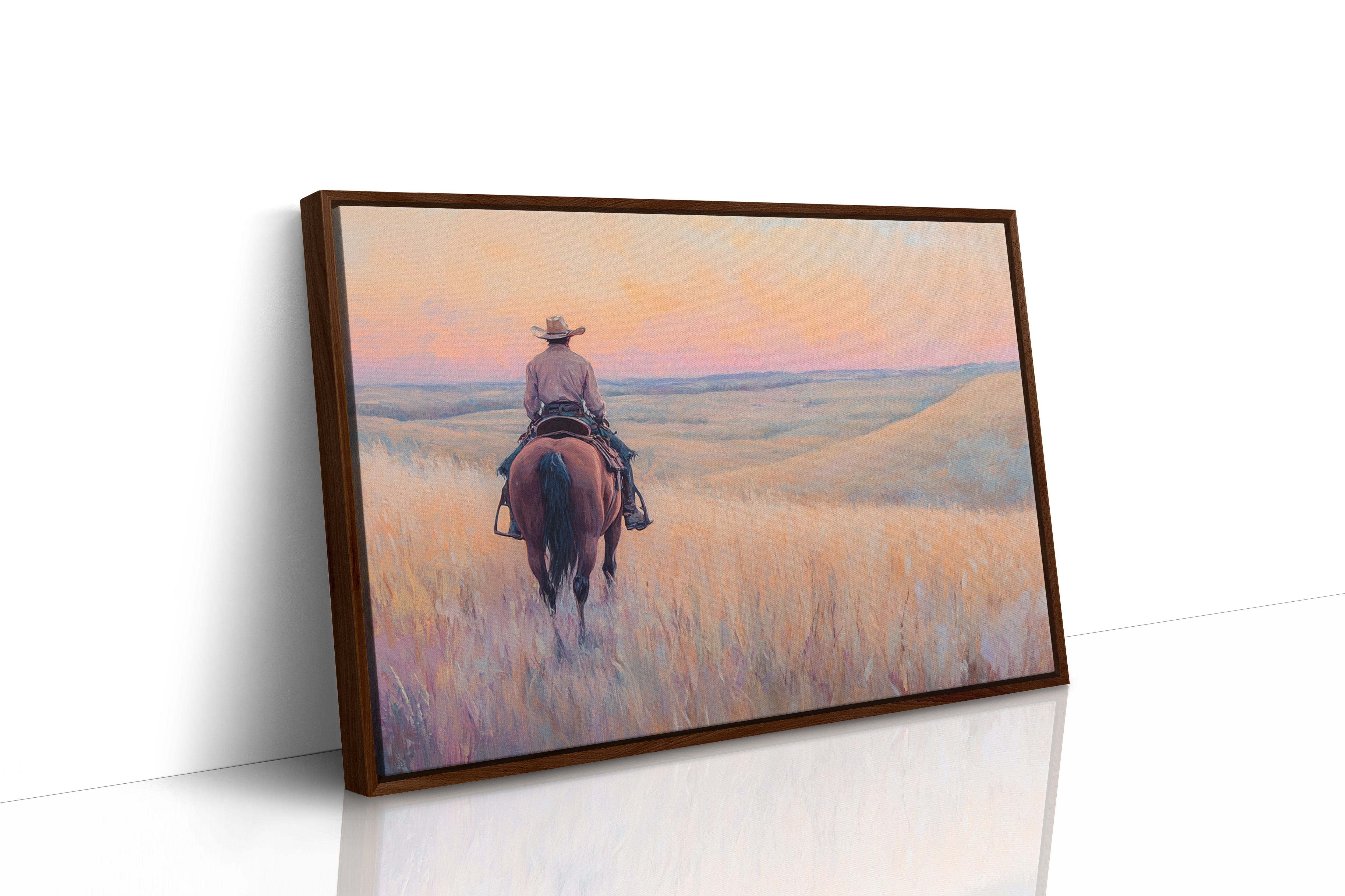 A cowboy rides into golden hills as dusk spills lavender and rose across the open prairie. This quiet moment captures the peace found in wide-open spaces and the sense of endless possibility on the horizon. A soulful tribute to the stillness of solitude and the pull of the West.
