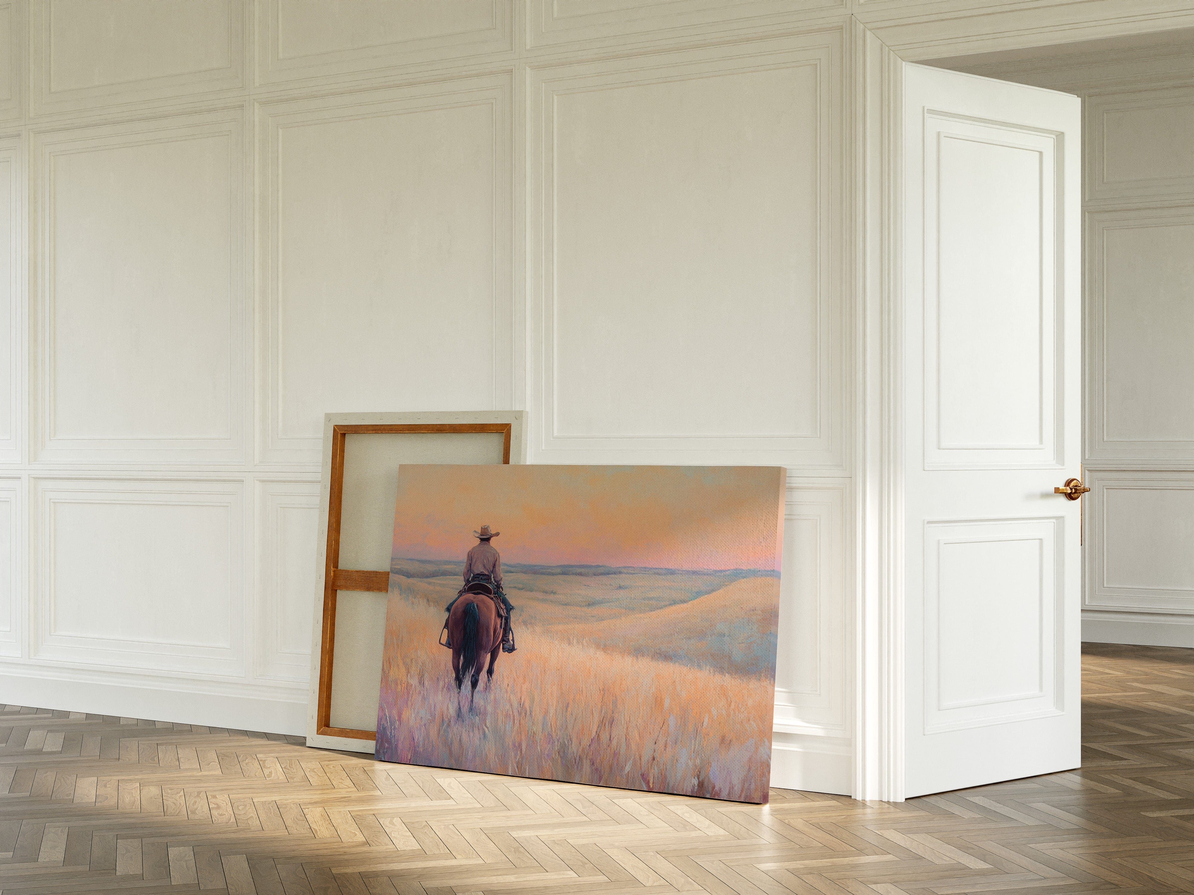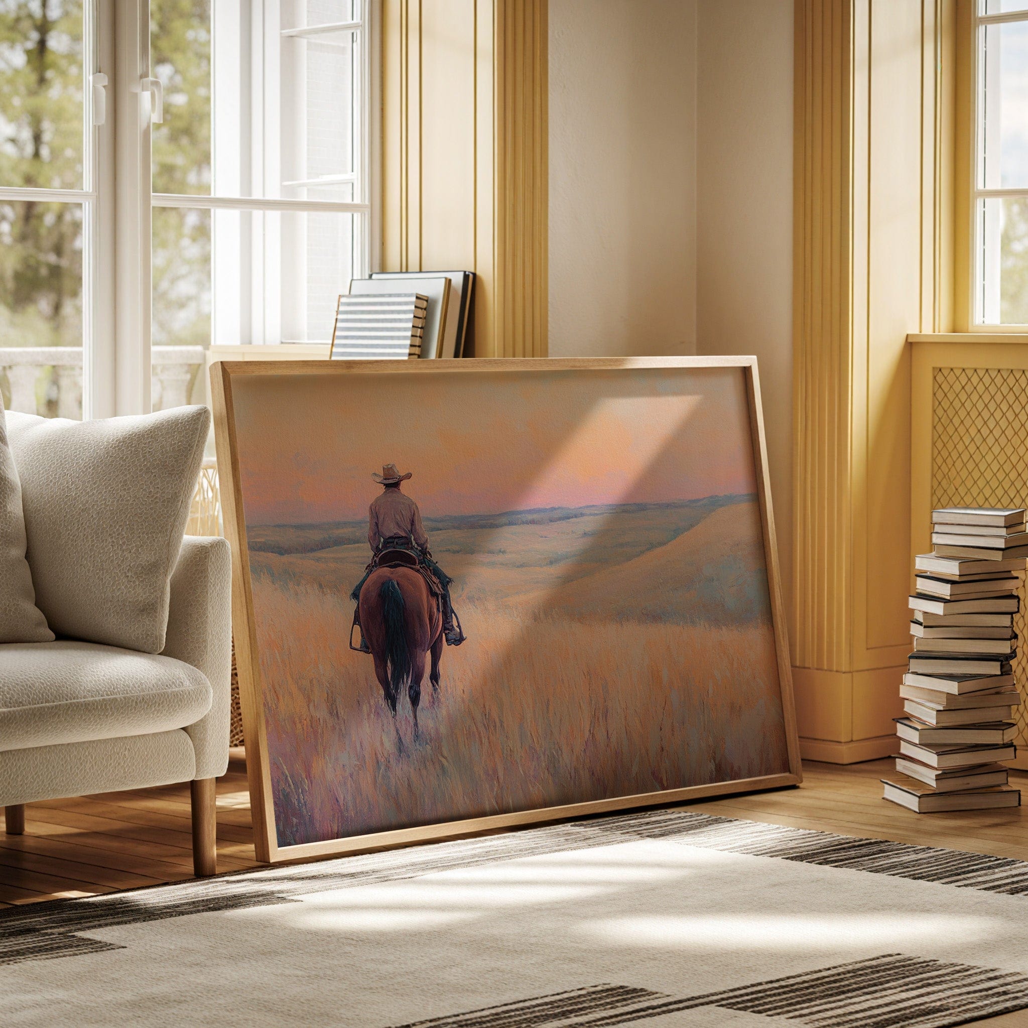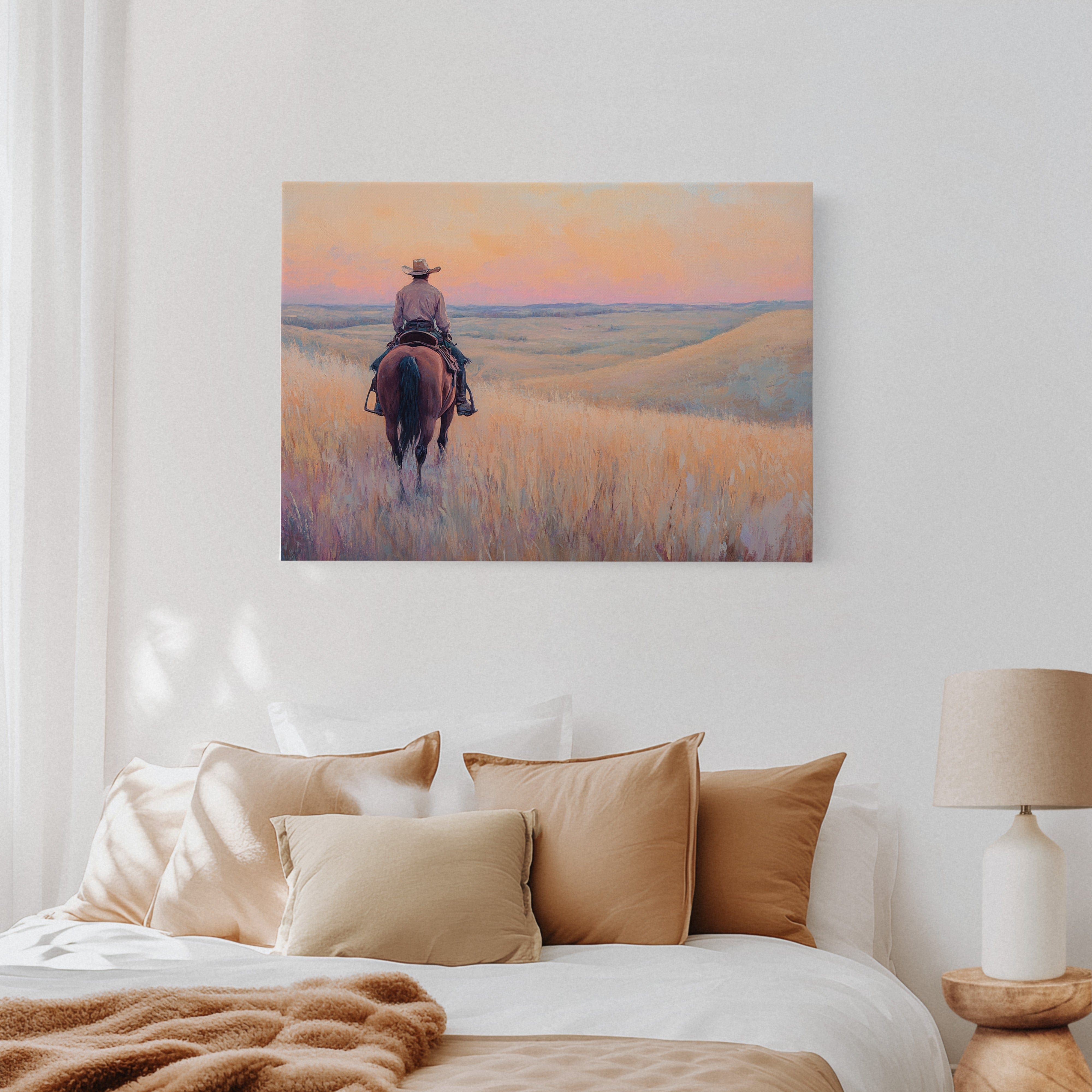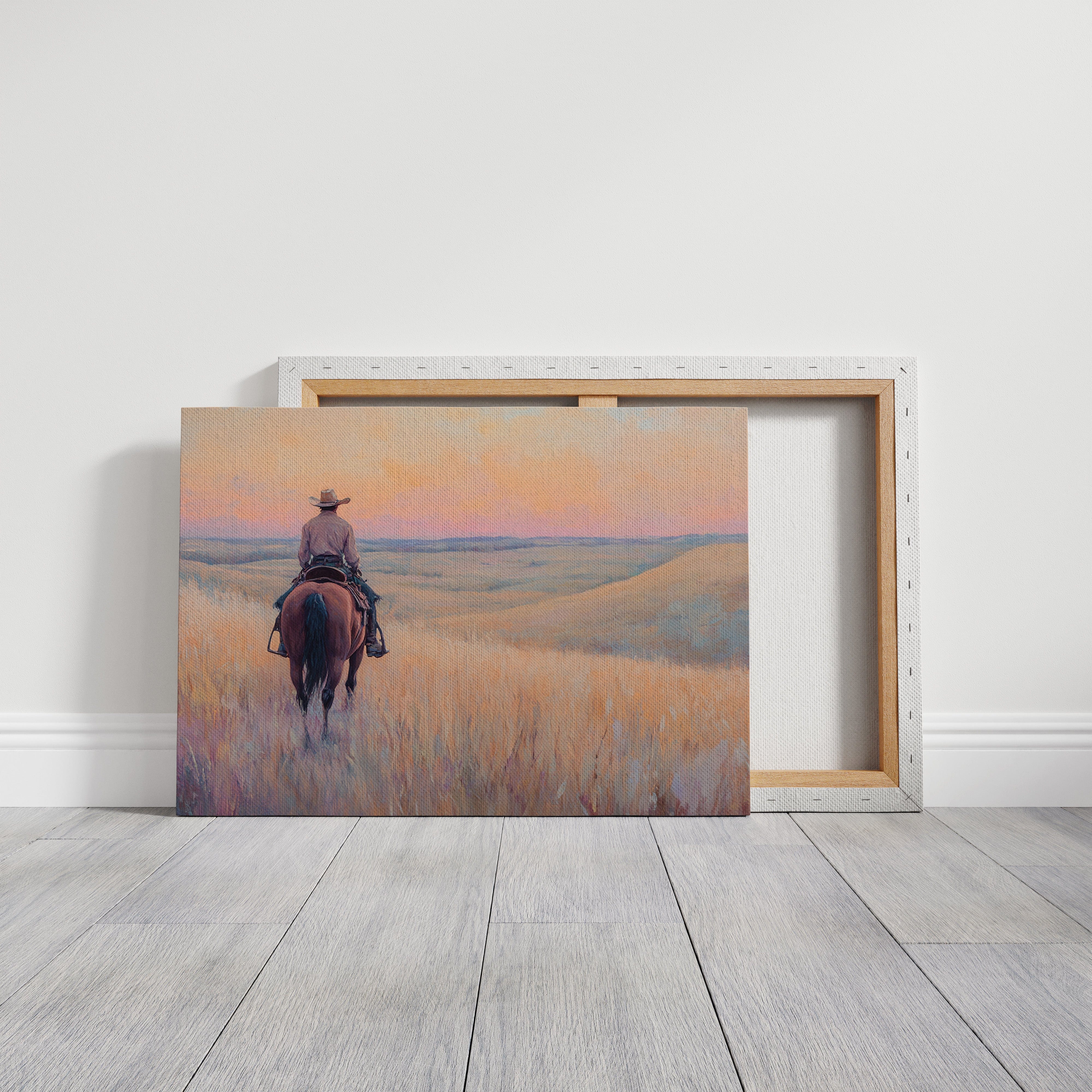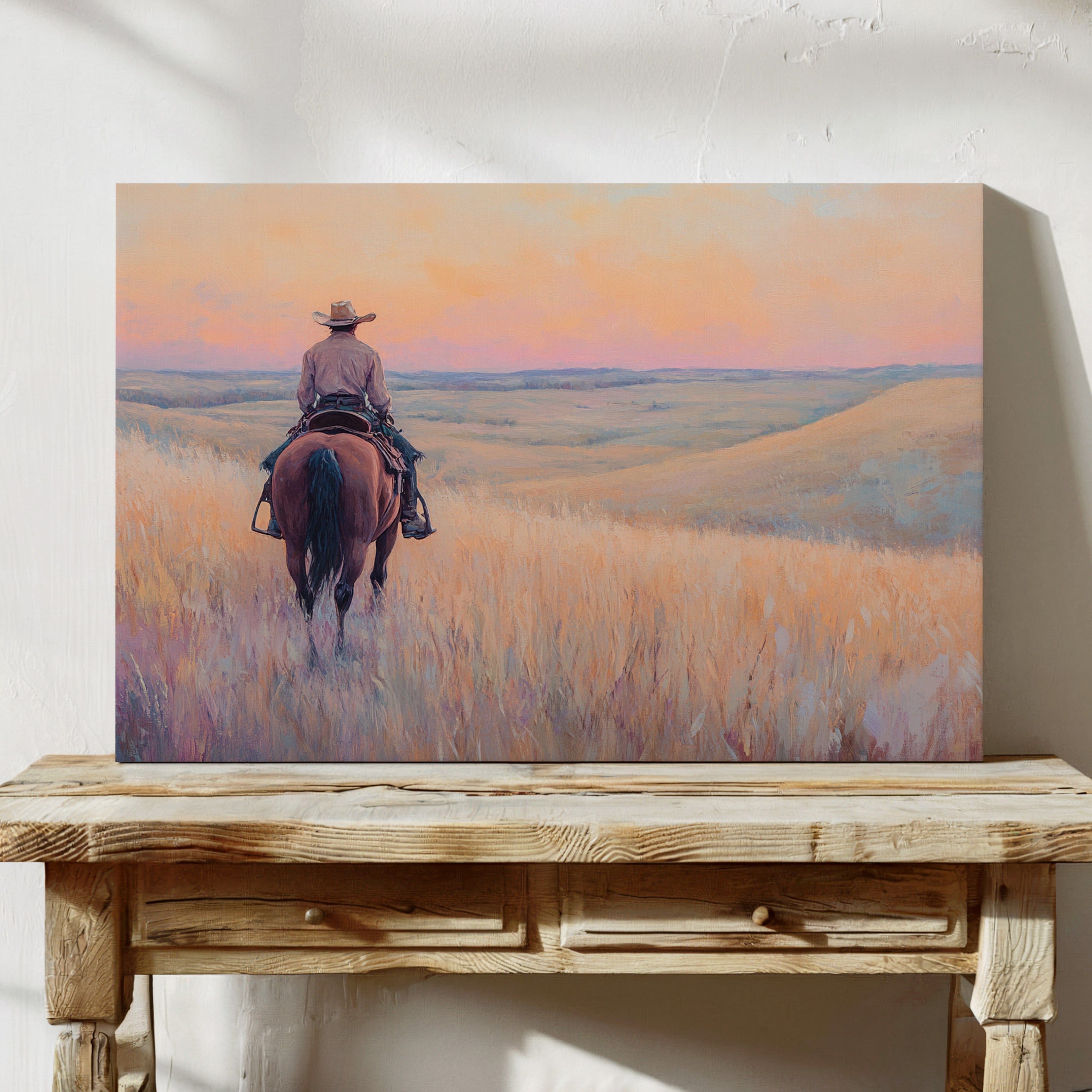 A cowboy rides into golden hills as dusk spills lavender and rose across the open prairie. This quiet moment captures the peace found in wide-open spaces and the sense of endless possibility on the horizon. A soulful tribute to the stillness of solitude and the pull of the West.