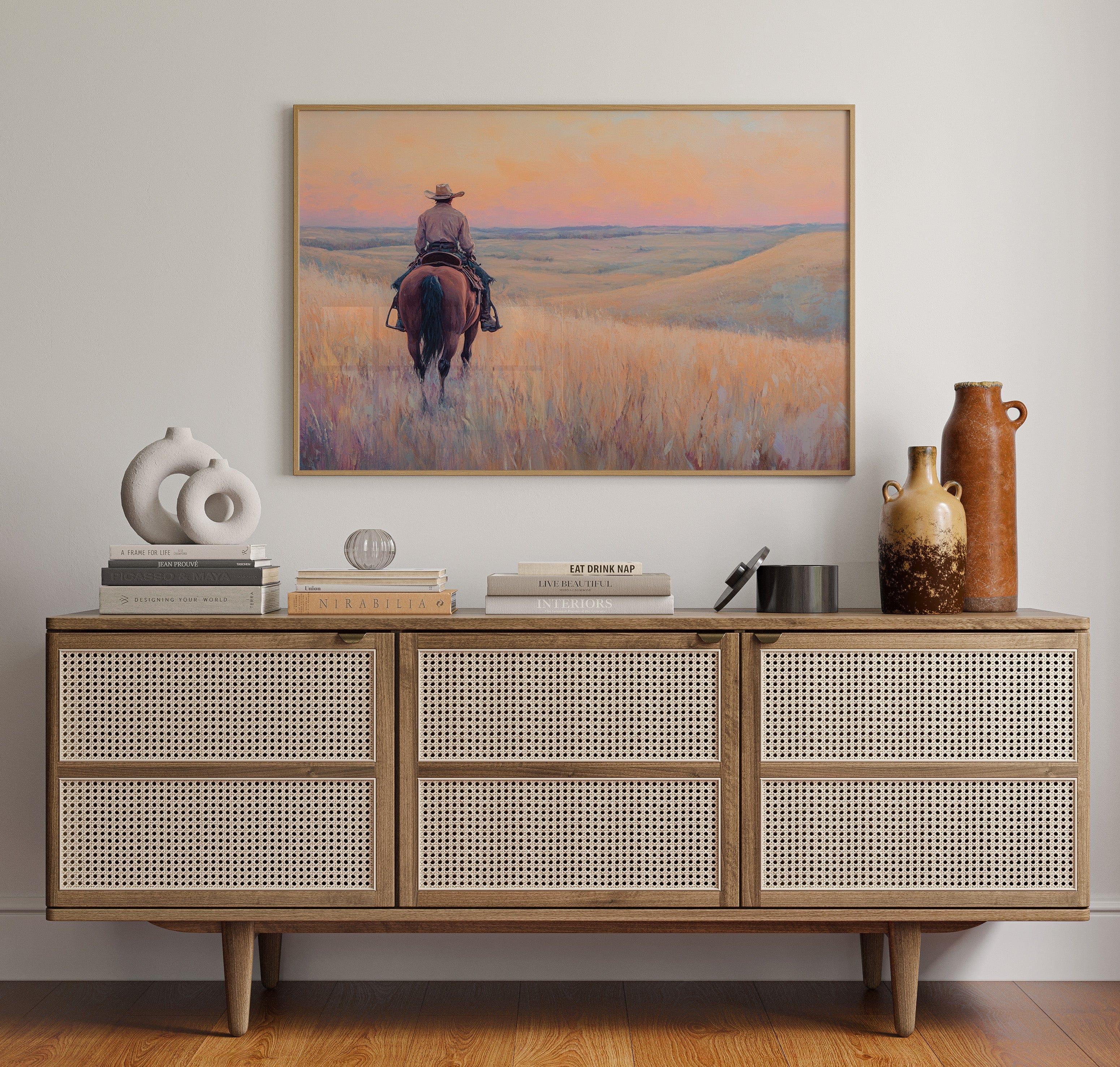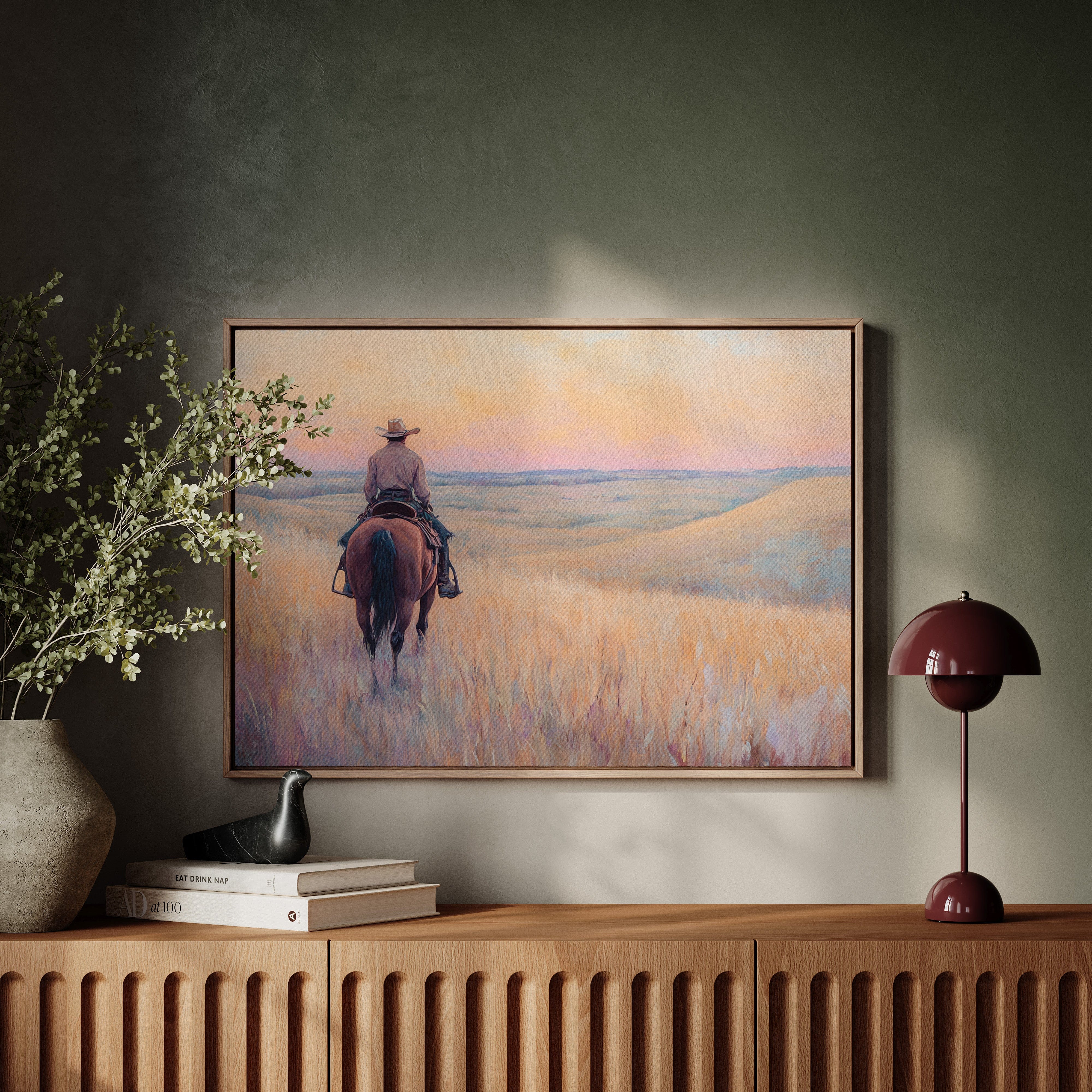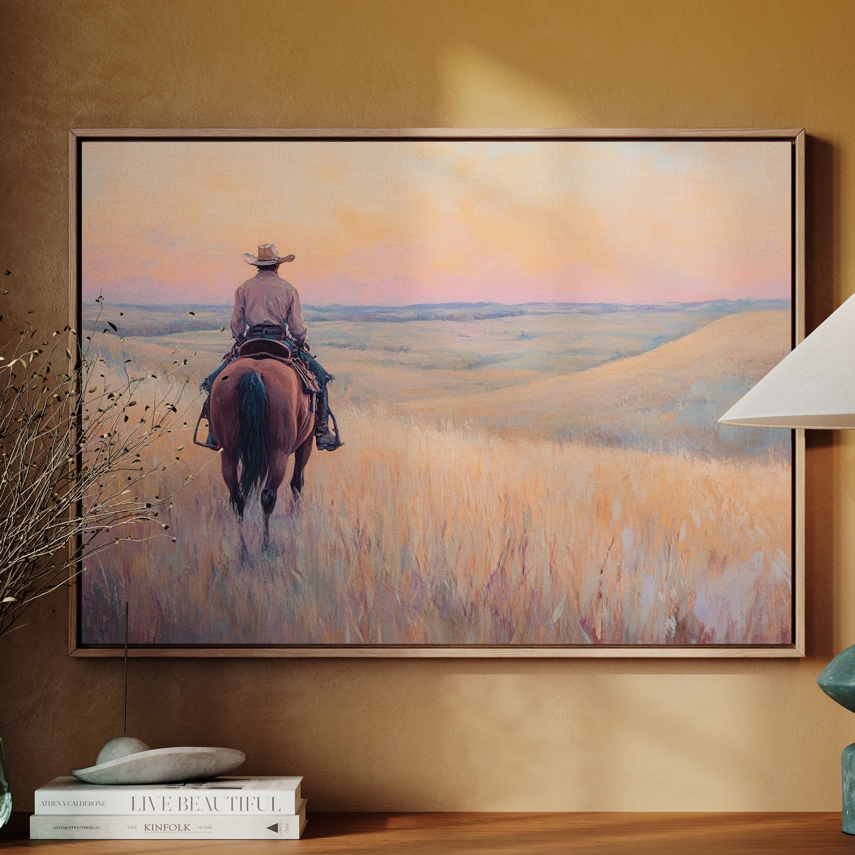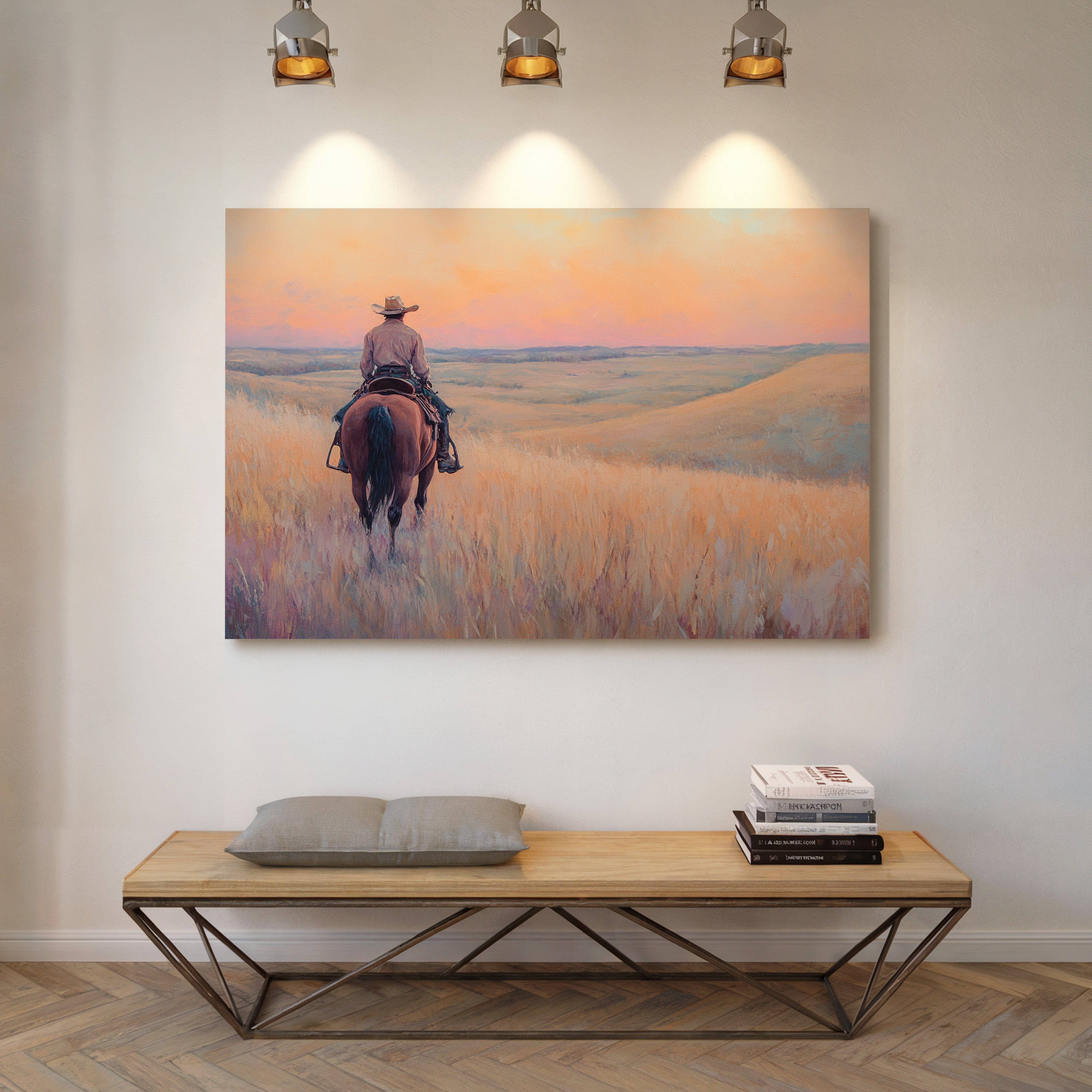 A cowboy rides into golden hills as dusk spills lavender and rose across the open prairie. This quiet moment captures the peace found in wide-open spaces and the sense of endless possibility on the horizon. A soulful tribute to the stillness of solitude and the pull of the West.
