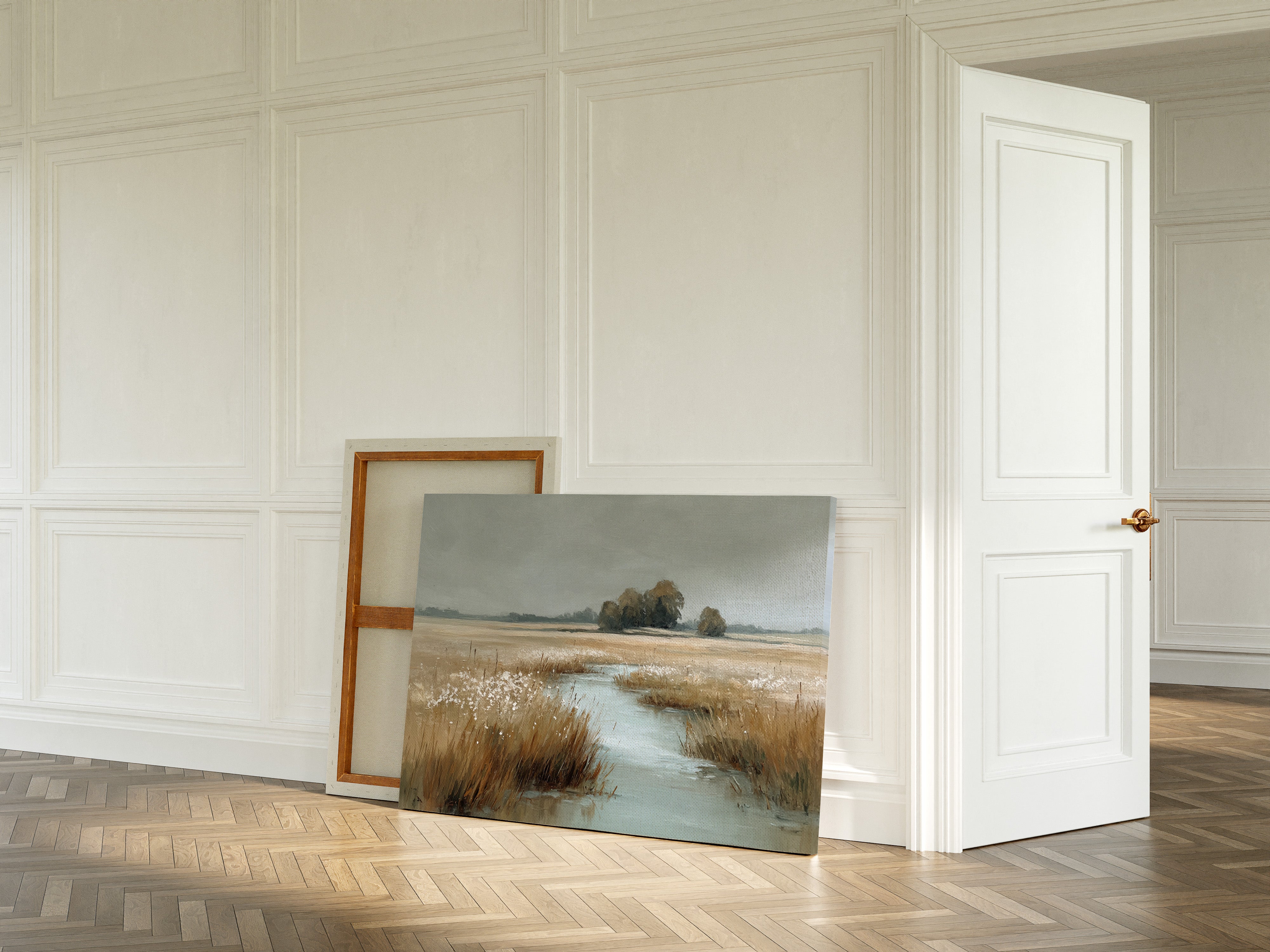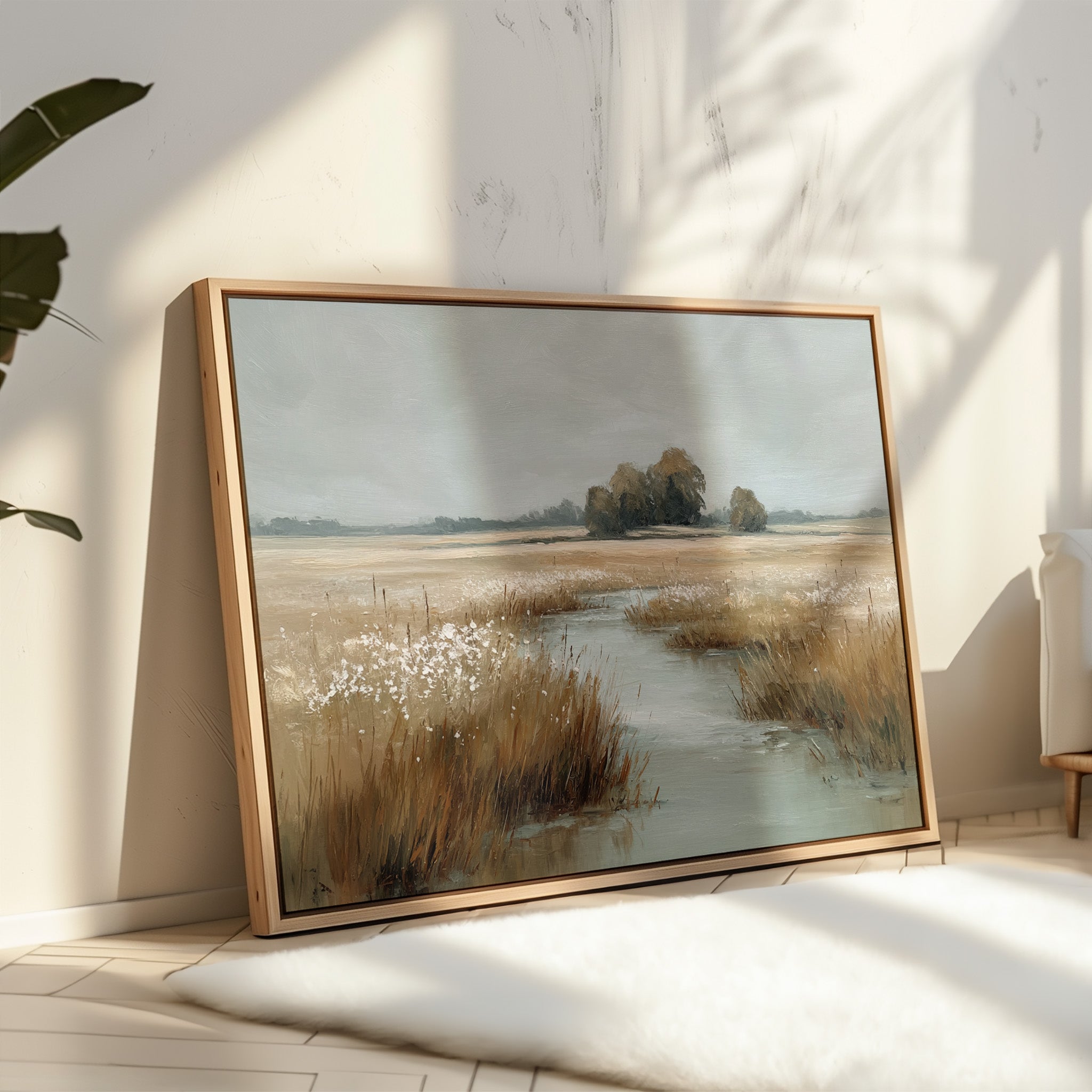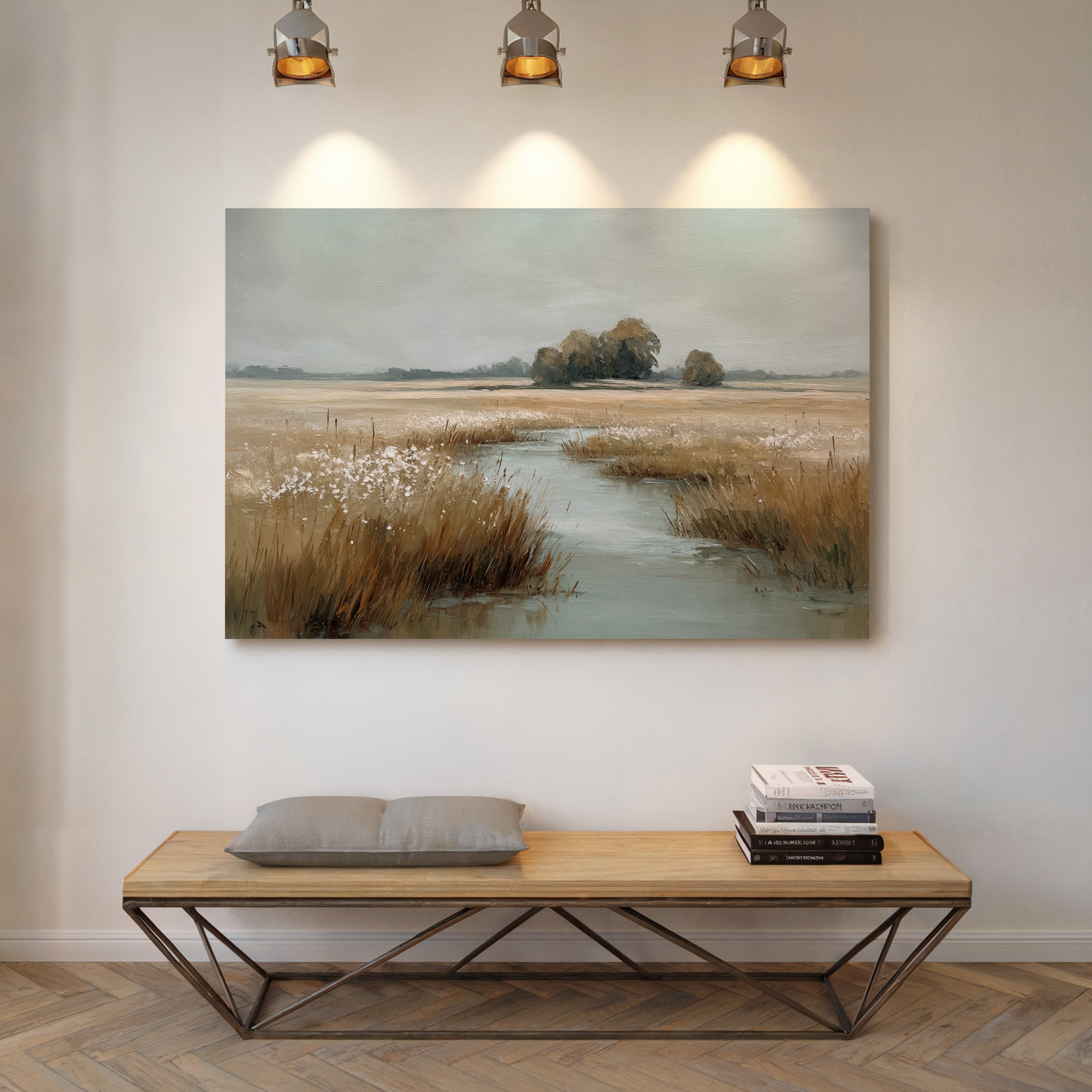 In the soft embrace of twilight, a gentle stream weaves through golden grasses, whispering secrets of the earth. This piece belongs to the 'Artisanal' collection, where nature's simplicity takes center stage. The muted palette of earthy tones and delicate whites evokes a sense of tranquility, as the landscape breathes in harmonious rhythm with the shifting clouds above. Ideal for a serene living room or a peaceful reading nook, this scene invites reflection and calm.