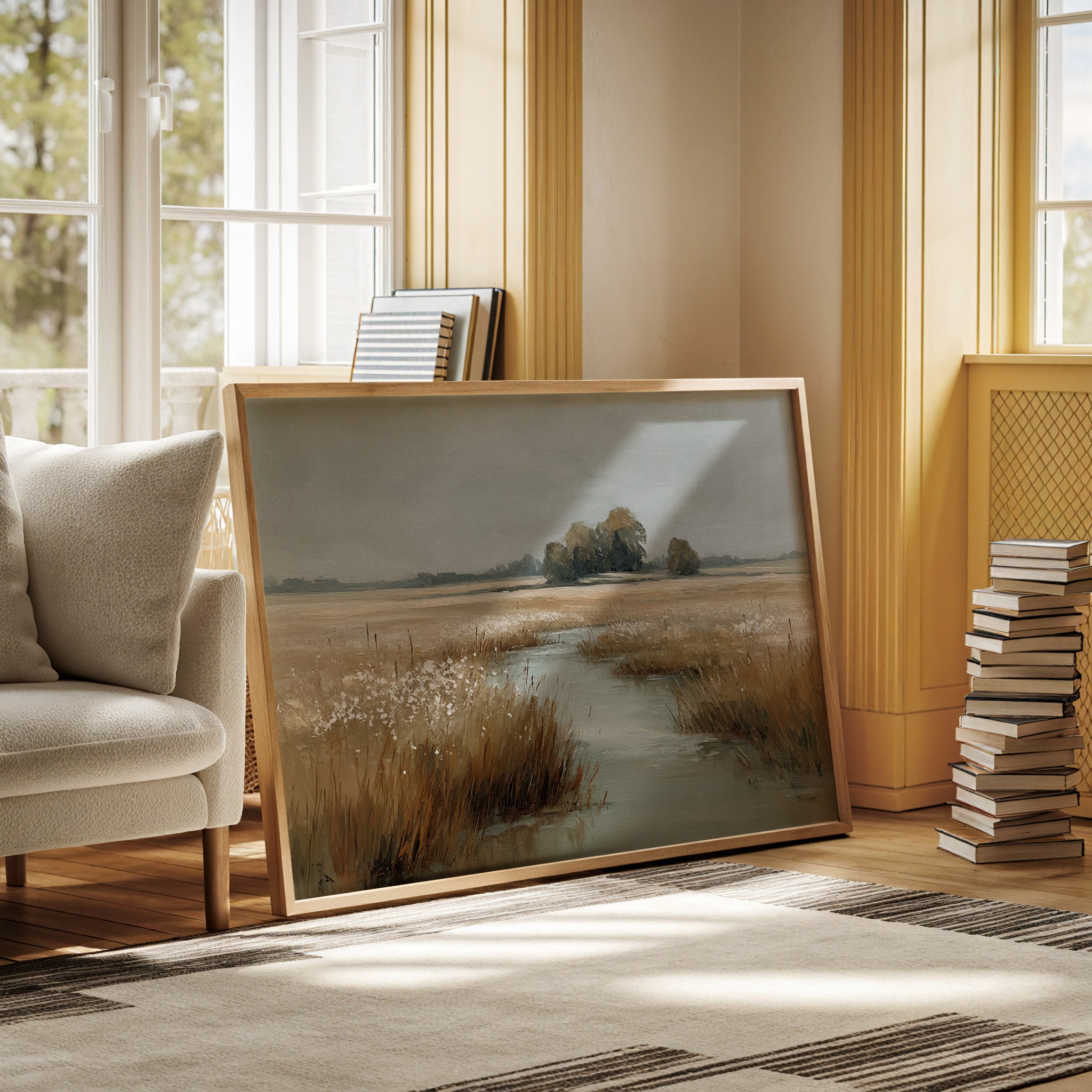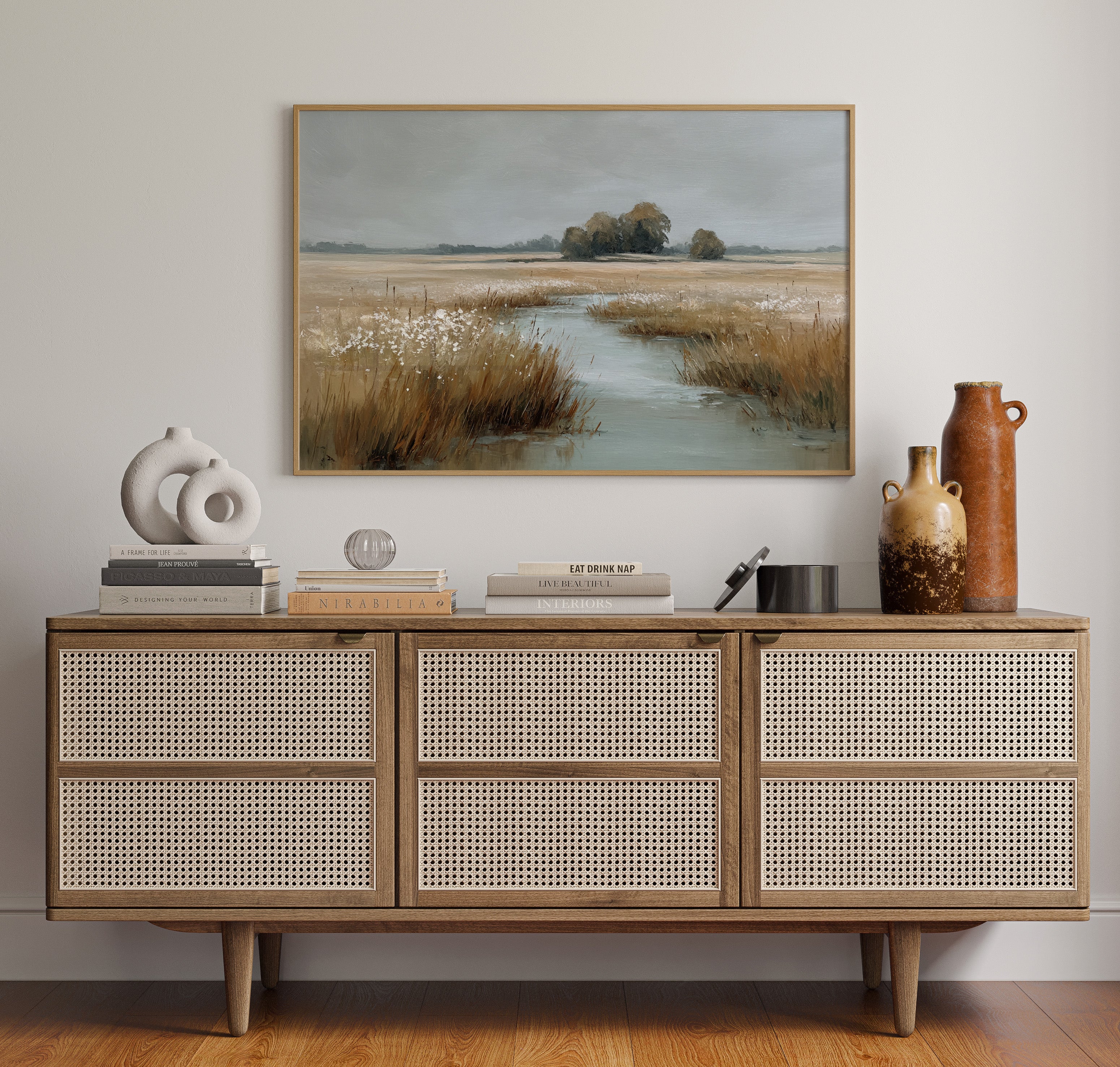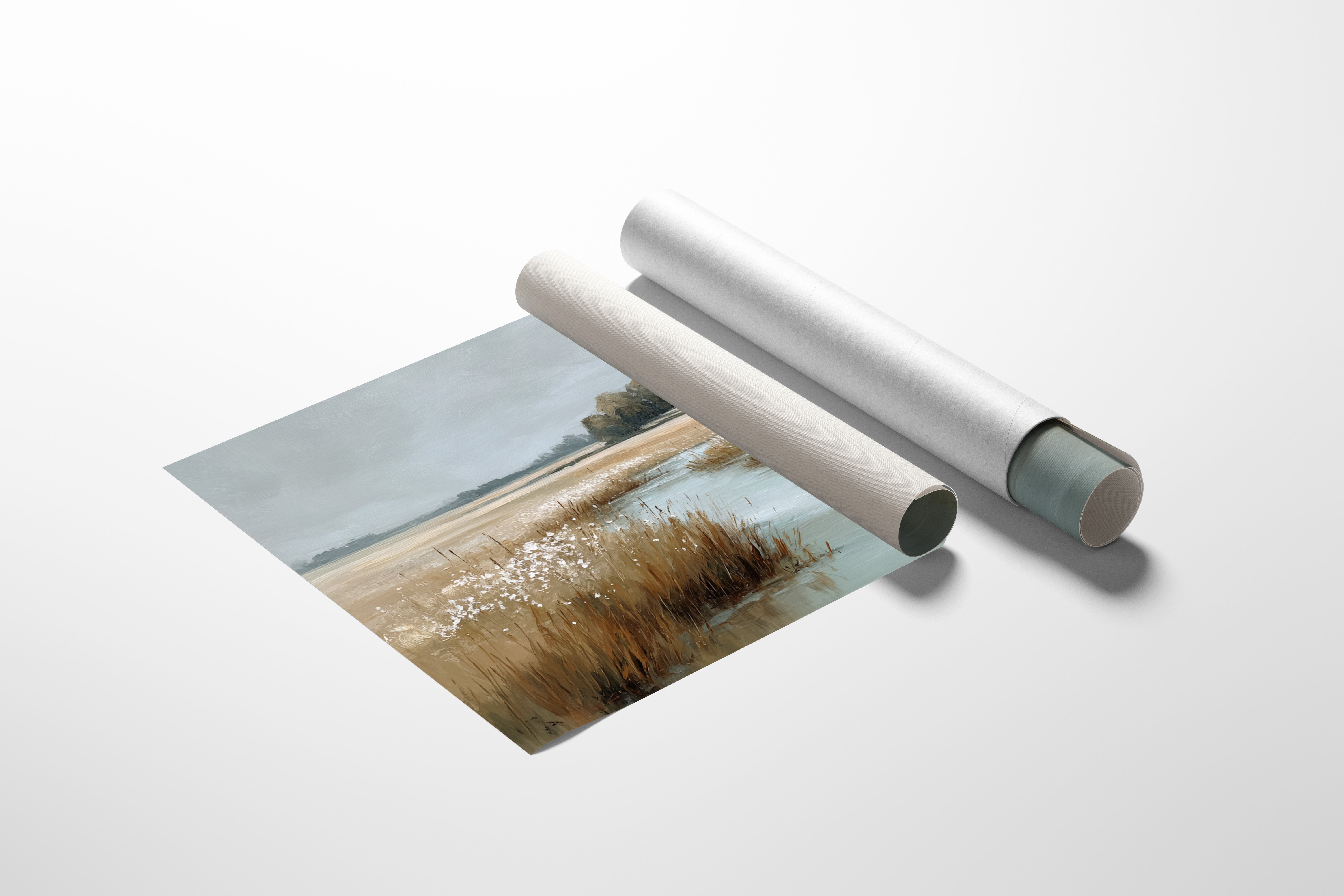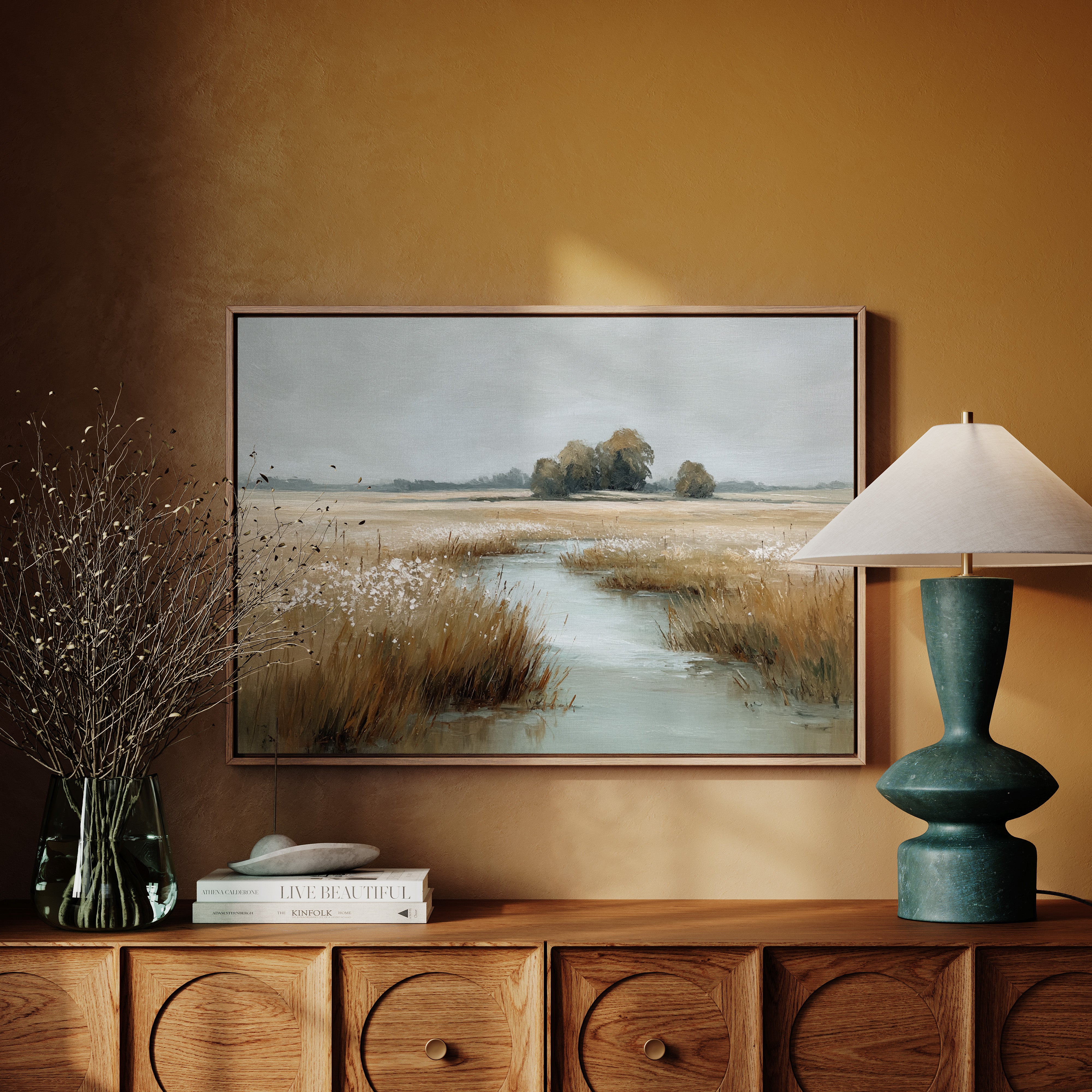 In the soft embrace of twilight, a gentle stream weaves through golden grasses, whispering secrets of the earth. This piece belongs to the 'Artisanal' collection, where nature's simplicity takes center stage. The muted palette of earthy tones and delicate whites evokes a sense of tranquility, as the landscape breathes in harmonious rhythm with the shifting clouds above. Ideal for a serene living room or a peaceful reading nook, this scene invites reflection and calm.