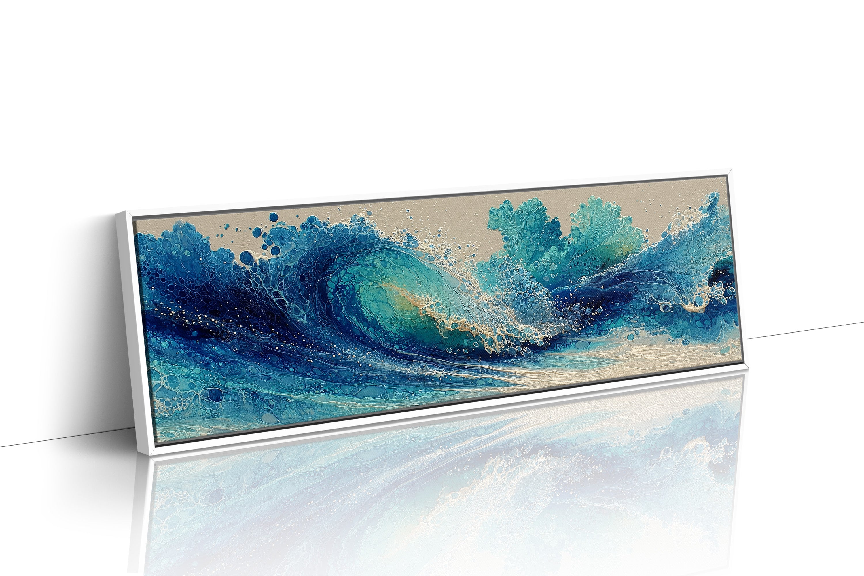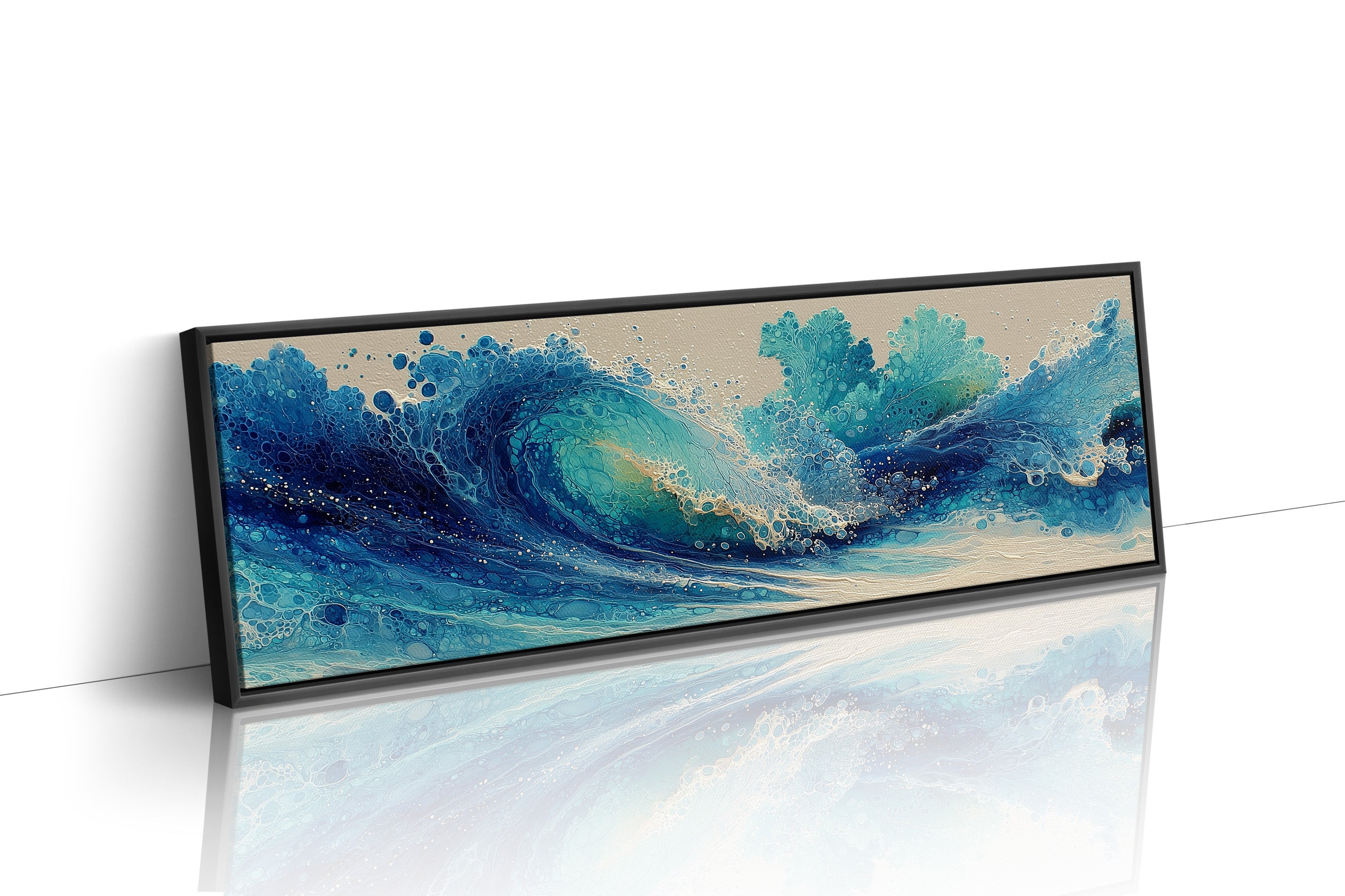 A surge of sapphire and turquoise curls forward in a rush of foam and light, capturing the restless rhythm of the sea in vivid, fluid detail. Part of our Coastal collection, this abstract wave composition brings movement and freshness to beach homes, bathrooms, living rooms, or any space craving the energy and calm of open water.