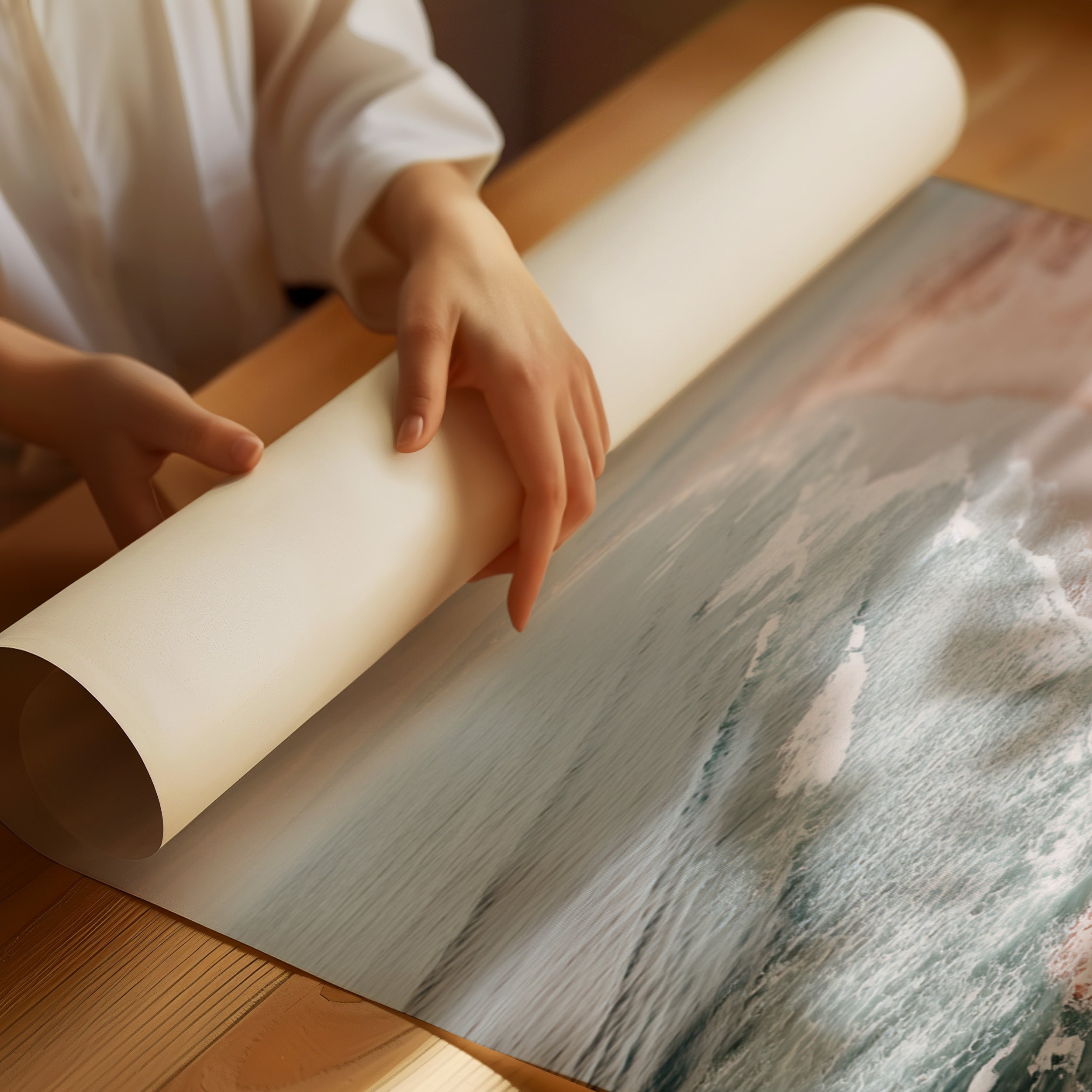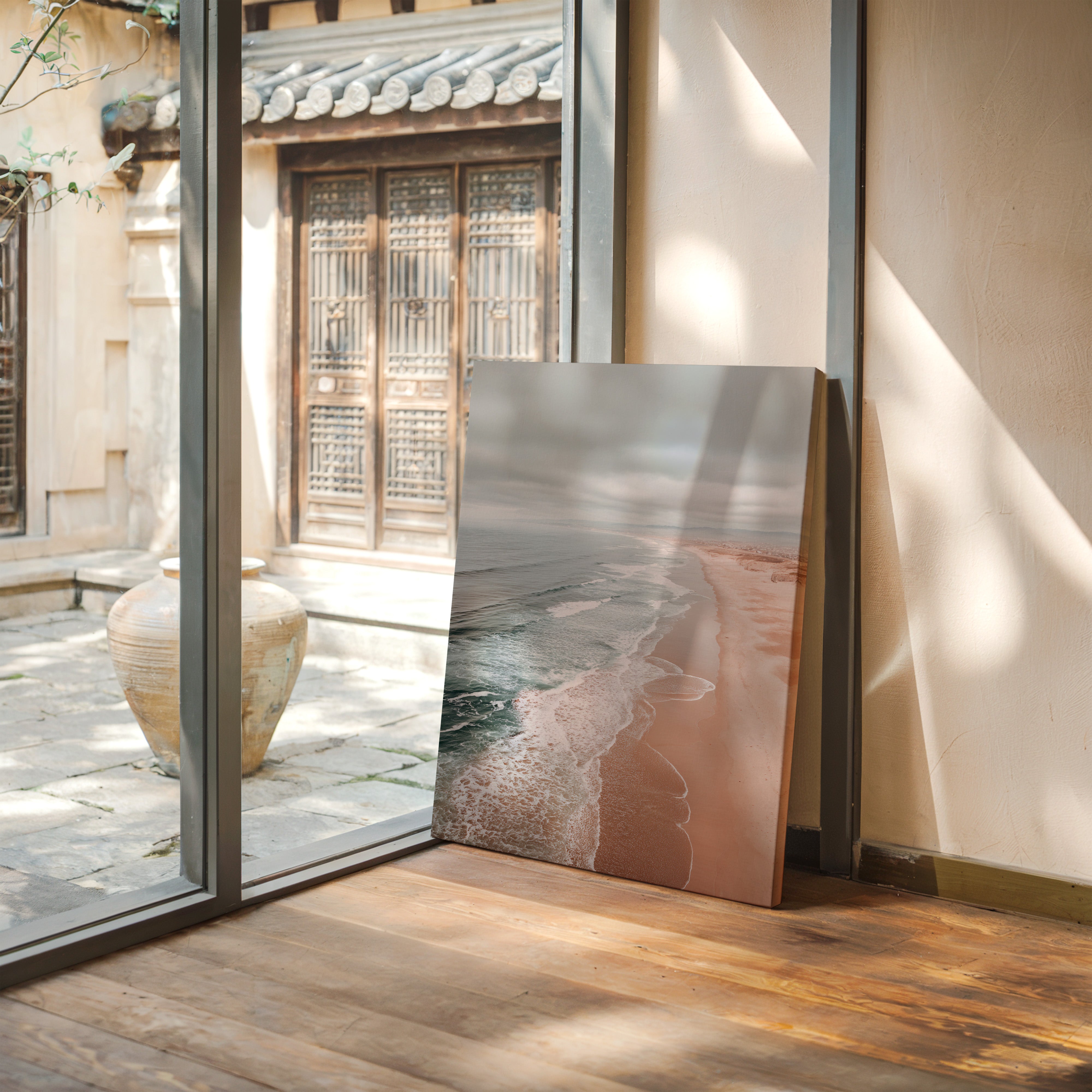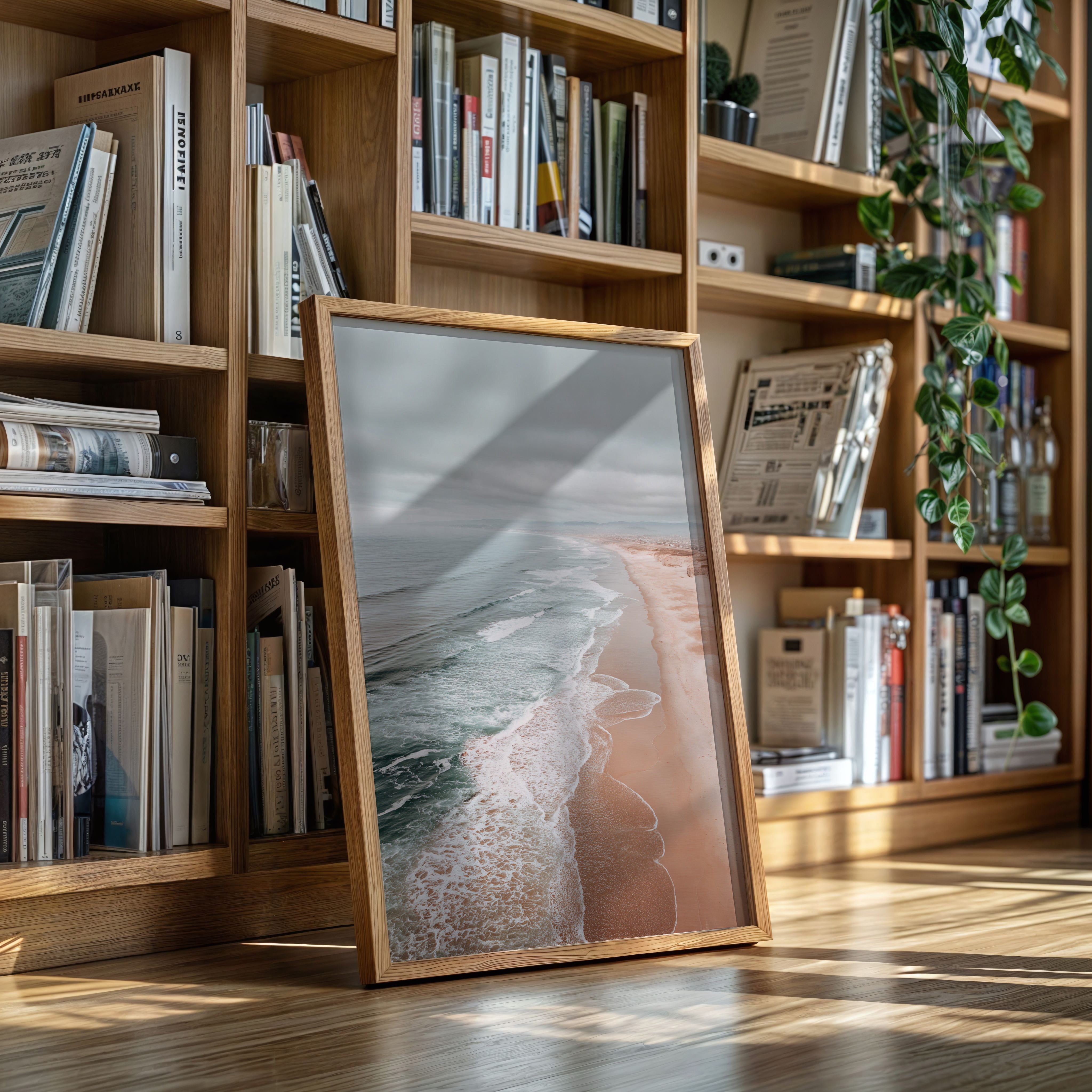 A gentle caress of surf meets sand, as the ocean breathes softly against the shore. This piece captures the serene beauty of a coastline, inviting tranquility into your space. The muted hues of seafoam greens and warm sandy tones dance together, reflecting a moment where natures artistry unfolds. Ideal for a serene bedroom or a calming living area, this artwork brings the essence of coastal serenity indoors.