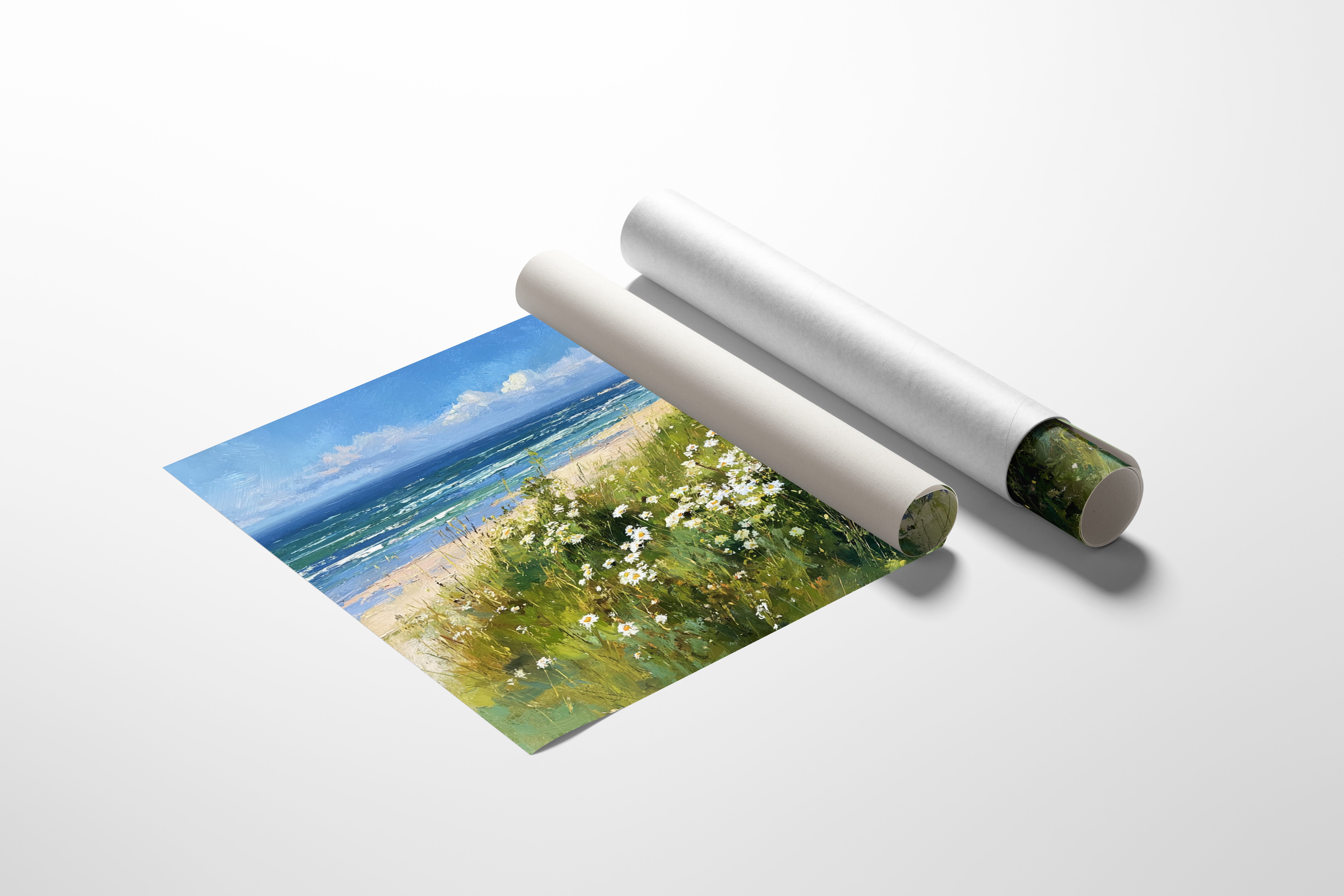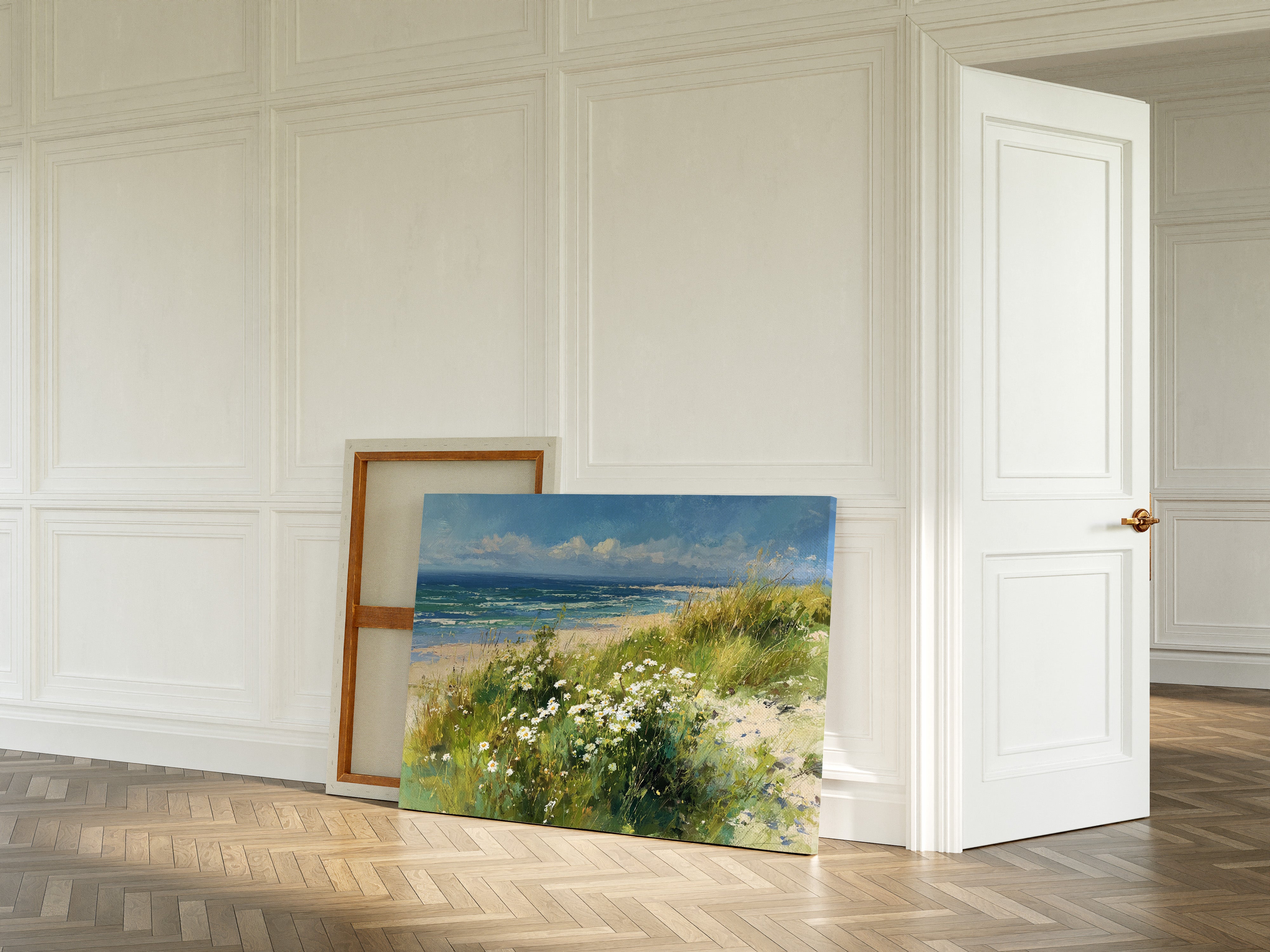 Under the vast canopy of blue, a gentle breeze stirs the wildflowers, their petals dancing in rhythm with the sea. This piece captures the essence of nature's embrace, a serene moment where land and ocean intertwine. Lush greens and vibrant whites pop against the deep azure, inviting the viewer to explore the tranquil shore where beauty abounds. Ideal for a sunlit living room or a cozy reading nook, this piece brings the warmth of coastal bliss into your home.