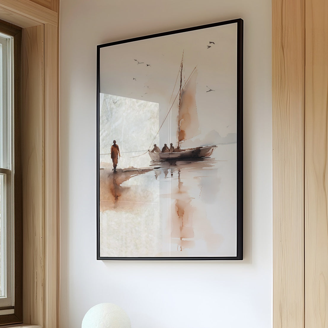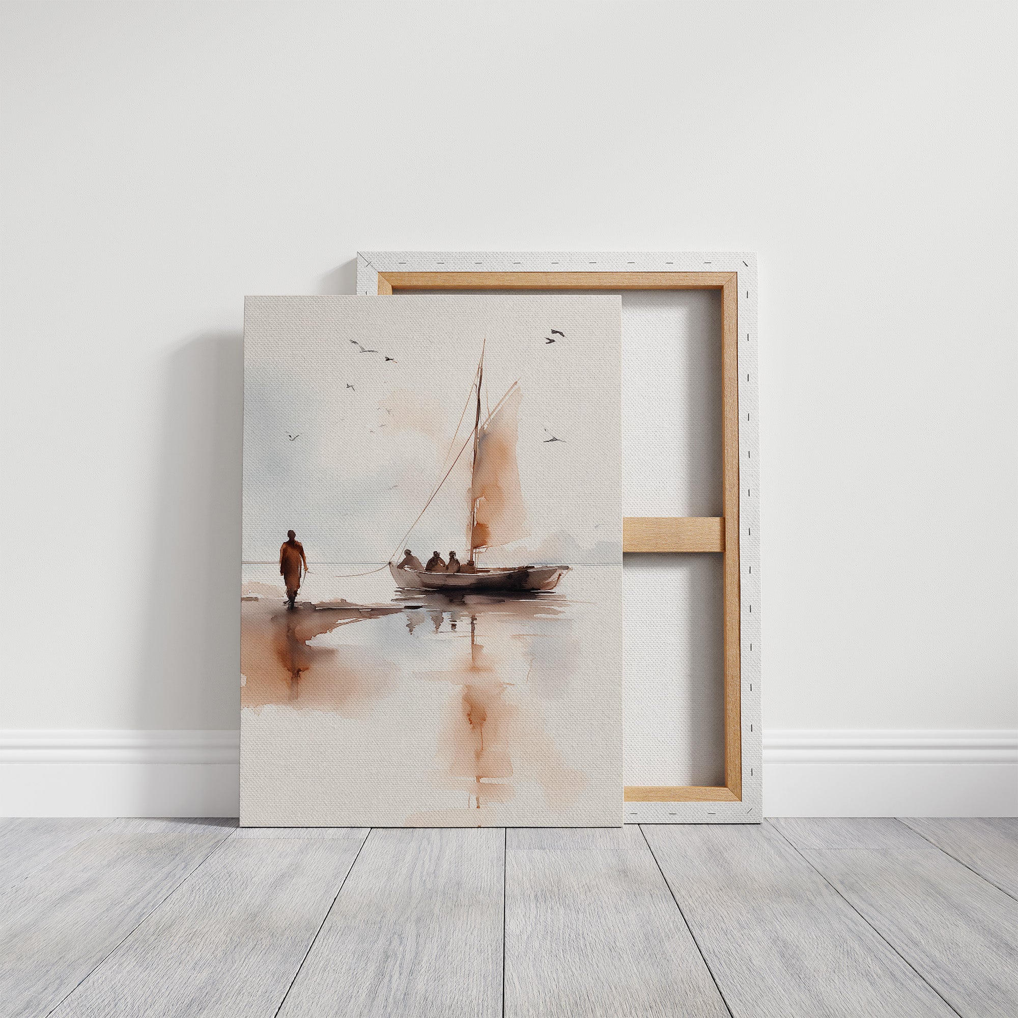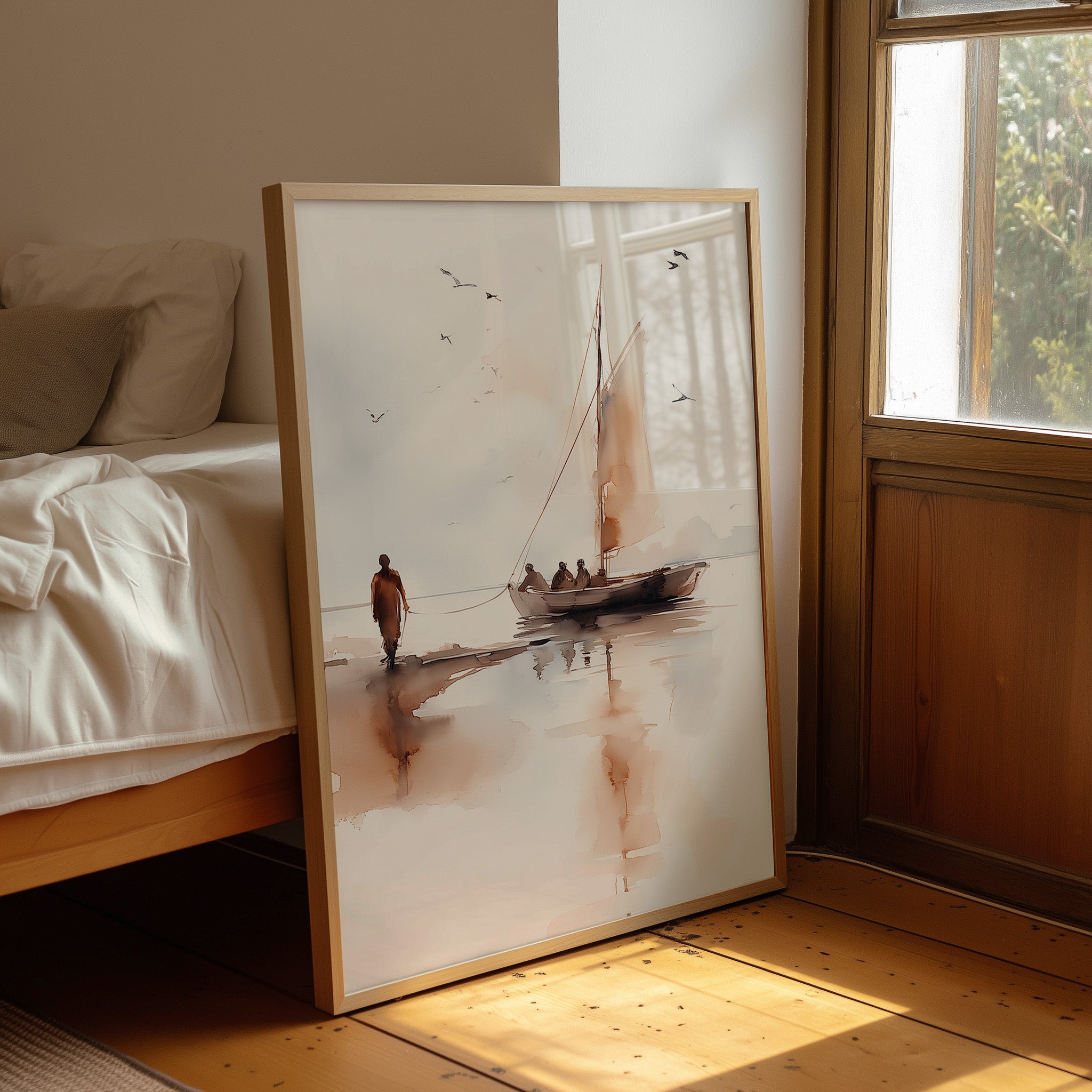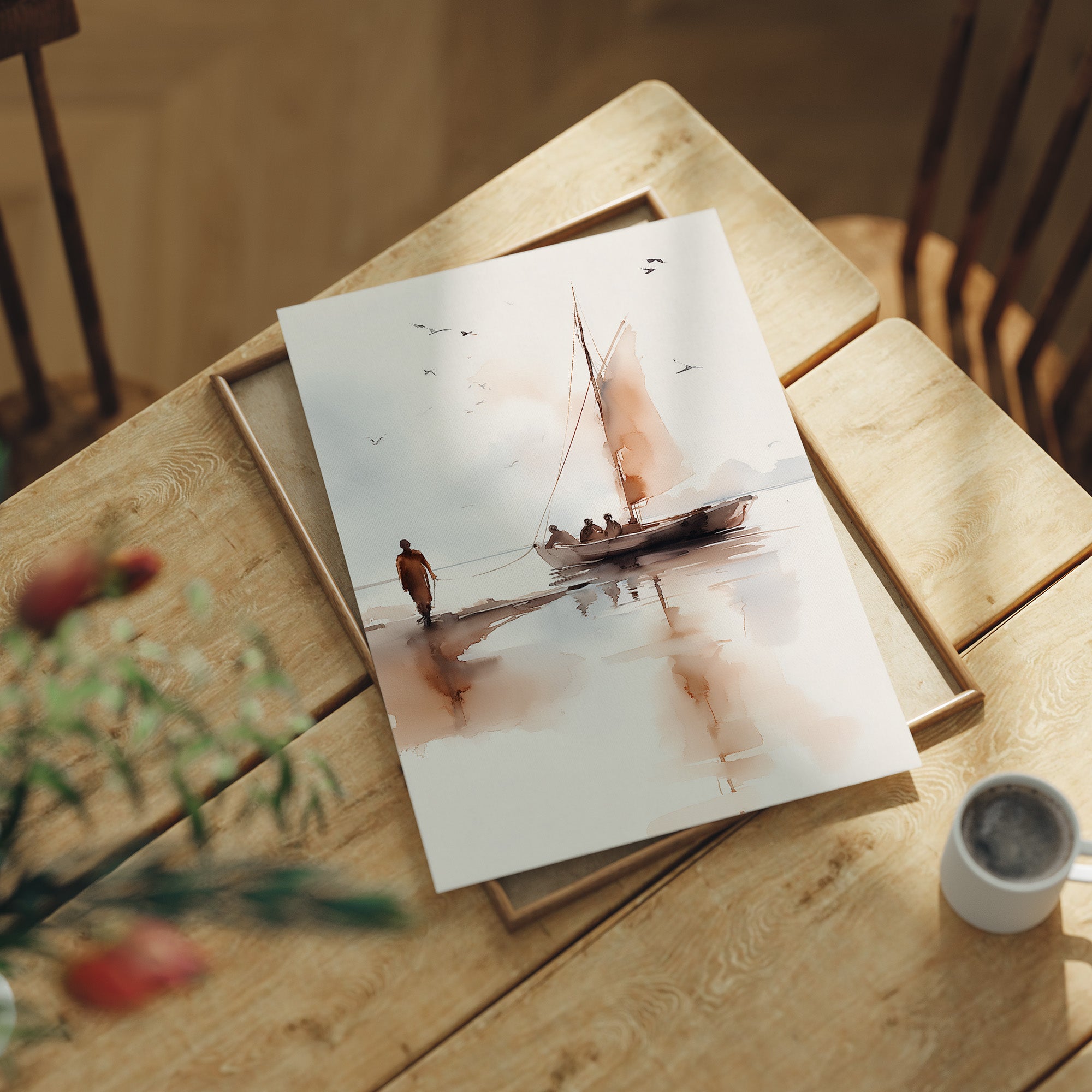 A delicate watercolor capturing the ethereal moment between departure and journey. A small sailboat with billowing sails rests on calm waters, its occupants mere suggestions of form. On the shore, a solitary figure holds a line to the vessel, standing at the threshold of decision. Seagulls circle overhead in the misty atmosphere, creating a dreamlike quality. The palette of soft peaches, creams, and subtle browns creates a luminous, almost transparent scene where water and sky blend into one continuous horizon. The minimalist approach and gentle washes evoke feelings of tranquility, possibility, and the timeless relationship between humanity and the sea.