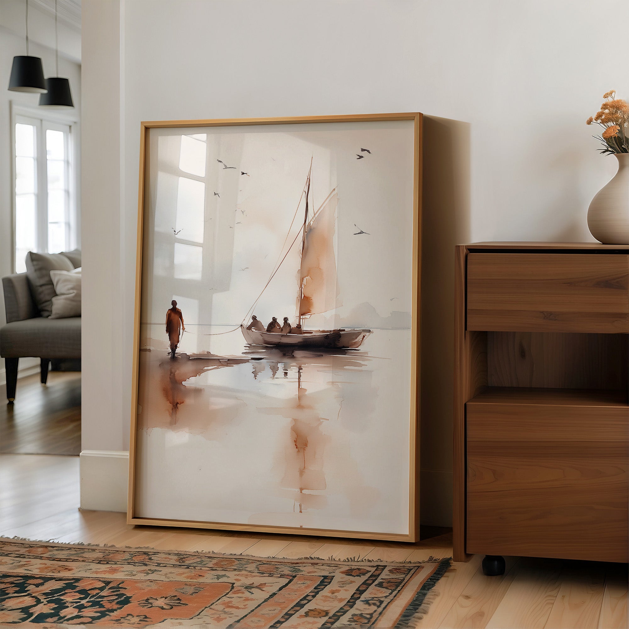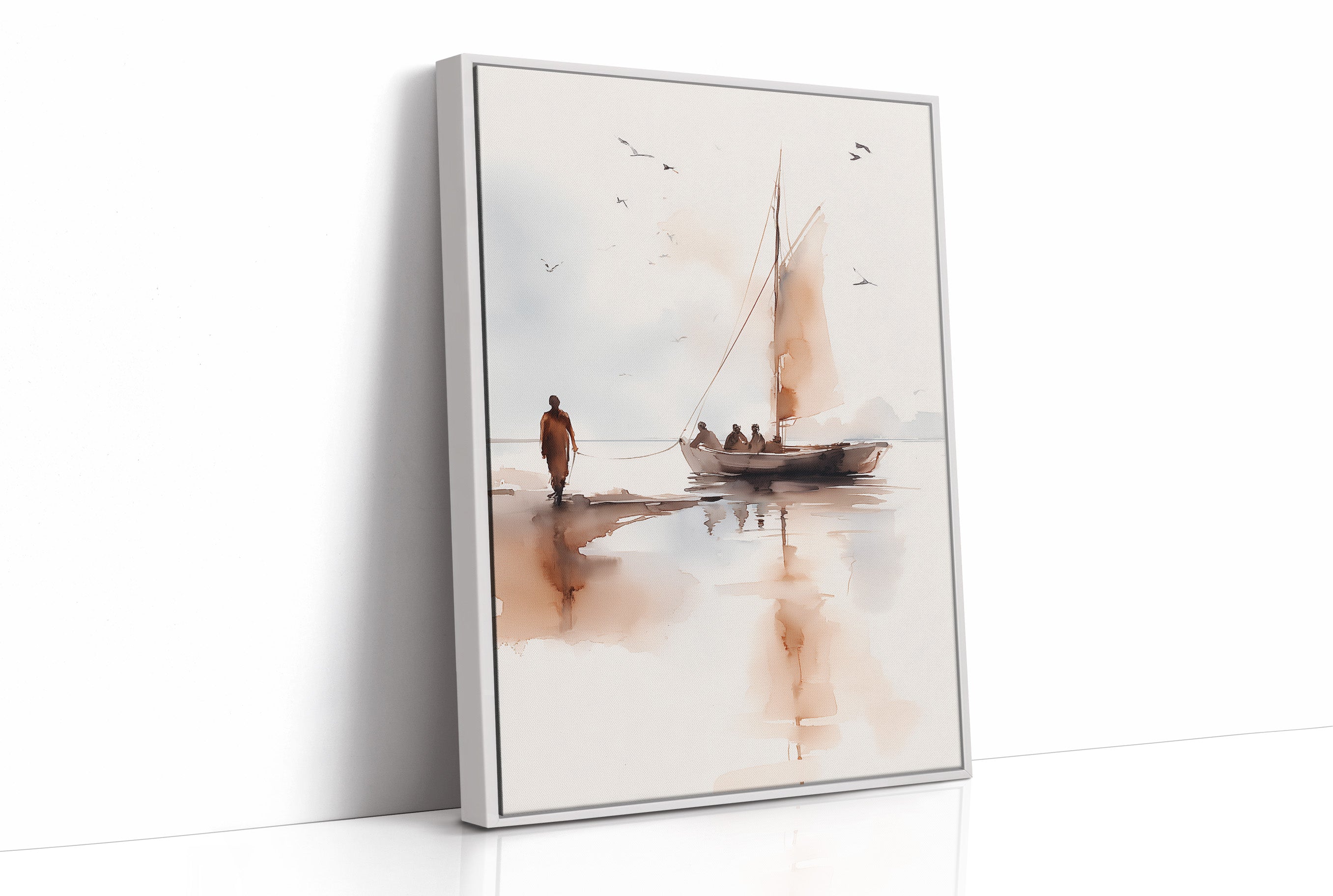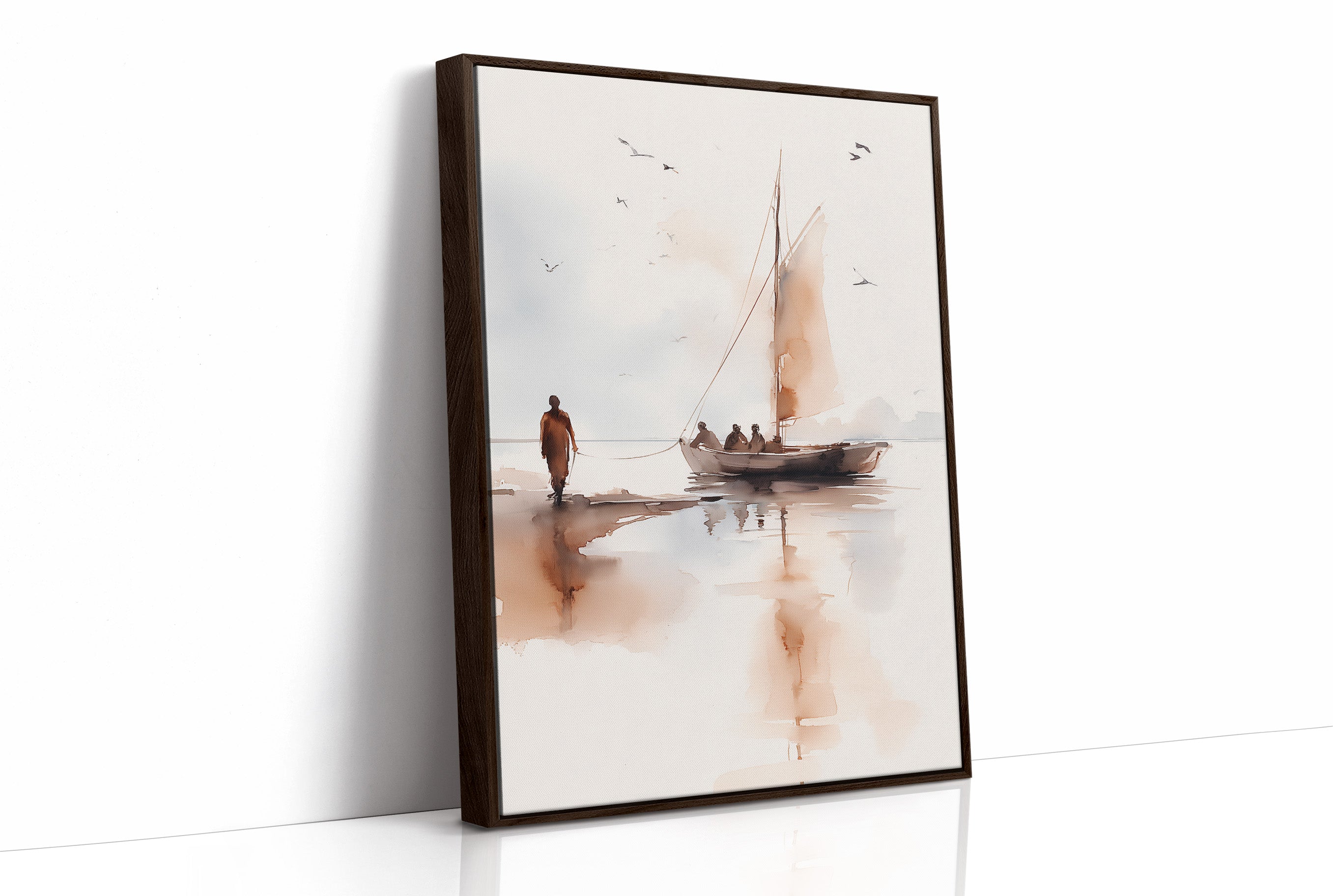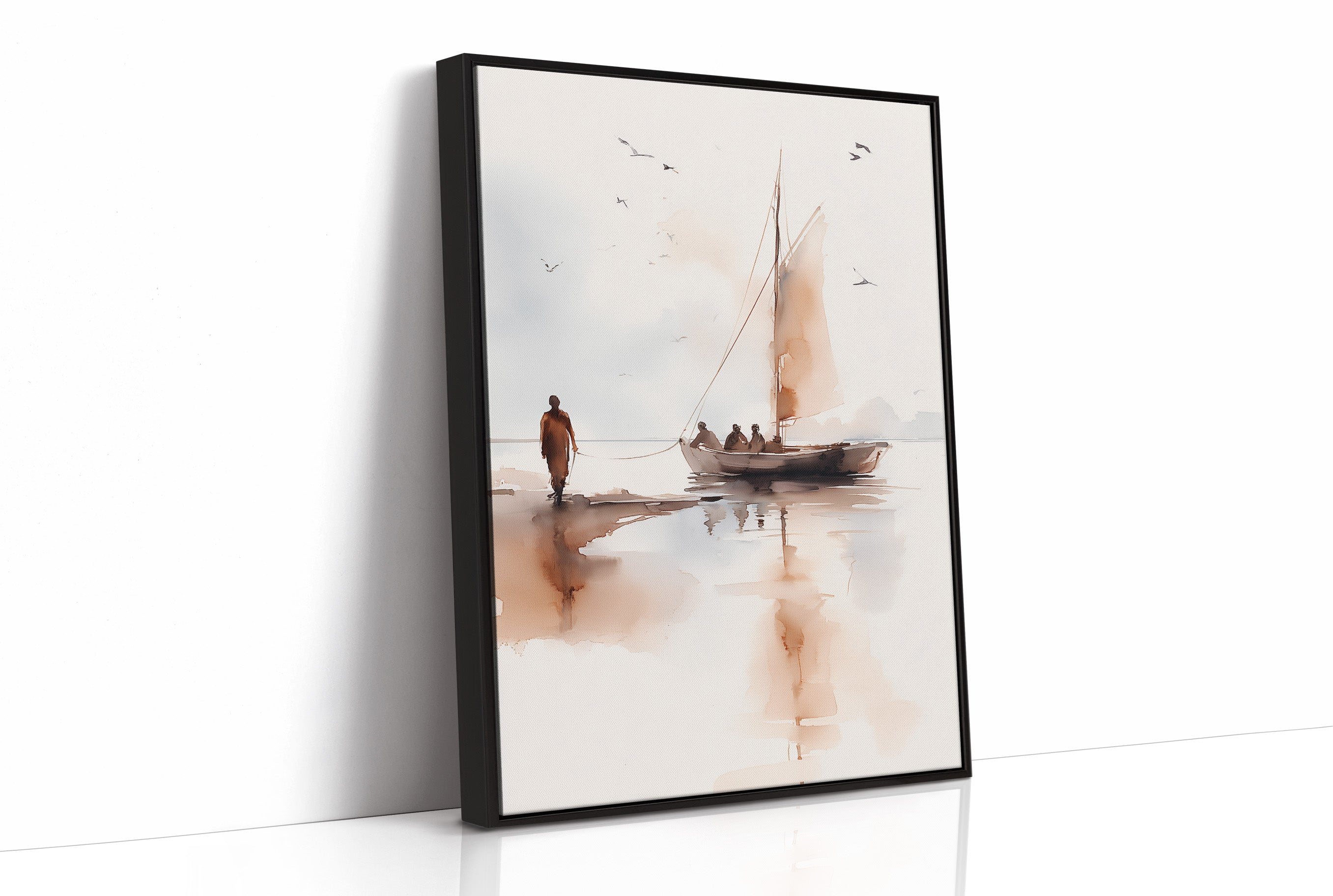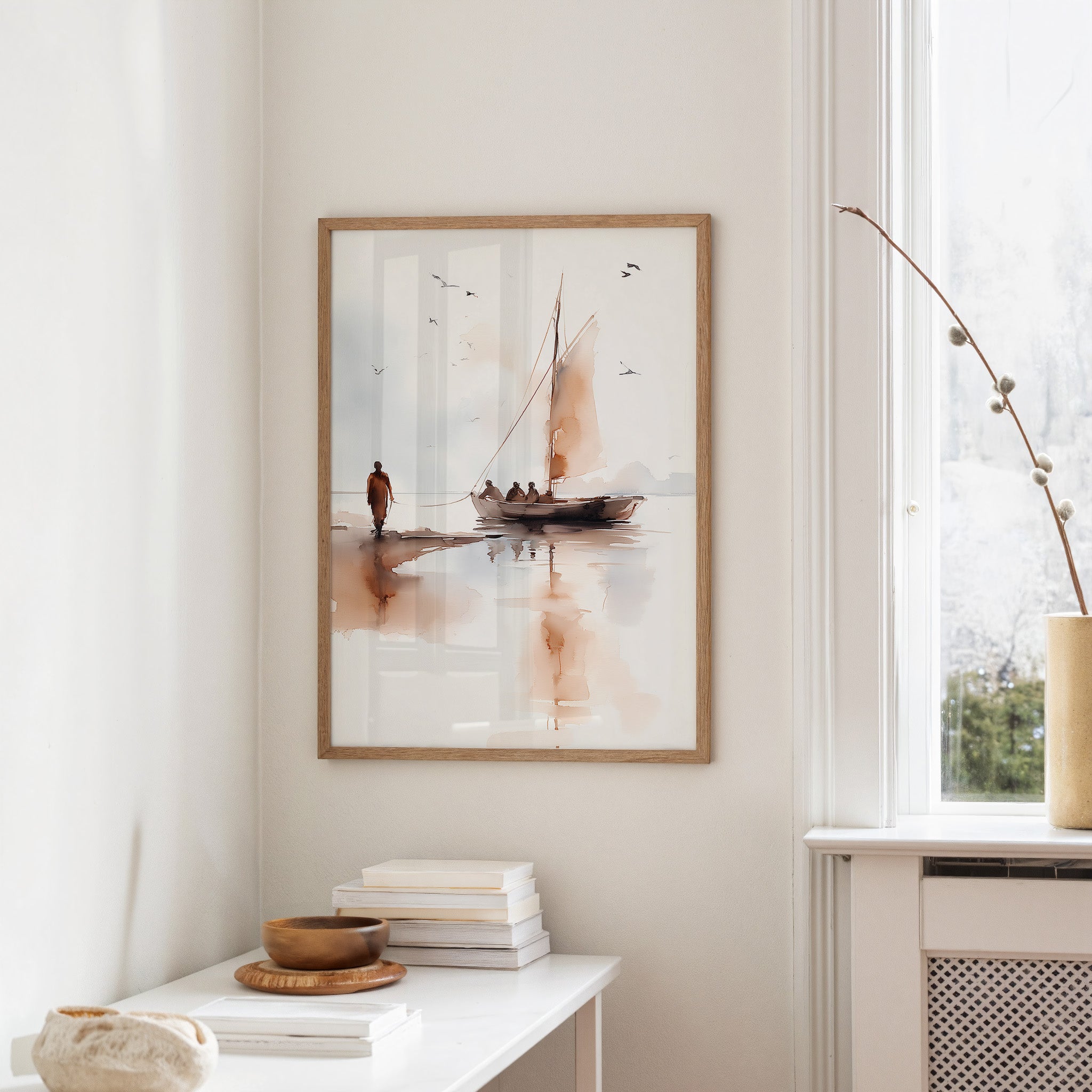A delicate watercolor capturing the ethereal moment between departure and journey. A small sailboat with billowing sails rests on calm waters, its occupants mere suggestions of form. On the shore, a solitary figure holds a line to the vessel, standing at the threshold of decision. Seagulls circle overhead in the misty atmosphere, creating a dreamlike quality. The palette of soft peaches, creams, and subtle browns creates a luminous, almost transparent scene where water and sky blend into one continuous horizon. The minimalist approach and gentle washes evoke feelings of tranquility, possibility, and the timeless relationship between humanity and the sea.