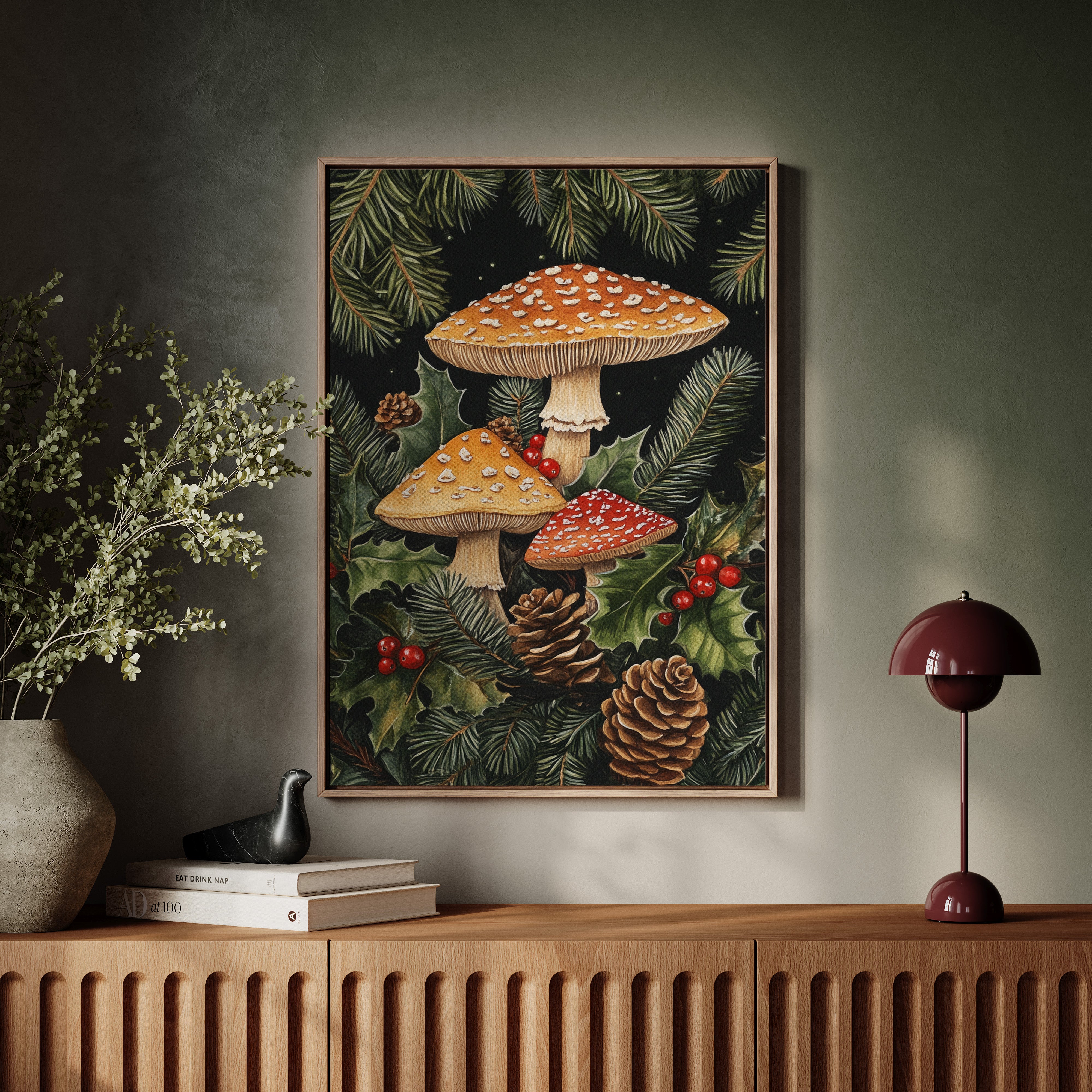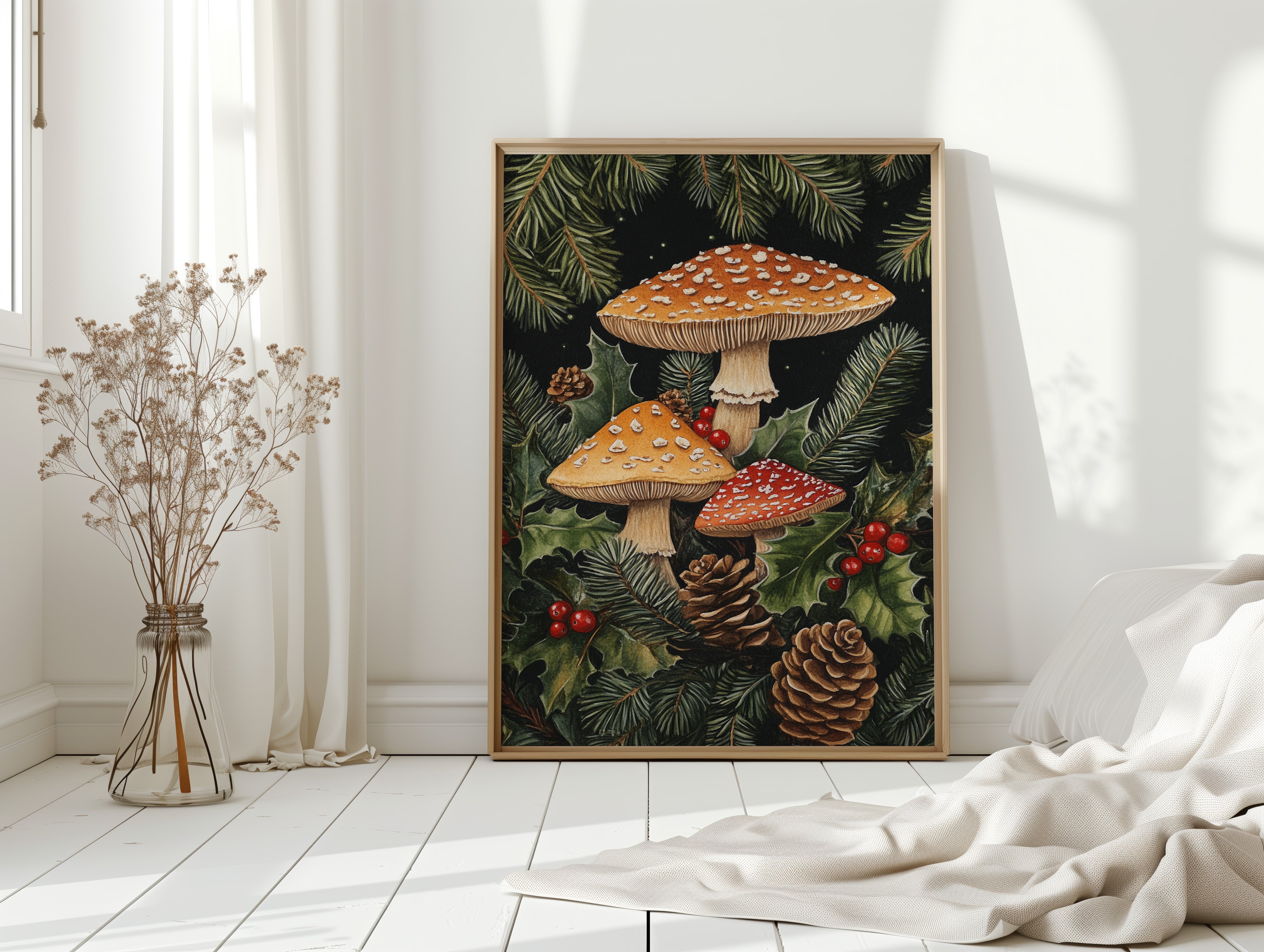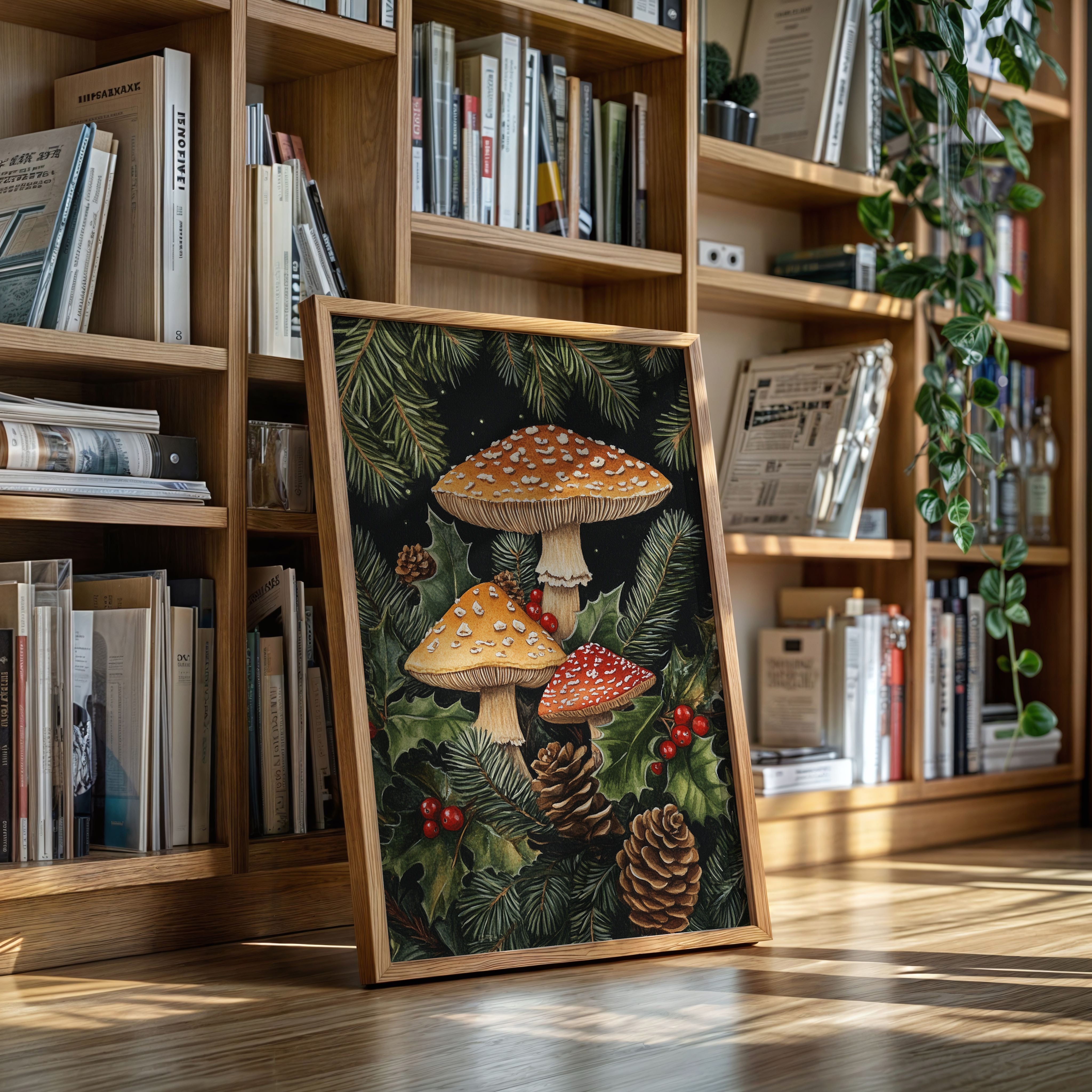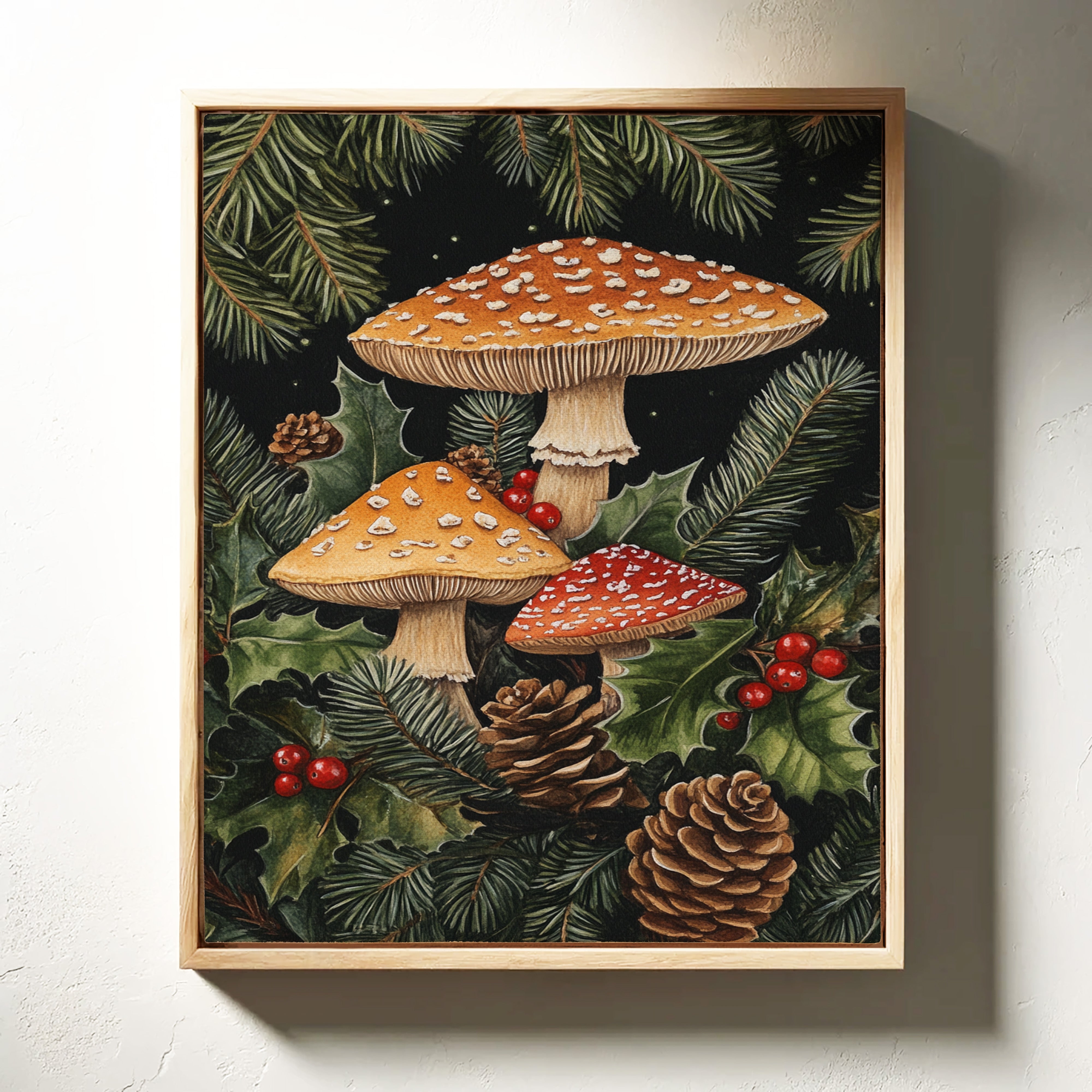 In a hidden grove, vibrant mushrooms rise, crowned with speckles of white, cradled by the embrace of evergreen branches. This piece captures the essence of nature's artistry, where earth's palette mingles with the warmth of the season. Rich textures and earthy tones invite you to explore a world alive with color and life, as pine cones and holly berries dance in the underbrush, telling tales of woodland secrets. Perfect for a cozy study or a tranquil reading nook, this artwork invites the spirit of the outdoors inside.