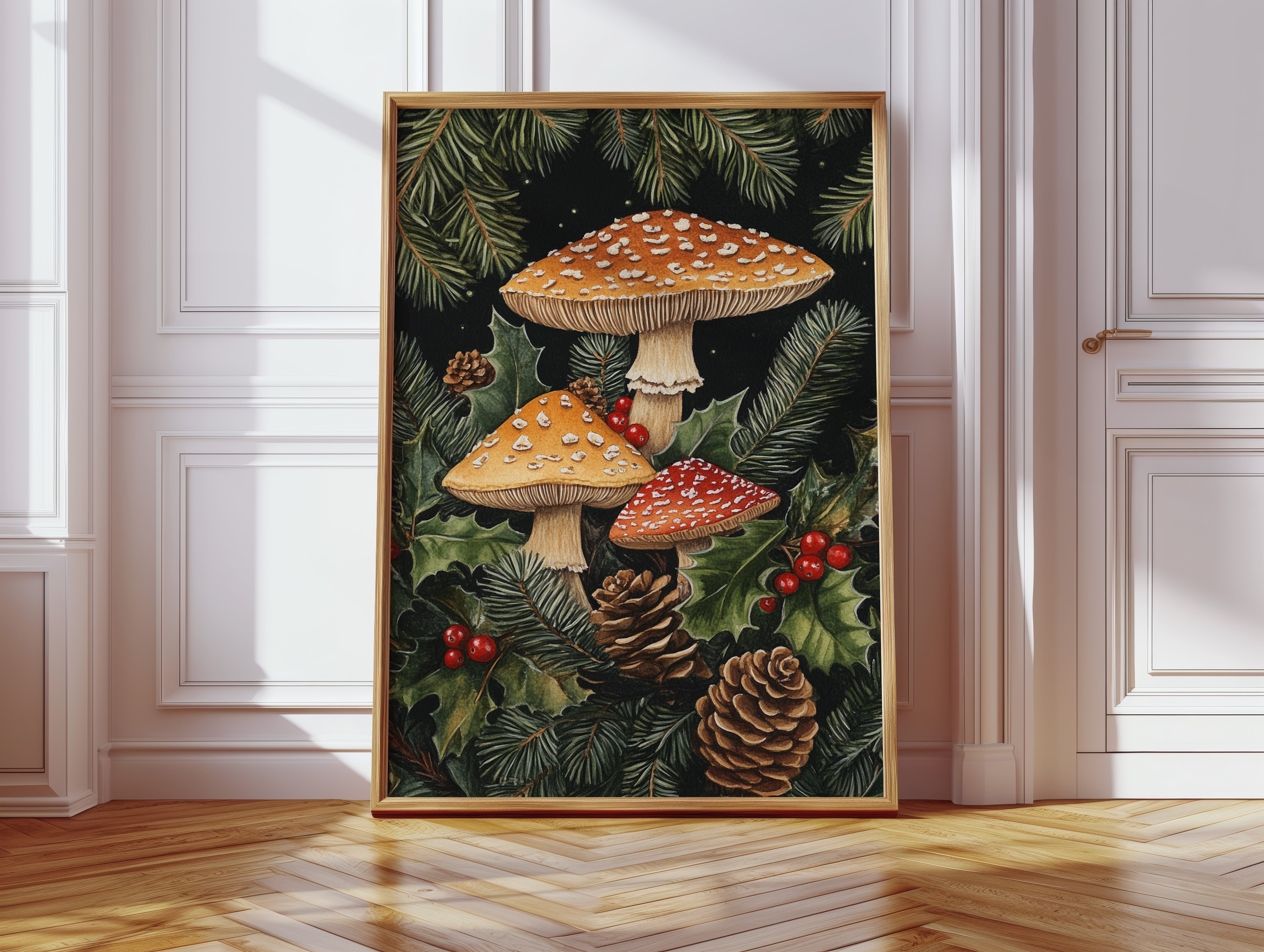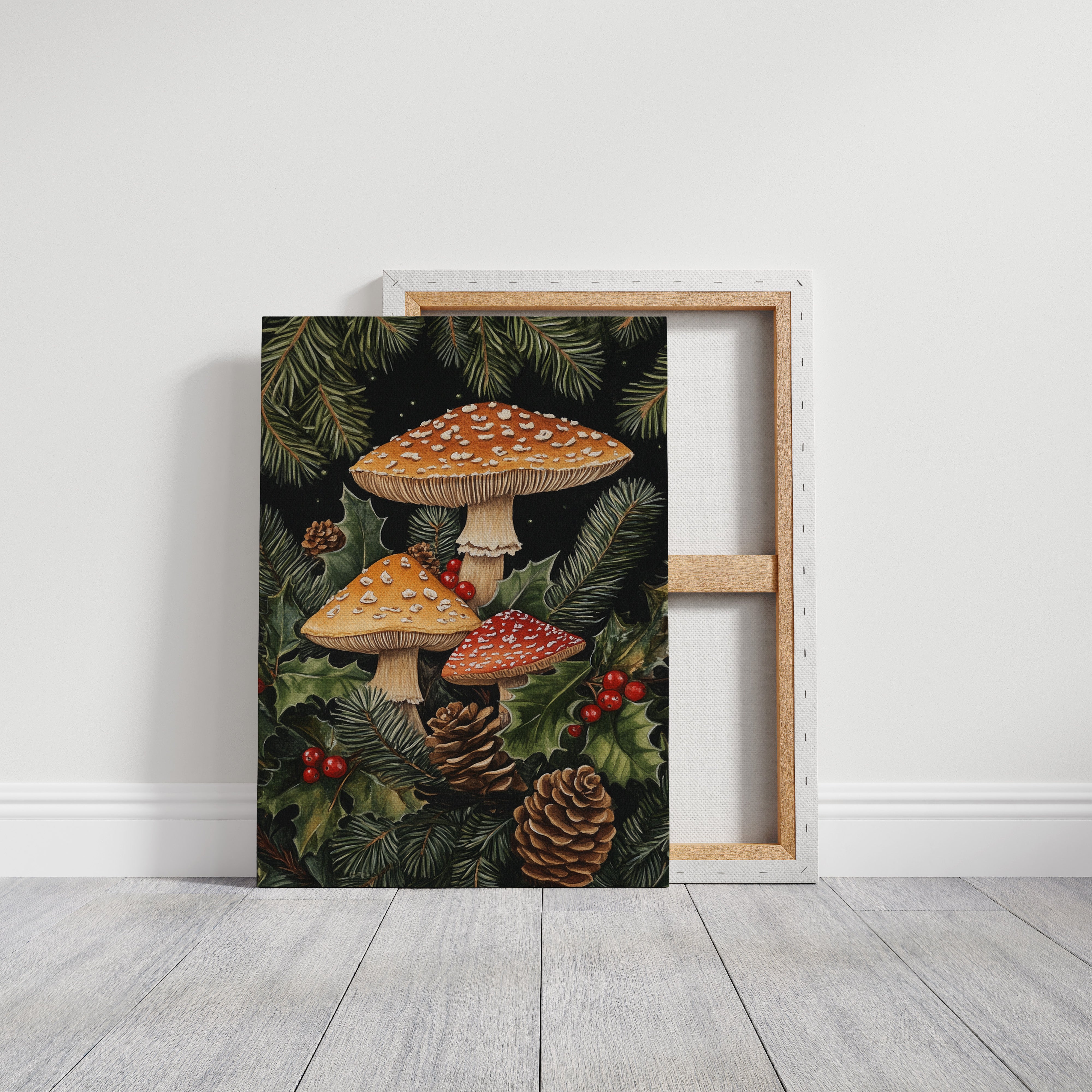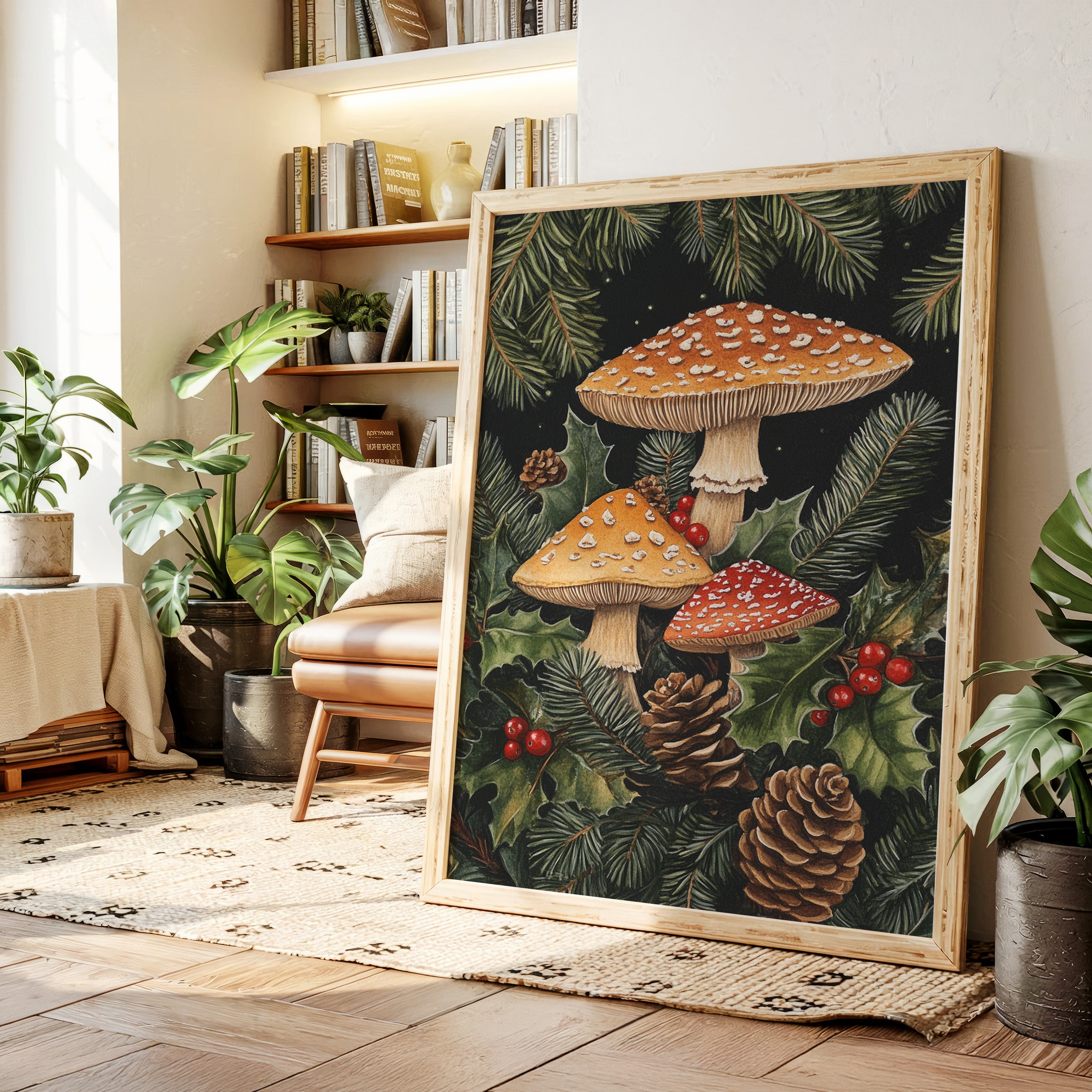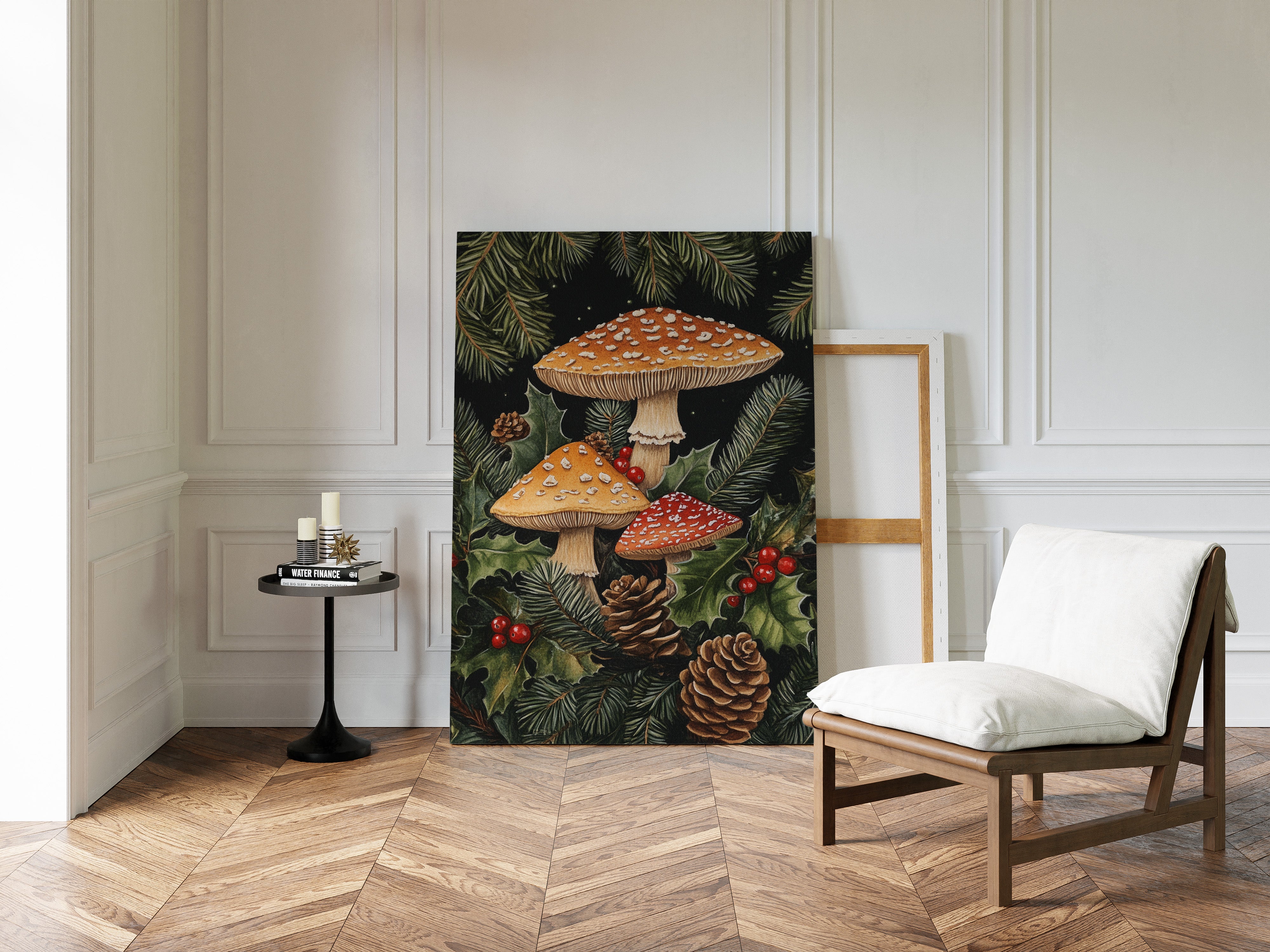 In a hidden grove, vibrant mushrooms rise, crowned with speckles of white, cradled by the embrace of evergreen branches. This piece captures the essence of nature's artistry, where earth's palette mingles with the warmth of the season. Rich textures and earthy tones invite you to explore a world alive with color and life, as pine cones and holly berries dance in the underbrush, telling tales of woodland secrets. Perfect for a cozy study or a tranquil reading nook, this artwork invites the spirit of the outdoors inside.