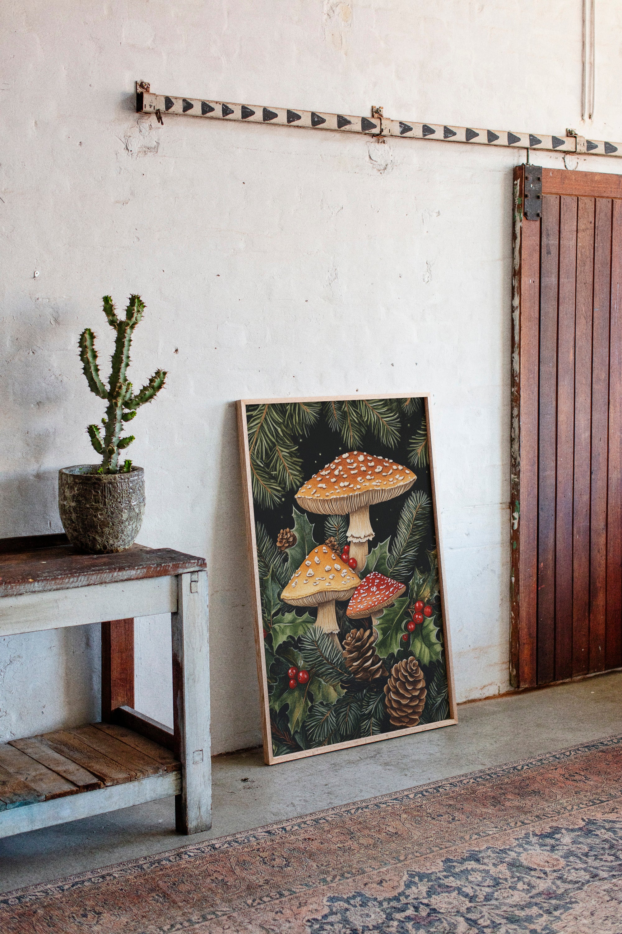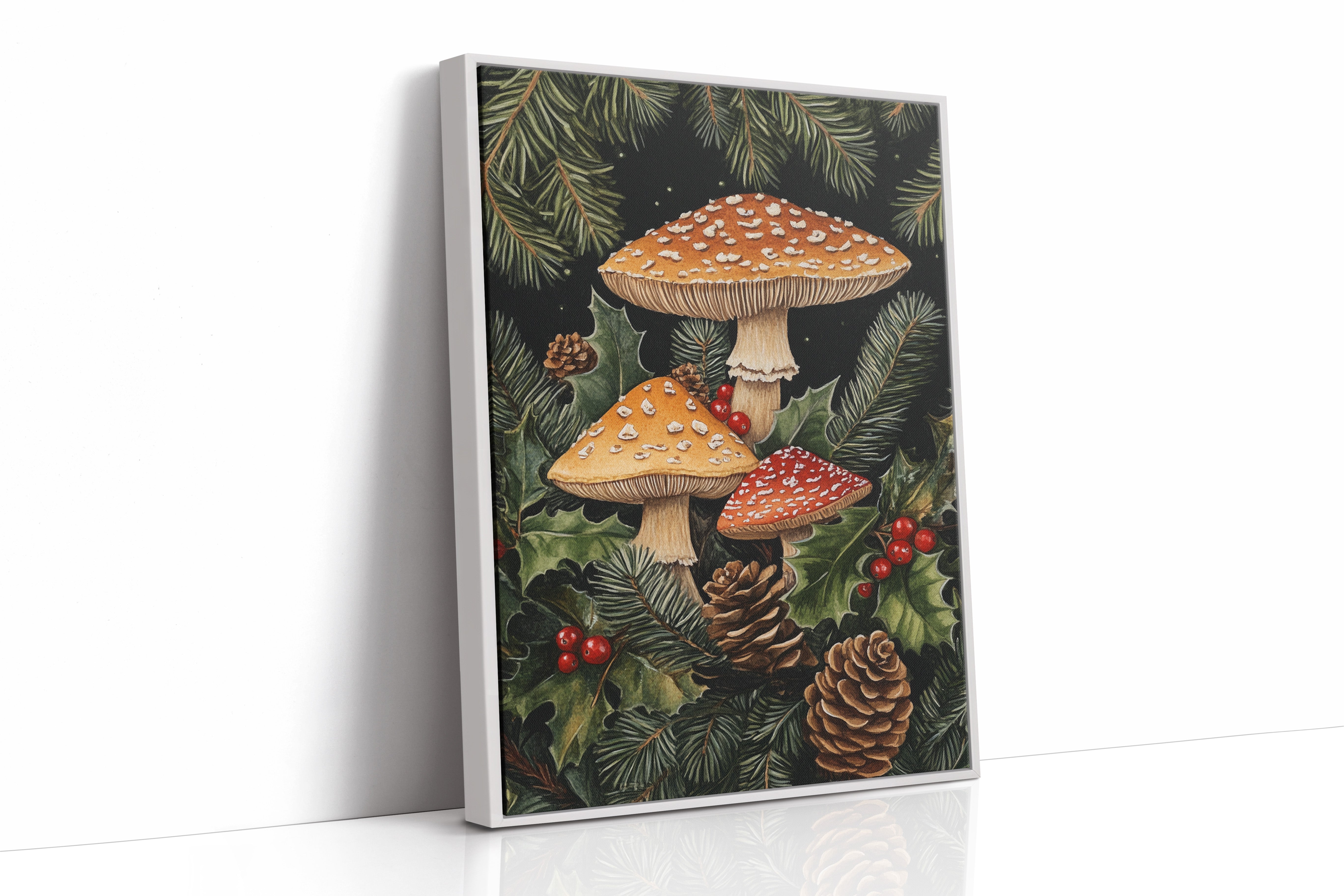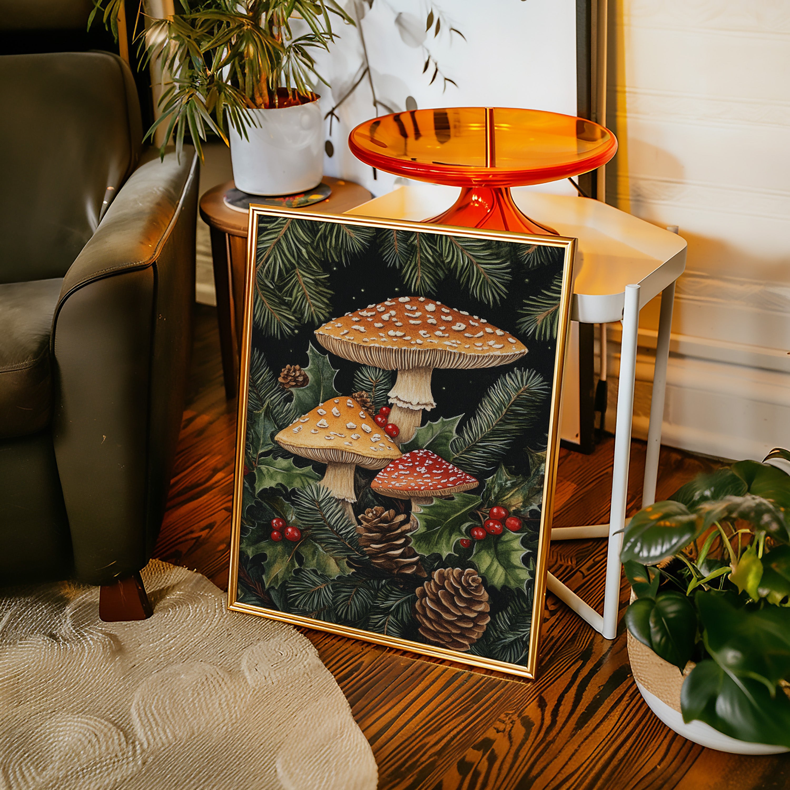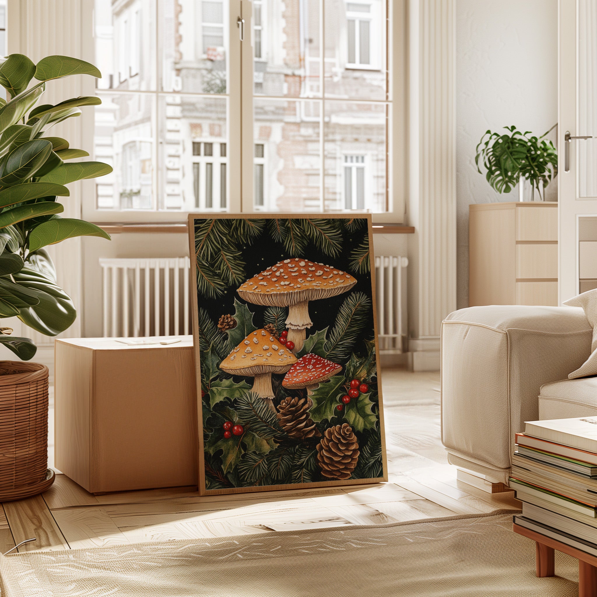 In a hidden grove, vibrant mushrooms rise, crowned with speckles of white, cradled by the embrace of evergreen branches. This piece captures the essence of nature's artistry, where earth's palette mingles with the warmth of the season. Rich textures and earthy tones invite you to explore a world alive with color and life, as pine cones and holly berries dance in the underbrush, telling tales of woodland secrets. Perfect for a cozy study or a tranquil reading nook, this artwork invites the spirit of the outdoors inside.