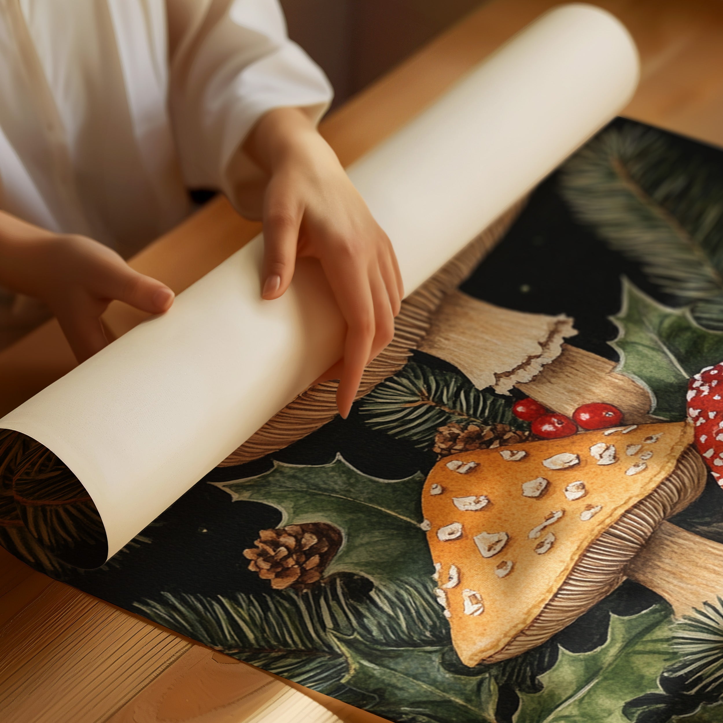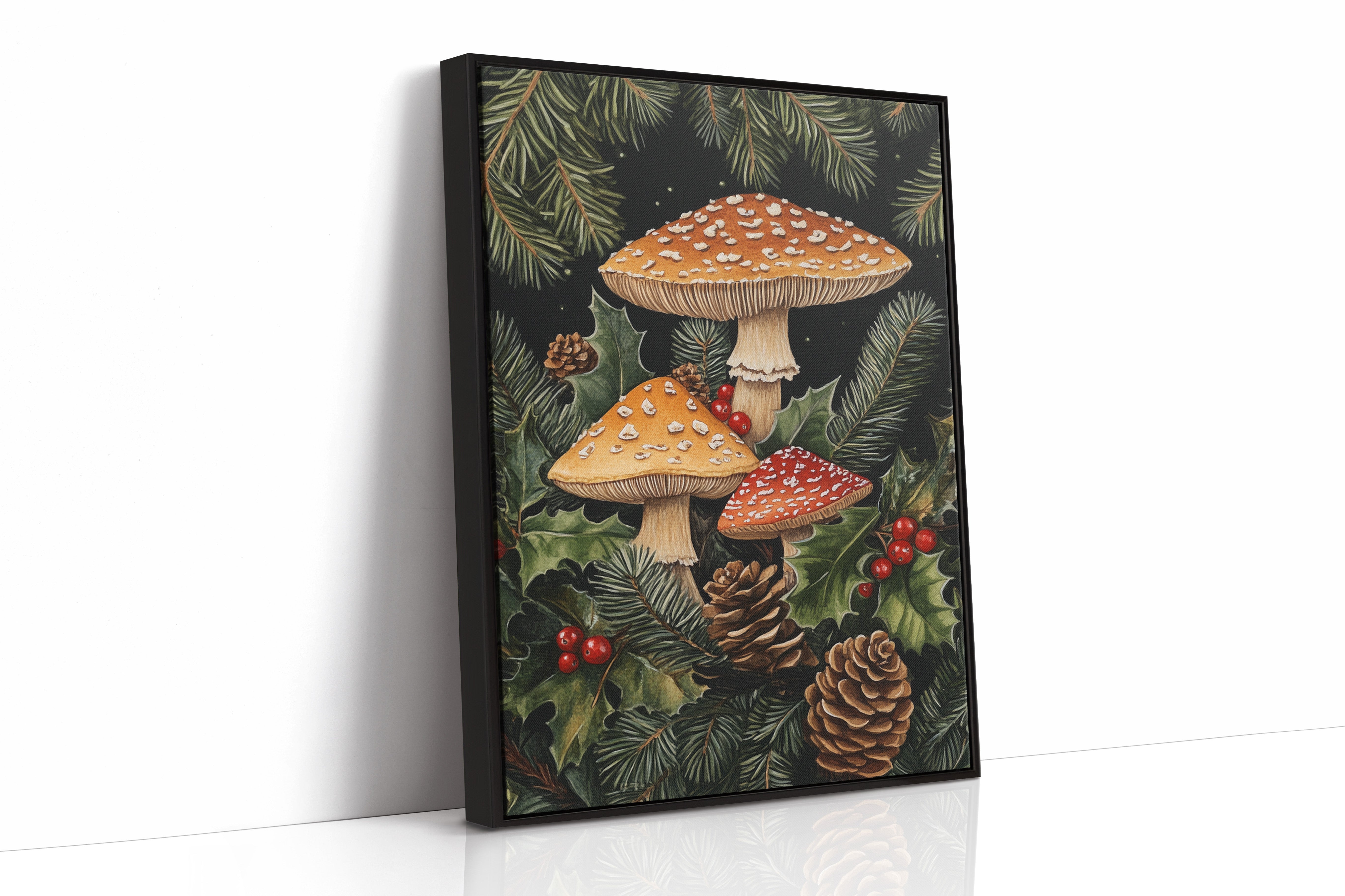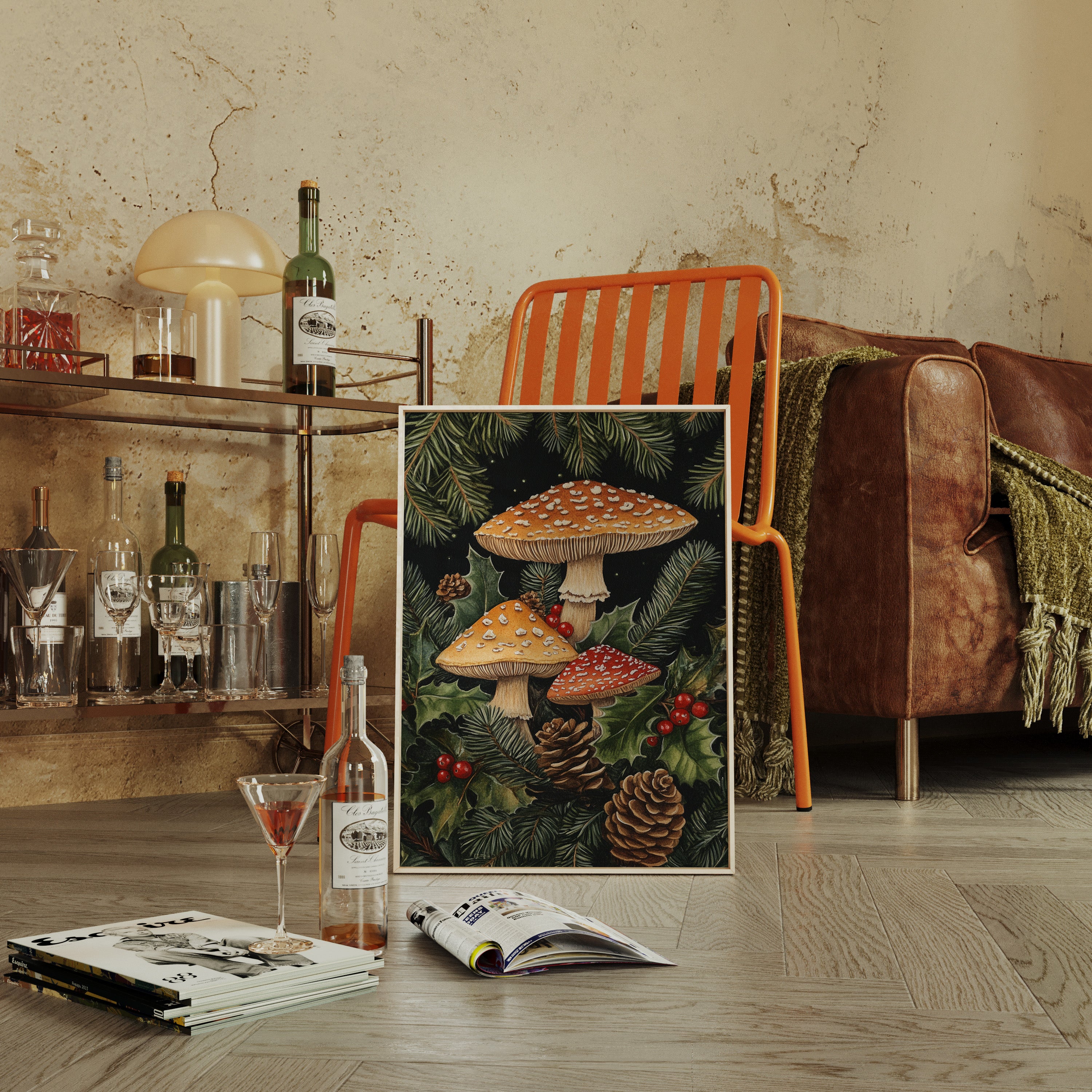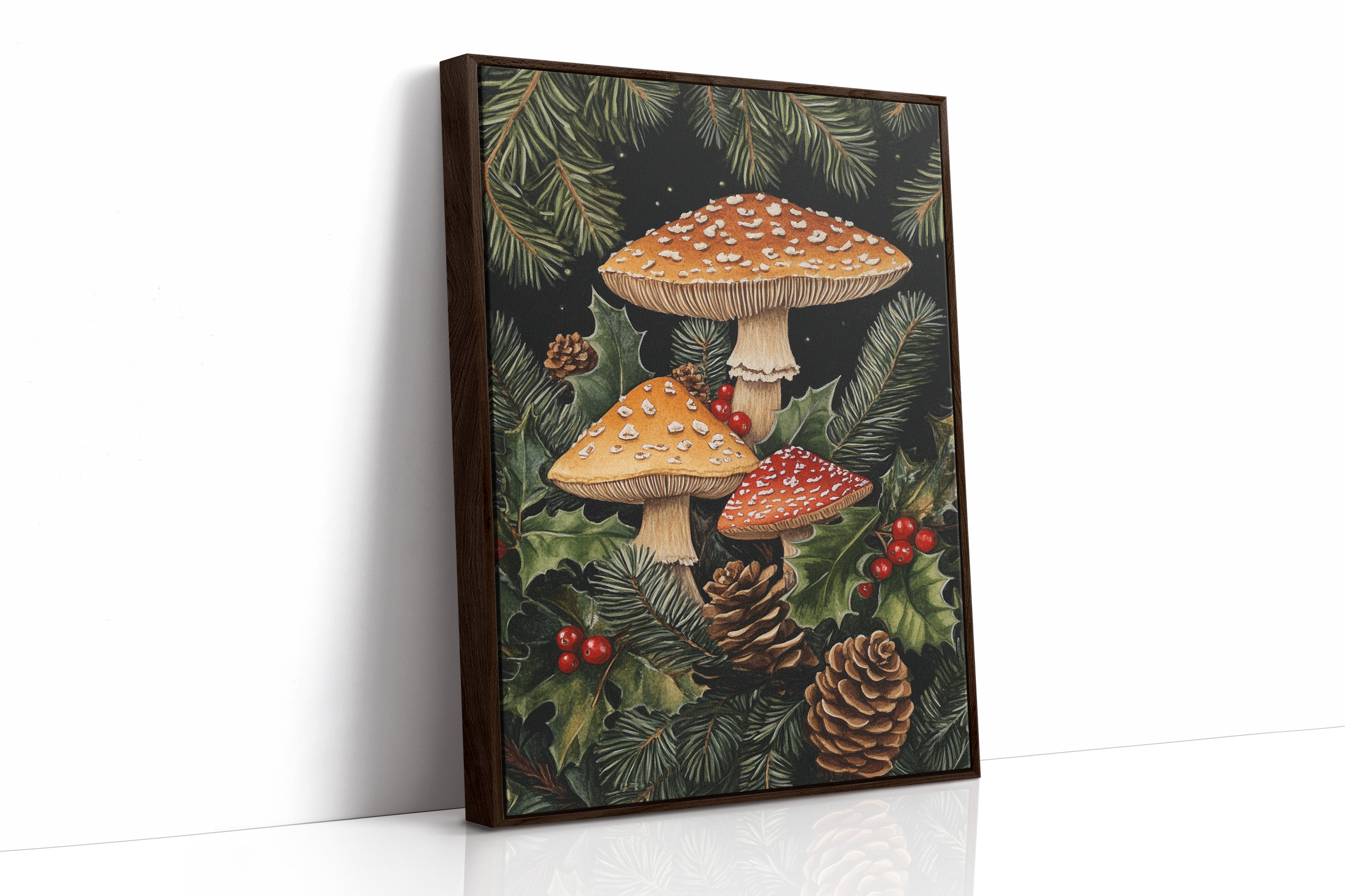 In a hidden grove, vibrant mushrooms rise, crowned with speckles of white, cradled by the embrace of evergreen branches. This piece captures the essence of nature's artistry, where earth's palette mingles with the warmth of the season. Rich textures and earthy tones invite you to explore a world alive with color and life, as pine cones and holly berries dance in the underbrush, telling tales of woodland secrets. Perfect for a cozy study or a tranquil reading nook, this artwork invites the spirit of the outdoors inside.