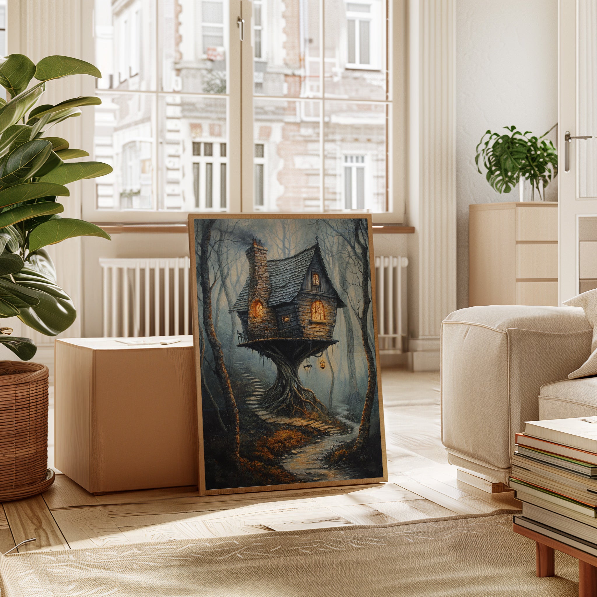 Step into a realm where fantasy and tranquility intertwine with 'Whispering Woodlands Retreat.' This enchanting artwork invites you to wander through a magical forest, where a cozy treehouse perches atop twisted branches, aglow with warm, inviting light. Perfect for those who seek a touch of whimsy blended with the rustic charm of nature's embrace. Let this piece transform your space into a portal to mystery and serenity, capturing the essence of a fairytale nestled in the heart of the woods.