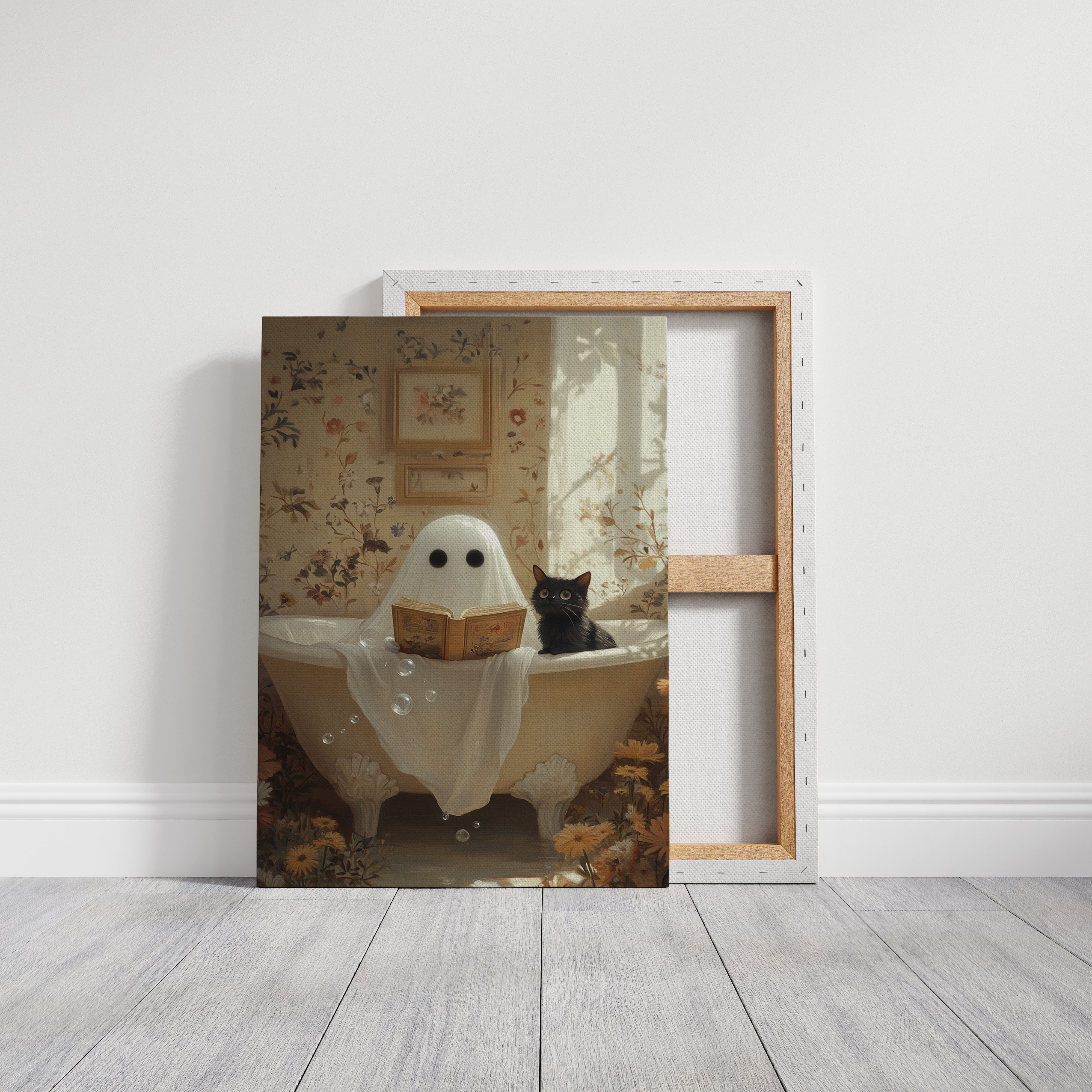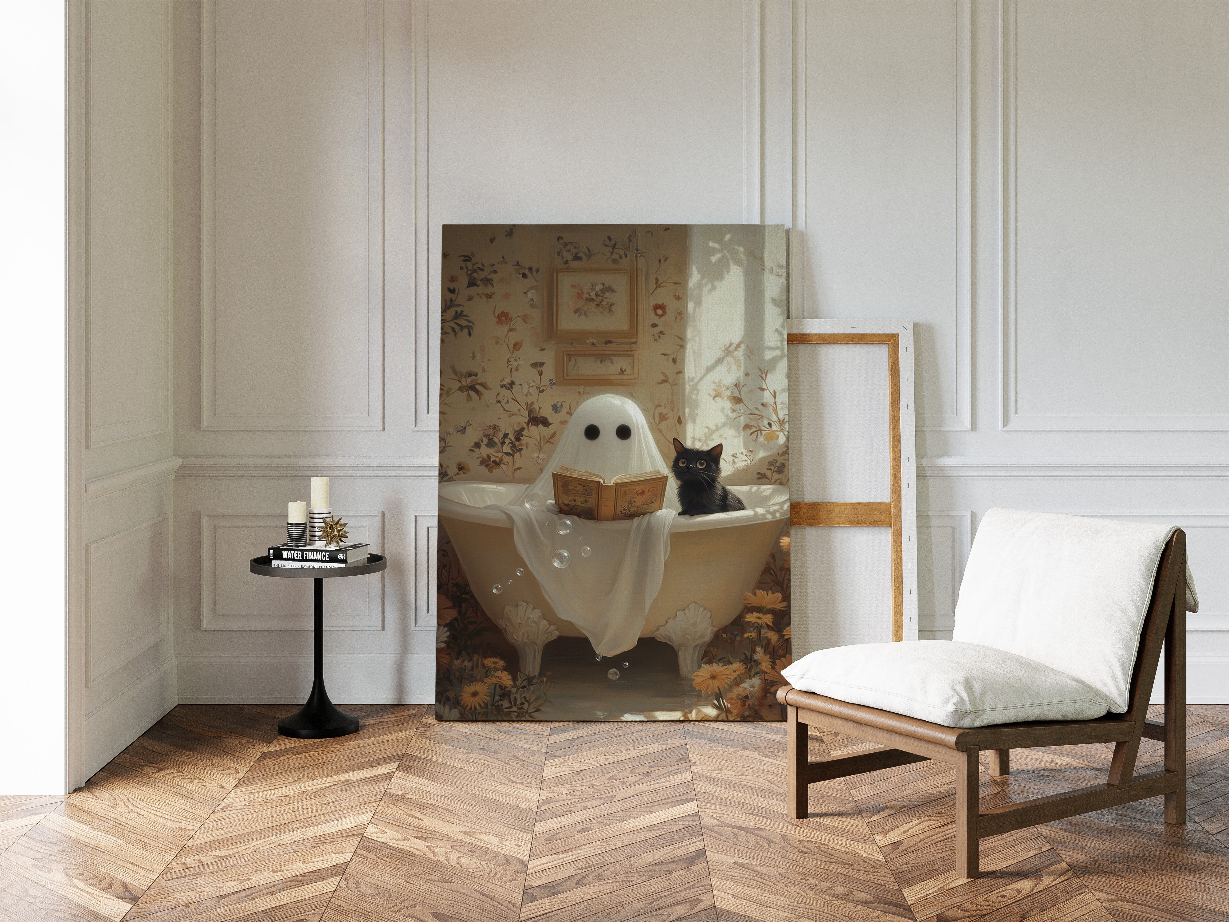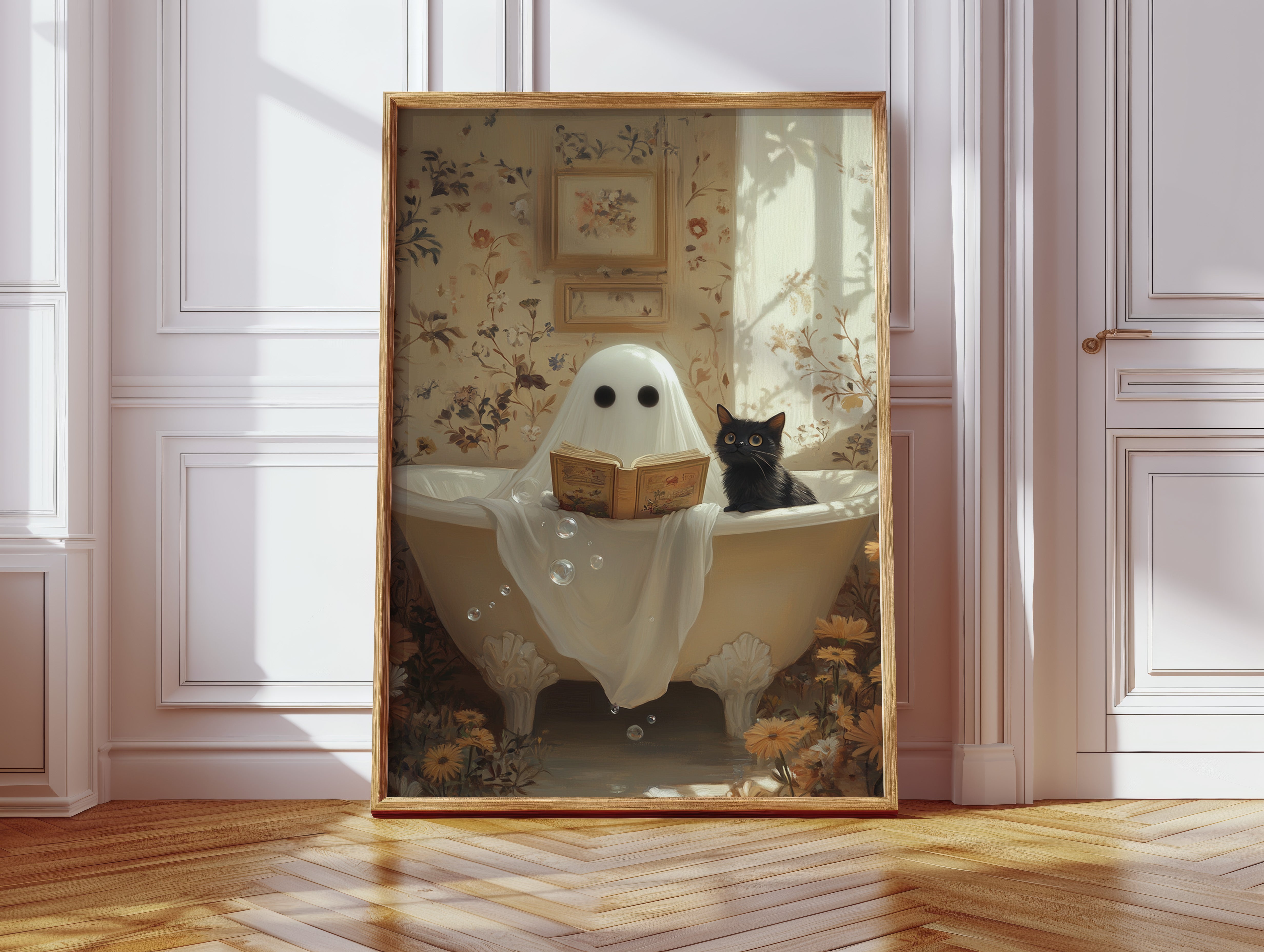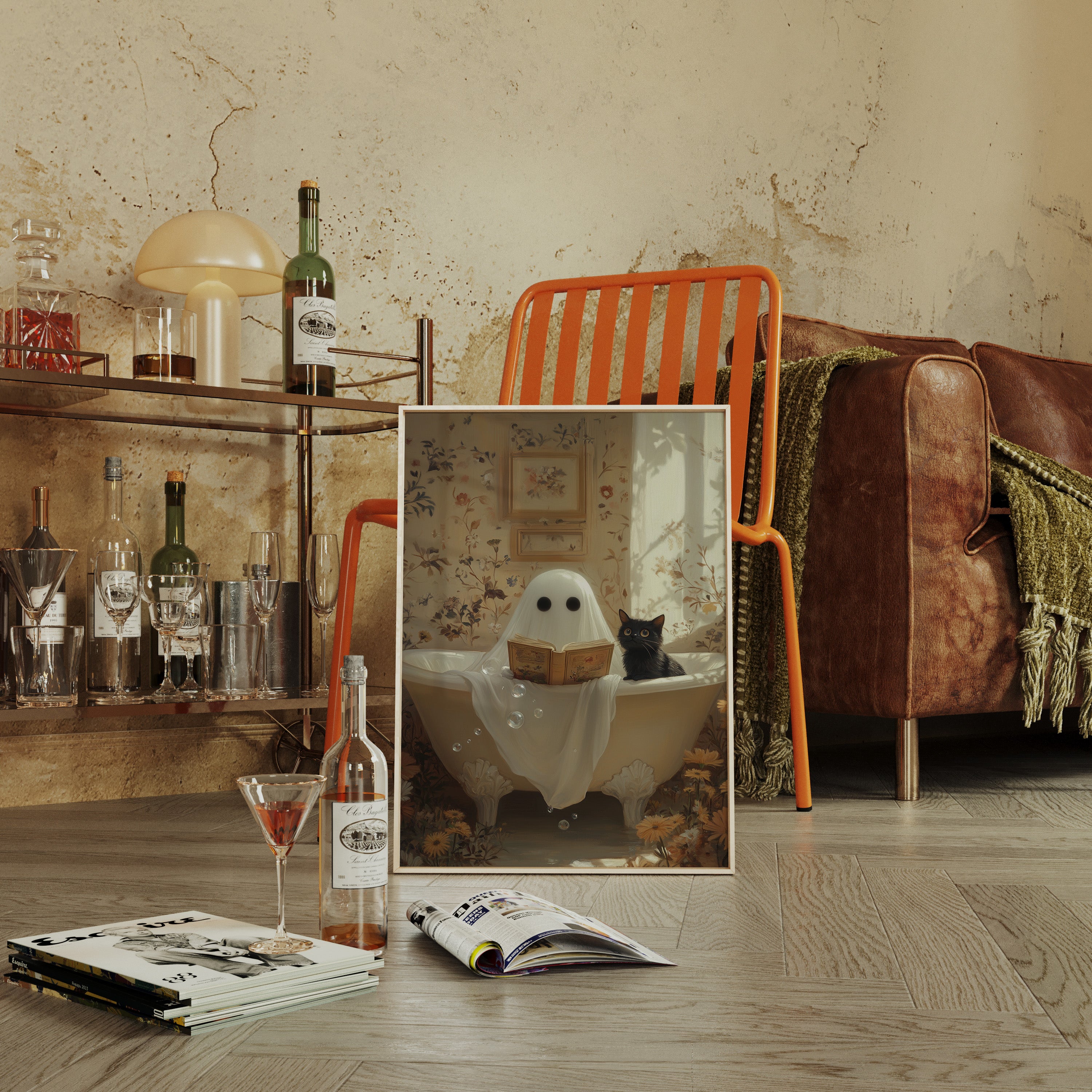 Step into a world where the whimsical meets the mysterious with 'Whispers in the Bath.' This captivating scene invites you to a cozy corner where a ghostly figure and a curious black cat share a moment of quiet intrigue. With delicate floral wallpaper and warm, inviting tones, this artwork beautifully blends elements of the vintage and the supernatural. Perfect for adding an eclectic touch to any room, it evokes a sense of playful mystery and timeless charm, making it a delightful conversation piece.