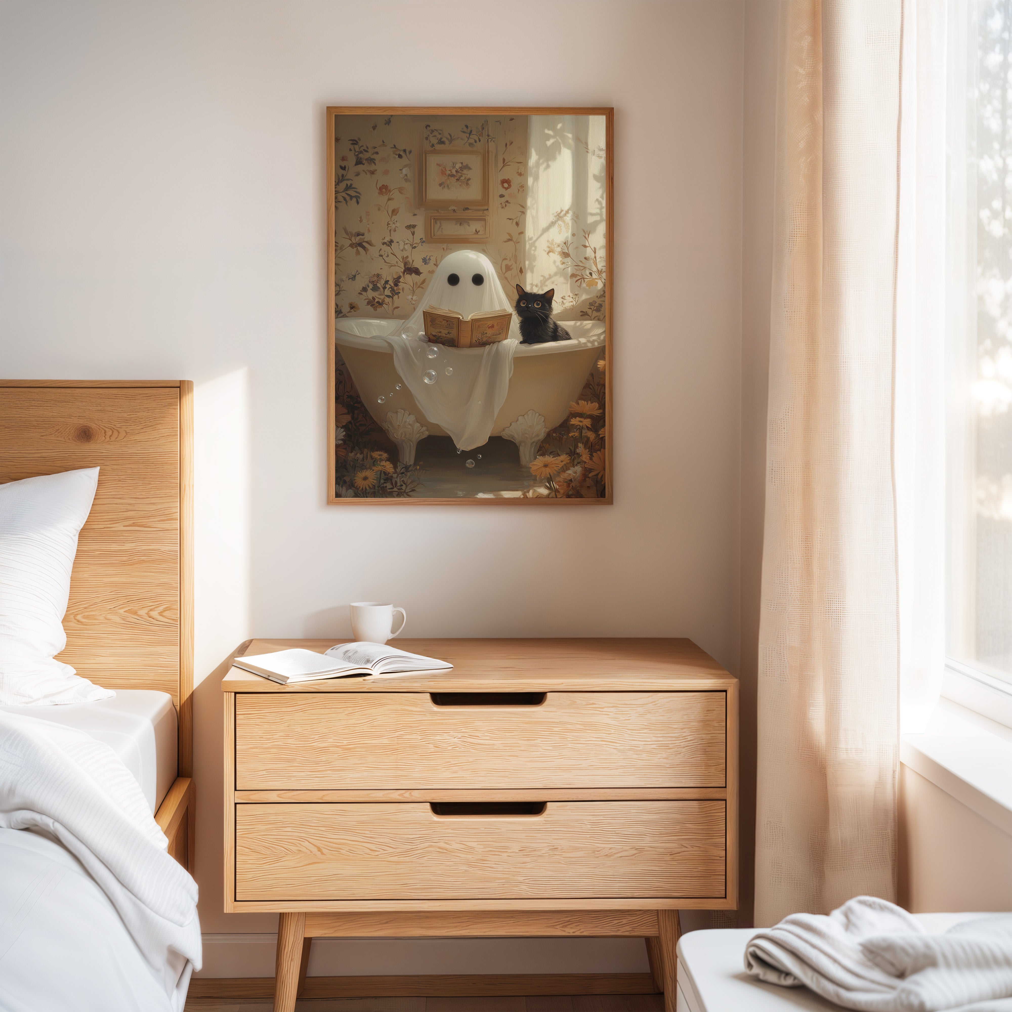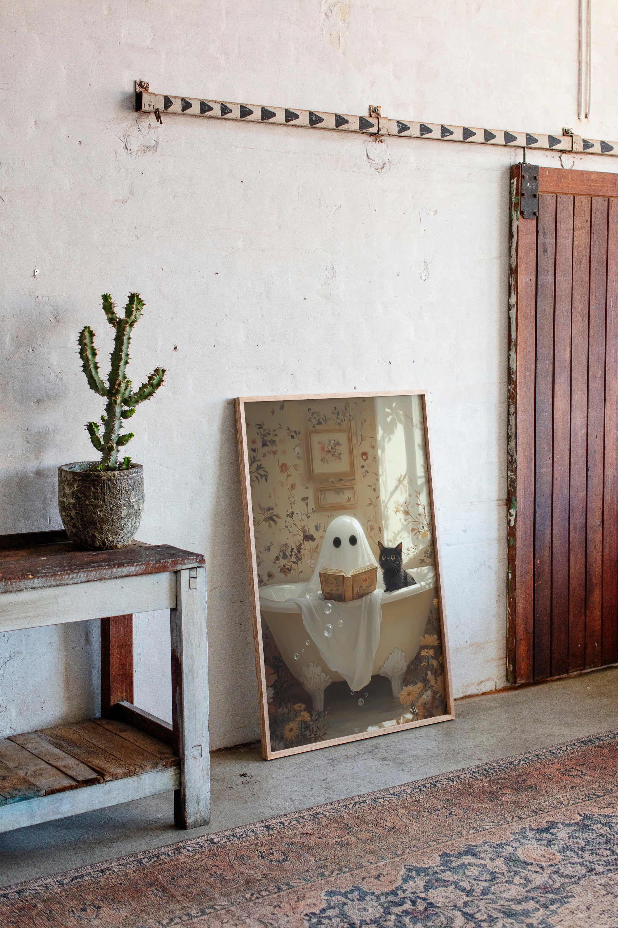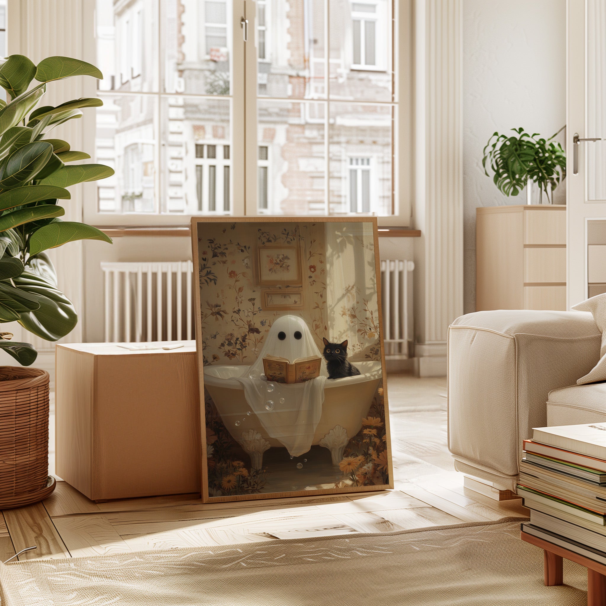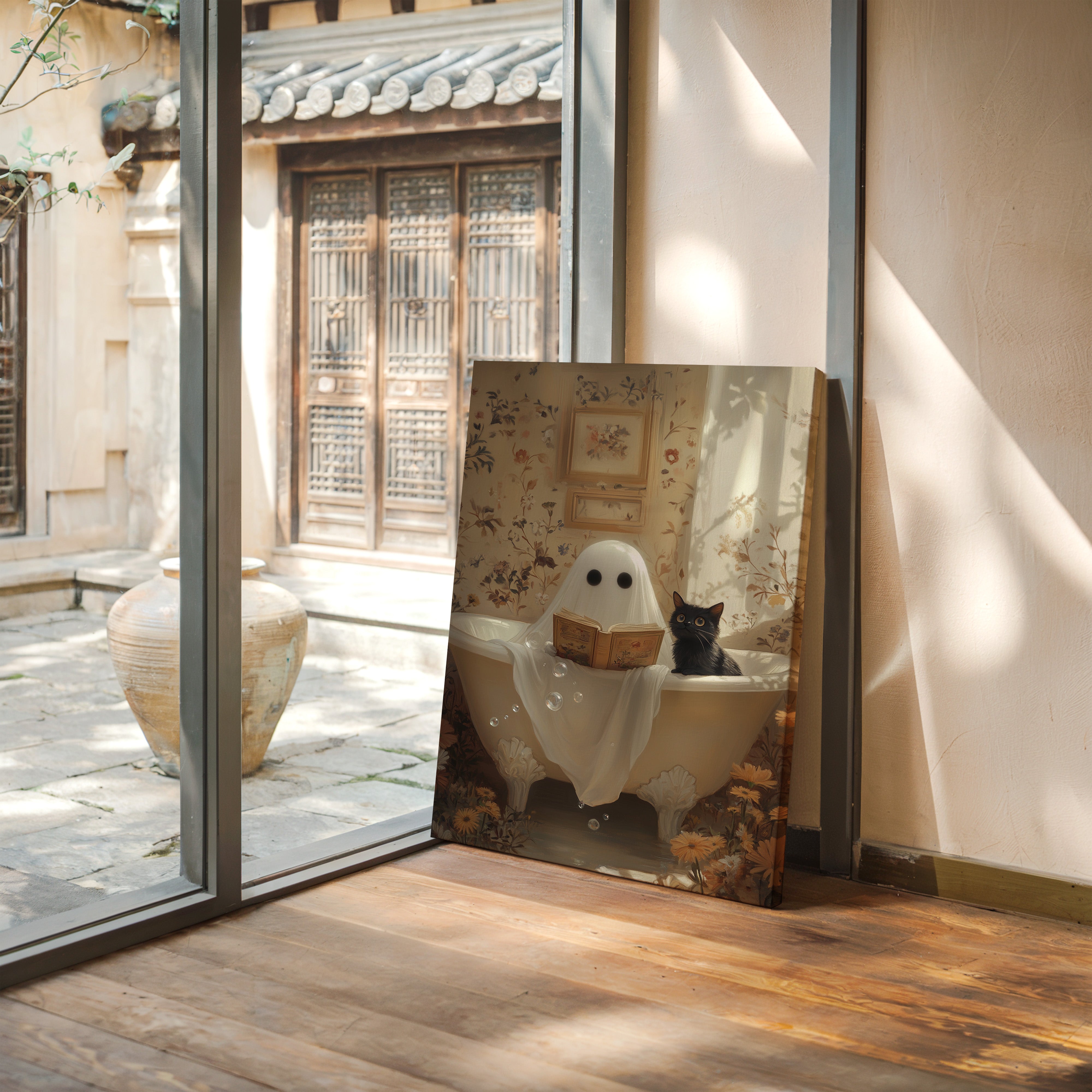 Step into a world where the whimsical meets the mysterious with 'Whispers in the Bath.' This captivating scene invites you to a cozy corner where a ghostly figure and a curious black cat share a moment of quiet intrigue. With delicate floral wallpaper and warm, inviting tones, this artwork beautifully blends elements of the vintage and the supernatural. Perfect for adding an eclectic touch to any room, it evokes a sense of playful mystery and timeless charm, making it a delightful conversation piece.