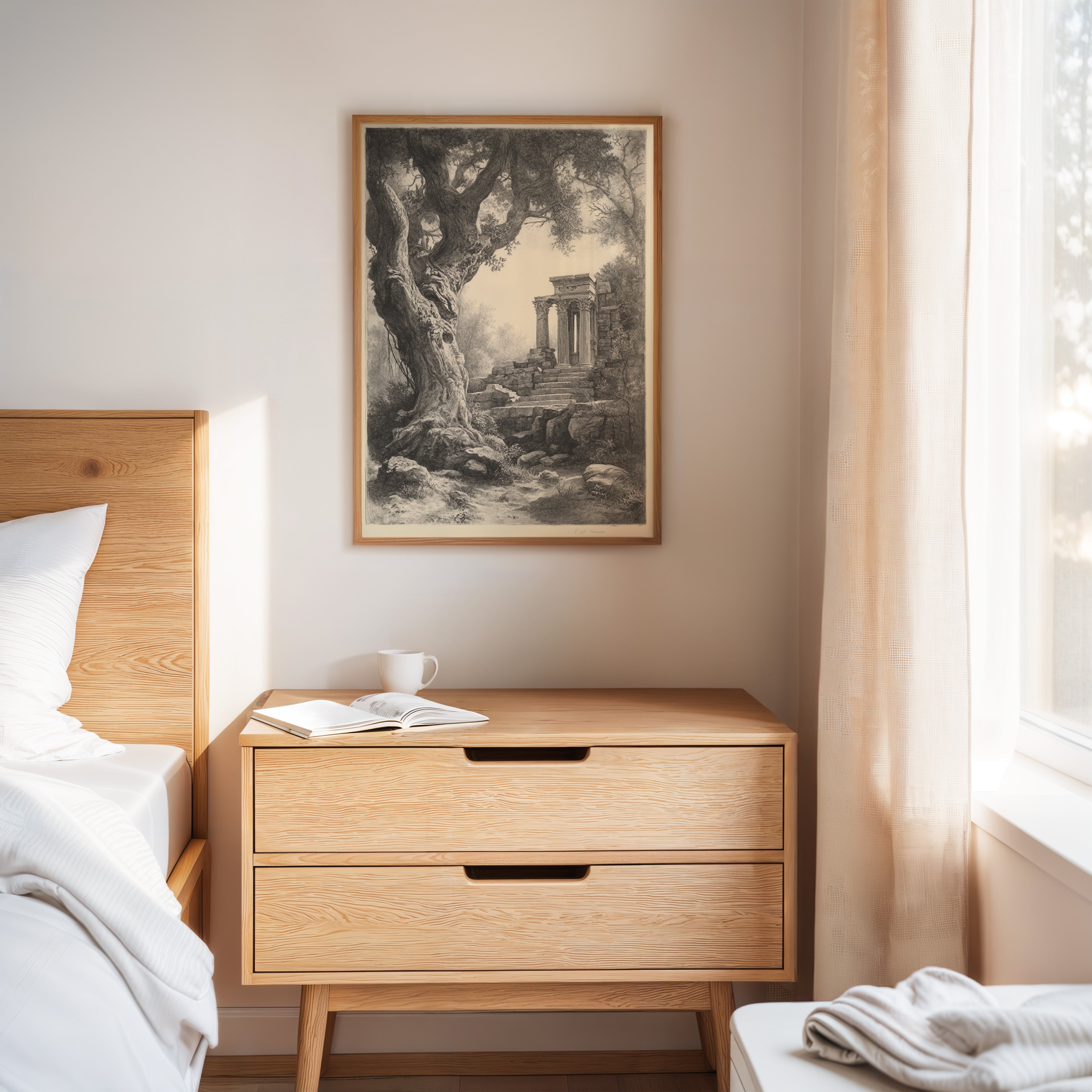 Step into a timeless realm with 'Ancient Ruins,' where the echoes of history linger among the gnarled branches of an ancient tree. This evocative monochrome artwork captures the mystique of forgotten temples and the silent stories they hold. Perfect for the vintage enthusiast or the dark academia aficionado, this piece invites contemplation and adds a touch of classic elegance to any space. SKU: AL0091