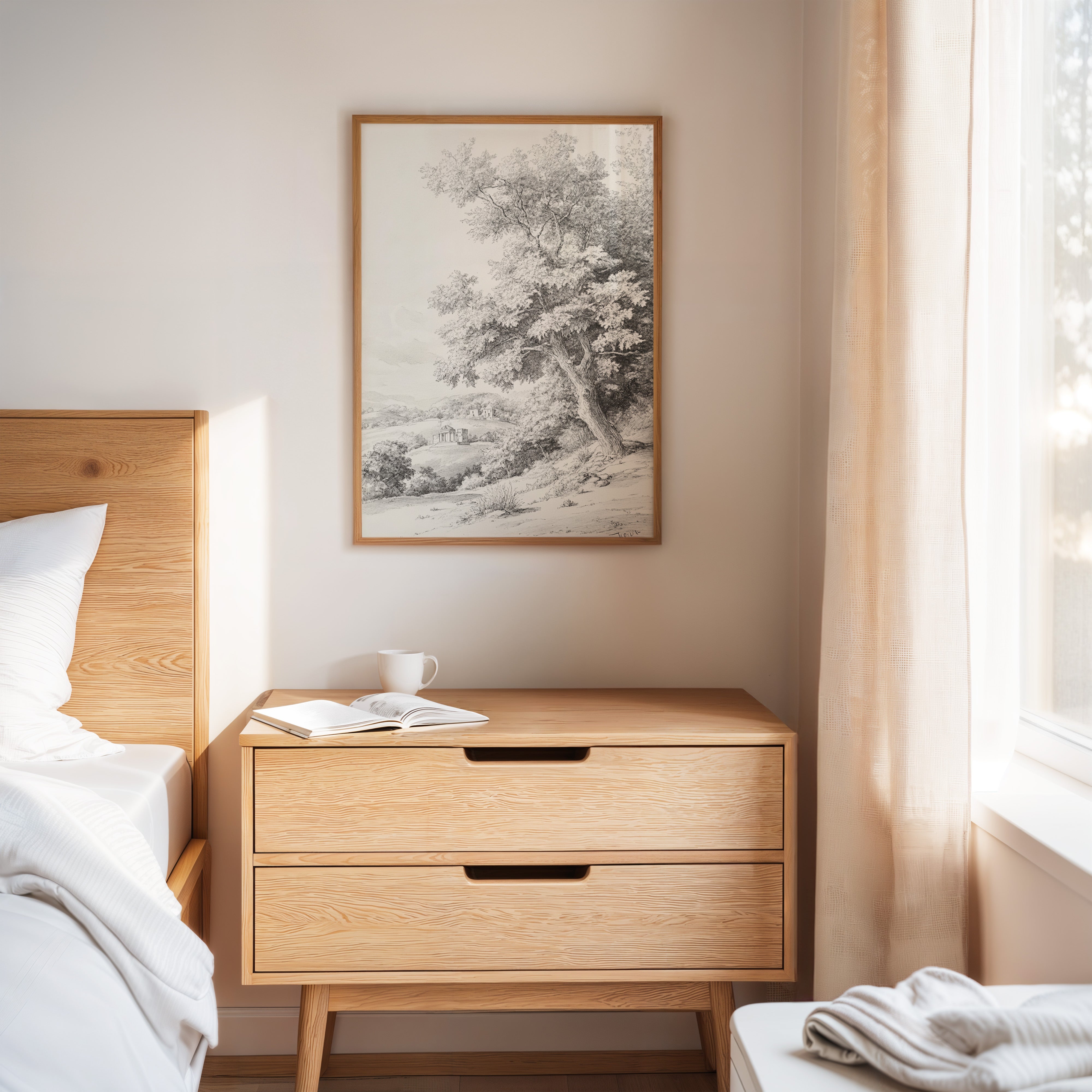 Immerse yourself in the timeless elegance of 'Ancients Tree.' This monochrome landscape, captured with delicate pencil strokes, transports you to a serene pastoral scene where nature and history converge. The intricate details of the majestic tree and distant architectural ruins evoke a sense of nostalgia and tranquility, inviting you to explore the beauty of simplicity and the whispers of the past. Perfect for those who appreciate classic artistry and the serene embrace of nature in their living spaces. SKU: AL0090
