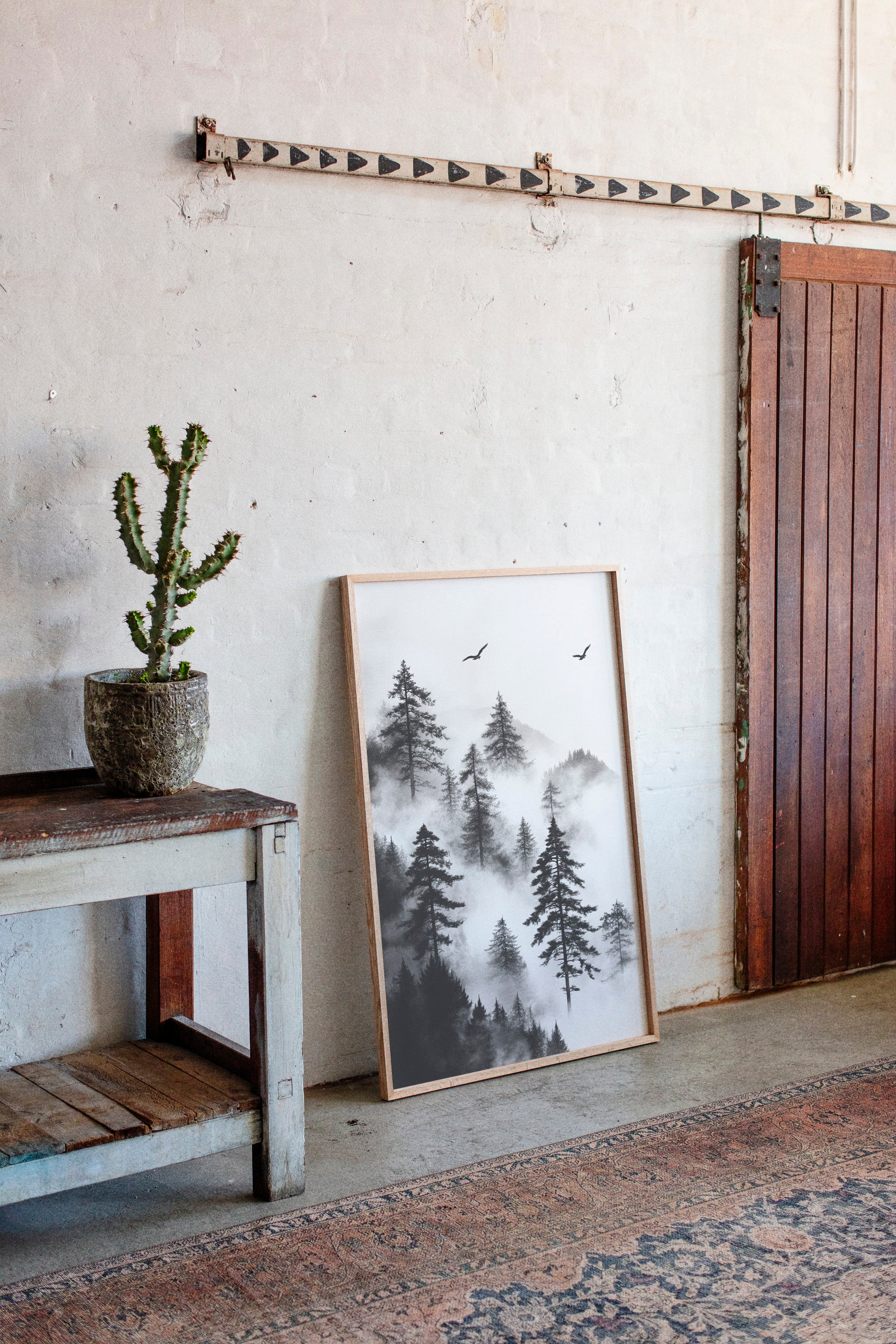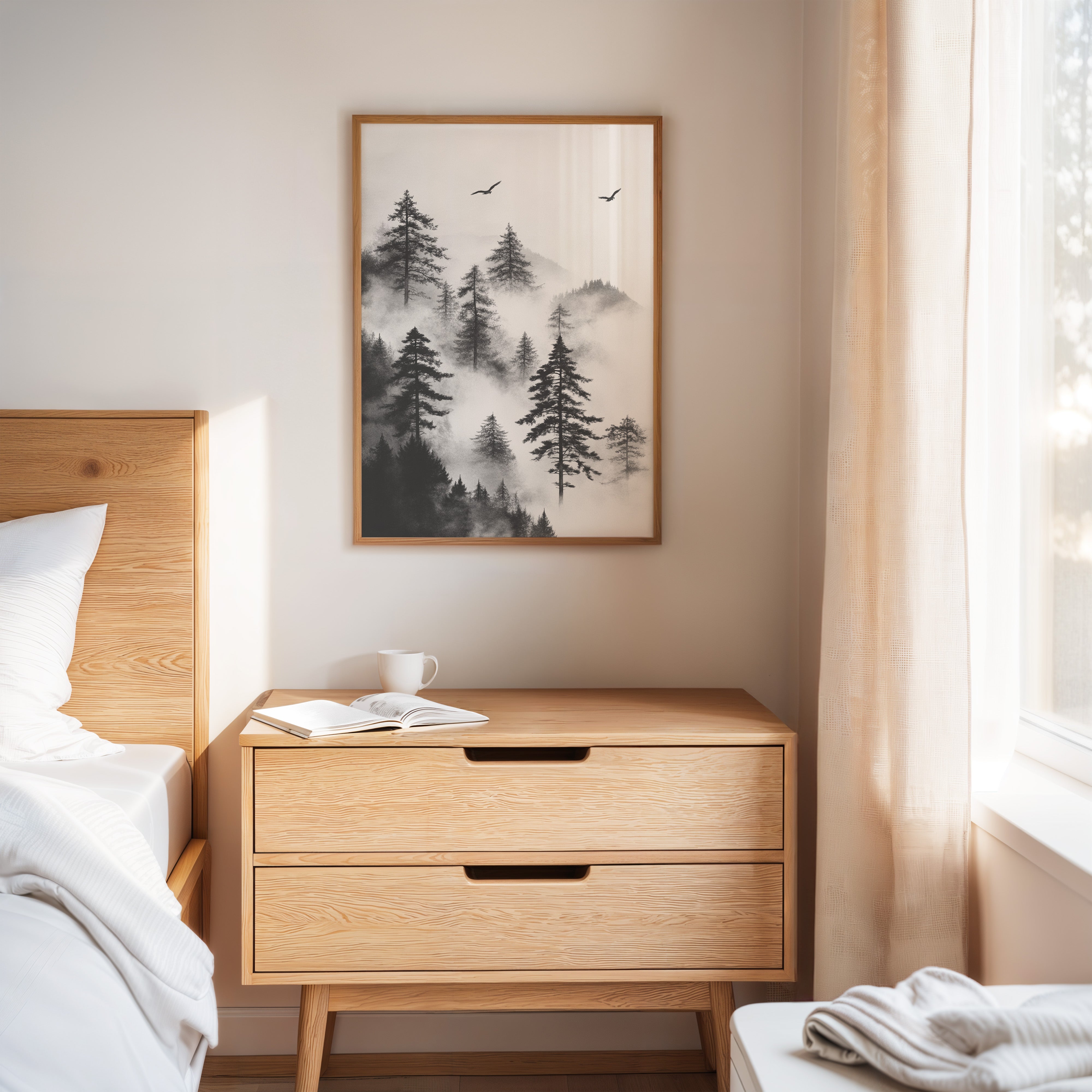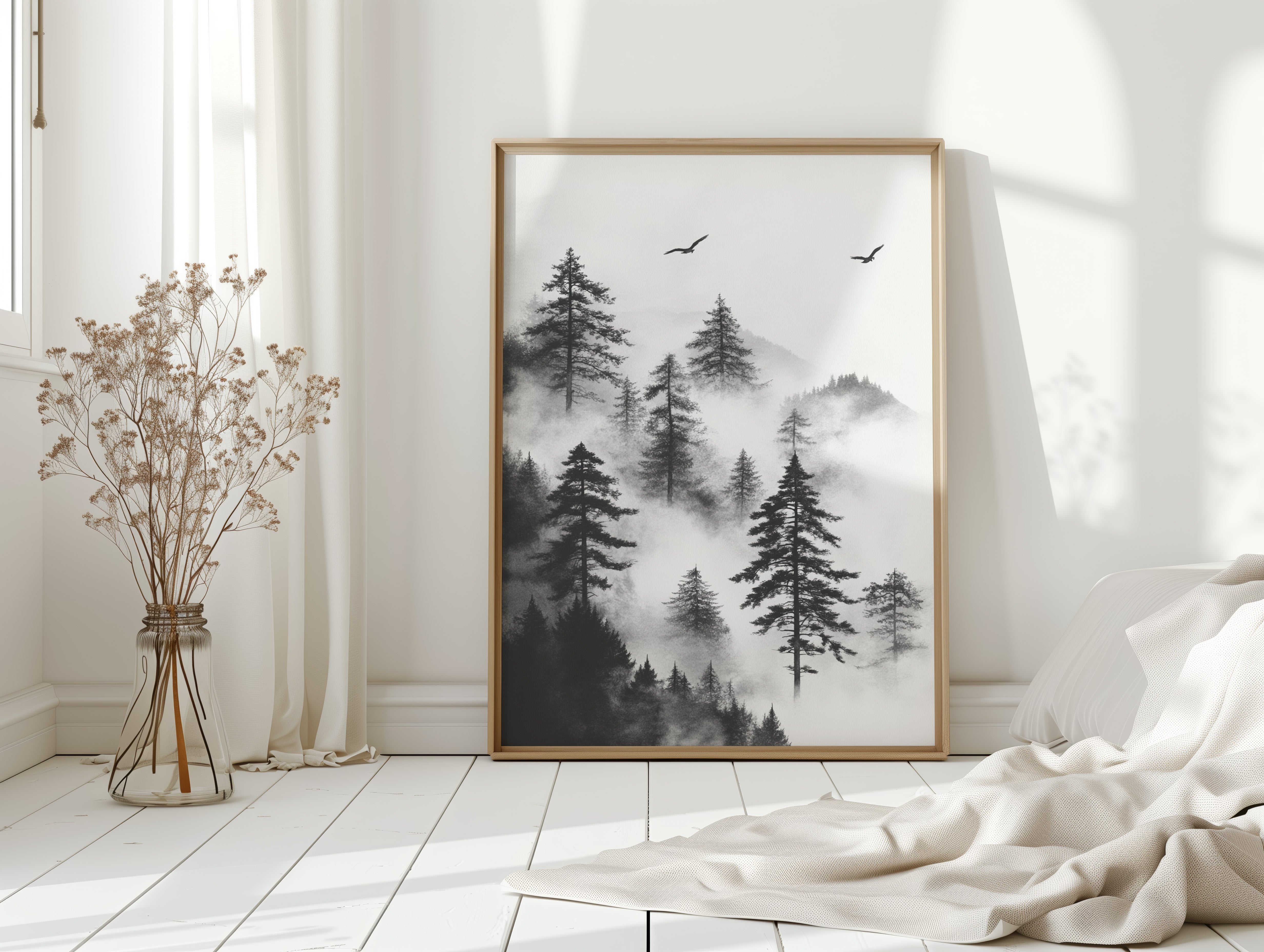 Step into a tranquil realm where mist dances with the silhouettes of towering pines. This enchanting piece captures the serene beauty of a foggy forest morning, inviting a sense of calm and introspection into your space. Perfect for those who cherish the mystery and allure of nature's quiet moments, this artwork seamlessly blends into any decor style, from minimalist to rustic. Let the gentle monochrome tones and ethereal misty ambiance transport you to a place of peaceful solitude.