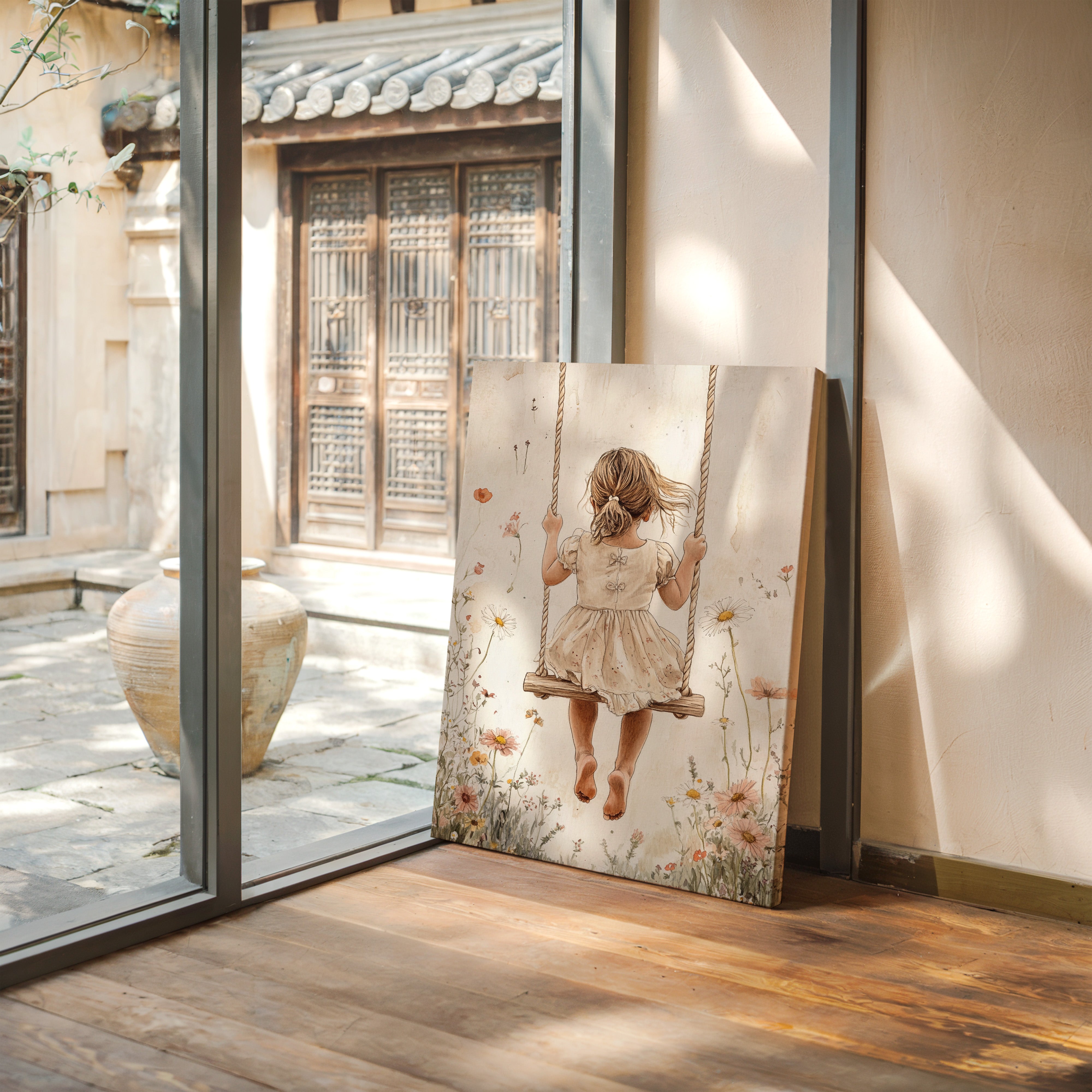 Step into a serene moment suspended in time with 'Whispers of Nostalgia.' This evocative art piece captures the innocence and joy of childhood, as a young girl swings gently amidst a wildflower meadow. The soft, muted tones and delicate details invite a sense of calm and wonder, perfect for creating a warm, inviting atmosphere in any room. Ideal for those who cherish moments of simplicity and the beauty of nature, this artwork is a heartfelt addition to any home decor.